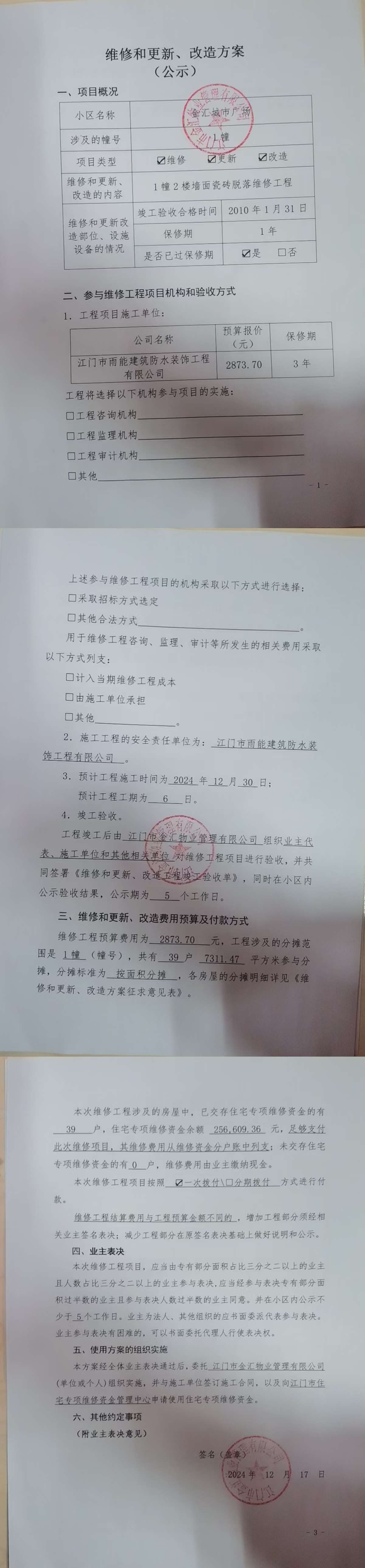 <td VALIGN="top" VALUES="" STYLE="border-width:0" BINDTYPE="0" ROWSPAN="18" COLSPAN="7" DATASOURCE="投票内容" ><font style="font-size:12pt;"><p style="text-align: left; font-family: 宋体; font-size: 16px; line-height: 1.75em; text-indent: 0em;">金汇城市广场金汇城市广场1栋全体业主:</p><p style="text-align: left; font-family: 宋体; font-size: 16px; line-height: 1.75em; text-indent: 2em;">本小区关于金汇城市广场关于1幢2楼电梯大堂墙身补瓷砖工程申请维修资金的投票的投票因多数业主联系不上,需加强联系业主。而延期,延期后投票结束时间由2025年03月31日延至2025年07月31日,由此带来不便,敬请谅解。<br/><br/></p><p style="text-align: left; font-family: 宋体; font-size: 18px; line-height: 1.75em;"><span style="font-size: 16px;"><strong>附件:</strong></span></p><p style="text-align: left; font-family: 宋体; font-size: 16px; line-height: 1.75em;"><br/></p><p style="white-space: normal; font-family: 宋体; font-size: 16px;line-height: 1.75em;"><strong>一、投票范围</strong></p><p style="white-space: normal; font-family: 宋体; font-size: 16px; line-height: 1.75em; text-indent: 2em;">金汇城市广场金汇城市广场1栋</p><p style="white-space: normal; font-family: 宋体; font-size: 16px; line-height: 1.75em; text-indent: 2em;">总人数(专有部分人数之和):38</p><p style="white-space: normal; font-family: 宋体; font-size: 16px; line-height: 1.75em; text-indent: 2em;"><span style="font-family: 宋体, SimSun; text-indent: 32px;"><span style="font-family: 宋体; text-indent: 32px;">总户数:39</span></span></p><p style="white-space: normal; font-family: 宋体; font-size: 16px; line-height: 1.75em; text-indent: 2em;">建筑物总面积(专有部分面积之和):7311.47㎡</p><p style="white-space: normal; font-family: 宋体;font-size: 16px; line-height: 1.75em;"><strong>二、投票起止时间</strong></p><p dir="ltr" style="white-space: normal; font-family: 宋体; line-height: 1.75em; text-indent: 2em;">投票表决时间:从2025年01月10日到2025年07月31日止</p><p dir="ltr" style="white-space: normal; font-family: 宋体; line-height: 1.75em; text-indent: 2em;">投票补录时间:从2025年08月01日到2025年08月06日止</p><p style="white-space: normal; font-family: 宋体; font-size: 16px;line-height: 1.75em;"><strong>三、投票详细描述</strong></p><p style="white-space: normal; font-family: 宋体; font-size: 16px; line-height: 1.75em; text-indent: 2em;"><p><span style="background-color: rgb(255, 255, 255); font-family: 宋体, SimSun; font-size: 14px;">&nbsp; 1幢2楼电梯大堂因雨天潮湿,导致电梯大堂</span><span style="background-color: rgb(255, 255, 255); font-family: 宋体, SimSun; font-size: 14px;">墙壁腐烂,<span style="font-family: 宋体, SimSun; font-size: 14px; background-color: rgb(255, 255, 255);">出现墙身瓷砖脱落,</span></span><span style="background-color: rgb(255, 255, 255); font-family: 宋体, SimSun; font-size: 14px;">严重影响业主出入正常生活。</span><span style="background-color: rgb(255, 255, 255); font-family: 宋体, SimSun; font-size: 14px;">现需把</span><span style="background-color: rgb(255, 255, 255); font-family: 宋体, SimSun; font-size: 14px;">1幢2楼电梯大堂</span><span style="background-color: rgb(255, 255, 255); font-family: 宋体, SimSun; font-size: 14px;">公共区域</span><span style="background-color: rgb(255, 255, 255); font-family: 宋体, SimSun; font-size: 14px;">铲除原有空鼓水泥沙批荡层,然后清理干净重新批荡水泥沙浆层,最后涂刷瓷砖背胶重新贴砖。</span><span style="background-color: rgb(255, 255, 255); font-family: 宋体, SimSun; font-size: 14px;">工程维修预算金额为2873.70元,项目最终费用以施工合同签订金额为准。维修费用的分摊标准为按建筑面积分摊,详见公示附件。物业公司联系电话:3929003。</span></p></p><p style="white-space: normal; font-family: 宋体;font-size: 16px; line-height: 1.75em;"><strong>四、计票规则</strong></p><p style="white-space: normal; font-family: 宋体; font-size: 16px; line-height: 1.75em; text-indent: 2em;">表决事项:使用建筑物及其附属设施的维修资金<br /><p style='text-align: left; font-family: 宋体; font-size: 16px; line-height: 1.75em; text-indent: 2em;'>计票规则:弃权票不并入其它项 未表决票不并入其它项</p></p><p style="white-space: normal; font-family: 宋体;font-size: 16px; line-height: 1.75em;"><strong>五、通过规则</strong></p><p style="white-space: normal; font-family: 宋体;font-size: 16px; line-height: 1.75em;"><strong><strong style="white-space: normal;"><span style="font-family: 宋体, SimSun;">&nbsp; 根据《中华人民共和国民法典》第二百七十八条规定:业主共同决定事项,应当由专有部分面积占比三分之二以上的业主且人数占比三分之二以上的业主参与表决。</span></strong></strong></p><p style="white-space: normal; font-family: 宋体; font-size: 16px; line-height: 1.75em; text-indent: 2em;"><span style="font-family: 宋体; text-indent: 32px;">表决事项:使用建筑物及其附属设施的维修资金<br /><p style='text-align: left; font-family: 宋体; font-size: 16px; line-height: 1.75em; text-indent: 2em;'>通过规则:双2/3以上参与表决,参与表决双过半同意</p></span></p><p style="text-align: left; font-family: 宋体; font-size: 16px; line-height: 1.75em;"><strong>六、投票方式</strong></p><p style="text-align: left; font-family: 宋体; font-size: 16px; line-height: 1.75em; text-indent: 2em;"><span style="font-family: 宋体; line-height: 28px;">在投票事项通知公告日起,请业主扫描二维码或者关注微信公众号(<strong>江门住建易办事</strong>)查看详细情况并进行投票。</span></p><p><br/></p><p style="text-align: right; font-family: 宋体; font-size: 16px; line-height