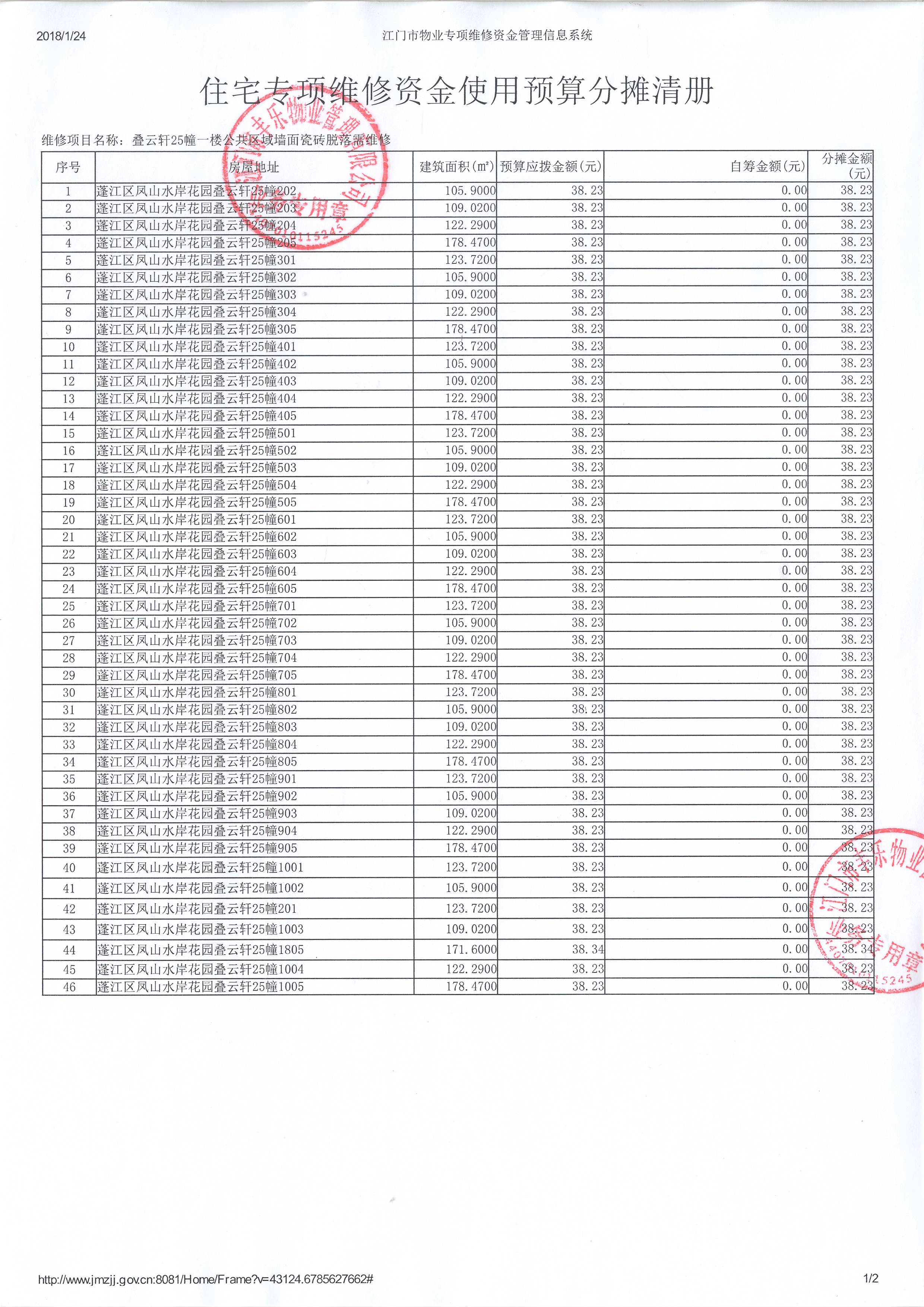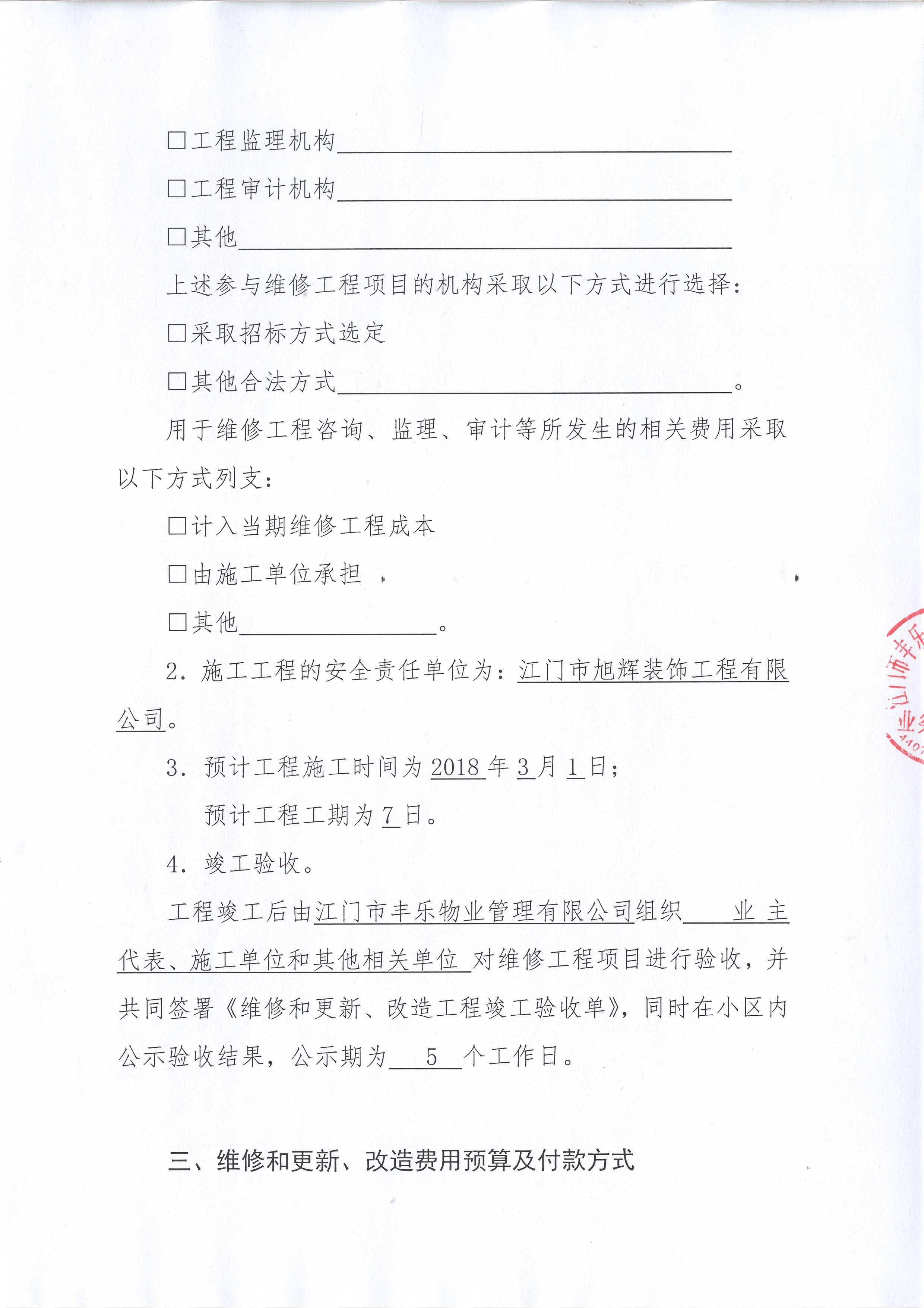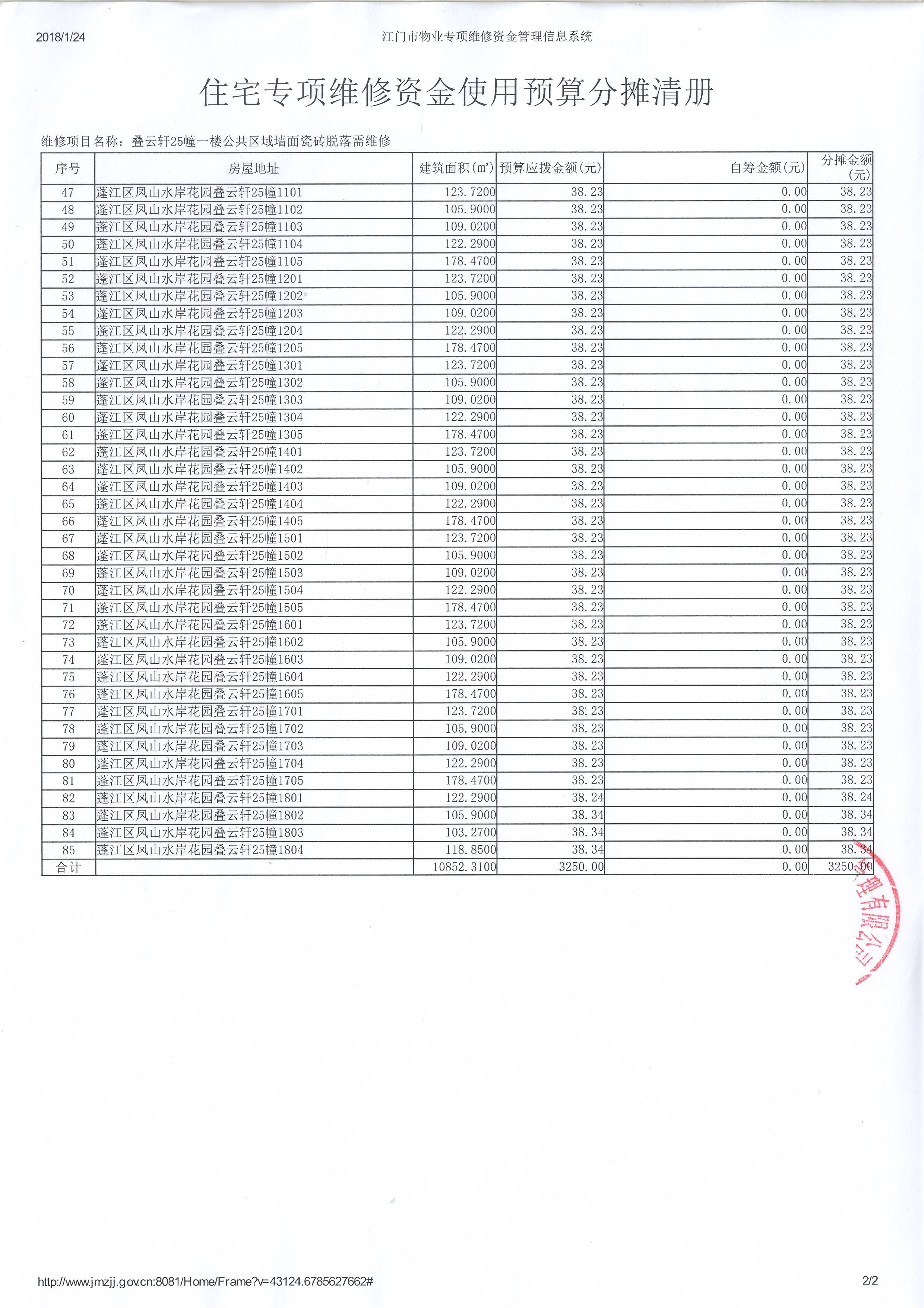 投票结果通知公告时间:从2018年04月05日开始<br/></p><p style="text-align: left; line-height: 1.75em; font-family: 宋体; font-size: 16px;"><strong>三、投票详细描述</strong> </p><p style="text-align: left; line-height: 1.75em; font-family: 宋体; font-size: 16px;"><span style="line-height: 28px; font-family: 宋体;"> </span><p><span style="font-family: "Helvetica Neue", Helvetica, Arial, sans-serif; font-size: 14px; background-color: rgb(255, 255, 255);">本小区叠云轩25幢一楼公共区域墙面瓷砖脱落,经检查,已过保修期。</span><br style="font-family: "Helvetica Neue", Helvetica, Arial, sans-serif; font-size: 14px; white-space: normal; background-color: rgb(255, 255, 255);"/><span style="font-family: "Helvetica Neue", Helvetica, Arial, sans-serif; font-size: 14px; background-color: rgb(255, 255, 255);">现需申请使用维修资金对叠云轩25幢一楼公共区域墙面脱落的瓷砖进行维修,工程维修预算金额为3250元,项目最终费用以施工合同签订金额为准。维修费用的分摊标准为每户38.23元,详见附件。</span></p></p><p style="text-align: left; line-height: 1.75em; font-family: 宋体; font-size: 16px;"><strong>四、投票结果</strong> </p><p style="text-align: left; line-height: 1.75em; font-family: 宋体; font-size: 16px;"><table style='table-layout: fixed; font-size:12px; margin-top:10px' width='100%' border='0' cellspacing='0' cellpadding='0'><tr><td height='28' colspan='10' align='center' style='border: 1px solid #666'><strong style='font-size: 14px;'> 叠云轩25幢一楼公共区域墙面瓷砖脱落需维修</strong></td> </tr><tr><td height='28' colspan='4' style='border-left: 1px solid #666; border-bottom: 1px solid #666'><strong> 申报单位:</strong> 江门市丰乐物业管理有限公司</td><td colspan='3' style='border-left: 1px solid #666; border-bottom: 1px solid #666'><strong> 联系方式:</strong> (0750) 3871336 3829717 </td><td colspan='3' style='border-left: 1px solid #666; border-bottom: 1px solid #666; border-right: 1px solid #666'><strong> 申报日期:</strong> 2018年2月2日 </td></tr><tr> <td height='28' colspan='5' style='border-left: 1px solid #666; border-bottom: 1px solid #666'><strong> 总人数(专有部分人数之和):</strong>84人 </td><td colspan='5' style='border-left: 1px solid #666; border-bottom: 1px solid #666; border-right: 1px solid #666'><strong> 建筑物总面积(专有部分面积之和):</strong>10852.31㎡ </td> </tr><tr><td height='28' colspan='10' bgcolor='#F3F3F3' style='border-left: 1px solid #666;border-bottom: 1px solid #666;border-right: 1px solid #666'><strong> 参与人数及面积统计</strong></td></tr><tr><td height='28' colspan='5' style='border-left: 1px solid #666; border-bottom: 1px solid #666'><strong> 参与表决专有部分人数之和:</strong>8人</td><td colspan='5' style='border-left: 1px solid #666; border-bottom: 1px solid #666; border-right: 1px solid #666'><strong> 参与表决占有表决权总人数比例:</strong>9.52%</td></tr><tr><td height='28' colspan='5' style='border-left: 1px solid #666; border-bottom: 1px solid #666'><strong> 参与表决专有部分面积之和:</strong>883.59㎡</td><td colspan='5' style='border-left: 1px solid #666; border-bottom: 1px solid #666; border-right: 1px solid #666'><strong> 参与表决占有表决权总面积比例:</strong>8.14%</td></tr><tr><td height='28' colspan='10' bgcolor='#F3F3F3' style='border-left: 1px solid #666; border-bottom: 1px solid #666;border-right: 1px solid #666'> <strong> 未参与人数及面积统计</strong></td> </tr><tr><td height='28' colspan='5' style='border-left: 1px solid #666; border-bottom: 1px solid #666'><strong> 未参与表决专有部分人数之和:</strong>76人 </td><td colspan='5' style='border-left: 1px solid #666; border-bottom: 1px solid #666; border-right: 1px solid #666'><strong> 未参与表决占有表决权总人数比例:</strong>90.48%</td></tr><tr><td height='28' colspan='5' style='border-left: 1px solid #666; border-bottom: 1px solid #666'><strong> 未参与表决专有部分面积之和:</strong>9968.72㎡</td><td colspan='5' style='border-left: 1px solid #666; border-bottom: 1px solid #666; border-right: 1px solid #666'><strong> 未参与表决占有表决权总面积比例:</strong>91.86% </td> </tr><tr><td width='6%' rowspan='2' align='center' bgcolor='#F3F3F3' style='border-left: 1px solid #666; border-bottom: 1px solid #666'><strong>序号</strong></td><td width='11%' rowspan='2' align='center' bgcolor='#F3F3F3' style='border-left: 1px solid #666; border-bottom: 1px solid #666'><strong>候选项</strong></td><td height='28' colspan='2' align='center' bgcolor='#F3F3F3' style='border-left: 1px solid #666; border-bottom: 1px solid #666'><strong>表决人数情况</strong> </td><td colspan='2' align='center' bgcolor='#F3F3F3' style='border-left: 1px solid #666; border-bottom: 1px solid #666'><strong>表决面积情况</strong></td><td colspan='4' align='center' bgcolor='#F3F3F3' style='border-left: 1px solid #666; border-bottom: 1px solid #666; border-right: 1px solid #666'><strong>表决方式</strong></td></tr><tr><td width='11%' height='28' align='center' bgcolor='#F3F3F3' style='border-left: 1px solid #666;border-bottom: 1px solid #666'><strong>参与表决<br />专有部分<br />人数之和</strong> </td><td width='11%' align='center' bgcolor='#F3F3F3' style='border-left: 1px solid #666; border-bottom: 1px solid #666'><strong>占有<br /> 表决权<br /> 总人数比例<br /> </strong></td><td width='11%' align='center' bgcolor='#F3F3F3' style='border-left: 1px solid #666; border-bottom: 1px solid #666'><strong>参与表决<br /> 专有部分<br /> 面积之和<br /> </strong></td><td width='13%' align='center' bgcolor='#F3F3F3' style='border-left: 1px solid #666; border-bottom: 1px solid #666'><strong>占有<br />表决权<br />总面积比例</strong></td><td width='9%' align='center' bgcolor='#F3F3F3' style='