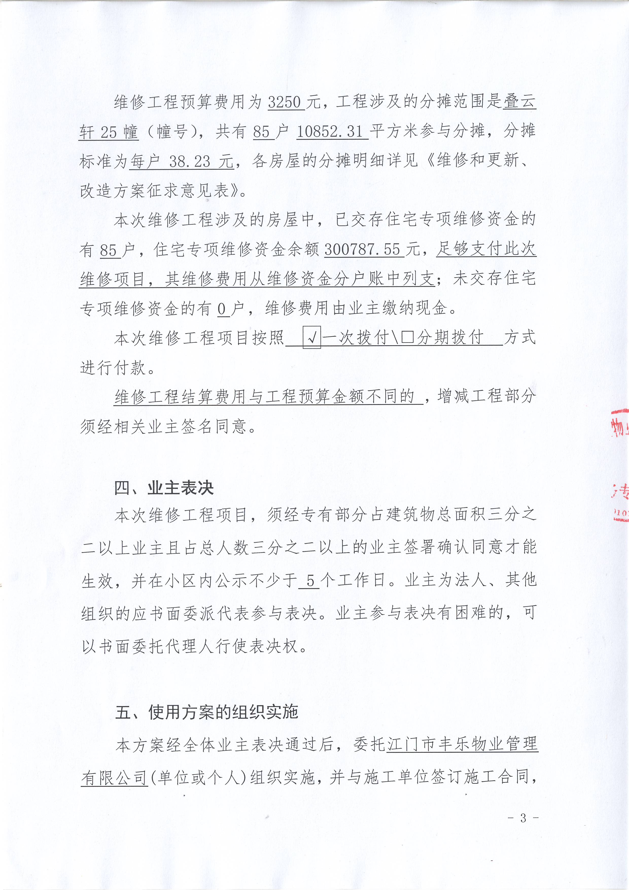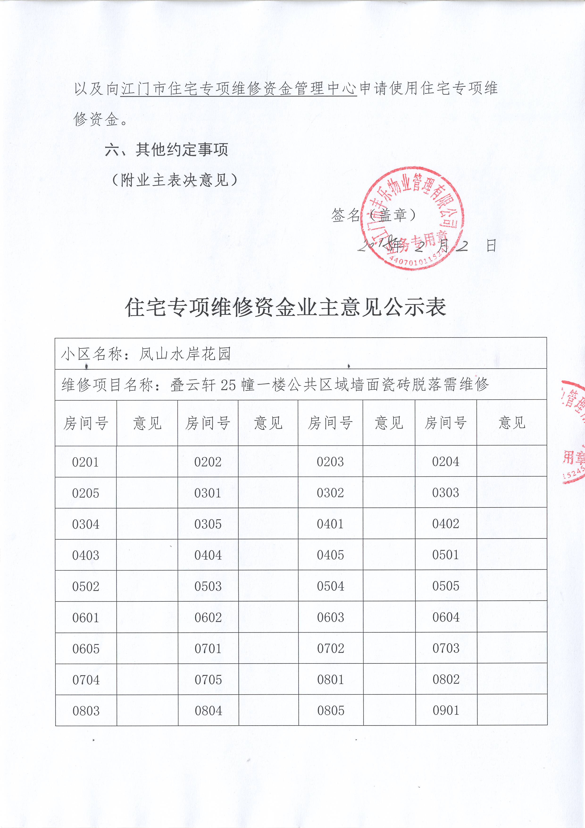<span style="font-family: 宋体;"> 本小区关于凤山水岸花园叠云轩25幢一楼公共区域墙面瓷砖脱落需维修的投票<span style="font-family: 宋体; font-size: 16px;">已表决结束</span>,</span><span style="font-family: 宋体;">询异时间从2018年03月29日开始,投票询异公示期间,业主可进行以下操作:</span></p><p style="text-align: left; line-height: 1.75em; font-family: 宋体; font-size: 16px;"><span style="font-family: 宋体;"></span></p><p style="text-align: left;"><span style="font-family: 宋体;"> </span><span style="font-family: 宋体;"> </span>一、查询表决情况</p><p style="text-align: left;"><span style="font-family: 宋体;"> </span><span style="font-family: 宋体;"> </span>业主可通过微信服务平台、或江门市物业管理公众服务平台(网址:wygl.jmzjj.gov.cn/)登录查询自己的表决情况。如需到管理部门查询的,投票事项属于“决定维修资金使用、管理、续筹方案”的,业主可凭身份证件到所属维修资金管理中心查询;非涉及维修资金的投票事项,业主可凭身份证件到所属区住建部门、或街道办事处(镇人民政府)、居(村)民委员会申请查询自己的表决情况。</p><p style="text-align: left;"><span style="font-family: 宋体;"> </span><span style="font-family: 宋体;"> </span>二、申诉变更投票表决意见</p><p style="text-align: left;"><span style="font-family: 宋体;"> </span><span style="font-family: 宋体;"> </span>如业主意见与查询到的表决意见不一致的,投票事项属于“决定维修资金使用、管理、续筹方案”的,业主可以书面形式向所属维修资金管理中心申诉;非涉及维修资金的投票事项,业主可以书面形式向所属区住建部门、或街道办事处(镇人民政府)、居(村)民委员会申诉。经核查业主反映情况属实的,予以纠正并重新公示表决结果。</p><p style="text-align: left; line-height: 1.75em; font-family: 宋体; font-size: 16px;"><span style="font-family: sans-serif;"> </span></p><p style="text-align: left; line-height: 1.75em; font-family: 宋体; font-size: 16px;"><strong><span style="font-family: 宋体;">附件:</span></strong></p><p style="text-align: left; line-height: 1.75em; font-family: 宋体; font-size: 16px;"><strong>一、投票范围</strong></p><p style="text-align: left; line-height: 1.75em; font-family: 宋体; font-size: 16px;"> 凤山水岸花园叠云轩25幢<br/>