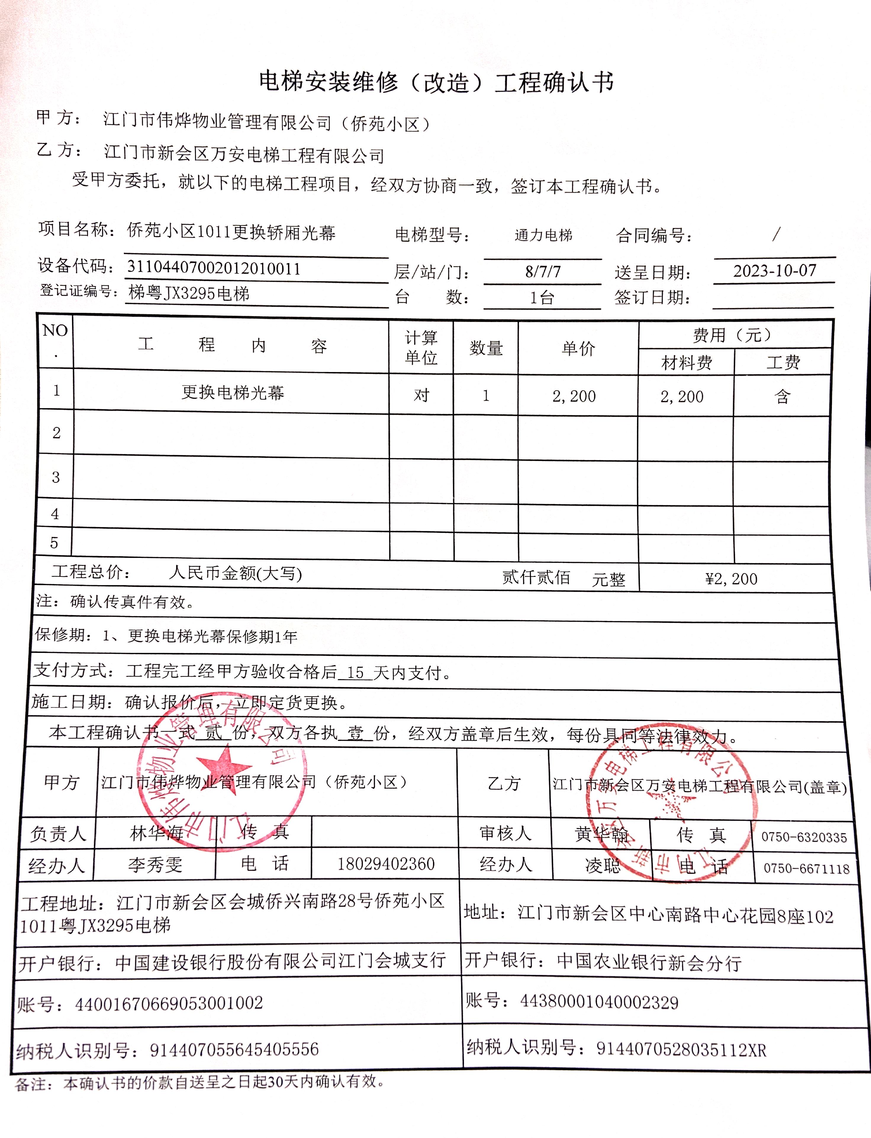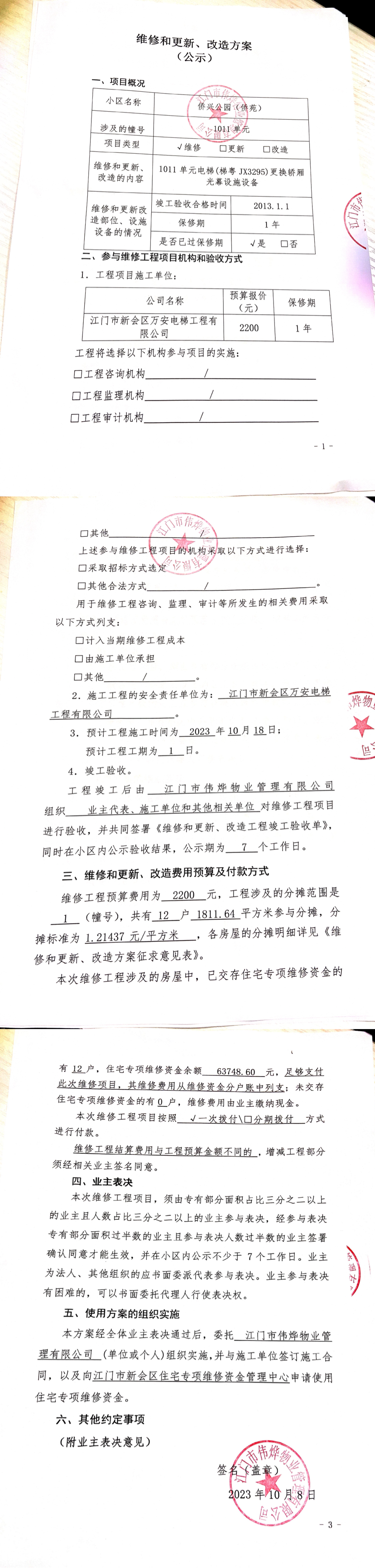 <td VALIGN="top" VALUES="" STYLE="border-width:0" BINDTYPE="0" ROWSPAN="19" COLSPAN="7" DATASOURCE="投票结果" ><font style="font-size:14pt;"><p style="white-space: normal; font-family: 宋体; line-height: 1.75em;">侨兴公园会城侨兴南路28号全体业主:</p><p style="white-space: normal; font-family: 宋体; line-height: 1.75em; text-indent: 2em;">本小区关于侨兴公园(侨苑)1011单元电梯(梯粤JX3295)更换轿厢光幕使用维修资金的投票的投票已表决结束,询异时间从2023年10月24日开始,投票询异公示期间,业主可通过微信查询自己的表决情况或可凭身份证件申请查询自己的表决情况;如公示的业主表决情况与查询的本人表决意见不一致的,可以以书面形式向投票组织机构申诉,投票组织机构予以纠正并重新公示表决结果。异议提出人对投票组织机构的处理仍有异议的,可以向街道办事处(镇人民政府)反映处理,涉及住宅专项维修资金的,可向属地住宅专项维修资金管理中心反映处理。</p><p style="white-space: normal;"><br/></p><p style="white-space: normal; font-family: 宋体; line-height: 1.75em;"><strong>附件:</strong></p><p style="white-space: normal; font-family: 宋体; line-height: 1.75em;"><strong>一、投票范围</strong></p><p style="white-space: normal; font-family: 宋体; line-height: 1.75em; text-indent: 2em;">侨兴公园会城侨兴南路28号</p><p style="white-space: normal; font-family: 宋体; line-height: 1.75em; text-indent: 2em;">总人数(专有部分人数之和):12</p><p style="white-space: normal; font-family: 宋体; line-height: 1.75em; text-indent: 2em;"><span style="font-family: 宋体, SimSun;">总户数:12</span></p><p style="white-space: normal; font-family: 宋体; line-height: 1.75em; text-indent: 2em;">建筑物总面积(专有部分面积之和):1811.64㎡</p><p style="white-space: normal; font-family: 宋体; line-height: 1.75em;"><strong>二、询异公示起止时间</strong></p><p dir="ltr" style="white-space: normal; font-family: 宋体; line-height: 1.75em; text-indent: 2em;"><span style="text-indent: 36px;">2023年10月24日至2023年10月30日</span></p><p style="white-space: normal; font-family: 宋体; line-height: 1.75em;"><strong>三、投票详细描述</strong></p><p style="white-space: normal; font-family: 宋体; line-height: 1.75em; text-indent: 2em;"><p>本小区1011单元电梯(梯粤JX3295)出现停止运行,经检查,是由于1011单元电梯(梯粤JX3295)因轿厢光幕老化,导致电梯门失灵有开开合合的现象,需要维修和更换,已过保修期。现需申请使用维修资金对轿厢光幕进行更换设施设备维修,工程维修预算金额为2200元,项目最终费用以施工合同签订金额为准。维修费用的分摊标准为按建筑面积分摊,每平方约:1.21437元,详见公示附件。如业主手机不能正常通过微信投票,请联系物业公司进行线下纸质投票,物业公司联系电话:13326847009。</p></p><p style="white-space: normal; font-family: 宋体; line-height: 1.75em;"><strong>四、计票规则</strong></p><p style="white-space: normal; font-family: 宋体; line-height: 1.75em; text-indent: 2em;">表决事项:使用建筑物及其附属设施的维修资金<br /><p style='text-align: left; font-family: 宋体; font-size: 16px; line-height: 1.75em; text-indent: 2em;'>计票规则:弃权票不并入其它项 未表决票不并入其它项</p></p><p style="white-space: normal; font-family: 宋体; line-height: 1.75em;"><strong>五、通过规则</strong></p><p style="white-space: normal; font-family: 宋体; line-height: 1.75em;"><strong><strong style="white-space: normal;"><span style="font-family: 宋体, SimSun;">&nbsp; 根据《中华人民共和国民法典》第二百七十八条规定:业主共同决定事项,应当由专有部分面积占比三分之二以上的业主且人数占比三分之二以上的业主参与表决。</span></strong></strong></p><p style="white-space: normal; font-family: 宋体; line-height: 1.75em; text-indent: 2em;">表决事项:使用建筑物及其附属设施的维修资金<br /><p style='text-align: left; font-family: 宋体; font-size: 16px; line-height: 1.75em; text-indent: 2em;'>通过规则:参与表决专有部分面积过半数的业主且参与表决人数过半数的业主同意</p></p><p style="white-space: normal; font-family: 宋体; line-height: 1.75em;"><strong>六、投票结果</strong></p><p style="white-space: normal; font-family: 宋体; line-height: 1.75em; text-indent: 2em;"><div id='resultTable'><table style='table-layout: fixed; font-size:12px; margin-top:10px' width='100%' border='0' cellspacing='0' cellpadding='0'><tr><td height='28' colspan='10' align='center' style='border: 1px solid #666'><strong style='font-size: 14px;'> 使用建筑物及其附属设施的维修资金</strong></td> </tr><tr id='trfirst'><td height='28' colspan='4' style='border-left: 1px solid #666; border-bottom: 1px solid #666'><strong> 申报单位:</strong> 江门市伟烨物业管理有限公司</td><td colspan='3' style='border-left: 1px solid #666; border-bottom: 1px solid #666'><strong> 联系方式:</strong> 0750-6123828 </td><td colspan='3' style='border-left: 1px solid #666; border-bottom: 1px solid #666; border-right: 1px solid #666'><strong> 申报日期:</strong> 2023年10月8日 </td></tr><tr> <td height='28' colspan='5' style='border-left: 1px solid #666; border-bottom: 1px solid #666'><strong> 总人数(专有部分人数之和):</strong>12人 </td><td colspan='5' style='border-left: 1px solid #666; border-bottom: 1px solid #666; border-right: 1px solid #666'><strong> 建筑物总面积(专有部分面积之和):</strong>1811.64㎡ </td> </tr><tr><td height='28' colspan='10' bgcolor='#F3F3F3' style='border-left: 1px solid #666;border-bottom: 1px solid #666;border-right: 1px solid #666'><strong> 参与人数及面积统计</strong></td></tr><tr><td height='28' c
