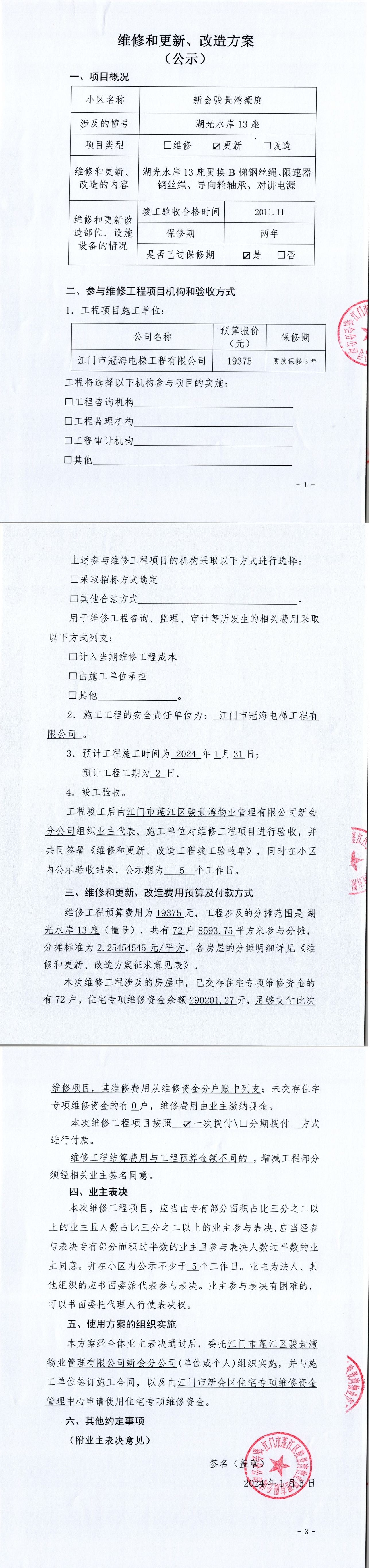 <td valign="top" values="" style="border-width:0" bindtype="0" rowspan="17" colspan="7" datasource="投票结果"><font style=" font-family:方正小标宋简体;font-size:14pt;"><p style="line-height: 1.75em;"><span style="font-family: 宋体, SimSun;">各位尊敬的业主:</span><br></p><p style="text-indent: 2em; line-height: 1.75em;"><span style="font-family: 宋体, SimSun;">根据法律法规的规定,本小区业主利用“江门市物业事项表决管理系统”已对本小区公共事务决策事项进行了表决,在经过7日的询异公示期后,未收到业主有效的异议。现将投票结果公告,并就产生的法律效力说明如下:</span></p><p style="line-height: 1.75em; text-indent: 0em;"><strong style="text-indent: 2em;"><span style="font-family: 宋体, SimSun;">一、投票范围</span></strong></p><p style="text-indent: 2em; line-height: 1.75em;"><span style="font-family: 宋体, SimSun;">新会骏景湾豪庭湖光水岸13座</span></p><p style="text-indent: 2em; line-height: 1.75em;"><span style="font-family: 宋体, SimSun;">总人数(专有部分人数之和):72</span></p><p style="text-indent: 2em; line-height: 1.75em;"><span style="font-family: 宋体, SimSun;"><span style="font-family: 宋体, SimSun; text-indent: 32px;"><span style="font-family: 宋体; text-indent: 32px;"><span style="font-family: 宋体; text-indent: 32px;">总户数:72</span></span></span></span></p><p style="text-indent: 2em; line-height: 1.75em;"><span style="font-family: 宋体, SimSun;">建筑物总面积(专有部分面积之和):8593.75㎡</span></p><p style="line-height: 1.75em;"><strong><span style="font-family: 宋体, SimSun;">二、投票结果公告时间</span></strong></p><p style="text-indent: 2em; line-height: 1.75em;"><span style="font-family: 宋体, SimSun;">从2024年01月23日开始</span></p><p style="line-height: 1.75em;"><strong><span style="font-family: 宋体, SimSun;">三、计票规则</span></strong></p><p style="text-indent: 2em; line-height: 1.75em;"><span style="font-family: 宋体, SimSun;">表决事项:使用建筑物及其附属设施的维修资金<br></span></p><p style="font-family: 宋体, SimSun;line-height: 1.75em; text-indent: 2em;">计票规则:弃权票不并入其它项 未表决票不并入其它项</p><p></p><p style="line-height: 1.75em;"><strong><span style="font-family: 宋体, SimSun;">四、通过规则</span></strong></p><p style="line-height: 1.75em;"><strong><span style="font-family: 宋体, SimSun;"> 根据《中华人民共和国民法典》第二百七十八条规定:业主共同决定事项,应当由专有部分面积占比三分之二以上的业主且人数占比三分之二以上的业主参与表决。</span></strong></p><p style="text-indent: 2em; line-height: 1.75em;"><span style="font-family: 宋体, SimSun;"><span style="font-family: 宋体, SimSun; text-indent: 32px;">表决事项:使用建筑物及其附属设施的维修资金<br></span></span></p><p style="font-family: 宋体, SimSun;line-height: 1.75em; text-indent: 2em;">通过规则:参与表决专有部分面积过半数的业主且参与表决人数过半数的业主同意</p><p></p><p style="line-height: 1.75em;"><strong><span style="font-family: 宋体, SimSun;">五、投票结果</span></strong></p><p style="line-height: 1.75em; text-indent: 2em;"><span style="font-family: 宋体, SimSun; text-indent: 2em;"></span></p><div id="resultTable"><table style="table-layout: fixed; font-size:12px; margin-top:10px" width="100%" border="0" cellspacing="0" cellpadding="0"><tbody><tr><td height="28" colspan="10" align="center" style="border: 1px solid #666"><strong style="font-size: 14px;"> 使用建筑物及其附属设施的维修资金</strong></td> </tr><tr id="trfirst"><td height="28" colspan="4" style="border-left: 1px solid #666; border-bottom: 1px solid #666"><strong> 申报单位:</strong> 江门市蓬江区骏景湾物业管理有限公司新会分公司</td><td colspan="3" style="border-left: 1px solid #666; border-bottom: 1px solid #666"><strong> 联系方式:</strong> </td><td colspan="3" style="border-left: 1px solid #666; border-bottom: 1px solid #666; border-right: 1px solid #666"><strong> 申报日期:</strong> 2024年1月5日 </td></tr><tr> <td height="28" colspan="5" style="border-left: 1px solid #666; border-bottom: 1px solid #666"><strong> 总人数(专有部分人数之和):</strong>72人 </td><td colspan="5" style="border-left: 1px solid #666; border-bottom: 1px solid #666; border-right: 1px solid #666"><strong> 建筑物总面积(专有部分面积之和):</strong>8593.75㎡ </td> </tr><tr><td height="28" colspan="10" bgcolor="#F3F3F3" style="border-left: 1px solid #666;border-bottom: 1px solid #666;border-right: 1px solid #666"><strong> 参与人数及面积统计</strong></td></tr><tr><td height="28" colspan="5" style="border-left: 1px solid #666; border-bottom: 1px solid #666"><strong> 参与表决专有部分人数之和:</strong>51人</td><td colspan="5" style="border-left: 1px solid #666; border-bottom: 1px solid #666; border-right: 1px solid #666"><strong> 参与表决占有表决权总人数比例:</strong>70.83%</td></tr><tr><td height="28" colspan="5" style="border-left: 1px solid #666; border-bottom: 1px solid #666"><strong> 参与表决专有部分面积之和:</strong>6155.65㎡</td><td colspan="5" style="border-left: 1px solid #666; border-bottom: 1px solid #666; border-right: 1px solid #666"><strong> 参与表决占有表决权总面积比例:</strong>71.63%</td></tr><tr><td height="28" colspan="10" bgcolor="#F3F3F3" style="border-left: 1px solid #666; border-bottom: 1px solid #666;border-right: 1px solid #666"> <strong> 未参与人数及面积统计</strong></td> </tr><tr><td height="28" colspan="5" style="border-left: 1px solid #666; border-bottom: 1px solid #666"><strong> 未参与表决专有部分人数之和:</strong>21人 </td><td colspan="5" style="border-left: 1px solid #666; border-bottom: 1px solid #666; border-