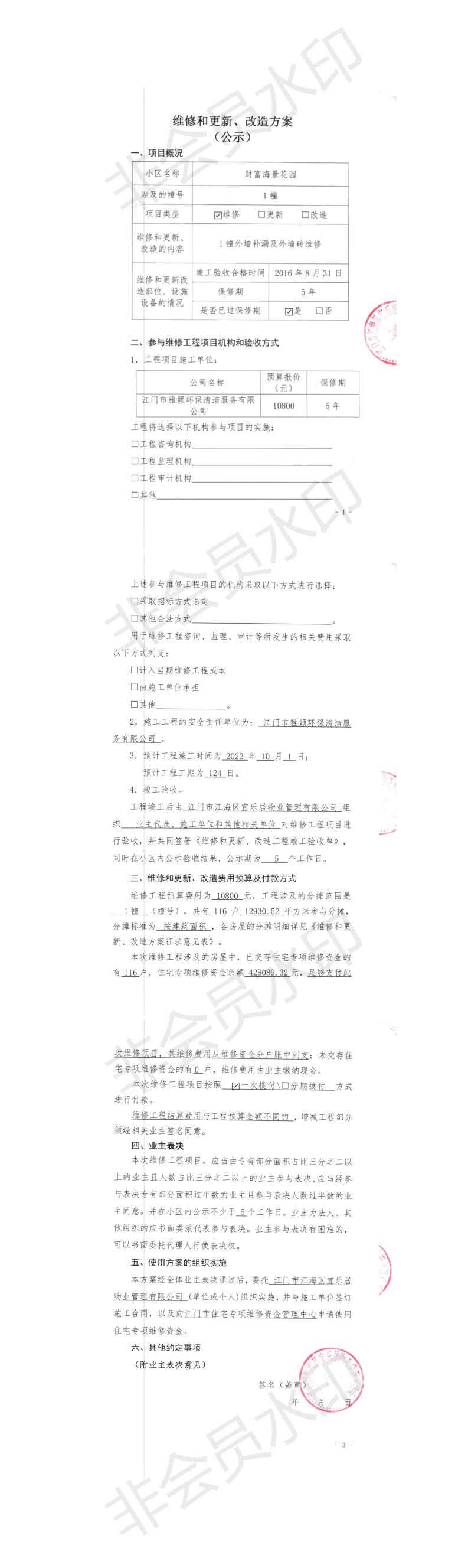 <td VALIGN="top" VALUES="" STYLE="border-width:0" BINDTYPE="0" ROWSPAN="17" COLSPAN="7" DATASOURCE="投票结果" ><font style=" font-family:方正小标宋简体;font-size:14pt;"><p style="line-height: 1.75em;"><span style="font-family: 宋体, SimSun;">各位尊敬的业主:</span><br/></p><p style="text-indent: 2em; line-height: 1.75em;"><span style="font-family: 宋体, SimSun;">根据法律法规的规定,本小区业主利用“物业公共事务决策系统”已对本小区公共事务决策事项进行了表决,在经过7日的询异公示期后,未收到业主有效的异议。现将投票结果公告,并就产生的法律效力说明如下:</span></p><p style="line-height: 1.75em; text-indent: 0em;"><strong style="text-indent: 2em;"><span style="font-family: 宋体, SimSun;">一、投票范围</span></strong></p><p style="text-indent: 2em; line-height: 1.75em;"><span style="font-family: 宋体, SimSun;">江海区外海财富海景花园江海区外海财富海景花园1幢</span></p><p style="text-indent: 2em; line-height: 1.75em;"><span style="font-family: 宋体, SimSun;">总人数(专有部分人数之和):116</span></p><p style="text-indent: 2em; line-height: 1.75em;"><span style="font-family: 宋体, SimSun;"><span style="font-family: 宋体, SimSun; text-indent: 32px;">总户数:{TotalHouseCount}</span></span></p><p style="text-indent: 2em; line-height: 1.75em;"><span style="font-family: 宋体, SimSun;">建筑物总面积(专有部分面积之和):12930.52㎡</span></p><p style="line-height: 1.75em;"><strong><span style="font-family: 宋体, SimSun;">二、投票起止时间</span></strong></p><p style="text-indent: 2em; line-height: 1.75em;"><span style="font-family: 宋体, SimSun;">投票表决时间:从2022年09月19日到2022年10月09日止</span></p><p style="text-indent: 2em; line-height: 1.75em;"><span style="font-family: 宋体, SimSun;">投票询异公示时间:从2022年10月10日开始</span></p><p style="text-indent: 2em; line-height: 1.75em;"><span style="font-family: 宋体, SimSun;">投票结果通知公告时间:从2022年10月17日开始</span></p><p style="line-height: 1.75em;"><strong><span style="font-family: 宋体, SimSun;">三、计票规则</span></strong></p><p style="text-indent: 2em; line-height: 1.75em;"><span style="font-family: 宋体, SimSun;">表决事项:使用建筑物及其附属设施的维修资金<br /><p style='font-family: 宋体, SimSun;line-height: 1.75em; text-indent: 2em;'>计票规则:弃权票不并入其它项&nbsp;&nbsp;&nbsp;&nbsp;未表决票不并入其它项</p></span></p><p style="line-height: 1.75em;"><strong><span style="font-family: 宋体, SimSun;">四、通过规则</span></strong></p><p style="text-indent: 2em; line-height: 1.75em;"><span style="font-family: 宋体, SimSun;"><span style="font-family: 宋体, SimSun; text-indent: 32px;">表决事项:使用建筑物及其附属设施的维修资金<br /><p style='font-family: 宋体, SimSun;line-height: 1.75em; text-indent: 2em;'>通过规则:参与表决专有部分面积过半数的业主且参与表决人数过半数的业主同意</p></span></span></p><p style="line-height: 1.75em;"><strong><span style="font-family: 宋体, SimSun;">五、投票结果</span></strong></p><p style="line-height: 1.75em; text-indent: 2em;"><span style="font-family: 宋体, SimSun; text-indent: 2em;"><div id='resultTable'><table style='table-layout: fixed; font-size:12px; margin-top:10px' width='100%' border='0' cellspacing='0' cellpadding='0'><tr><td height='28' colspan='10' align='center' style='border: 1px solid #666'><strong style='font-size: 14px;'> 使用建筑物及其附属设施的维修资金</strong></td> </tr><tr id='trfirst'><td height='28' colspan='4' style='border-left: 1px solid #666; border-bottom: 1px solid #666'><strong>&nbsp;申报单位:</strong> 江门市江海区宜乐居物业管理有限公司</td><td colspan='3' style='border-left: 1px solid #666; border-bottom: 1px solid #666'><strong>&nbsp;联系方式:</strong> </td><td colspan='3' style='border-left: 1px solid #666; border-bottom: 1px solid #666; border-right: 1px solid #666'><strong>&nbsp;申报日期:</strong> 2022年9月14日 </td></tr><tr> <td height='28' colspan='5' style='border-left: 1px solid #666; border-bottom: 1px solid #666'><strong>&nbsp;总人数(专有部分人数之和):</strong>116人 </td><td colspan='5' style='border-left: 1px solid #666; border-bottom: 1px solid #666; border-right: 1px solid #666'><strong>&nbsp;建筑物总面积(专有部分面积之和):</strong>12930.52㎡ </td> </tr><tr><td height='28' colspan='10' style='border: 1px solid #666'><strong>&nbsp;该事项表决是否通过:未通过</strong></td></tr><tr><td height='28' colspan='10' bgcolor='#F3F3F3' style='border-left: 1px solid #666;border-bottom: 1px solid #666;border-right: 1px solid #666'><strong>&nbsp;参与人数及面积统计</strong></td></tr><tr><td height='28' colspan='5' style='border-left: 1px solid #666; border-bottom: 1px solid #666'><strong>&nbsp;参与表决专有部分人数之和:</strong>21人</td><td colspan='5' style='border-left: 1px solid #666; border-bottom: 1px solid #666; border-right: 1px solid #666'><strong>&nbsp;参与表决占有表决权总人数比例:</strong>18.10%</td></tr><tr><td height='28' colspan='5' style='border-left: 1px solid #666; border-bottom: 1px solid #666'><strong>&nbsp;参与表决专有部分面积之和:</strong>2103.37㎡</td><td colspan='5' style='border-left: 1px solid #666; border-bottom: 1px solid #666; border-right: 1px solid #666'><strong>&nbsp;参与表决占有表决权总面积比例:</strong>16.27%</td></tr><tr><td height='28' colspan='10' bgcolor='#F3F3F3' style='border-left: 1px solid #666; border-bottom: 1px solid #666;border-right: 1px solid #666'> <strong>&nbsp;未参与人数及面积统计</strong></td> </tr><tr><td height='28' colspan='5' style='border-left: 1px solid #666; border-bottom: 1px solid #666'><strong>&nbsp;未参与表决专有