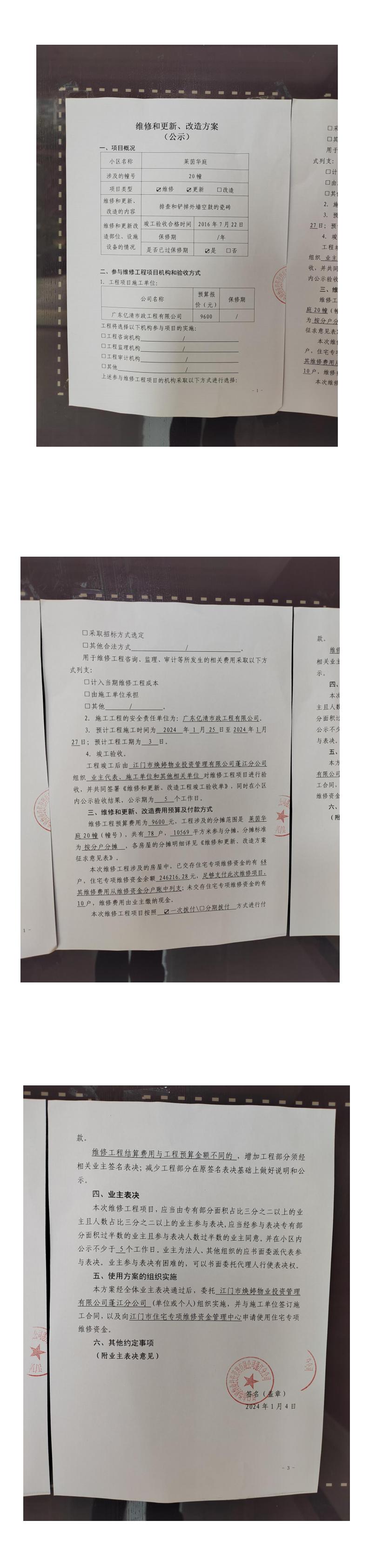 <td valign="top" values="" style="border-width:0" bindtype="0" rowspan="17" colspan="7" datasource="投票结果"><font style=" font-family:方正小标宋简体;font-size:14pt;"><p style="line-height: 1.75em;"><span style="font-family: 宋体, SimSun;">各位尊敬的业主:</span><br></p><p style="text-indent: 2em; line-height: 1.75em;"><span style="font-family: 宋体, SimSun;">根据法律法规的规定,本小区业主利用“江门市物业事项表决管理系统”已对本小区公共事务决策事项进行了表决,在经过7日的询异公示期后,未收到业主有效的异议。现将投票结果公告,并就产生的法律效力说明如下:</span></p><p style="line-height: 1.75em; text-indent: 0em;"><strong style="text-indent: 2em;"><span style="font-family: 宋体, SimSun;">一、投票范围</span></strong></p><p style="text-indent: 2em; line-height: 1.75em;"><span style="font-family: 宋体, SimSun;">莱茵华庭蓬江区莱茵华庭20幢</span></p><p style="text-indent: 2em; line-height: 1.75em;"><span style="font-family: 宋体, SimSun;">总人数(专有部分人数之和):78</span></p><p style="text-indent: 2em; line-height: 1.75em;"><span style="font-family: 宋体, SimSun;"><span style="font-family: 宋体, SimSun; text-indent: 32px;"><span style="font-family: 宋体; text-indent: 32px;"><span style="font-family: 宋体; text-indent: 32px;">总户数:78</span></span></span></span></p><p style="text-indent: 2em; line-height: 1.75em;"><span style="font-family: 宋体, SimSun;">建筑物总面积(专有部分面积之和):10569.00㎡</span></p><p style="line-height: 1.75em;"><strong><span style="font-family: 宋体, SimSun;">二、投票结果公告时间</span></strong></p><p style="text-indent: 2em; line-height: 1.75em;"><span style="font-family: 宋体, SimSun;">从2024年01月31日开始</span></p><p style="line-height: 1.75em;"><strong><span style="font-family: 宋体, SimSun;">三、计票规则</span></strong></p><p style="text-indent: 2em; line-height: 1.75em;"><span style="font-family: 宋体, SimSun;">表决事项:使用建筑物及其附属设施的维修资金<br></span></p><p style="font-family: 宋体, SimSun;line-height: 1.75em; text-indent: 2em;">计票规则:弃权票不并入其它项 未表决票不并入其它项</p><p></p><p style="line-height: 1.75em;"><strong><span style="font-family: 宋体, SimSun;">四、通过规则</span></strong></p><p style="line-height: 1.75em;"><strong><span style="font-family: 宋体, SimSun;"> 根据《中华人民共和国民法典》第二百七十八条规定:业主共同决定事项,应当由专有部分面积占比三分之二以上的业主且人数占比三分之二以上的业主参与表决。</span></strong></p><p style="text-indent: 2em; line-height: 1.75em;"><span style="font-family: 宋体, SimSun;"><span style="font-family: 宋体, SimSun; text-indent: 32px;">表决事项:使用建筑物及其附属设施的维修资金<br></span></span></p><p style="font-family: 宋体, SimSun;line-height: 1.75em; text-indent: 2em;">通过规则:参与表决专有部分面积过半数的业主且参与表决人数过半数的业主同意</p><p></p><p style="line-height: 1.75em;"><strong><span style="font-family: 宋体, SimSun;">五、投票结果</span></strong></p><p style="line-height: 1.75em; text-indent: 2em;"><span style="font-family: 宋体, SimSun; text-indent: 2em;"></span></p><div id="resultTable"><table style="table-layout: fixed; font-size:12px; margin-top:10px" width="100%" border="0" cellspacing="0" cellpadding="0"><tbody><tr><td height="28" colspan="10" align="center" style="border: 1px solid #666"><strong style="font-size: 14px;"> 使用建筑物及其附属设施的维修资金</strong></td> </tr><tr id="trfirst"><td height="28" colspan="4" style="border-left: 1px solid #666; border-bottom: 1px solid #666"><strong> 申报单位:</strong> 江门市焕婷物业投资管理有限公司蓬江分公司</td><td colspan="3" style="border-left: 1px solid #666; border-bottom: 1px solid #666"><strong> 联系方式:</strong> 3211392 </td><td colspan="3" style="border-left: 1px solid #666; border-bottom: 1px solid #666; border-right: 1px solid #666"><strong> 申报日期:</strong> 2024年1月8日 </td></tr><tr> <td height="28" colspan="5" style="border-left: 1px solid #666; border-bottom: 1px solid #666"><strong> 总人数(专有部分人数之和):</strong>78人 </td><td colspan="5" style="border-left: 1px solid #666; border-bottom: 1px solid #666; border-right: 1px solid #666"><strong> 建筑物总面积(专有部分面积之和):</strong>10569.00㎡ </td> </tr><tr><td height="28" colspan="10" bgcolor="#F3F3F3" style="border-left: 1px solid #666;border-bottom: 1px solid #666;border-right: 1px solid #666"><strong> 参与表决人数及面积统计</strong></td></tr><tr><td height="28" colspan="5" style="border-left: 1px solid #666; border-bottom: 1px solid #666"><strong> 参与表决人数:</strong>56人</td><td colspan="5" style="border-left: 1px solid #666; border-bottom: 1px solid #666; border-right: 1px solid #666"><strong> 参与表决人数占总人数比例:</strong>71.79%</td></tr><tr><td height="28" colspan="5" style="border-left: 1px solid #666; border-bottom: 1px solid #666"><strong> 参与表决面积:</strong>7580.47㎡</td><td colspan="5" style="border-left: 1px solid #666; border-bottom: 1px solid #666; border-right: 1px solid #666"><strong> 参与表决面积占总面积比例:</strong>71.72%</td></tr><tr><td height="28" colspan="10" bgcolor="#F3F3F3" style="border-left: 1px solid #666; border-bottom: 1px solid #666;border-right: 1px solid #666"> <strong> 参与表决同意人数及面积统计</strong></td> </tr><tr><td height="28" colspan="5" style="border-left: 1px solid #666; border-bottom: 1px solid #666"><strong> 参与表决同意人数:</strong>56人 </td><td colspan="5" style="border-left: 1px solid #666; border-bottom: 1px solid #666; border-right: 1px solid #666"><strong> 参与表决