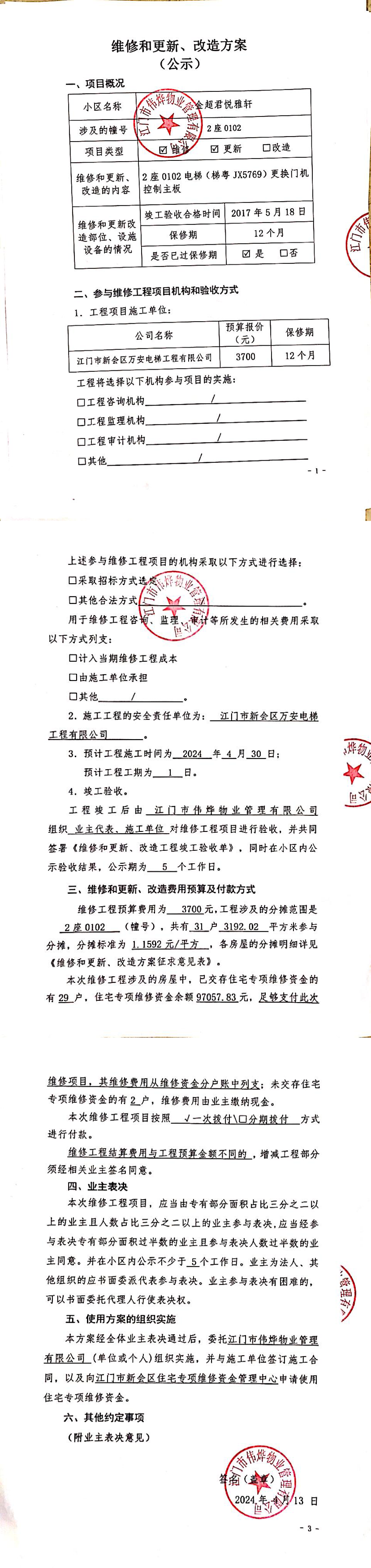 <br/>决定“(一)制定和修改业主大会议事规则”、“(二)制定和修改管理规约”、“(三)选举业主委员会或者更换业主委员会成员”、“(四)选聘和解聘物业服务企业或者其他管理人”、“(五)使用建筑物及其附属设施的维修资金”、“(九)有关共有和共同管理权利的其他重大事项”事项,应当经参与表决专有部分面积过半数的业主且参与表决人数过半数的业主同意。<span style="font-family: 宋体, SimSun; text-indent: 32px;"></span></span></p><p style="text-indent: 2em; line-height: 1.75em;"><span style="font-family: 宋体, SimSun;"></span></p><p style="text-indent: 2em; line-height: 1.75em;"><span style="font-family: 宋体, SimSun;">特此公告。</span></p><p><br/></p><p style="text-align: right; font-family: 宋体; font-size: 16px; line-height: 1.75em;"><span style="font-family: 宋体, SimSun;">江门市伟烨物业管理有限公司</span></p><p style="text-align: right; font-family: 宋体; font-size: 16px; line-height: 1.75em;"><span style="font-family: 宋体, SimSun;">2024年04月29日</span></p></font></td>