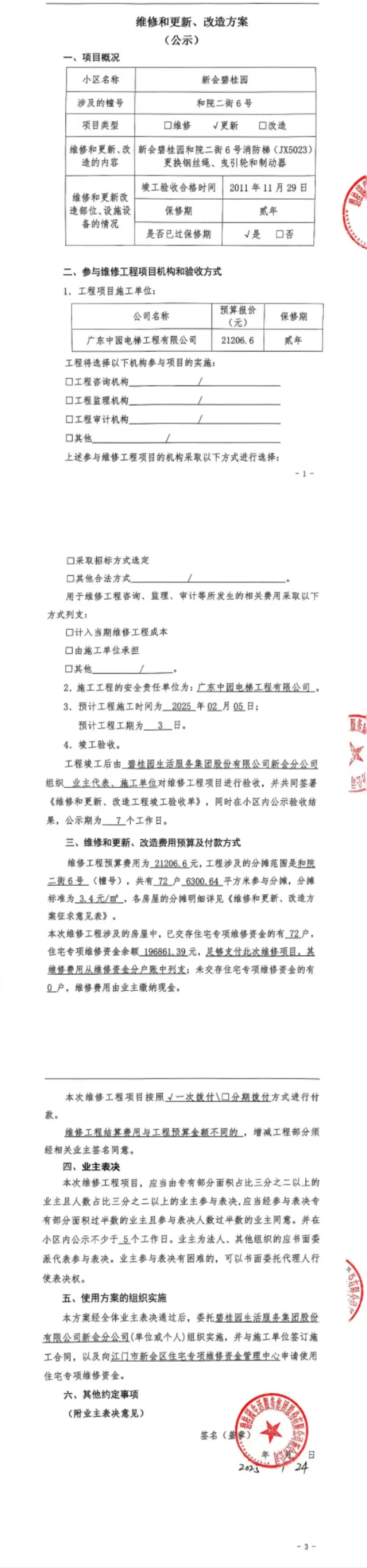 <td VALIGN="top" VALUES="" STYLE="border-width:0" BINDTYPE="0" ROWSPAN="17" COLSPAN="7" DATASOURCE="投票结果" ><font style=" font-family:方正小标宋简体;font-size:14pt;"><p style="line-height: 1.75em;"><span style="font-family: 宋体, SimSun;">各位尊敬的业主:</span><br/></p><p style="text-indent: 2em; line-height: 1.75em;"><span style="font-family: 宋体, SimSun;">根据法律法规的规定,本小区业主利用“江门市物业事项表决管理系统”已对本小区公共事务决策事项进行了表决,在经过7日的询异公示期后,未收到业主有效的异议。现将投票结果公告,并就产生的法律效力说明如下:</span></p><p style="line-height: 1.75em; text-indent: 0em;"><strong style="text-indent: 2em;"><span style="font-family: 宋体, SimSun;">一、投票范围</span></strong></p><p style="text-indent: 2em; line-height: 1.75em;"><span style="font-family: 宋体, SimSun;">新会碧桂园和院二街6号</span></p><p style="text-indent: 2em; line-height: 1.75em;"><span style="font-family: 宋体, SimSun;">总人数(专有部分人数之和):69</span></p><p style="text-indent: 2em; line-height: 1.75em;"><span style="font-family: 宋体, SimSun;"><span style="font-family: 宋体, SimSun; text-indent: 32px;"><span style="font-family: 宋体; text-indent: 32px;"><span style="font-family: 宋体; text-indent: 32px;">总户数:72</span></span></span></span></p><p style="text-indent: 2em; line-height: 1.75em;"><span style="font-family: 宋体, SimSun;">建筑物总面积(专有部分面积之和):6300.64㎡</span></p><p style="line-height: 1.75em;"><strong><span style="font-family: 宋体, SimSun;">二、投票结果公告时间</span></strong></p><p style="text-indent: 2em; line-height: 1.75em;"><span style="font-family: 宋体, SimSun;"><span style="font-family: 宋体, SimSun; text-indent: 32px;">从2025年02月20日开始</span></span></p><p style="line-height: 1.75em;"><strong><span style="font-family: 宋体, SimSun;">三、计票规则</span></strong></p><p style="text-indent: 2em; line-height: 1.75em;"><span style="font-family: 宋体, SimSun;">表决事项:使用建筑物及其附属设施的维修资金<br /><p style='font-family: 宋体, SimSun;line-height: 1.75em; text-indent: 2em;'>计票规则:弃权票不并入其它项&nbsp;&nbsp;&nbsp;&nbsp;未表决票不并入其它项</p></span></p><p style="line-height: 1.75em;"><strong><span style="font-family: 宋体, SimSun;">四、通过规则</span></strong></p><p style="line-height: 1.75em;"><strong><span style="font-family: 宋体, SimSun;">&nbsp; 根据《中华人民共和国民法典》第二百七十八条规定:业主共同决定事项,应当由专有部分面积占比三分之二以上的业主且人数占比三分之二以上的业主参与表决。</span></strong></p><p style="text-indent: 2em; line-height: 1.75em;"><span style="font-family: 宋体, SimSun;"><span style="font-family: 宋体, SimSun; text-indent: 32px;">表决事项:使用建筑物及其附属设施的维修资金<br /><p style='font-family: 宋体, SimSun;line-height: 1.75em; text-indent: 2em;'>通过规则:双2/3以上参与表决,参与表决双过半同意</p></span></span></p><p style="line-height: 1.75em;"><strong><span style="font-family: 宋体, SimSun;">五、投票结果</span></strong></p><p style="line-height: 1.75em; text-indent: 2em;"><span style="font-family: 宋体, SimSun; text-indent: 2em;"><div id='resultTable'><table style='table-layout: fixed; font-size:12px; margin-top:10px' width='100%' border='0' cellspacing='0' cellpadding='0'><tr><td height='28' colspan='10' align='center' style='border: 1px solid #666'><strong style='font-size: 14px;'> 使用建筑物及其附属设施的维修资金</strong></td> </tr><tr id='trfirst'><td height='28' colspan='4' style='border-left: 1px solid #666; border-bottom: 1px solid #666'><strong>&nbsp;申报单位:</strong> 碧桂园生活服务集团股份有限公司新会分公司</td><td colspan='3' style='border-left: 1px solid #666; border-bottom: 1px solid #666'><strong>&nbsp;联系方式:</strong> </td><td colspan='3' style='border-left: 1px solid #666; border-bottom: 1px solid #666; border-right: 1px solid #666'><strong>&nbsp;申报日期:</strong> 2025年1月24日 </td></tr><tr> <td height='28' colspan='5' style='border-left: 1px solid #666; border-bottom: 1px solid #666'><strong>&nbsp;列支总人数(专有部分人数之和):</strong>69人 </td><td colspan='5' style='border-left: 1px solid #666; border-bottom: 1px solid #666; border-right: 1px solid #666'><strong>&nbsp;列支建筑物总面积(专有部分面积之和):</strong>6300.64㎡ </td> </tr><tr><td height='28' colspan='10' bgcolor='#F3F3F3' style='border-left: 1px solid #666;border-bottom: 1px solid #666;border-right: 1px solid #666'><strong>&nbsp;参与表决人数及面积统计</strong></td></tr><tr><td height='28' colspan='5' style='border-left: 1px solid #666; border-bottom: 1px solid #666'><strong>&nbsp;参与表决人数:</strong>50人</td><td colspan='5' style='border-left: 1px solid #666; border-bottom: 1px solid #666; border-right: 1px solid #666'><strong>&nbsp;参与表决人数占总人数比例:</strong>72.46%</td></tr><tr><td height='28' colspan='5' style='border-left: 1px solid #666; border-bottom: 1px solid #666'><strong>&nbsp;参与表决面积:</strong>4550.03㎡</td><td colspan='5' style='border-left: 1px solid #666; border-bottom: 1px solid #666; border-right: 1px solid #666'><strong>&nbsp;参与表决面积占总面积比例:</strong>72.22%</td></tr><tr><td height='28' colspan='10' bgcolor='#F3F3F3' style='border-left: 1px solid #666; border-bottom: 1px solid #666;border-right: 1px solid #666'> <strong>&nbsp;参与表决同意人数及面积统计</strong></td> </tr><tr><td height='28' colspan='5' style='border-left: 1px solid #666; border-bottom: 1px solid #666'><strong>&nbsp;参与表决同意人数:</strong>49人 </td><td colspan='5' style='border-left: 1px solid #