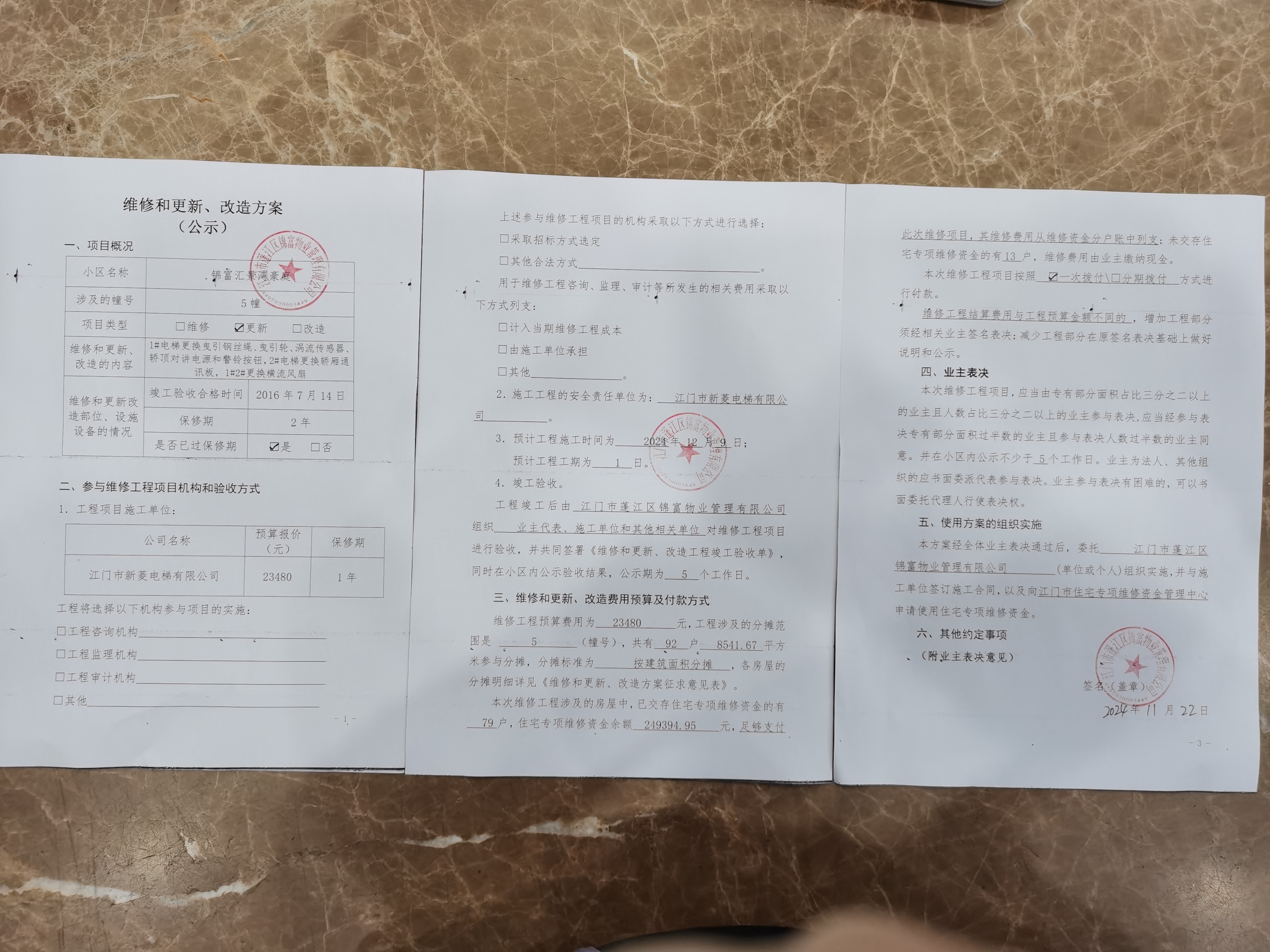<td VALIGN="top" VALUES="" STYLE="border-width:0" BINDTYPE="0" ROWSPAN="19" COLSPAN="7" DATASOURCE="投票结果" ><font style="font-size:14pt;"><p style="white-space: normal; font-family: 宋体; line-height: 1.75em;">江门市蓬江区锦富汇景湾豪庭蓬江区棠下镇锦富汇景湾豪庭5幢全体业主:</p><p style="white-space: normal; font-family: 宋体; line-height: 1.75em; text-indent: 2em;">本小区关于锦富汇景湾5幢电梯更换钢丝绳、轿厢通讯板等工程使用维修资金的投票的投票已表决结束,询异时间从2024年12月12日开始,投票询异公示期间,业主可通过微信查询自己的表决情况或可凭身份证件申请查询自己的表决情况;如公示的业主表决情况与查询的本人表决意见不一致的,可以以书面形式向投票组织机构申诉,投票组织机构予以纠正并重新公示表决结果。异议提出人对投票组织机构的处理仍有异议的,可以向街道办事处(镇人民政府)反映处理,涉及住宅专项维修资金的,可向属地住宅专项维修资金管理中心反映处理。</p><p style="white-space: normal;"><br/></p><p style="white-space: normal; font-family: 宋体; line-height: 1.75em;"><strong>附件:</strong></p><p style="white-space: normal; font-family: 宋体; line-height: 1.75em;"><strong>一、投票范围</strong></p><p style="white-space: normal; font-family: 宋体; line-height: 1.75em; text-indent: 2em;">江门市蓬江区锦富汇景湾豪庭蓬江区棠下镇锦富汇景湾豪庭5幢</p><p style="white-space: normal; font-family: 宋体; line-height: 1.75em; text-indent: 2em;">总人数(专有部分人数之和):92</p><p style="white-space: normal; font-family: 宋体; line-height: 1.75em; text-indent: 2em;"><span style="font-family: 宋体, SimSun;"><span style="font-family: 宋体; text-indent: 32px;"><span style="font-family: 宋体; text-indent: 32px;">总户数:92</span></span></span></p><p style="white-space: normal; font-family: 宋体; line-height: 1.75em; text-indent: 2em;">建筑物总面积(专有部分面积之和):8541.67㎡</p><p style="white-space: normal; font-family: 宋体; line-height: 1.75em;"><strong>二、询异公示起止时间</strong></p><p dir="ltr" style="white-space: normal; font-family: 宋体; line-height: 1.75em; text-indent: 2em;"><span style="text-indent: 36px;">2024年12月12日至2024年12月22日</span></p><p style="white-space: normal; font-family: 宋体; line-height: 1.75em;"><strong>三、投票详细描述</strong></p><p style="white-space: normal; font-family: 宋体; line-height: 1.75em; text-indent: 2em;"><p><span style="font-size: 14px; text-wrap: wrap; background-color: rgb(255, 255, 255); font-family: 宋体;">小区</span><span style="font-family: "Helvetica Neue", Helvetica, Arial, sans-serif; font-size: 14px; text-wrap: wrap; background-color: rgb(255, 255, 255);"><span style="font-family: Calibri;">5</span></span><span style="font-size: 14px; text-wrap: wrap; font-family: 宋体; background: rgb(255, 255, 0);">幢</span><span style="font-size: 14px; text-wrap: wrap; background-color: rgb(255, 255, 255); font-family: 宋体;">的1#2#电梯进行</span><span style="font-size: 14px; text-wrap: wrap; font-family: 宋体; background: rgb(255, 255, 0);">日常维保期间,电梯维保公司发现1#电梯的曳引钢丝绳、曳引轮、涡流传感器、轿顶对讲电源和警铃按钮,2#电梯轿厢通讯板,1#2#电梯的横流风扇出现问题,因此需要更换</span><span style="font-size: 14px; text-wrap: wrap; background-color: rgb(255, 255, 255); font-family: 宋体;">1#电梯曳引钢丝绳、曳引轮、涡流传感器、轿顶对讲电源和警铃按钮,2#电梯轿厢通讯板,1#2#电梯的横流风扇</span><span style="font-size: 14px; text-wrap: wrap; background-color: rgb(255, 255, 255); font-family: 宋体;">。<br/></span><span style="font-family: "Helvetica Neue", Helvetica, Arial, sans-serif; font-size: 14px; text-wrap: wrap; background-color: rgb(255, 255, 255);"></span><span style="font-size: 14px; text-wrap: wrap; background-color: rgb(255, 255, 255); font-family: 宋体;"> 现对</span><span style="font-family: "Helvetica Neue", Helvetica, Arial, sans-serif; font-size: 14px; text-wrap: wrap; background-color: rgb(255, 255, 255);"><span style="font-family: Calibri;">5</span></span><span style="font-size: 14px; text-wrap: wrap; font-family: 宋体; background: rgb(255, 255, 0);">幢1#2#电梯进行维修</span><span style="font-size: 14px; text-wrap: wrap; background-color: rgb(255, 255, 255); font-family: 宋体;">,工程维修预算金额为2348</span><span style="font-size: 14px; text-wrap: wrap; font-family: 宋体; background: rgb(255, 255, 0);"><span style="font-family: Calibri;">0</span>元</span><span style="font-size: 14px; text-wrap: wrap; background-color: rgb(255, 255, 255); font-family: 宋体;">,项目最终费用以施工合同签订金额为准。因已过保修期,维修费用由相关业主</span><span style="font-size: 14px; text-wrap: wrap; font-family: 宋体; background: rgb(255, 255, 0);">按建筑面积</span><span style="font-size: 14px; text-wrap: wrap; background-color: rgb(255, 255, 255); font-family: 宋体;">分摊,</span><span style="font-size: 14px; text-wrap: wrap; font-family: 宋体; background: rgb(255, 255, 0);">每平方约<span style="font-family: Calibri;">2.75</span>元</span><span style="font-size: 14px; text-wrap: wrap; background-color: rgb(255, 255, 255); font-family: 宋体;">,详见公示附件。如业主手机不能正常通过微信投票,请联系物业公司进行线下纸质投票,</span><span style="font-size: 14px; text-wrap: wrap; background-color: rgb(255, 255, 255); font-family: 宋体;">管理员电话:13726176850 </span><span style="font-size: 14px; text-wrap: wrap; background-color: rgb(255, 255, 255); font-family: 宋体;">物业电话</span><span style="font-size: 14px; text-wrap: wrap; font-family: 宋体; background: rgb(255, 