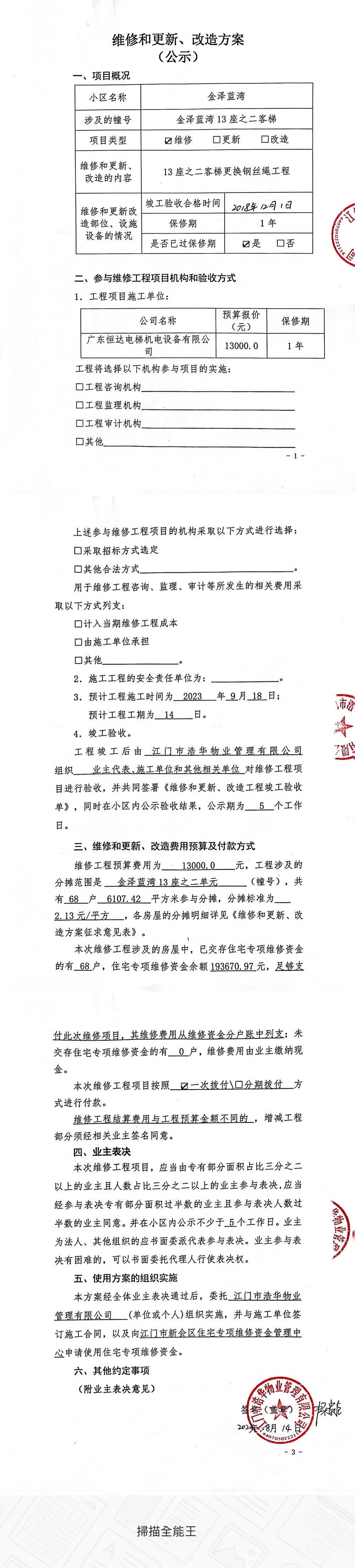 <td valign="top" values="" style="border-width:0" bindtype="0" rowspan="17" colspan="7" datasource="投票结果"><font style=" font-family:方正小标宋简体;font-size:14pt;"><p style="line-height: 1.75em;"><span style="font-family: 宋体, SimSun;">各位尊敬的业主:</span><br></p><p style="text-indent: 2em; line-height: 1.75em;"><span style="font-family: 宋体, SimSun;">根据法律法规的规定,本小区业主利用“物业公共事务决策系统”已对本小区公共事务决策事项进行了表决,在经过7日的询异公示期后,未收到业主有效的异议。现将投票结果公告,并就产生的法律效力说明如下:</span></p><p style="line-height: 1.75em; text-indent: 0em;"><strong style="text-indent: 2em;"><span style="font-family: 宋体, SimSun;">一、投票范围</span></strong></p><p style="text-indent: 2em; line-height: 1.75em;"><span style="font-family: 宋体, SimSun;">金泽蓝湾金泽蓝湾13座之二</span></p><p style="text-indent: 2em; line-height: 1.75em;"><span style="font-family: 宋体, SimSun;">总人数(专有部分人数之和):68</span></p><p style="text-indent: 2em; line-height: 1.75em;"><span style="font-family: 宋体, SimSun;"><span style="font-family: 宋体, SimSun; text-indent: 32px;">总户数:68</span></span></p><p style="text-indent: 2em; line-height: 1.75em;"><span style="font-family: 宋体, SimSun;">建筑物总面积(专有部分面积之和):6107.42㎡</span></p><p style="line-height: 1.75em;"><strong><span style="font-family: 宋体, SimSun;">二、投票起止时间</span></strong></p><p style="text-indent: 2em; line-height: 1.75em;"><span style="font-family: 宋体, SimSun;">投票表决时间:从2023年08月22日到2023年09月04日止</span></p><p style="text-indent: 2em; line-height: 1.75em;"><span style="font-family: 宋体, SimSun;">投票询异公示时间:从2023年09月05日开始</span></p><p style="text-indent: 2em; line-height: 1.75em;"><span style="font-family: 宋体, SimSun;">投票结果通知公告时间:从2023年09月12日开始</span></p><p style="line-height: 1.75em;"><strong><span style="font-family: 宋体, SimSun;">三、计票规则</span></strong></p><p style="text-indent: 2em; line-height: 1.75em;"><span style="font-family: 宋体, SimSun;">表决事项:使用建筑物及其附属设施的维修资金<br></span></p><p style="font-family: 宋体, SimSun;line-height: 1.75em; text-indent: 2em;">计票规则:弃权票不并入其它项 未表决票不并入其它项</p><p></p><p style="line-height: 1.75em;"><strong><span style="font-family: 宋体, SimSun;">四、通过规则</span></strong></p><p style="text-indent: 2em; line-height: 1.75em;"><span style="font-family: 宋体, SimSun;"><span style="font-family: 宋体, SimSun; text-indent: 32px;">表决事项:使用建筑物及其附属设施的维修资金<br></span></span></p><p style="font-family: 宋体, SimSun;line-height: 1.75em; text-indent: 2em;">通过规则:参与表决专有部分面积过半数的业主且参与表决人数过半数的业主同意</p><p></p><p style="line-height: 1.75em;"><strong><span style="font-family: 宋体, SimSun;">五、投票结果</span></strong></p><p style="line-height: 1.75em; text-indent: 2em;"><span style="font-family: 宋体, SimSun; text-indent: 2em;"></span></p><div id="resultTable"><table style="table-layout: fixed; font-size:12px; margin-top:10px" width="100%" border="0" cellspacing="0" cellpadding="0"><tbody><tr><td height="28" colspan="10" align="center" style="border: 1px solid #666"><strong style="font-size: 14px;"> 使用建筑物及其附属设施的维修资金</strong></td> </tr><tr id="trfirst"><td height="28" colspan="4" style="border-left: 1px solid #666; border-bottom: 1px solid #666"><strong> 申报单位:</strong> 江门市浩华物业管理有限公司</td><td colspan="3" style="border-left: 1px solid #666; border-bottom: 1px solid #666"><strong> 联系方式:</strong> 0750-6892282 </td><td colspan="3" style="border-left: 1px solid #666; border-bottom: 1px solid #666; border-right: 1px solid #666"><strong> 申报日期:</strong> 2023年8月22日 </td></tr><tr> <td height="28" colspan="5" style="border-left: 1px solid #666; border-bottom: 1px solid #666"><strong> 总人数(专有部分人数之和):</strong>68人 </td><td colspan="5" style="border-left: 1px solid #666; border-bottom: 1px solid #666; border-right: 1px solid #666"><strong> 建筑物总面积(专有部分面积之和):</strong>6107.42㎡ </td> </tr><tr><td height="28" colspan="10" bgcolor="#F3F3F3" style="border-left: 1px solid #666;border-bottom: 1px solid #666;border-right: 1px solid #666"><strong> 参与人数及面积统计</strong></td></tr><tr><td height="28" colspan="5" style="border-left: 1px solid #666; border-bottom: 1px solid #666"><strong> 参与表决专有部分人数之和:</strong>47人</td><td colspan="5" style="border-left: 1px solid #666; border-bottom: 1px solid #666; border-right: 1px solid #666"><strong> 参与表决占有表决权总人数比例:</strong>69.12%</td></tr><tr><td height="28" colspan="5" style="border-left: 1px solid #666; border-bottom: 1px solid #666"><strong> 参与表决专有部分面积之和:</strong>4205.78㎡</td><td colspan="5" style="border-left: 1px solid #666; border-bottom: 1px solid #666; border-right: 1px solid #666"><strong> 参与表决占有表决权总面积比例:</strong>68.86%</td></tr><tr><td height="28" colspan="10" bgcolor="#F3F3F3" style="border-left: 1px solid #666; border-bottom: 1px solid #666;border-right: 1px solid #666"> <strong> 未参与人数及面积统计</strong></td> </tr><tr><td height="28" colspan="5" style="border-left: 1px solid #666; border-bottom: 1px solid #666"><strong> 未参与表决专有部分人数之和:</strong>21人 </td><td colspan="5" style="border-left: 1px solid #666; border-bottom: 1px solid #666; border-right: 1px solid #666"><strong> 未参与表决占有表决权总人数比例:</strong>30.88%</td></tr><tr><td height