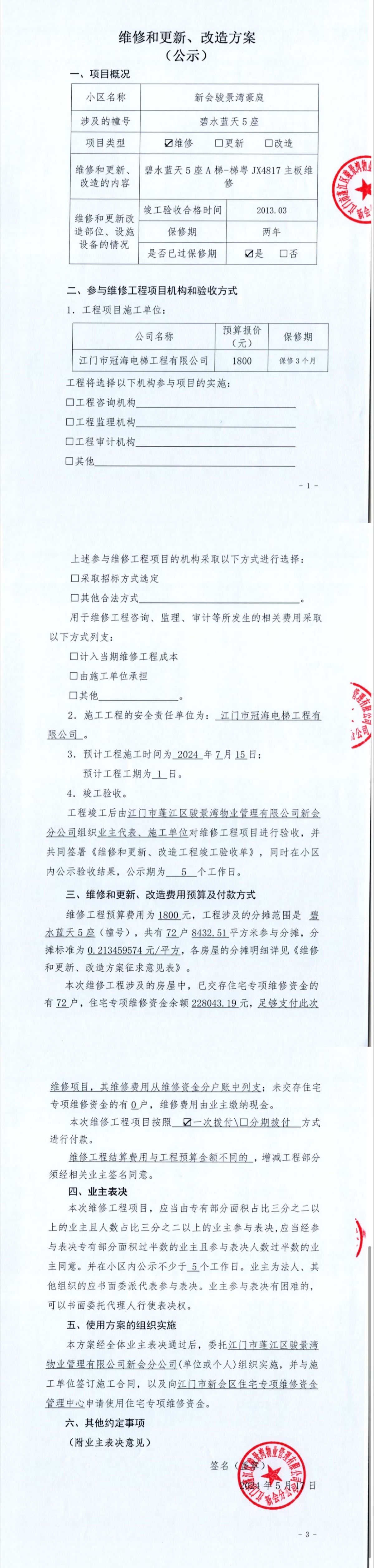 <td VALIGN="top" VALUES="" STYLE="border-width:0" BINDTYPE="0" ROWSPAN="19" COLSPAN="7" DATASOURCE="投票结果" ><font style="font-size:14pt;"><p style="white-space: normal; font-family: 宋体; line-height: 1.75em;">新会骏景湾豪庭碧水蓝天5座全体业主:</p><p style="white-space: normal; font-family: 宋体; line-height: 1.75em; text-indent: 2em;">本小区关于新会骏景湾豪庭碧水蓝天5座A电梯维修主板使用维修资金的投票的投票已表决结束,询异时间从2024年06月12日开始,投票询异公示期间,业主可通过微信查询自己的表决情况或可凭身份证件申请查询自己的表决情况;如公示的业主表决情况与查询的本人表决意见不一致的,可以以书面形式向投票组织机构申诉,投票组织机构予以纠正并重新公示表决结果。异议提出人对投票组织机构的处理仍有异议的,可以向街道办事处(镇人民政府)反映处理,涉及住宅专项维修资金的,可向属地住宅专项维修资金管理中心反映处理。</p><p style="white-space: normal;"><br/></p><p style="white-space: normal; font-family: 宋体; line-height: 1.75em;"><strong>附件:</strong></p><p style="white-space: normal; font-family: 宋体; line-height: 1.75em;"><strong>一、投票范围</strong></p><p style="white-space: normal; font-family: 宋体; line-height: 1.75em; text-indent: 2em;">新会骏景湾豪庭碧水蓝天5座</p><p style="white-space: normal; font-family: 宋体; line-height: 1.75em; text-indent: 2em;">总人数(专有部分人数之和):72</p><p style="white-space: normal; font-family: 宋体; line-height: 1.75em; text-indent: 2em;"><span style="font-family: 宋体, SimSun;"><span style="font-family: 宋体; text-indent: 32px;"><span style="font-family: 宋体; text-indent: 32px;">总户数:72</span></span></span></p><p style="white-space: normal; font-family: 宋体; line-height: 1.75em; text-indent: 2em;">建筑物总面积(专有部分面积之和):8432.51㎡</p><p style="white-space: normal; font-family: 宋体; line-height: 1.75em;"><strong>二、询异公示起止时间</strong></p><p dir="ltr" style="white-space: normal; font-family: 宋体; line-height: 1.75em; text-indent: 2em;"><span style="text-indent: 36px;">2024年06月12日至2024年06月18日</span></p><p style="white-space: normal; font-family: 宋体; line-height: 1.75em;"><strong>三、投票详细描述</strong></p><p style="white-space: normal; font-family: 宋体; line-height: 1.75em; text-indent: 2em;"><p style="font-family: "Helvetica Neue", Helvetica, Arial, sans-serif; font-size: 14px; white-space: normal; background-color: rgb(255, 255, 255);">小区碧水蓝天5座电梯同时上下,经检查,发现A梯主板自然损坏,需要维修。</p><p style="font-family: "Helvetica Neue", Helvetica, Arial, sans-serif; font-size: 14px; white-space: normal; background-color: rgb(255, 255, 255);"> 现对碧水蓝天5座A梯-梯粤JX4817主板进行维修,工程维修预算金额为1800元,项目最终费用以施工合同签订金额为准。因已过保修期,维修费用由相关业主按建筑面积分摊,每平方约0.213459574元,详见公示附件。如业主手机不能正常通过微信投票,请联系物业公司进行线下纸质投票,物业电话:0750-6179992。</p><p><br/></p></p><p style="white-space: normal; font-family: 宋体; line-height: 1.75em;"><strong>四、计票规则</strong></p><p style="white-space: normal; font-family: 宋体; line-height: 1.75em; text-indent: 2em;">表决事项:使用建筑物及其附属设施的维修资金<br /><p style='text-align: left; font-family: 宋体; font-size: 16px; line-height: 1.75em; text-indent: 2em;'>计票规则:弃权票不并入其它项 未表决票不并入其它项</p></p><p style="white-space: normal; font-family: 宋体; line-height: 1.75em;"><strong>五、通过规则</strong></p><p style="white-space: normal; font-family: 宋体; line-height: 1.75em;"><strong><strong style="white-space: normal;"><span style="font-family: 宋体, SimSun;"> 根据《中华人民共和国民法典》第二百七十八条规定:业主共同决定事项,应当由专有部分面积占比三分之二以上的业主且人数占比三分之二以上的业主参与表决。</span></strong></strong></p><p style="white-space: normal; font-family: 宋体; line-height: 1.75em; text-indent: 2em;">表决事项:使用建筑物及其附属设施的维修资金<br /><p style='text-align: left; font-family: 宋体; font-size: 16px; line-height: 1.75em; text-indent: 2em;'>通过规则:双2/3以上参与表决,参与表决双过半同意</p></p><p style="white-space: normal; font-family: 宋体; line-height: 1.75em;"><strong>六、投票结果</strong></p><p style="white-space: normal; font-family: 宋体; line-height: 1.75em; text-indent: 2em;"><div id='resultTable'><table style='table-layout: fixed; font-size:12px; margin-top:10px' width='100%' border='0' cellspacing='0' cellpadding='0'><tr><td height='28' colspan='10' align='center' style='border: 1px solid #666'><strong style='font-size: 14px;'> 使用建筑物及其附属设施的维修资金</strong></td> </tr><tr id='trfirst'><td height='28' colspan='4' style='border-left: 1px solid #666; border-bottom: 1px solid #666'><strong> 申报单位:</strong> 江门市蓬江区骏景湾物业管理有限公司新会分公司</td><td colspan='3' style='border-left: 1px solid #666; border-bottom: 1px solid #666'><strong> 联系方式:</strong> </td><td colspan='3' style='border-left: 1px solid #666; border-bottom: 1px solid #666; border-right: 1px solid #666'><strong> 申报日期:</strong> 2024年5月17日 </td></tr><tr> <td height='28' colspan='5' style='border-left: 1px solid #666; border-bottom: 1px solid #666'><strong> 总人数(专有部分人数之和):</strong>72人 </td><td colspan='5' style='border-left: 1px solid #666; border-bottom: 1px solid #666; border-right: 1px solid #666'><strong> 建筑物总面积(专有部分面积