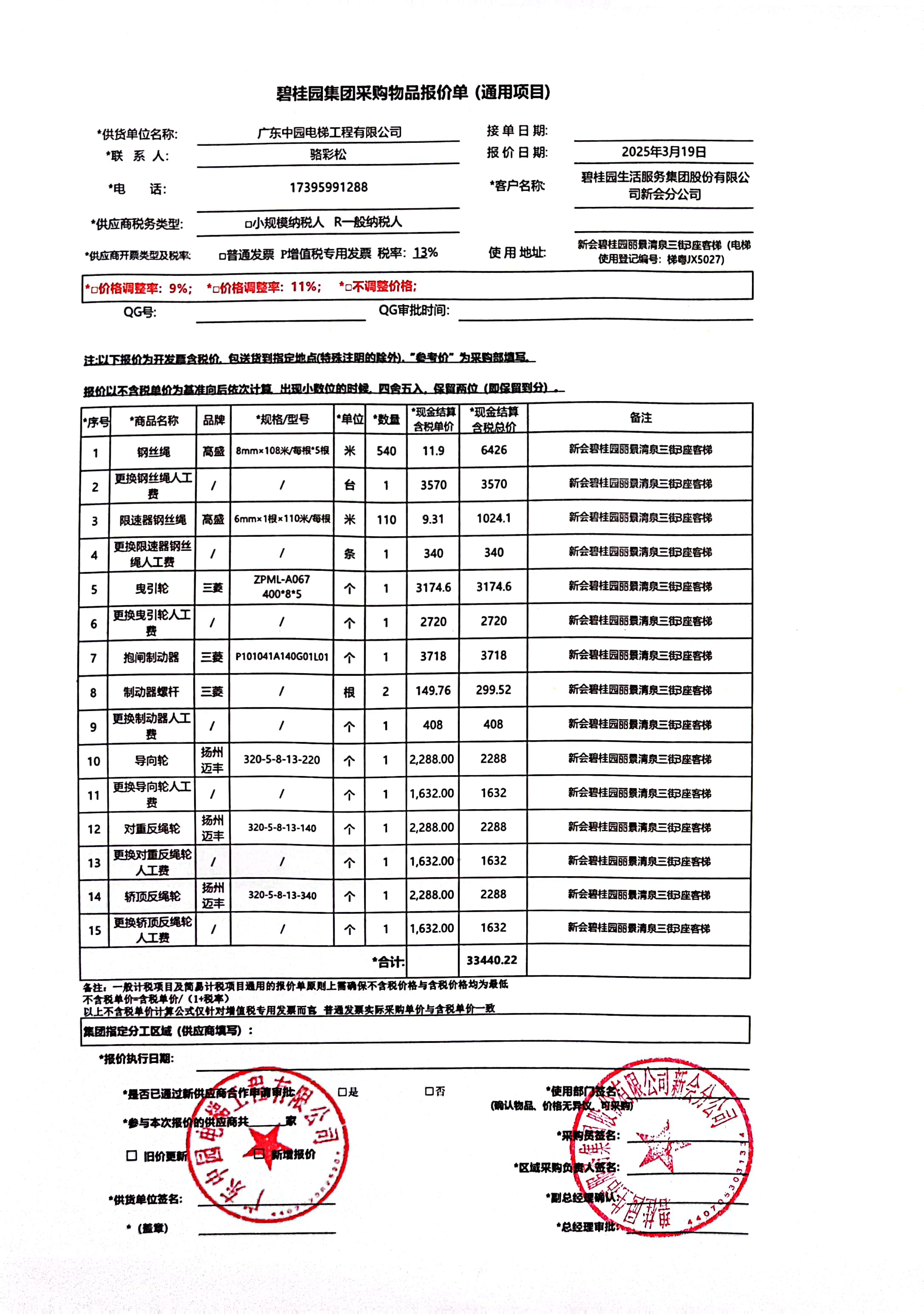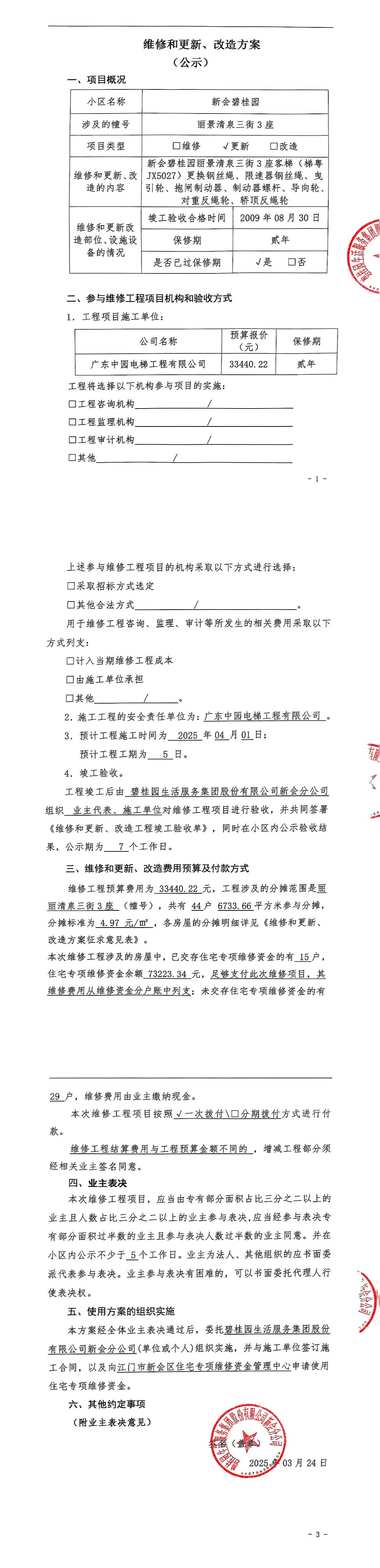 <td VALIGN="top" VALUES="" STYLE="border-width:0" BINDTYPE="0" ROWSPAN="19" COLSPAN="7" DATASOURCE="投票结果" ><font style="font-size:14pt;"><p style="white-space: normal; font-family: 宋体; line-height: 1.75em;">新会碧桂园丽景清泉三街3座全体业主:</p><p style="white-space: normal; font-family: 宋体; line-height: 1.75em; text-indent: 2em;">本小区关于新会碧桂园丽景清泉三街3座客梯(梯粤JX5027)更换钢丝绳、限速器钢丝绳、曳引轮、抱闸制动器、制动器螺杆、导向轮、对重反绳轮、轿顶反绳轮使用维修资金的投票的投票已表决结束,询异时间从2025年03月28日开始,投票询异公示期间,业主可通过微信查询自己的表决情况或可凭身份证件申请查询自己的表决情况;如公示的业主表决情况与查询的本人表决意见不一致的,可以以书面形式向投票组织机构申诉,投票组织机构予以纠正并重新公示表决结果。异议提出人对投票组织机构的处理仍有异议的,可以向街道办事处(镇人民政府)反映处理,涉及住宅专项维修资金的,可向属地住宅专项维修资金管理中心反映处理。</p><p style="white-space: normal;"><br/></p><p style="white-space: normal; font-family: 宋体; line-height: 1.75em;"><strong>附件:</strong></p><p style="white-space: normal; font-family: 宋体; line-height: 1.75em;"><strong>一、投票范围</strong></p><p style="white-space: normal; font-family: 宋体; line-height: 1.75em; text-indent: 2em;">新会碧桂园丽景清泉三街3座</p><p style="white-space: normal; font-family: 宋体; line-height: 1.75em; text-indent: 2em;">总人数(专有部分人数之和):37</p><p style="white-space: normal; font-family: 宋体; line-height: 1.75em; text-indent: 2em;"><span style="font-family: 宋体, SimSun;"><span style="font-family: 宋体; text-indent: 32px;"><span style="font-family: 宋体; text-indent: 32px;">总户数:44</span></span></span></p><p style="white-space: normal; font-family: 宋体; line-height: 1.75em; text-indent: 2em;">建筑物总面积(专有部分面积之和):6733.66㎡</p><p style="white-space: normal; font-family: 宋体; line-height: 1.75em;"><strong>二、询异公示起止时间</strong></p><p dir="ltr" style="white-space: normal; font-family: 宋体; line-height: 1.75em; text-indent: 2em;"><span style="text-indent: 36px;">2025年03月28日至2025年04月07日</span></p><p style="white-space: normal; font-family: 宋体; line-height: 1.75em;"><strong>三、投票详细描述</strong></p><p style="white-space: normal; font-family: 宋体; line-height: 1.75em; text-indent: 2em;"><p><span style="font-family: 宋体; font-size: 14px; background-color: rgb(255, 255, 255);">新会碧桂园丽景清泉三街3座客梯(梯粤JX5027)运行时出现异常,经检查,是由于客梯钢丝绳出红粉、断股,限速器钢丝绳出油泥,曳引轮、导向轮、轿顶反绳轮、对重反绳轮使用时间长造成磨损严重,制动器停梯时异响,制动器螺杆螺丝打滑。现对新会碧桂园丽景清泉三街3座客梯(梯粤JX5027)钢丝绳、限速器钢丝绳、曳引轮、抱闸制动器、制动器螺杆、导向轮、对重反绳轮、轿顶反绳轮进行更换,工程维修预算约33440.22元,项目最终费用以施工合同签订为准。因已过保修期,维修费用由相关业主按建筑面积分摊,每平方约4.97元,详见公示附件,如业主手机不能正常通过微信投票,请联系物业公司进行线下纸质投票,物业电话:17308202880梁锦强管家.</span></p></p><p style="white-space: normal; font-family: 宋体; line-height: 1.75em;"><strong>四、计票规则</strong></p><p style="white-space: normal; font-family: 宋体; line-height: 1.75em; text-indent: 2em;">表决事项:使用建筑物及其附属设施的维修资金<br /><p style='text-align: left; font-family: 宋体; font-size: 16px; line-height: 1.75em; text-indent: 2em;'>计票规则:弃权票不并入其它项 未表决票不并入其它项</p></p><p style="white-space: normal; font-family: 宋体; line-height: 1.75em;"><strong>五、通过规则</strong></p><p style="white-space: normal; font-family: 宋体; line-height: 1.75em;"><strong><strong style="white-space: normal;"><span style="font-family: 宋体, SimSun;"> 根据《中华人民共和国民法典》第二百七十八条规定:业主共同决定事项,应当由专有部分面积占比三分之二以上的业主且人数占比三分之二以上的业主参与表决。</span></strong></strong></p><p style="white-space: normal; font-family: 宋体; line-height: 1.75em; text-indent: 2em;">表决事项:使用建筑物及其附属设施的维修资金<br /><p style='text-align: left; font-family: 宋体; font-size: 16px; line-height: 1.75em; text-indent: 2em;'>通过规则:双2/3以上参与表决,参与表决双过半同意</p></p><p style="white-space: normal; font-family: 宋体; line-height: 1.75em;"><strong>六、投票结果</strong></p><p style="white-space: normal; font-family: 宋体; line-height: 1.75em; text-indent: 2em;"><div id='resultTable'><table style='table-layout: fixed; font-size:12px; margin-top:10px' width='100%' border='0' cellspacing='0' cellpadding='0'><tr><td height='28' colspan='10' align='center' style='border: 1px solid #666'><strong style='font-size: 14px;'> 使用建筑物及其附属设施的维修资金</strong></td> </tr><tr id='trfirst'><td height='28' colspan='4' style='border-left: 1px solid #666; border-bottom: 1px solid #666'><strong> 申报单位:</strong> 碧桂园生活服务集团股份有限公司新会分公司</td><td colspan='3' style='border-left: 1px solid #666; border-bottom: 1px solid #666'><strong> 联系方式:</strong> </td><td colspan='3' style='border-left: 1px solid #666; border-bottom: 1px solid #666; border-right: 1px solid #666'><strong> 申报日期:</strong> 2025年3月25日 </td></tr><tr> <td height='28' colspan='5' style='border-left: 1px sol