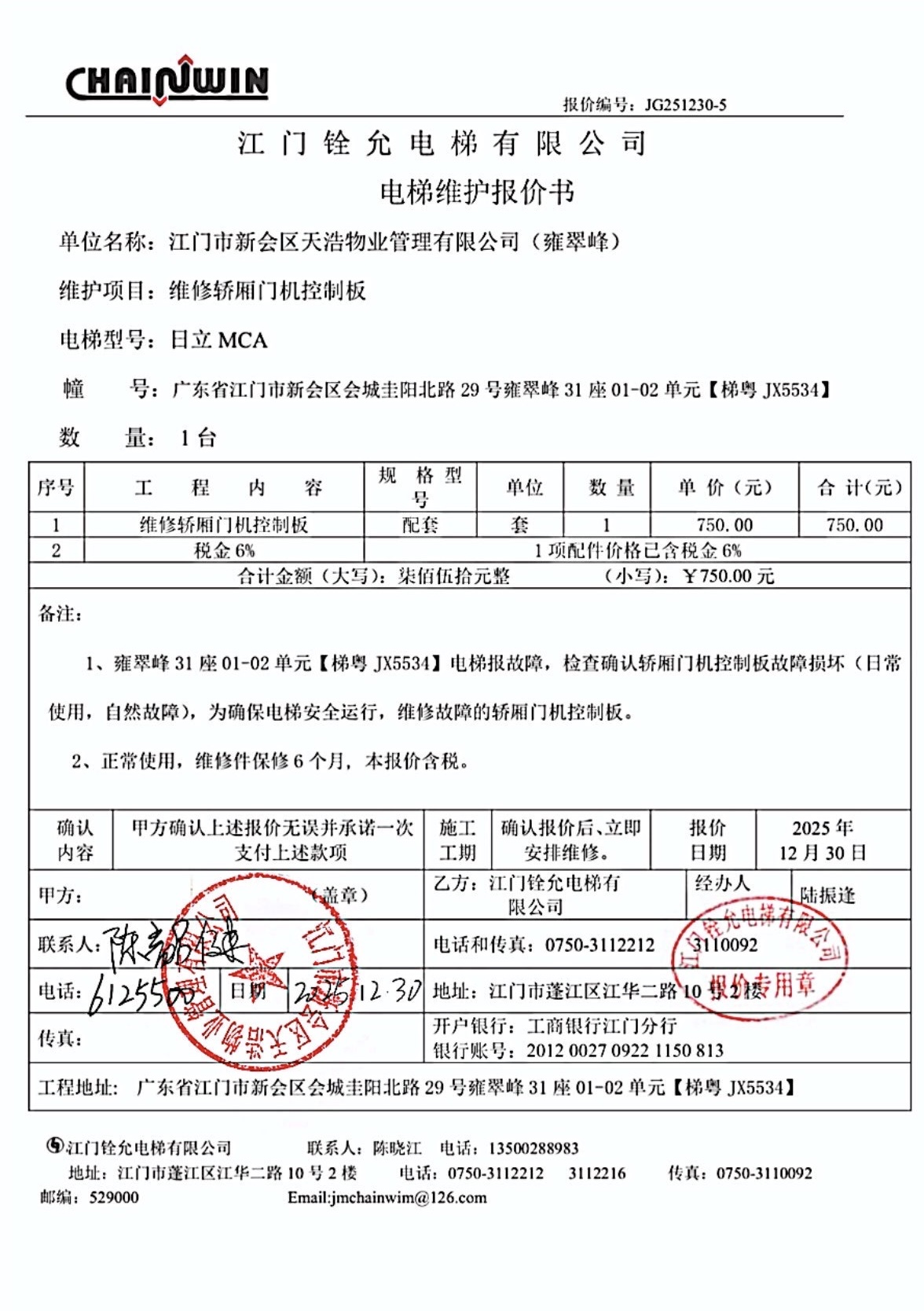 <td VALIGN="top" VALUES="" STYLE="border-width:0" BINDTYPE="0" ROWSPAN="19" COLSPAN="7" DATASOURCE="投票结果" ><font style="font-size:14pt;"><p style="white-space: normal; font-family: 宋体; line-height: 1.75em;">雍翠峰雍翠峰31座全体业主:</p><p style="white-space: normal; font-family: 宋体; line-height: 1.75em; text-indent: 2em;">本小区关于雍翠峰31座01-02单元电梯【梯粤JX5534】维修轿厢门机控制板使用维修资金的投票的投票已表决结束,询异时间从2026年01月12日开始,投票询异公示期间,业主可通过微信查询自己的表决情况或可凭身份证件申请查询自己的表决情况;如公示的业主表决情况与查询的本人表决意见不一致的,可以以书面形式向投票组织机构申诉,投票组织机构予以纠正并重新公示表决结果。异议提出人对投票组织机构的处理仍有异议的,可以向街道办事处(镇人民政府)反映处理,涉及住宅专项维修资金的,可向属地住宅专项维修资金管理中心反映处理。</p><p style="white-space: normal;"><br/></p><p style="white-space: normal; font-family: 宋体; line-height: 1.75em;"><strong>附件:</strong></p><p style="white-space: normal; font-family: 宋体; line-height: 1.75em;"><strong>一、投票范围</strong></p><p style="white-space: normal; font-family: 宋体; line-height: 1.75em; text-indent: 2em;">雍翠峰雍翠峰31座</p><p style="white-space: normal; font-family: 宋体; line-height: 1.75em; text-indent: 2em;">总人数(专有部分人数之和):19</p><p style="white-space: normal; font-family: 宋体; line-height: 1.75em; text-indent: 2em;"><span style="font-family: 宋体, SimSun;"><span style="font-family: 宋体; text-indent: 32px;"><span style="font-family: 宋体; text-indent: 32px;">总户数:20</span></span></span></p><p style="white-space: normal; font-family: 宋体; line-height: 1.75em; text-indent: 2em;">建筑物总面积(专有部分面积之和):1623.19㎡</p><p style="white-space: normal; font-family: 宋体; line-height: 1.75em;"><strong>二、询异公示起止时间</strong></p><p dir="ltr" style="white-space: normal; font-family: 宋体; line-height: 1.75em; text-indent: 2em;"><span style="text-indent: 36px;">2026年01月12日至2026年01月22日</span></p><p style="white-space: normal; font-family: 宋体; line-height: 1.75em;"><strong>三、投票详细描述</strong></p><p style="white-space: normal; font-family: 宋体; line-height: 1.75em; text-indent: 2em;"><p> 雍翠峰31座01-02单元电梯【梯粤JX5534】,电梯上报关门异常,经检查确认为电梯轿厢门机控制板故障,配件日常使用自然损坏,已过保修期。</p><p> 现需申请使用维修资金对31座01-02单元电梯【梯粤JX5534】进行维修,工程维修预算金额为750元,项目最终费用以施工合同签订金额为准。维修费用的分摊标准为按分户分摊,每户分摊37.5元,详见公示附件。如业主不能正常通过微信投票,请联系物业公司进行线下纸质投票,物业电话:0750-6125500</p><p><br/></p></p><p style="white-space: normal; font-family: 宋体; line-height: 1.75em;"><strong>四、计票规则</strong></p><p style="white-space: normal; font-family: 宋体; line-height: 1.75em; text-indent: 2em;">表决事项:使用建筑物及其附属设施的维修资金<br /><p style='text-align: left; font-family: 宋体; font-size: 16px; line-height: 1.75em; text-indent: 2em;'>计票规则:弃权票不并入其它项 未表决票不并入其它项</p></p><p style="white-space: normal; font-family: 宋体; line-height: 1.75em;"><strong>五、通过规则</strong></p><p style="white-space: normal; font-family: 宋体; line-height: 1.75em;"><strong><strong style="white-space: normal;"><span style="font-family: 宋体, SimSun;"> 根据《中华人民共和国民法典》第二百七十八条规定:业主共同决定事项,应当由专有部分面积占比三分之二以上的业主且人数占比三分之二以上的业主参与表决。</span></strong></strong></p><p style="white-space: normal; font-family: 宋体; line-height: 1.75em; text-indent: 2em;">表决事项:使用建筑物及其附属设施的维修资金<br /><p style='text-align: left; font-family: 宋体; font-size: 16px; line-height: 1.75em; text-indent: 2em;'>通过规则:双2/3以上参与表决,参与表决双过半同意</p></p><p style="white-space: normal; font-family: 宋体; line-height: 1.75em;"><strong>六、投票结果</strong></p><p style="white-space: normal; font-family: 宋体; line-height: 1.75em; text-indent: 2em;"><div id='resultTable'><table style='table-layout: fixed; font-size:12px; margin-top:10px' width='100%' border='0' cellspacing='0' cellpadding='0'><tr><td height='28' colspan='10' align='center' style='border: 1px solid #666'><strong style='font-size: 14px;'> 使用建筑物及其附属设施的维修资金</strong></td> </tr><tr id='trfirst'><td height='28' colspan='4' style='border-left: 1px solid #666; border-bottom: 1px solid #666'><strong> 申报单位:</strong> 江门市新会区天浩物业管理有限公司</td><td colspan='3' style='border-left: 1px solid #666; border-bottom: 1px solid #666'><strong> 联系方式:</strong> </td><td colspan='3' style='border-left: 1px solid #666; border-bottom: 1px solid #666; border-right: 1px solid #666'><strong> 申报日期:</strong> 2025年12月30日 </td></tr><tr> <td height='28' colspan='5' style='border-left: 1px solid #666; border-bottom: 1px solid #666'><strong> 总人数(专有部分人数之和):</strong>19人 </td><td colspan='5' style='border-left: 1px solid #666; border-bottom: 1px solid #666; border-right: 1px solid #666'><strong> 建筑物总面积(专有部分面积之和):</strong>1623.19㎡ </td> </tr><tr><td height='28' colspan='10' bgcolor='#F3F3F3' style='border-left: 1px solid #666;border-bottom: 1px solid #666;border-right: 1px solid #666'><strong> 参与人数及面积统计</strong></td></tr><tr>