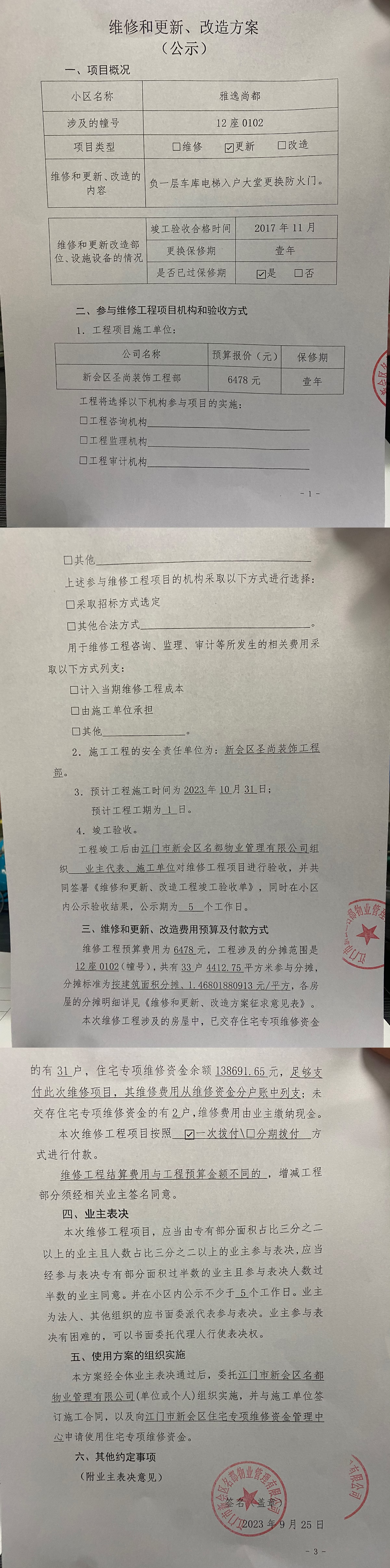 <td VALIGN="top" VALUES="" STYLE="border-width:0" BINDTYPE="0" ROWSPAN="19" COLSPAN="7" DATASOURCE="投票结果" ><font style="font-size:14pt;"><p style="white-space: normal; font-family: 宋体; line-height: 1.75em;">雅逸尚都雅逸尚都12座全体业主:</p><p style="white-space: normal; font-family: 宋体; line-height: 1.75em; text-indent: 2em;">本小区关于雅逸尚都12座0102单元车库入户大堂更换防火门使用维修资金的投票的投票已表决结束,询异时间从2023年10月25日开始,投票询异公示期间,业主可通过微信查询自己的表决情况或可凭身份证件申请查询自己的表决情况;如公示的业主表决情况与查询的本人表决意见不一致的,可以以书面形式向投票组织机构申诉,投票组织机构予以纠正并重新公示表决结果。异议提出人对投票组织机构的处理仍有异议的,可以向街道办事处(镇人民政府)反映处理,涉及住宅专项维修资金的,可向属地住宅专项维修资金管理中心反映处理。</p><p style="white-space: normal;"><br/></p><p style="white-space: normal; font-family: 宋体; line-height: 1.75em;"><strong>附件:</strong></p><p style="white-space: normal; font-family: 宋体; line-height: 1.75em;"><strong>一、投票范围</strong></p><p style="white-space: normal; font-family: 宋体; line-height: 1.75em; text-indent: 2em;">雅逸尚都雅逸尚都12座</p><p style="white-space: normal; font-family: 宋体; line-height: 1.75em; text-indent: 2em;">总人数(专有部分人数之和):33</p><p style="white-space: normal; font-family: 宋体; line-height: 1.75em; text-indent: 2em;"><span style="font-family: 宋体, SimSun;">总户数:33</span></p><p style="white-space: normal; font-family: 宋体; line-height: 1.75em; text-indent: 2em;">建筑物总面积(专有部分面积之和):4412.75㎡</p><p style="white-space: normal; font-family: 宋体; line-height: 1.75em;"><strong>二、询异公示起止时间</strong></p><p dir="ltr" style="white-space: normal; font-family: 宋体; line-height: 1.75em; text-indent: 2em;"><span style="text-indent: 36px;">2023年10月25日至2023年10月31日</span></p><p style="white-space: normal; font-family: 宋体; line-height: 1.75em;"><strong>三、投票详细描述</strong></p><p style="white-space: normal; font-family: 宋体; line-height: 1.75em; text-indent: 2em;"><p><span style="font-family: "Helvetica Neue", Helvetica, Arial, sans-serif; font-size: 14px; text-wrap: wrap; background-color: rgb(255, 255, 255);">本小区12座0102单元车库入户大堂防火门需要更换。现需申请使用维修资金对</span><span style="font-family: "Helvetica Neue", Helvetica, Arial, sans-serif; font-size: 14px; text-wrap: wrap; background-color: rgb(255, 255, 255);"><span style="font-family: "Helvetica Neue", Helvetica, Arial, sans-serif; font-size: 14px; text-wrap: wrap; background-color: rgb(255, 255, 255);">12座0102</span>负一层车库电梯入户大堂防火门</span><span style="font-family: "Helvetica Neue", Helvetica, Arial, sans-serif; font-size: 14px; text-wrap: wrap; background-color: rgb(255, 255, 255);">进行更换,工程维修预算金额为6478元,项目最终费用以施工合同签订金额为准。维修费用的分摊标准为按建筑面积分摊,<span style="font-family: "Helvetica Neue", Helvetica, Arial, sans-serif; font-size: 14px; text-wrap: wrap; background-color: rgb(255, 255, 255);">每平方约1.46801880913元详见公示附件</span>。如业主手机不能正常通过微信投票,请联系物业公司进行线下纸质投票,物业电话:0750-6609908。</span></p></p><p style="white-space: normal; font-family: 宋体; line-height: 1.75em;"><strong>四、计票规则</strong></p><p style="white-space: normal; font-family: 宋体; line-height: 1.75em; text-indent: 2em;">表决事项:使用建筑物及其附属设施的维修资金<br /><p style='text-align: left; font-family: 宋体; font-size: 16px; line-height: 1.75em; text-indent: 2em;'>计票规则:弃权票不并入其它项 未表决票不并入其它项</p></p><p style="white-space: normal; font-family: 宋体; line-height: 1.75em;"><strong>五、通过规则</strong></p><p style="white-space: normal; font-family: 宋体; line-height: 1.75em;"><strong><strong style="white-space: normal;"><span style="font-family: 宋体, SimSun;">&nbsp; 根据《中华人民共和国民法典》第二百七十八条规定:业主共同决定事项,应当由专有部分面积占比三分之二以上的业主且人数占比三分之二以上的业主参与表决。</span></strong></strong></p><p style="white-space: normal; font-family: 宋体; line-height: 1.75em; text-indent: 2em;">表决事项:使用建筑物及其附属设施的维修资金<br /><p style='text-align: left; font-family: 宋体; font-size: 16px; line-height: 1.75em; text-indent: 2em;'>通过规则:参与表决专有部分面积过半数的业主且参与表决人数过半数的业主同意</p></p><p style="white-space: normal; font-family: 宋体; line-height: 1.75em;"><strong>六、投票结果</strong></p><p style="white-space: normal; font-family: 宋体; line-height: 1.75em; text-indent: 2em;"><div id='resultTable'><table style='table-layout: fixed; font-size:12px; margin-top:10px' width='100%' border='0' cellspacing='0' cellpadding='0'><tr><td height='28' colspan='10' align='center' style='border: 1px solid #666'><strong style='font-size: 14px;'> 使用建筑物及其附属设施的维修资金</strong></td> </tr><tr id='trfirst'><td height='28' colspan='4' style='border-left: 1px solid #666; border-bottom: 1px solid #666'><strong> 申报单位:</strong> 江门市新会区名都物业管理有限公司</td><td colspan='3' style='border-left: 1px solid #666; border-bottom: 1px solid #666'><strong> 联系方式:</strong> 6609908 </td><td colspan='3' style='border-left: 1px solid #666; border-bottom: 1px solid #666; border-right: 1px solid #666'><strong> 申报日期:</s