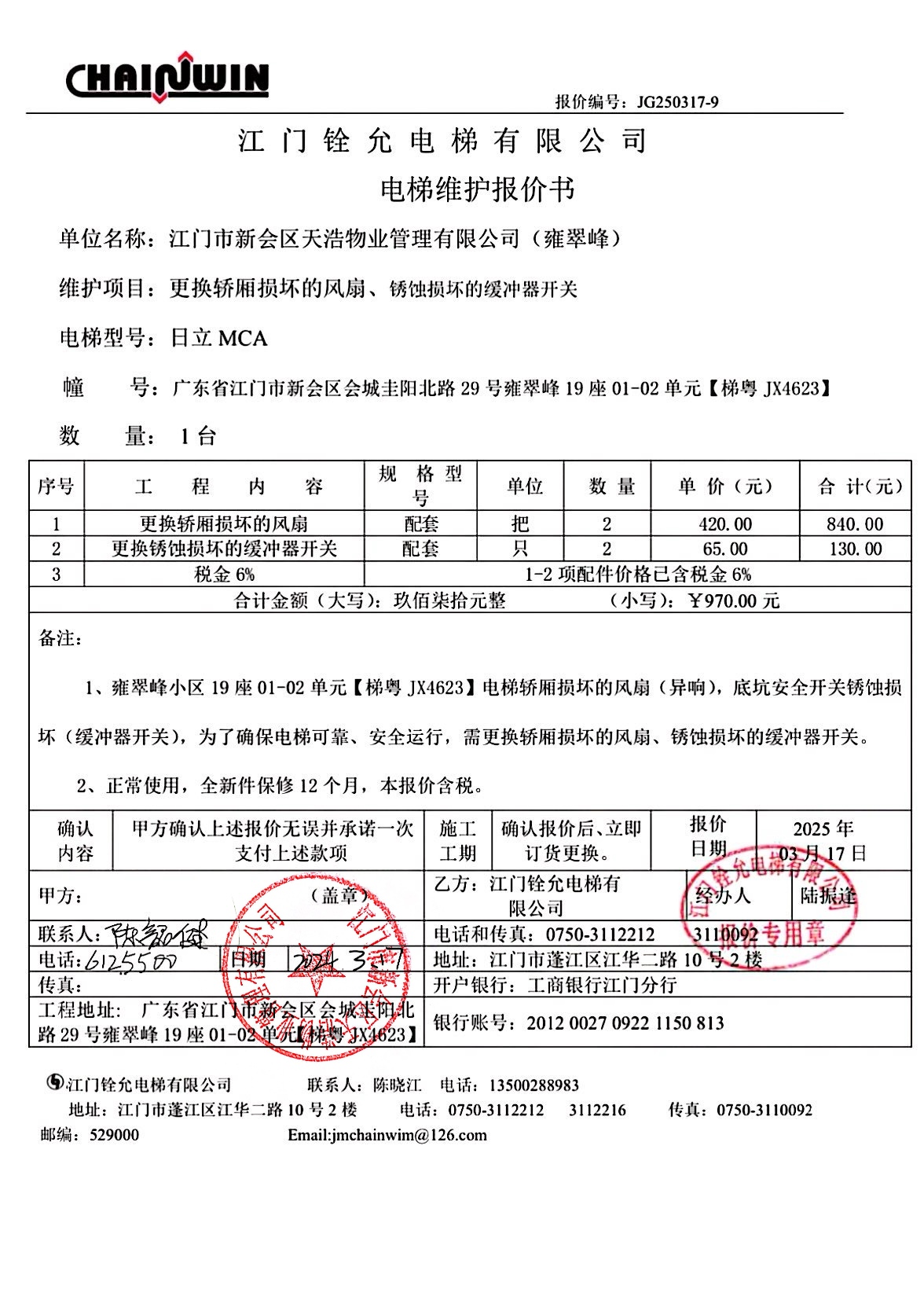 <td VALIGN="top" VALUES="" STYLE="border-width:0" BINDTYPE="0" ROWSPAN="19" COLSPAN="7" DATASOURCE="投票结果" ><font style="font-size:14pt;"><p style="white-space: normal; font-family: 宋体; line-height: 1.75em;">雍翠峰雍翠峰19座全体业主:</p><p style="white-space: normal; font-family: 宋体; line-height: 1.75em; text-indent: 2em;">本小区关于雍翠峰19座0102电梯【梯粤JX4623】更换风扇和开关使用维修资金的投票的投票已表决结束,询异时间从2025年04月09日开始,投票询异公示期间,业主可通过微信查询自己的表决情况或可凭身份证件申请查询自己的表决情况;如公示的业主表决情况与查询的本人表决意见不一致的,可以以书面形式向投票组织机构申诉,投票组织机构予以纠正并重新公示表决结果。异议提出人对投票组织机构的处理仍有异议的,可以向街道办事处(镇人民政府)反映处理,涉及住宅专项维修资金的,可向属地住宅专项维修资金管理中心反映处理。</p><p style="white-space: normal;"><br/></p><p style="white-space: normal; font-family: 宋体; line-height: 1.75em;"><strong>附件:</strong></p><p style="white-space: normal; font-family: 宋体; line-height: 1.75em;"><strong>一、投票范围</strong></p><p style="white-space: normal; font-family: 宋体; line-height: 1.75em; text-indent: 2em;">雍翠峰雍翠峰19座</p><p style="white-space: normal; font-family: 宋体; line-height: 1.75em; text-indent: 2em;">总人数(专有部分人数之和):20</p><p style="white-space: normal; font-family: 宋体; line-height: 1.75em; text-indent: 2em;"><span style="font-family: 宋体, SimSun;"><span style="font-family: 宋体; text-indent: 32px;"><span style="font-family: 宋体; text-indent: 32px;">总户数:20</span></span></span></p><p style="white-space: normal; font-family: 宋体; line-height: 1.75em; text-indent: 2em;">建筑物总面积(专有部分面积之和):2746.06㎡</p><p style="white-space: normal; font-family: 宋体; line-height: 1.75em;"><strong>二、询异公示起止时间</strong></p><p dir="ltr" style="white-space: normal; font-family: 宋体; line-height: 1.75em; text-indent: 2em;"><span style="text-indent: 36px;">2025年04月09日至2025年04月19日</span></p><p style="white-space: normal; font-family: 宋体; line-height: 1.75em;"><strong>三、投票详细描述</strong></p><p style="white-space: normal; font-family: 宋体; line-height: 1.75em; text-indent: 2em;"><p> 雍翠峰19座0102电梯【梯粤JX4623】上报运行时存在较大响声,经检查确认为电梯风扇损坏和底坑安全开关(缓冲器开关)氧化锈蚀产生异响,日常使用自然磨损损坏,已过保修期。现需申请使用维修资金对19座0102电梯【梯粤JX4623】进行维修,工程维修预算金额为970元,项目最终费用以施工合同签订金额为准。维修费用的分摊标准为按分户分摊,每户分摊48.5元,详见公示附件。如业主不能正常通过微信投票,请联系物业公司进行线下纸质投票,物业电话:0750-6125500</p></p><p style="white-space: normal; font-family: 宋体; line-height: 1.75em;"><strong>四、计票规则</strong></p><p style="white-space: normal; font-family: 宋体; line-height: 1.75em; text-indent: 2em;">表决事项:使用建筑物及其附属设施的维修资金<br /><p style='text-align: left; font-family: 宋体; font-size: 16px; line-height: 1.75em; text-indent: 2em;'>计票规则:弃权票不并入其它项 未表决票不并入其它项</p></p><p style="white-space: normal; font-family: 宋体; line-height: 1.75em;"><strong>五、通过规则</strong></p><p style="white-space: normal; font-family: 宋体; line-height: 1.75em;"><strong><strong style="white-space: normal;"><span style="font-family: 宋体, SimSun;"> 根据《中华人民共和国民法典》第二百七十八条规定:业主共同决定事项,应当由专有部分面积占比三分之二以上的业主且人数占比三分之二以上的业主参与表决。</span></strong></strong></p><p style="white-space: normal; font-family: 宋体; line-height: 1.75em; text-indent: 2em;">表决事项:使用建筑物及其附属设施的维修资金<br /><p style='text-align: left; font-family: 宋体; font-size: 16px; line-height: 1.75em; text-indent: 2em;'>通过规则:双2/3以上参与表决,参与表决双过半同意</p></p><p style="white-space: normal; font-family: 宋体; line-height: 1.75em;"><strong>六、投票结果</strong></p><p style="white-space: normal; font-family: 宋体; line-height: 1.75em; text-indent: 2em;"><div id='resultTable'><table style='table-layout: fixed; font-size:12px; margin-top:10px' width='100%' border='0' cellspacing='0' cellpadding='0'><tr><td height='28' colspan='10' align='center' style='border: 1px solid #666'><strong style='font-size: 14px;'> 使用建筑物及其附属设施的维修资金</strong></td> </tr><tr id='trfirst'><td height='28' colspan='4' style='border-left: 1px solid #666; border-bottom: 1px solid #666'><strong> 申报单位:</strong> 江门市新会区天浩物业管理有限公司</td><td colspan='3' style='border-left: 1px solid #666; border-bottom: 1px solid #666'><strong> 联系方式:</strong> </td><td colspan='3' style='border-left: 1px solid #666; border-bottom: 1px solid #666; border-right: 1px solid #666'><strong> 申报日期:</strong> 2025年3月18日 </td></tr><tr> <td height='28' colspan='5' style='border-left: 1px solid #666; border-bottom: 1px solid #666'><strong> 总人数(专有部分人数之和):</strong>20人 </td><td colspan='5' style='border-left: 1px solid #666; border-bottom: 1px solid #666; border-right: 1px solid #666'><strong> 建筑物总面积(专有部分面积之和):</strong>2746.06㎡ </td> </tr><tr><td height='28' colspan='10' bgcolor='#F3F3F3' style='border-left: 1px solid #666;border-bottom: 1px solid #666;border-right: 1px solid #666'><strong> 参与人数及面积统计</strong></td></