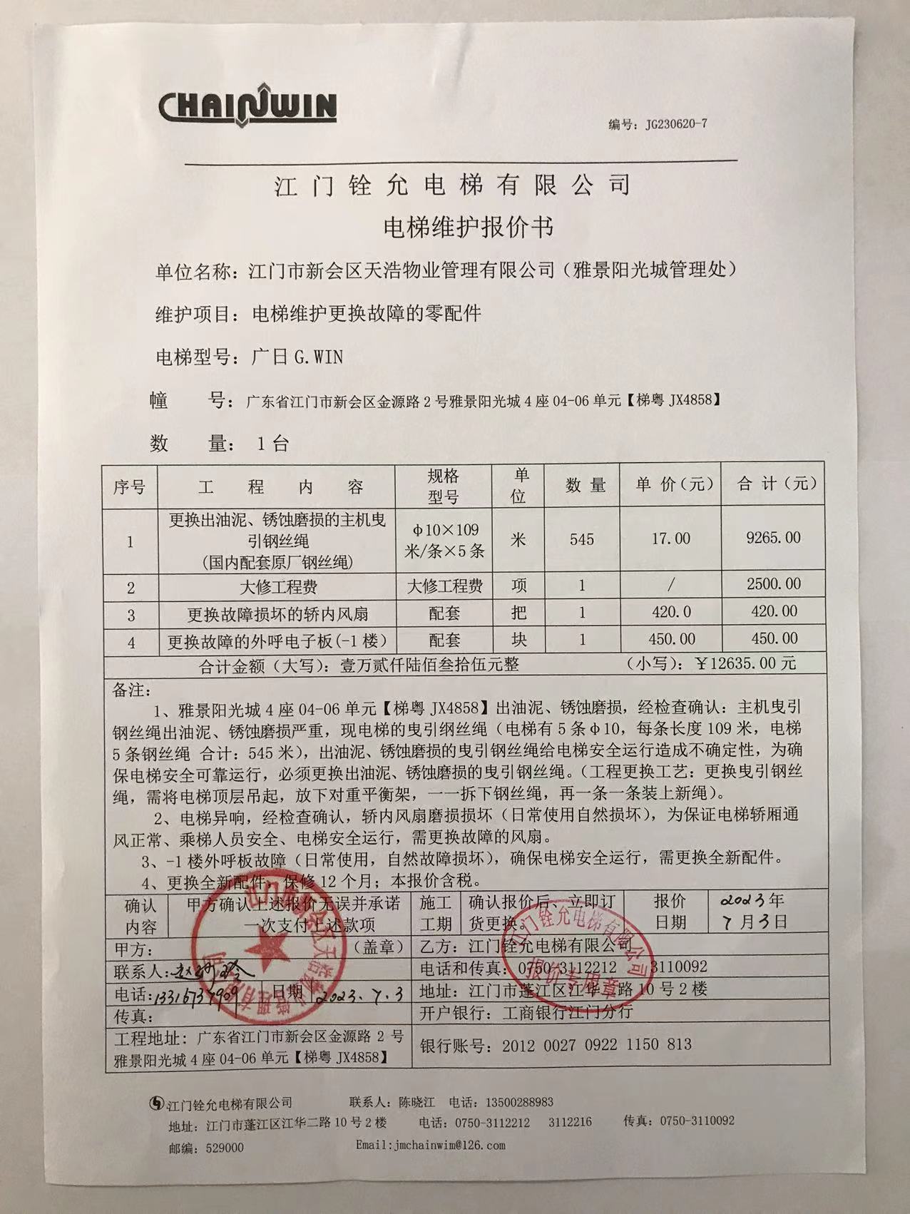 <td VALIGN="top" VALUES="" STYLE="border-width:0" BINDTYPE="0" ROWSPAN="19" COLSPAN="7" DATASOURCE="投票结果" ><font style="font-size:14pt;"><p style="white-space: normal; font-family: 宋体; line-height: 1.75em;">雅景阳光城4座全体业主:</p><p style="white-space: normal; font-family: 宋体; line-height: 1.75em; text-indent: 2em;">本小区关于雅景阳光城4座04-06电梯更换钢丝绳、轿内风扇、外呼板使用维修资金的投票的投票已表决结束,询异时间从2023年08月10日开始,投票询异公示期间,业主可通过微信查询自己的表决情况或可凭身份证件申请查询自己的表决情况;如公示的业主表决情况与查询的本人表决意见不一致的,可以以书面形式向投票组织机构申诉,投票组织机构予以纠正并重新公示表决结果。异议提出人对投票组织机构的处理仍有异议的,可以向街道办事处(镇人民政府)反映处理,涉及住宅专项维修资金的,可向属地住宅专项维修资金管理中心反映处理。</p><p style="white-space: normal;"><br/></p><p style="white-space: normal; font-family: 宋体; line-height: 1.75em;"><strong>附件:</strong></p><p style="white-space: normal; font-family: 宋体; line-height: 1.75em;"><strong>一、投票范围</strong></p><p style="white-space: normal; font-family: 宋体; line-height: 1.75em; text-indent: 2em;">雅景阳光城4座</p><p style="white-space: normal; font-family: 宋体; line-height: 1.75em; text-indent: 2em;">总人数(专有部分人数之和):45</p><p style="white-space: normal; font-family: 宋体; line-height: 1.75em; text-indent: 2em;"><span style="font-family: 宋体, SimSun;">总户数:45</span></p><p style="white-space: normal; font-family: 宋体; line-height: 1.75em; text-indent: 2em;">建筑物总面积(专有部分面积之和):4309.10㎡</p><p style="white-space: normal; font-family: 宋体; line-height: 1.75em;"><strong>二、询异公示起止时间</strong></p><p dir="ltr" style="white-space: normal; font-family: 宋体; line-height: 1.75em; text-indent: 2em;"><span style="text-indent: 36px;">2023年08月10日至2023年08月16日</span></p><p style="white-space: normal; font-family: 宋体; line-height: 1.75em;"><strong>三、投票详细描述</strong></p><p style="white-space: normal; font-family: 宋体; line-height: 1.75em; text-indent: 2em;"><p>雅景阳光城4座04-06电梯保养时发现钢丝绳出油泥,电梯主机曳引式钢丝绳锈蚀磨损严重、电梯异响,检查发现轿内风扇磨损严重、-1楼外呼板故障 (日常使用,自然磨损损坏)已过保修期。现需申请使用维修资金对4座04-06电梯进行维修,工程维修预算金额为12635元,项目最终费用以施工合同签订金额为准。维修费用的分摊标准为按分户分摊,每户分摊280.77元,详见公示附件。如业主手机不能正常通过维修投票,请联系物业公司进行线下纸质投票,物业电话:0750-6303009</p></p><p style="white-space: normal; font-family: 宋体; line-height: 1.75em;"><strong>四、计票规则</strong></p><p style="white-space: normal; font-family: 宋体; line-height: 1.75em; text-indent: 2em;">表决事项:使用建筑物及其附属设施的维修资金<br /><p style='text-align: left; font-family: 宋体; font-size: 16px; line-height: 1.75em; text-indent: 2em;'>计票规则:弃权票不并入其它项 未表决票不并入其它项</p></p><p style="white-space: normal; font-family: 宋体; line-height: 1.75em;"><strong>五、通过规则</strong></p><p style="white-space: normal; font-family: 宋体; line-height: 1.75em; text-indent: 2em;">表决事项:使用建筑物及其附属设施的维修资金<br /><p style='text-align: left; font-family: 宋体; font-size: 16px; line-height: 1.75em; text-indent: 2em;'>通过规则:参与表决专有部分面积过半数的业主且参与表决人数过半数的业主同意</p></p><p style="white-space: normal; font-family: 宋体; line-height: 1.75em;"><strong>六、投票结果</strong></p><p style="white-space: normal; font-family: 宋体; line-height: 1.75em; text-indent: 2em;"><div id='resultTable'><table style='table-layout: fixed; font-size:12px; margin-top:10px' width='100%' border='0' cellspacing='0' cellpadding='0'><tr><td height='28' colspan='10' align='center' style='border: 1px solid #666'><strong style='font-size: 14px;'> 使用建筑物及其附属设施的维修资金</strong></td> </tr><tr id='trfirst'><td height='28' colspan='4' style='border-left: 1px solid #666; border-bottom: 1px solid #666'><strong> 申报单位:</strong> 江门市新会区天浩物业管理有限公司</td><td colspan='3' style='border-left: 1px solid #666; border-bottom: 1px solid #666'><strong> 联系方式:</strong> </td><td colspan='3' style='border-left: 1px solid #666; border-bottom: 1px solid #666; border-right: 1px solid #666'><strong> 申报日期:</strong> 2023年7月19日 </td></tr><tr> <td height='28' colspan='5' style='border-left: 1px solid #666; border-bottom: 1px solid #666'><strong> 总人数(专有部分人数之和):</strong>45人 </td><td colspan='5' style='border-left: 1px solid #666; border-bottom: 1px solid #666; border-right: 1px solid #666'><strong> 建筑物总面积(专有部分面积之和):</strong>4309.10㎡ </td> </tr><tr><td height='28' colspan='10' bgcolor='#F3F3F3' style='border-left: 1px solid #666;border-bottom: 1px solid #666;border-right: 1px solid #666'><strong> 参与人数及面积统计</strong></td></tr><tr><td height='28' colspan='5' style='border-left: 1px solid #666; border-bottom: 1px solid #666'><strong> 参与表决专有部分人数之和:</strong>31人</td><td colspan='5' style='border-left: 1px solid #666; border-bottom: 1px solid #666; border-right: 1px solid #666'><strong> 参与表决占有表决权总人数比例:</strong>68.89%</td></tr><tr><td height='28' colspan='5' style='border-left: 1px solid #666; border-bottom: 1px solid #666'><strong> 参与表决