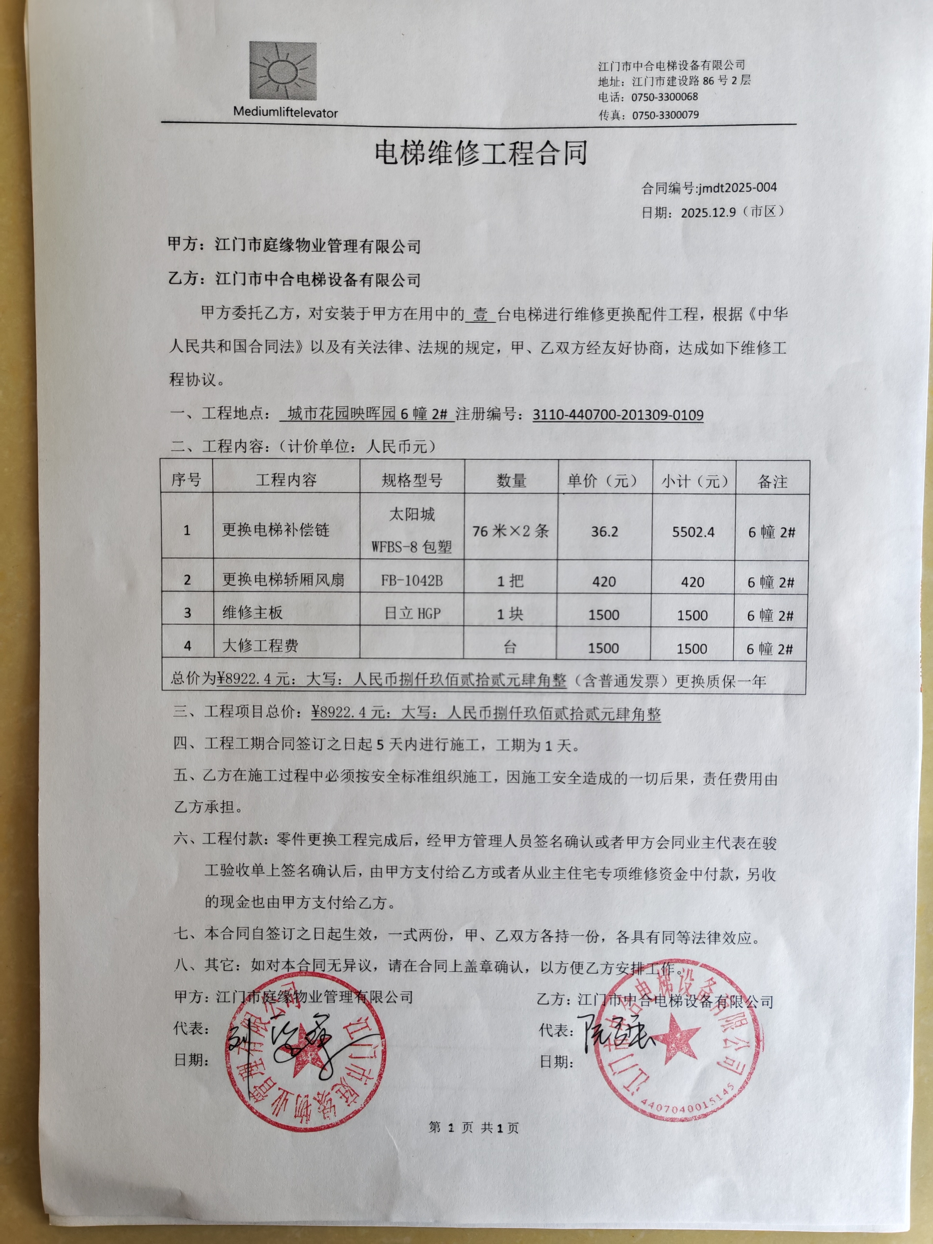 <td VALIGN="top" VALUES="" STYLE="border-width:0" BINDTYPE="0" ROWSPAN="19" COLSPAN="7" DATASOURCE="投票结果" ><font style="font-size:14pt;"><p style="white-space: normal; font-family: 宋体; line-height: 1.75em;">蓬江区城市花园映晖园江门市城市花园映晖园6幢全体业主:</p><p style="white-space: normal; font-family: 宋体; line-height: 1.75em; text-indent: 2em;">本小区关于蓬江区城市花园映晖园小区6幢2#电梯更换补偿链,更换轿厢风扇,维修主板使用维修资金的投票的投票已表决结束,询异时间从2026年01月06日开始,投票询异公示期间,业主可通过微信查询自己的表决情况或可凭身份证件申请查询自己的表决情况;如公示的业主表决情况与查询的本人表决意见不一致的,可以以书面形式向投票组织机构申诉,投票组织机构予以纠正并重新公示表决结果。异议提出人对投票组织机构的处理仍有异议的,可以向街道办事处(镇人民政府)反映处理,涉及住宅专项维修资金的,可向属地住宅专项维修资金管理中心反映处理。</p><p style="white-space: normal;"><br/></p><p style="white-space: normal; font-family: 宋体; line-height: 1.75em;"><strong>附件:</strong></p><p style="white-space: normal; font-family: 宋体; line-height: 1.75em;"><strong>一、投票范围</strong></p><p style="white-space: normal; font-family: 宋体; line-height: 1.75em; text-indent: 2em;">蓬江区城市花园映晖园江门市城市花园映晖园6幢</p><p style="white-space: normal; font-family: 宋体; line-height: 1.75em; text-indent: 2em;">总人数(专有部分人数之和):51</p><p style="white-space: normal; font-family: 宋体; line-height: 1.75em; text-indent: 2em;"><span style="font-family: 宋体, SimSun;"><span style="font-family: 宋体; text-indent: 32px;"><span style="font-family: 宋体; text-indent: 32px;">总户数:51</span></span></span></p><p style="white-space: normal; font-family: 宋体; line-height: 1.75em; text-indent: 2em;">建筑物总面积(专有部分面积之和):5122.27㎡</p><p style="white-space: normal; font-family: 宋体; line-height: 1.75em;"><strong>二、询异公示起止时间</strong></p><p dir="ltr" style="white-space: normal; font-family: 宋体; line-height: 1.75em; text-indent: 2em;"><span style="text-indent: 36px;">2026年01月06日至2026年01月13日</span></p><p style="white-space: normal; font-family: 宋体; line-height: 1.75em;"><strong>三、投票详细描述</strong></p><p style="white-space: normal; font-family: 宋体; line-height: 1.75em; text-indent: 2em;"><p>映晖园6幢2#电梯运行中发出异响,经检查,是电梯补偿链外面的胶套老化破裂损坏造成。电梯轿厢风扇有异响,经检查确认是风扇轴承损坏。1#2#电梯无法并联,<span style="text-wrap-mode: wrap;">经检查,是2#电梯主板并联部分故障导致,需要维修。</span></p><p><span style="text-wrap-mode: wrap;">现对2#电梯进行维修,工程维修预算金额为8922.40元,项目最终费用以施工合同金额为准。因已过保修期,维修费用由6幢全体业主按建筑面积分摊,每平方约1.75元。如业主手机不能通过微信投票,请联系映晖园物管处进行线下纸质投票,物管处电话:0750-3220098.</span></p></p><p style="white-space: normal; font-family: 宋体; line-height: 1.75em;"><strong>四、计票规则</strong></p><p style="white-space: normal; font-family: 宋体; line-height: 1.75em; text-indent: 2em;">表决事项:使用建筑物及其附属设施的维修资金<br /><p style='text-align: left; font-family: 宋体; font-size: 16px; line-height: 1.75em; text-indent: 2em;'>计票规则:弃权票不并入其它项 未表决票不并入其它项</p></p><p style="white-space: normal; font-family: 宋体; line-height: 1.75em;"><strong>五、通过规则</strong></p><p style="white-space: normal; font-family: 宋体; line-height: 1.75em;"><strong><strong style="white-space: normal;"><span style="font-family: 宋体, SimSun;"> 根据《中华人民共和国民法典》第二百七十八条规定:业主共同决定事项,应当由专有部分面积占比三分之二以上的业主且人数占比三分之二以上的业主参与表决。</span></strong></strong></p><p style="white-space: normal; font-family: 宋体; line-height: 1.75em; text-indent: 2em;">表决事项:使用建筑物及其附属设施的维修资金<br /><p style='text-align: left; font-family: 宋体; font-size: 16px; line-height: 1.75em; text-indent: 2em;'>通过规则:双2/3以上参与表决,参与表决双过半同意</p></p><p style="white-space: normal; font-family: 宋体; line-height: 1.75em;"><strong>六、投票结果</strong></p><p style="white-space: normal; font-family: 宋体; line-height: 1.75em; text-indent: 2em;"><div id='resultTable'><table style='table-layout: fixed; font-size:12px; margin-top:10px' width='100%' border='0' cellspacing='0' cellpadding='0'><tr><td height='28' colspan='10' align='center' style='border: 1px solid #666'><strong style='font-size: 14px;'> 使用建筑物及其附属设施的维修资金</strong></td> </tr><tr id='trfirst'><td height='28' colspan='4' style='border-left: 1px solid #666; border-bottom: 1px solid #666'><strong> 申报单位:</strong> 江门市庭缘物业管理有限公司</td><td colspan='3' style='border-left: 1px solid #666; border-bottom: 1px solid #666'><strong> 联系方式:</strong> 3220098 </td><td colspan='3' style='border-left: 1px solid #666; border-bottom: 1px solid #666; border-right: 1px solid #666'><strong> 申报日期:</strong> 2025年12月12日 </td></tr><tr> <td height='28' colspan='5' style='border-left: 1px solid #666; border-bottom: 1px solid #666'><strong> 总人数(专有部分人数之和):</strong>51人 </td><td colspan='5' style='border-left: 1px solid #666; border-bottom: 1px solid #666; border-right: 1px solid #666'><strong> 建筑物总面积(专有部分面积之和):</strong>5122.