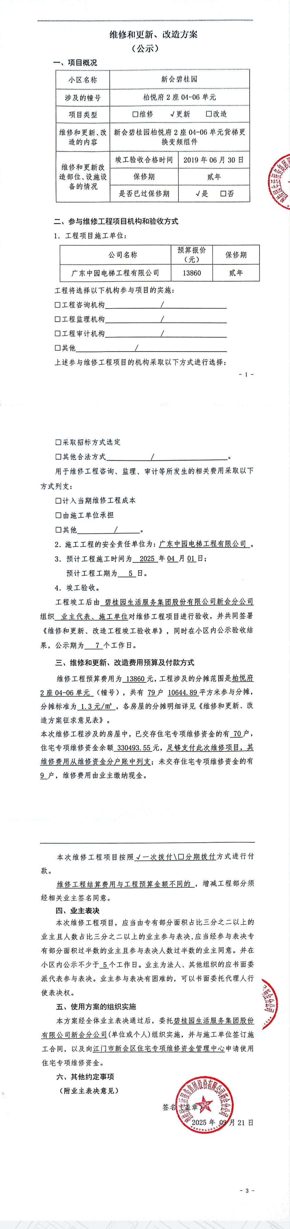 <br/>决定“(一)制定和修改业主大会议事规则”、“(二)制定和修改管理规约”、“(三)选举业主委员会或者更换业主委员会成员”、“(四)选聘和解聘物业服务企业或者其他管理人”、“(五)使用建筑物及其附属设施的维修资金”、“(九)有关共有和共同管理权利的其他重大事项”事项,应当经参与表决专有部分面积过半数的业主且参与表决人数过半数的业主同意。<span style="font-family: 宋体, SimSun; text-indent: 32px;"></span></span></p><p style="text-indent: 2em; line-height: 1.75em;"><span style="font-family: 宋体, SimSun;"></span></p><p style="text-indent: 2em; line-height: 1.75em;"><span style="font-family: 宋体, SimSun;">特此公告。</span></p><p><br/></p><p style="text-align: right; font-family: 宋体; font-size: 16px; line-height: 1.75em;"><span style="font-family: 宋体, SimSun;">碧桂园生活服务集团股份有限公司新会分公司</span></p><p style="text-align: right; font-family: 宋体; font-size: 16px; line-height: 1.75em;"><span style="font-family: 宋体, SimSun;">2025年04月01日</span></p></font></td>