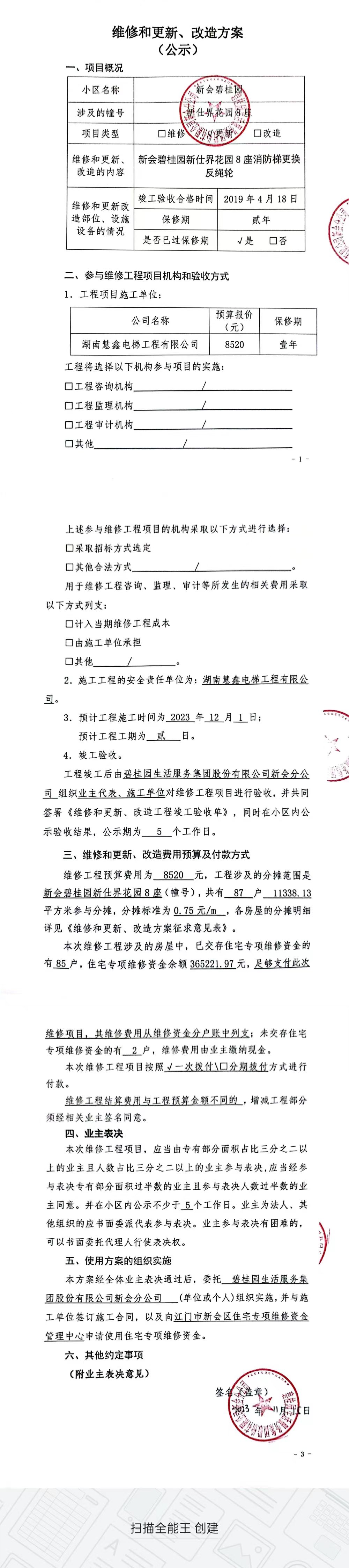 <td valign="top" values="" style="border-width:0" bindtype="0" rowspan="17" colspan="7" datasource="投票结果"><font style=" font-family:方正小标宋简体;font-size:14pt;"><p style="line-height: 1.75em;"><span style="font-family: 宋体, SimSun;">各位尊敬的业主:</span><br></p><p style="text-indent: 2em; line-height: 1.75em;"><span style="font-family: 宋体, SimSun;">根据法律法规的规定,本小区业主利用“江门市物业事项表决管理系统”已对本小区公共事务决策事项进行了表决,在经过7日的询异公示期后,未收到业主有效的异议。现将投票结果公告,并就产生的法律效力说明如下:</span></p><p style="line-height: 1.75em; text-indent: 0em;"><strong style="text-indent: 2em;"><span style="font-family: 宋体, SimSun;">一、投票范围</span></strong></p><p style="text-indent: 2em; line-height: 1.75em;"><span style="font-family: 宋体, SimSun;">新仕界花园新仕界花园8座</span></p><p style="text-indent: 2em; line-height: 1.75em;"><span style="font-family: 宋体, SimSun;">总人数(专有部分人数之和):87</span></p><p style="text-indent: 2em; line-height: 1.75em;"><span style="font-family: 宋体, SimSun;"><span style="font-family: 宋体, SimSun; text-indent: 32px;"><span style="font-family: 宋体; text-indent: 32px;">总户数:87</span></span></span></p><p style="text-indent: 2em; line-height: 1.75em;"><span style="font-family: 宋体, SimSun;">建筑物总面积(专有部分面积之和):11338.13㎡</span></p><p style="line-height: 1.75em;"><strong><span style="font-family: 宋体, SimSun;">二、投票结果公告时间</span></strong></p><p style="text-indent: 2em; line-height: 1.75em;"><span style="font-family: 宋体, SimSun;">从2023年12月01日开始</span></p><p style="line-height: 1.75em;"><strong><span style="font-family: 宋体, SimSun;">三、计票规则</span></strong></p><p style="text-indent: 2em; line-height: 1.75em;"><span style="font-family: 宋体, SimSun;">表决事项:使用建筑物及其附属设施的维修资金<br></span></p><p style="font-family: 宋体, SimSun;line-height: 1.75em; text-indent: 2em;">计票规则:弃权票不并入其它项 未表决票不并入其它项</p><p></p><p style="line-height: 1.75em;"><strong><span style="font-family: 宋体, SimSun;">四、通过规则</span></strong></p><p style="line-height: 1.75em;"><strong><span style="font-family: 宋体, SimSun;"> 根据《中华人民共和国民法典》第二百七十八条规定:业主共同决定事项,应当由专有部分面积占比三分之二以上的业主且人数占比三分之二以上的业主参与表决。</span></strong></p><p style="text-indent: 2em; line-height: 1.75em;"><span style="font-family: 宋体, SimSun;"><span style="font-family: 宋体, SimSun; text-indent: 32px;">表决事项:使用建筑物及其附属设施的维修资金<br></span></span></p><p style="font-family: 宋体, SimSun;line-height: 1.75em; text-indent: 2em;">通过规则:参与表决专有部分面积过半数的业主且参与表决人数过半数的业主同意</p><p></p><p style="line-height: 1.75em;"><strong><span style="font-family: 宋体, SimSun;">五、投票结果</span></strong></p><p style="line-height: 1.75em; text-indent: 2em;"><span style="font-family: 宋体, SimSun; text-indent: 2em;"></span></p><div id="resultTable"><table style="table-layout: fixed; font-size:12px; margin-top:10px" width="100%" border="0" cellspacing="0" cellpadding="0"><tbody><tr><td height="28" colspan="10" align="center" style="border: 1px solid #666"><strong style="font-size: 14px;"> 使用建筑物及其附属设施的维修资金</strong></td> </tr><tr id="trfirst"><td height="28" colspan="4" style="border-left: 1px solid #666; border-bottom: 1px solid #666"><strong> 申报单位:</strong> 碧桂园生活服务集团股份有限公司新会分公司</td><td colspan="3" style="border-left: 1px solid #666; border-bottom: 1px solid #666"><strong> 联系方式:</strong> </td><td colspan="3" style="border-left: 1px solid #666; border-bottom: 1px solid #666; border-right: 1px solid #666"><strong> 申报日期:</strong> 2023年11月15日 </td></tr><tr> <td height="28" colspan="5" style="border-left: 1px solid #666; border-bottom: 1px solid #666"><strong> 总人数(专有部分人数之和):</strong>87人 </td><td colspan="5" style="border-left: 1px solid #666; border-bottom: 1px solid #666; border-right: 1px solid #666"><strong> 建筑物总面积(专有部分面积之和):</strong>11338.13㎡ </td> </tr><tr><td height="28" colspan="10" bgcolor="#F3F3F3" style="border-left: 1px solid #666;border-bottom: 1px solid #666;border-right: 1px solid #666"><strong> 参与人数及面积统计</strong></td></tr><tr><td height="28" colspan="5" style="border-left: 1px solid #666; border-bottom: 1px solid #666"><strong> 参与表决专有部分人数之和:</strong>65人</td><td colspan="5" style="border-left: 1px solid #666; border-bottom: 1px solid #666; border-right: 1px solid #666"><strong> 参与表决占有表决权总人数比例:</strong>74.71%</td></tr><tr><td height="28" colspan="5" style="border-left: 1px solid #666; border-bottom: 1px solid #666"><strong> 参与表决专有部分面积之和:</strong>8457.93㎡</td><td colspan="5" style="border-left: 1px solid #666; border-bottom: 1px solid #666; border-right: 1px solid #666"><strong> 参与表决占有表决权总面积比例:</strong>74.60%</td></tr><tr><td height="28" colspan="10" bgcolor="#F3F3F3" style="border-left: 1px solid #666; border-bottom: 1px solid #666;border-right: 1px solid #666"> <strong> 未参与人数及面积统计</strong></td> </tr><tr><td height="28" colspan="5" style="border-left: 1px solid #666; border-bottom: 1px solid #666"><strong> 未参与表决专有部分人数之和:</strong>22人 </td><td colspan="5" style="border-left: 1px solid #666; border-bottom: 1px solid #666; border-right: 1px solid #666"><strong> 未参与表决占有表决权总