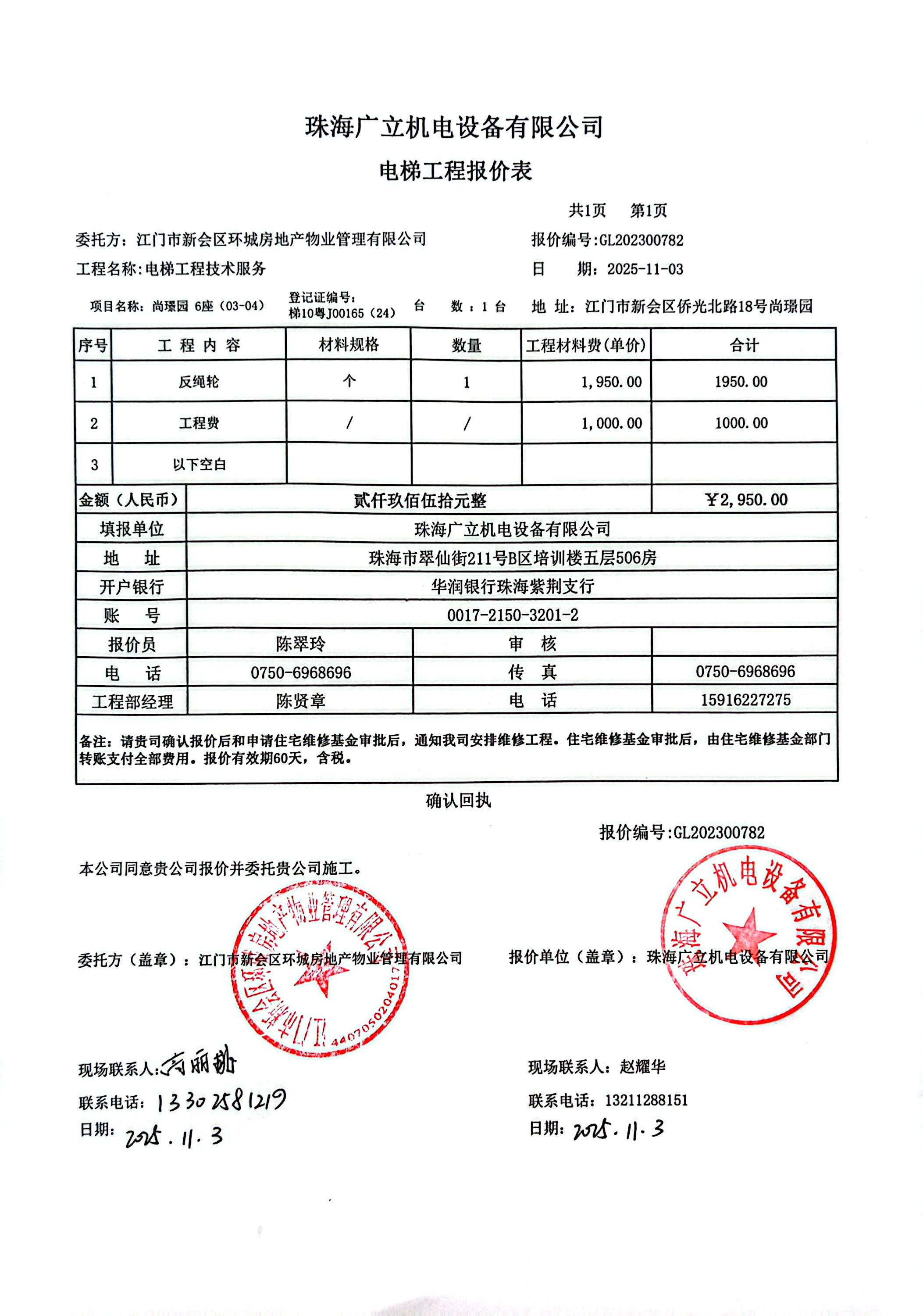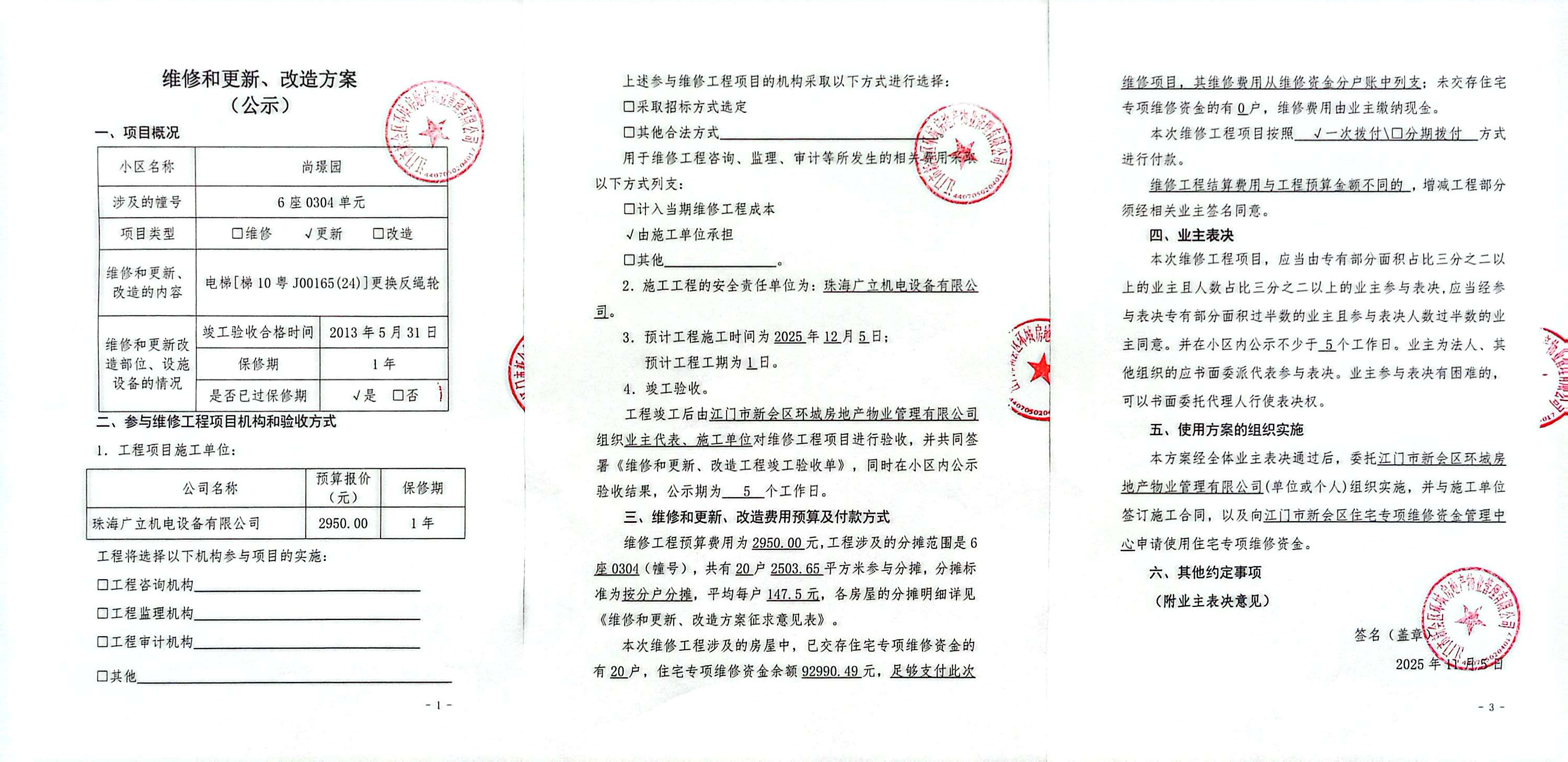 <td VALIGN="top" VALUES="" STYLE="border-width:0" BINDTYPE="0" ROWSPAN="19" COLSPAN="7" DATASOURCE="投票结果" ><font style="font-size:14pt;"><p style="white-space: normal; font-family: 宋体; line-height: 1.75em;">尚璟园尚璟园6座全体业主:</p><p style="white-space: normal; font-family: 宋体; line-height: 1.75em; text-indent: 2em;">本小区关于尚璟园6座0304单元电梯[梯10粤J00165(24)]更换反绳轮使用维修资金的投票的投票已表决结束,询异时间从2026年01月12日开始,投票询异公示期间,业主可通过微信查询自己的表决情况或可凭身份证件申请查询自己的表决情况;如公示的业主表决情况与查询的本人表决意见不一致的,可以以书面形式向投票组织机构申诉,投票组织机构予以纠正并重新公示表决结果。异议提出人对投票组织机构的处理仍有异议的,可以向街道办事处(镇人民政府)反映处理,涉及住宅专项维修资金的,可向属地住宅专项维修资金管理中心反映处理。</p><p style="white-space: normal;"><br/></p><p style="white-space: normal; font-family: 宋体; line-height: 1.75em;"><strong>附件:</strong></p><p style="white-space: normal; font-family: 宋体; line-height: 1.75em;"><strong>一、投票范围</strong></p><p style="white-space: normal; font-family: 宋体; line-height: 1.75em; text-indent: 2em;">尚璟园尚璟园6座</p><p style="white-space: normal; font-family: 宋体; line-height: 1.75em; text-indent: 2em;">总人数(专有部分人数之和):20</p><p style="white-space: normal; font-family: 宋体; line-height: 1.75em; text-indent: 2em;"><span style="font-family: 宋体, SimSun;"><span style="font-family: 宋体; text-indent: 32px;"><span style="font-family: 宋体; text-indent: 32px;">总户数:20</span></span></span></p><p style="white-space: normal; font-family: 宋体; line-height: 1.75em; text-indent: 2em;">建筑物总面积(专有部分面积之和):2503.65㎡</p><p style="white-space: normal; font-family: 宋体; line-height: 1.75em;"><strong>二、询异公示起止时间</strong></p><p dir="ltr" style="white-space: normal; font-family: 宋体; line-height: 1.75em; text-indent: 2em;"><span style="text-indent: 36px;">2026年01月12日至2026年01月22日</span></p><p style="white-space: normal; font-family: 宋体; line-height: 1.75em;"><strong>三、投票详细描述</strong></p><p style="white-space: normal; font-family: 宋体; line-height: 1.75em; text-indent: 2em;"><p><span style="font-size: 15px; background: rgb(255, 255, 255); font-family: arial, helvetica, sans-serif;">本小区</span><span style="font-family: arial, helvetica, sans-serif;"><span style="font-size: 15px; background: rgb(255, 255, 255); font-family: arial, helvetica, sans-serif;"><span style="font-family:Arial">6</span><span style="font-family: arial, helvetica, sans-serif; font-size: 15px; background: rgb(255, 255, 255);">座0304</span></span><span style="font-size: 15px; background: rgb(255, 255, 255); font-family: 宋体;">单元</span>电梯[梯10粤J00165(24)]<span style="font-family: arial, helvetica, sans-serif; font-size: 15px; background: rgb(255, 255, 255);"><span style="font-family: Arial;"></span><span style="font-family: 宋体;">出现故障,经检查,是由于电梯反绳轮损坏造成。现需申请使用维修资金对</span><span style="font-family:Arial">6</span><span style="font-family: 宋体;">座</span><span style="font-family: Arial;">0304</span></span><span style="font-size: 15px; background: rgb(255, 255, 255); font-family: 宋体;">单元</span><span style="font-family: arial, helvetica, sans-serif; text-wrap-mode: wrap;">电梯[梯10粤J00165(24)]</span><span style="font-family: Arial; font-size: 15px; background: rgb(255, 255, 255);"><span style="font-family: Arial;"></span><span style="font-family: 宋体;">的<span style="font-family: 宋体; font-size: 15px; text-wrap-mode: wrap; background-color: rgb(255, 255, 255);">反绳轮</span>进行更换,工程维修预算金额为</span><span style="font-family: Arial;">2950.00</span><span style="font-family: 宋体;">元,项目最终费用以施工合同签订金额为准。因已过保修期,维修费用由相关业主按分户分摊,共涉及</span><span style="font-family: Arial;">20</span><span style="font-family: 宋体;">户,每户</span><span style="font-family: Arial;">147.5</span><span style="font-family: 宋体;">元,详见公示附件。如业主手机不能正常通过微信投票,请联系物业公司进行线下纸质投票,物业公司联系电话:</span><span style="font-family: Arial;">0750-6198383</span><span style="font-family: 宋体;">。</span></span></span></p><p><br/></p></p><p style="white-space: normal; font-family: 宋体; line-height: 1.75em;"><strong>四、计票规则</strong></p><p style="white-space: normal; font-family: 宋体; line-height: 1.75em; text-indent: 2em;">表决事项:使用建筑物及其附属设施的维修资金<br /><p style='text-align: left; font-family: 宋体; font-size: 16px; line-height: 1.75em; text-indent: 2em;'>计票规则:弃权票不并入其它项 未表决票不并入其它项</p></p><p style="white-space: normal; font-family: 宋体; line-height: 1.75em;"><strong>五、通过规则</strong></p><p style="white-space: normal; font-family: 宋体; line-height: 1.75em;"><strong><strong style="white-space: normal;"><span style="font-family: 宋体, SimSun;"> 根据《中华人民共和国民法典》第二百七十八条规定:业主共同决定事项,应当由专有部分面积占比三分之二以上的业主且人数占比三分之二以上的业主参与表决。</span></strong></strong></p><p style="white-space: normal; font-family: 宋体; line-height: 1.75em; text-indent: 2em;">表决事项:使用建筑物及其附属设施的维修资金<br /><p style='text-align: left; font-family: 宋体; font-size: 16px; line-height: 1.75em; text-indent: 2em;'>通过规则:双2/3以上参与表