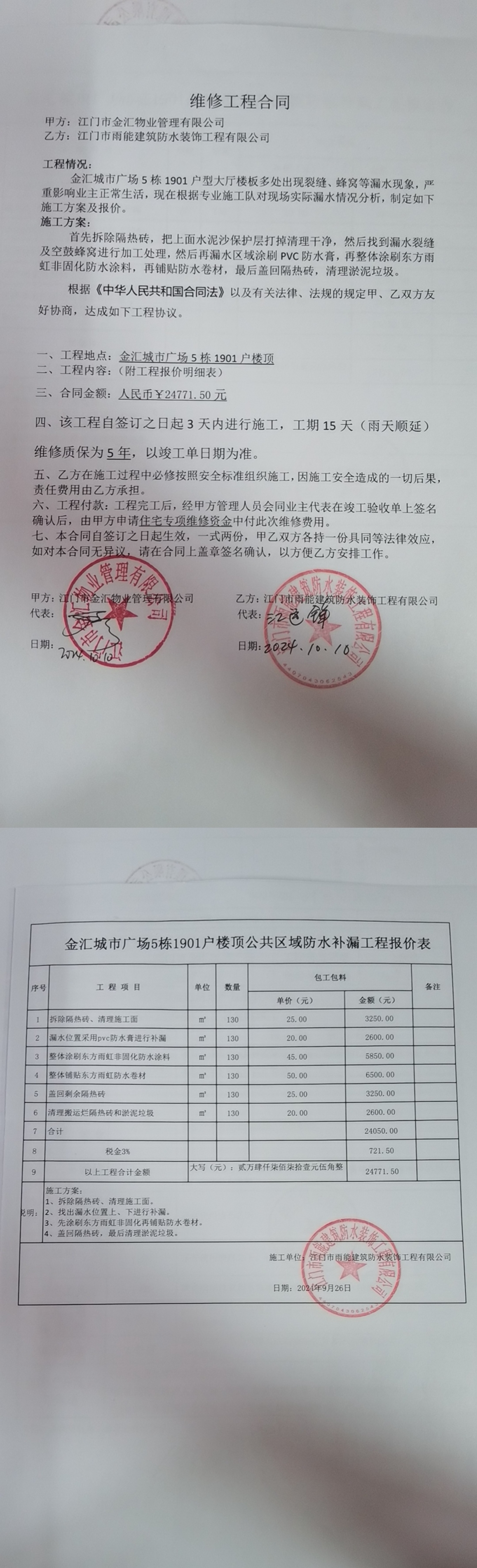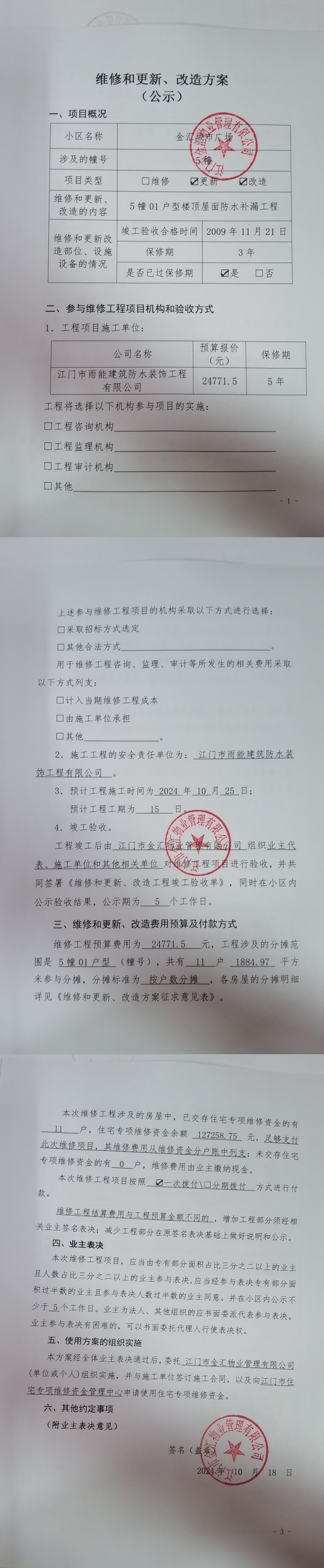 <td VALIGN="top" VALUES="" STYLE="border-width:0" BINDTYPE="0" ROWSPAN="17" COLSPAN="7" DATASOURCE="投票结果" ><font style=" font-family:方正小标宋简体;font-size:14pt;"><p style="line-height: 1.75em;"><span style="font-family: 宋体, SimSun;">各位尊敬的业主:</span><br/></p><p style="text-indent: 2em; line-height: 1.75em;"><span style="font-family: 宋体, SimSun;">根据法律法规的规定,本小区业主利用“江门市物业事项表决管理系统”已对本小区公共事务决策事项进行了表决,在经过7日的询异公示期后,未收到业主有效的异议。现将投票结果公告,并就产生的法律效力说明如下:</span></p><p style="line-height: 1.75em; text-indent: 0em;"><strong style="text-indent: 2em;"><span style="font-family: 宋体, SimSun;">一、投票范围</span></strong></p><p style="text-indent: 2em; line-height: 1.75em;"><span style="font-family: 宋体, SimSun;">金汇城市广场金汇城市广场5栋</span></p><p style="text-indent: 2em; line-height: 1.75em;"><span style="font-family: 宋体, SimSun;">总人数(专有部分人数之和):11</span></p><p style="text-indent: 2em; line-height: 1.75em;"><span style="font-family: 宋体, SimSun;"><span style="font-family: 宋体, SimSun; text-indent: 32px;"><span style="font-family: 宋体; text-indent: 32px;"><span style="font-family: 宋体; text-indent: 32px;">总户数:11</span></span></span></span></p><p style="text-indent: 2em; line-height: 1.75em;"><span style="font-family: 宋体, SimSun;">建筑物总面积(专有部分面积之和):1884.97㎡</span></p><p style="line-height: 1.75em;"><strong><span style="font-family: 宋体, SimSun;">二、投票结果公告时间</span></strong></p><p style="text-indent: 2em; line-height: 1.75em;"><span style="font-family: 宋体, SimSun;"><span style="font-family: 宋体, SimSun; text-indent: 32px;">从2025年04月08日开始</span></span></p><p style="line-height: 1.75em;"><strong><span style="font-family: 宋体, SimSun;">三、计票规则</span></strong></p><p style="text-indent: 2em; line-height: 1.75em;"><span style="font-family: 宋体, SimSun;">表决事项:使用建筑物及其附属设施的维修资金<br /><p style='font-family: 宋体, SimSun;line-height: 1.75em; text-indent: 2em;'>计票规则:弃权票不并入其它项&nbsp;&nbsp;&nbsp;&nbsp;未表决票不并入其它项</p></span></p><p style="line-height: 1.75em;"><strong><span style="font-family: 宋体, SimSun;">四、通过规则</span></strong></p><p style="line-height: 1.75em;"><strong><span style="font-family: 宋体, SimSun;">&nbsp; 根据《中华人民共和国民法典》第二百七十八条规定:业主共同决定事项,应当由专有部分面积占比三分之二以上的业主且人数占比三分之二以上的业主参与表决。</span></strong></p><p style="text-indent: 2em; line-height: 1.75em;"><span style="font-family: 宋体, SimSun;"><span style="font-family: 宋体, SimSun; text-indent: 32px;">表决事项:使用建筑物及其附属设施的维修资金<br /><p style='font-family: 宋体, SimSun;line-height: 1.75em; text-indent: 2em;'>通过规则:双2/3以上参与表决,参与表决双过半同意</p></span></span></p><p style="line-height: 1.75em;"><strong><span style="font-family: 宋体, SimSun;">五、投票结果</span></strong></p><p style="line-height: 1.75em; text-indent: 2em;"><span style="font-family: 宋体, SimSun; text-indent: 2em;"><div id='resultTable'><table style='table-layout: fixed; font-size:12px; margin-top:10px' width='100%' border='0' cellspacing='0' cellpadding='0'><tr><td height='28' colspan='10' align='center' style='border: 1px solid #666'><strong style='font-size: 14px;'> 使用建筑物及其附属设施的维修资金</strong></td> </tr><tr id='trfirst'><td height='28' colspan='4' style='border-left: 1px solid #666; border-bottom: 1px solid #666'><strong>&nbsp;申报单位:</strong> 江门市金汇物业管理有限公司</td><td colspan='3' style='border-left: 1px solid #666; border-bottom: 1px solid #666'><strong>&nbsp;联系方式:</strong> 3929003 </td><td colspan='3' style='border-left: 1px solid #666; border-bottom: 1px solid #666; border-right: 1px solid #666'><strong>&nbsp;申报日期:</strong> 2024年10月12日 </td></tr><tr> <td height='28' colspan='5' style='border-left: 1px solid #666; border-bottom: 1px solid #666'><strong>&nbsp;列支总人数(专有部分人数之和):</strong>11人 </td><td colspan='5' style='border-left: 1px solid #666; border-bottom: 1px solid #666; border-right: 1px solid #666'><strong>&nbsp;列支建筑物总面积(专有部分面积之和):</strong>1884.97㎡ </td> </tr><tr><td height='28' colspan='10' bgcolor='#F3F3F3' style='border-left: 1px solid #666;border-bottom: 1px solid #666;border-right: 1px solid #666'><strong>&nbsp;参与表决人数及面积统计</strong></td></tr><tr><td height='28' colspan='5' style='border-left: 1px solid #666; border-bottom: 1px solid #666'><strong>&nbsp;参与表决人数:</strong>4人</td><td colspan='5' style='border-left: 1px solid #666; border-bottom: 1px solid #666; border-right: 1px solid #666'><strong>&nbsp;参与表决人数占总人数比例:</strong>36.36%</td></tr><tr><td height='28' colspan='5' style='border-left: 1px solid #666; border-bottom: 1px solid #666'><strong>&nbsp;参与表决面积:</strong>750.41㎡</td><td colspan='5' style='border-left: 1px solid #666; border-bottom: 1px solid #666; border-right: 1px solid #666'><strong>&nbsp;参与表决面积占总面积比例:</strong>39.81%</td></tr><tr><td height='28' colspan='10' bgcolor='#F3F3F3' style='border-left: 1px solid #666; border-bottom: 1px solid #666;border-right: 1px solid #666'> <strong>&nbsp;参与表决同意人数及面积统计</strong></td> </tr><tr><td height='28' colspan='5' style='border-left: 1px solid #666; border-bottom: 1px solid #666'><strong>&nbsp;参与表决同意人数:</strong>4人 </td><td colspan='5' style='border-left: 1px solid #666; b