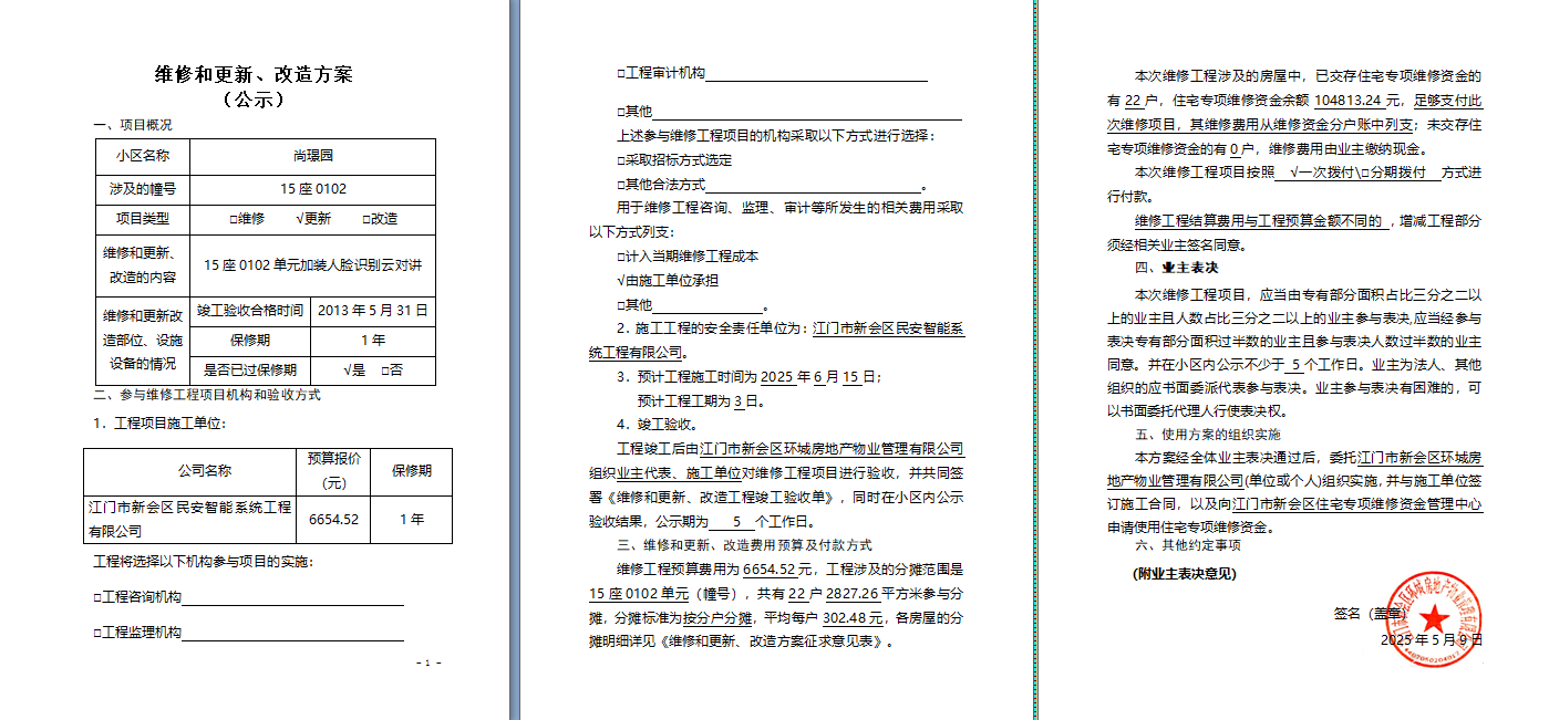 <td VALIGN="top" VALUES="" STYLE="border-width:0" BINDTYPE="0" ROWSPAN="17" COLSPAN="7" DATASOURCE="投票结果" ><font style=" font-family:方正小标宋简体;font-size:14pt;"><p style="line-height: 1.75em;"><span style="font-family: 宋体, SimSun;">各位尊敬的业主:</span><br/></p><p style="text-indent: 2em; line-height: 1.75em;"><span style="font-family: 宋体, SimSun;">根据法律法规的规定,本小区业主利用“江门市物业事项表决管理系统”已对本小区公共事务决策事项(<span style="font-family: 宋体; text-indent: 32px;">尚璟园15座0102单元加装人脸识别云对讲使用维修资金的投票</span>)进行了表决,在经过7日的询异公示期后,未收到业主有效的异议。现将投票结果公告,并就产生的法律效力说明如下:</span></p><p style="line-height: 1.75em; text-indent: 0em;"><strong style="text-indent: 2em;"><span style="font-family: 宋体, SimSun;">一、投票范围</span></strong></p><p style="text-indent: 2em; line-height: 1.75em;"><span style="font-family: 宋体, SimSun;">尚璟园尚璟园15座</span></p><p style="text-indent: 2em; line-height: 1.75em;"><span style="font-family: 宋体, SimSun;">总人数(专有部分人数之和):22</span></p><p style="text-indent: 2em; line-height: 1.75em;"><span style="font-family: 宋体, SimSun;"><span style="font-family: 宋体, SimSun; text-indent: 32px;"><span style="font-family: 宋体; text-indent: 32px;"><span style="font-family: 宋体; text-indent: 32px;">总户数:22</span></span></span></span></p><p style="text-indent: 2em; line-height: 1.75em;"><span style="font-family: 宋体, SimSun;">建筑物总面积(专有部分面积之和):2827.26㎡</span></p><p style="line-height: 1.75em;"><strong><span style="font-family: 宋体, SimSun;">二、投票结果公告时间</span></strong></p><p style="text-indent: 2em; line-height: 1.75em;"><span style="font-family: 宋体, SimSun;"><span style="font-family: 宋体, SimSun; text-indent: 32px;">从2025年06月04日开始</span></span></p><p style="line-height: 1.75em;"><strong><span style="font-family: 宋体, SimSun;">三、计票规则</span></strong></p><p style="text-indent: 2em; line-height: 1.75em;"><span style="font-family: 宋体, SimSun;">表决事项:使用建筑物及其附属设施的维修资金<br /><p style='font-family: 宋体, SimSun;line-height: 1.75em; text-indent: 2em;'>计票规则:弃权票不并入其它项&nbsp;&nbsp;&nbsp;&nbsp;未表决票不并入其它项</p></span></p><p style="line-height: 1.75em;"><strong><span style="font-family: 宋体, SimSun;">四、通过规则</span></strong></p><p style="line-height: 1.75em;"><strong><span style="font-family: 宋体, SimSun;">&nbsp; 根据《中华人民共和国民法典》第二百七十八条规定:业主共同决定事项,应当由专有部分面积占比三分之二以上的业主且人数占比三分之二以上的业主参与表决。</span></strong></p><p style="text-indent: 2em; line-height: 1.75em;"><span style="font-family: 宋体, SimSun;"><span style="font-family: 宋体, SimSun; text-indent: 32px;">表决事项:使用建筑物及其附属设施的维修资金<br /><p style='font-family: 宋体, SimSun;line-height: 1.75em; text-indent: 2em;'>通过规则:双2/3以上参与表决,参与表决双过半同意</p></span></span></p><p style="line-height: 1.75em;"><strong><span style="font-family: 宋体, SimSun;">五、投票结果</span></strong></p><p style="line-height: 1.75em; text-indent: 2em;"><span style="font-family: 宋体, SimSun; text-indent: 2em;"><div id='resultTable'><table style='table-layout: fixed; font-size:12px; margin-top:10px' width='100%' border='0' cellspacing='0' cellpadding='0'><tr><td height='28' colspan='10' align='center' style='border: 1px solid #666'><strong style='font-size: 14px;'> 使用建筑物及其附属设施的维修资金</strong></td> </tr><tr id='trfirst'><td height='28' colspan='4' style='border-left: 1px solid #666; border-bottom: 1px solid #666'><strong>&nbsp;申报单位:</strong> 新会区环城房地产物业管理有限公司</td><td colspan='3' style='border-left: 1px solid #666; border-bottom: 1px solid #666'><strong>&nbsp;联系方式:</strong> </td><td colspan='3' style='border-left: 1px solid #666; border-bottom: 1px solid #666; border-right: 1px solid #666'><strong>&nbsp;申报日期:</strong> 2025年5月19日 </td></tr><tr> <td height='28' colspan='5' style='border-left: 1px solid #666; border-bottom: 1px solid #666'><strong>&nbsp;列支总人数(专有部分人数之和):</strong>22人 </td><td colspan='5' style='border-left: 1px solid #666; border-bottom: 1px solid #666; border-right: 1px solid #666'><strong>&nbsp;列支建筑物总面积(专有部分面积之和):</strong>2827.26㎡ </td> </tr><tr><td height='28' colspan='10' bgcolor='#F3F3F3' style='border-left: 1px solid #666;border-bottom: 1px solid #666;border-right: 1px solid #666'><strong>&nbsp;参与表决人数及面积统计</strong></td></tr><tr><td height='28' colspan='5' style='border-left: 1px solid #666; border-bottom: 1px solid #666'><strong>&nbsp;参与表决人数:</strong>17人</td><td colspan='5' style='border-left: 1px solid #666; border-bottom: 1px solid #666; border-right: 1px solid #666'><strong>&nbsp;参与表决人数占总人数比例:</strong>77.27%</td></tr><tr><td height='28' colspan='5' style='border-left: 1px solid #666; border-bottom: 1px solid #666'><strong>&nbsp;参与表决面积:</strong>2245.34㎡</td><td colspan='5' style='border-left: 1px solid #666; border-bottom: 1px solid #666; border-right: 1px solid #666'><strong>&nbsp;参与表决面积占总面积比例:</strong>79.42%</td></tr><tr><td height='28' colspan='10' bgcolor='#F3F3F3' style='border-left: 1px solid #666; border-bottom: 1px solid #666;border-right: 1px solid #666'> <strong>&nbsp;参与表决同意人数及面积统计</strong></td> </tr><tr><td height='28' colspan='5' style='border-left: 1px solid #666; border-bottom: 1