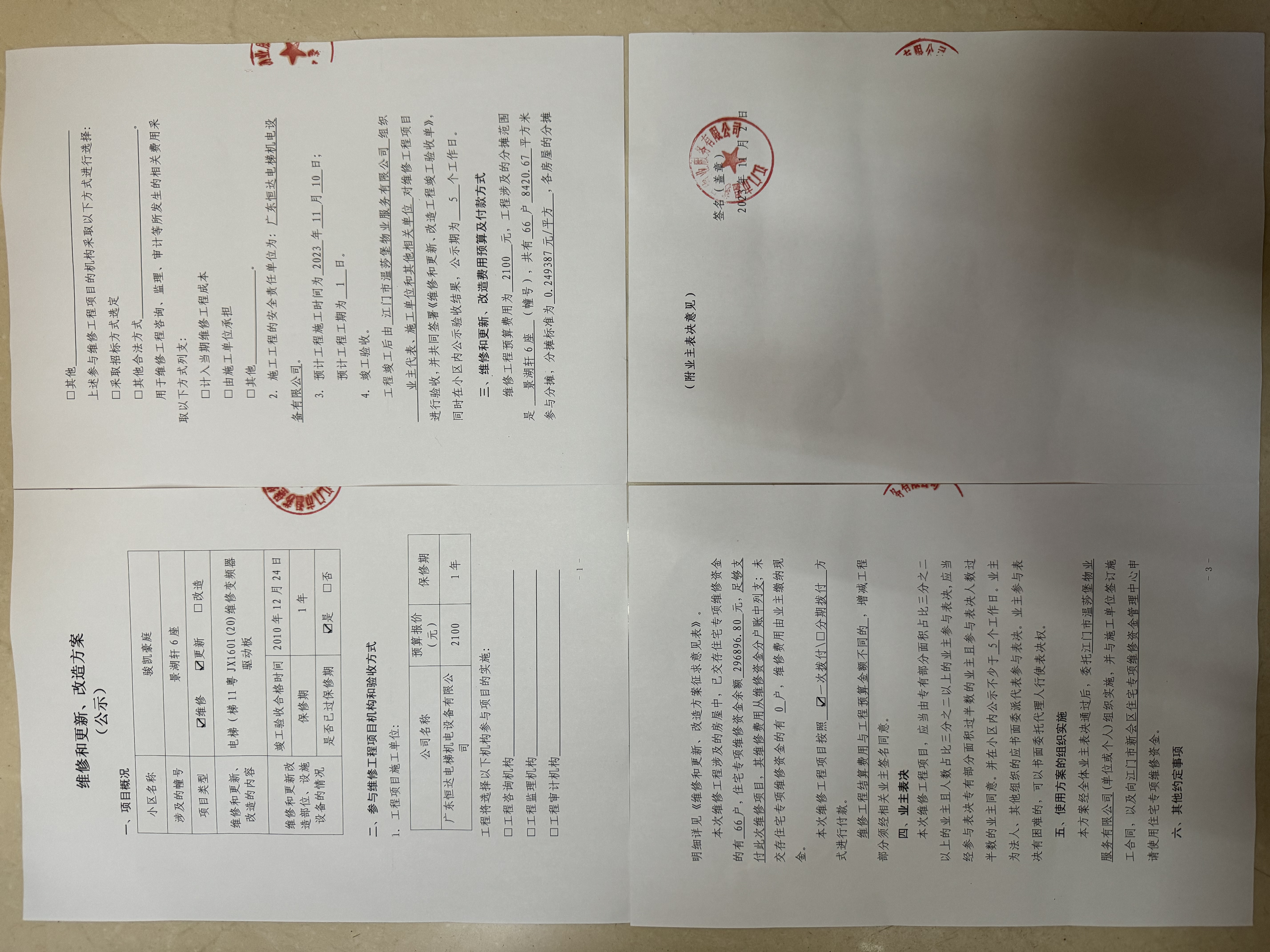<td valign="top" values="" style="border-width:0" bindtype="0" rowspan="17" colspan="7" datasource="投票结果"><font style=" font-family:方正小标宋简体;font-size:14pt;"><p style="line-height: 1.75em;"><span style="font-family: 宋体, SimSun;">各位尊敬的业主:</span><br></p><p style="text-indent: 2em; line-height: 1.75em;"><span style="font-family: 宋体, SimSun;">根据法律法规的规定,本小区业主利用“江门市物业事项表决管理系统”已对本小区公共事务决策事项进行了表决,在经过7日的询异公示期后,未收到业主有效的异议。现将投票结果公告,并就产生的法律效力说明如下:</span></p><p style="line-height: 1.75em; text-indent: 0em;"><strong style="text-indent: 2em;"><span style="font-family: 宋体, SimSun;">一、投票范围</span></strong></p><p style="text-indent: 2em; line-height: 1.75em;"><span style="font-family: 宋体, SimSun;">骏凯豪庭骏凯豪庭景湖轩6座</span></p><p style="text-indent: 2em; line-height: 1.75em;"><span style="font-family: 宋体, SimSun;">总人数(专有部分人数之和):65</span></p><p style="text-indent: 2em; line-height: 1.75em;"><span style="font-family: 宋体, SimSun;"><span style="font-family: 宋体, SimSun; text-indent: 32px;"><span style="font-family: 宋体; text-indent: 32px;">总户数:66</span></span></span></p><p style="text-indent: 2em; line-height: 1.75em;"><span style="font-family: 宋体, SimSun;">建筑物总面积(专有部分面积之和):8420.67㎡</span></p><p style="line-height: 1.75em;"><strong><span style="font-family: 宋体, SimSun;">二、投票结果公告时间</span></strong></p><p style="text-indent: 2em; line-height: 1.75em;"><span style="font-family: 宋体, SimSun;">从2023年11月21日开始</span></p><p style="line-height: 1.75em;"><strong><span style="font-family: 宋体, SimSun;">三、计票规则</span></strong></p><p style="text-indent: 2em; line-height: 1.75em;"><span style="font-family: 宋体, SimSun;">表决事项:使用建筑物及其附属设施的维修资金<br></span></p><p style="font-family: 宋体, SimSun;line-height: 1.75em; text-indent: 2em;">计票规则:弃权票不并入其它项 未表决票不并入其它项</p><p></p><p style="line-height: 1.75em;"><strong><span style="font-family: 宋体, SimSun;">四、通过规则</span></strong></p><p style="line-height: 1.75em;"><strong><span style="font-family: 宋体, SimSun;"> 根据《中华人民共和国民法典》第二百七十八条规定:业主共同决定事项,应当由专有部分面积占比三分之二以上的业主且人数占比三分之二以上的业主参与表决。</span></strong></p><p style="text-indent: 2em; line-height: 1.75em;"><span style="font-family: 宋体, SimSun;"><span style="font-family: 宋体, SimSun; text-indent: 32px;">表决事项:使用建筑物及其附属设施的维修资金<br></span></span></p><p style="font-family: 宋体, SimSun;line-height: 1.75em; text-indent: 2em;">通过规则:参与表决专有部分面积过半数的业主且参与表决人数过半数的业主同意</p><p></p><p style="line-height: 1.75em;"><strong><span style="font-family: 宋体, SimSun;">五、投票结果</span></strong></p><p style="line-height: 1.75em; text-indent: 2em;"><span style="font-family: 宋体, SimSun; text-indent: 2em;"></span></p><div id="resultTable"><table style="table-layout: fixed; font-size:12px; margin-top:10px" width="100%" border="0" cellspacing="0" cellpadding="0"><tbody><tr><td height="28" colspan="10" align="center" style="border: 1px solid #666"><strong style="font-size: 14px;"> 使用建筑物及其附属设施的维修资金</strong></td> </tr><tr id="trfirst"><td height="28" colspan="4" style="border-left: 1px solid #666; border-bottom: 1px solid #666"><strong> 申报单位:</strong> 江门市温莎堡物业服务有限公司</td><td colspan="3" style="border-left: 1px solid #666; border-bottom: 1px solid #666"><strong> 联系方式:</strong> 07506392388 </td><td colspan="3" style="border-left: 1px solid #666; border-bottom: 1px solid #666; border-right: 1px solid #666"><strong> 申报日期:</strong> 2023年11月2日 </td></tr><tr> <td height="28" colspan="5" style="border-left: 1px solid #666; border-bottom: 1px solid #666"><strong> 总人数(专有部分人数之和):</strong>65人 </td><td colspan="5" style="border-left: 1px solid #666; border-bottom: 1px solid #666; border-right: 1px solid #666"><strong> 建筑物总面积(专有部分面积之和):</strong>8420.67㎡ </td> </tr><tr><td height="28" colspan="10" bgcolor="#F3F3F3" style="border-left: 1px solid #666;border-bottom: 1px solid #666;border-right: 1px solid #666"><strong> 参与人数及面积统计</strong></td></tr><tr><td height="28" colspan="5" style="border-left: 1px solid #666; border-bottom: 1px solid #666"><strong> 参与表决专有部分人数之和:</strong>46人</td><td colspan="5" style="border-left: 1px solid #666; border-bottom: 1px solid #666; border-right: 1px solid #666"><strong> 参与表决占有表决权总人数比例:</strong>70.77%</td></tr><tr><td height="28" colspan="5" style="border-left: 1px solid #666; border-bottom: 1px solid #666"><strong> 参与表决专有部分面积之和:</strong>5869.06㎡</td><td colspan="5" style="border-left: 1px solid #666; border-bottom: 1px solid #666; border-right: 1px solid #666"><strong> 参与表决占有表决权总面积比例:</strong>69.70%</td></tr><tr><td height="28" colspan="10" bgcolor="#F3F3F3" style="border-left: 1px solid #666; border-bottom: 1px solid #666;border-right: 1px solid #666"> <strong> 未参与人数及面积统计</strong></td> </tr><tr><td height="28" colspan="5" style="border-left: 1px solid #666; border-bottom: 1px solid #666"><strong> 未参与表决专有部分人数之和:</strong>19人 </td><td colspan="5" style="border-left: 1px solid #666; border-bottom: 1px solid #666; border-right: 1px solid #666"><strong> 未参与表决占有表决权总人数