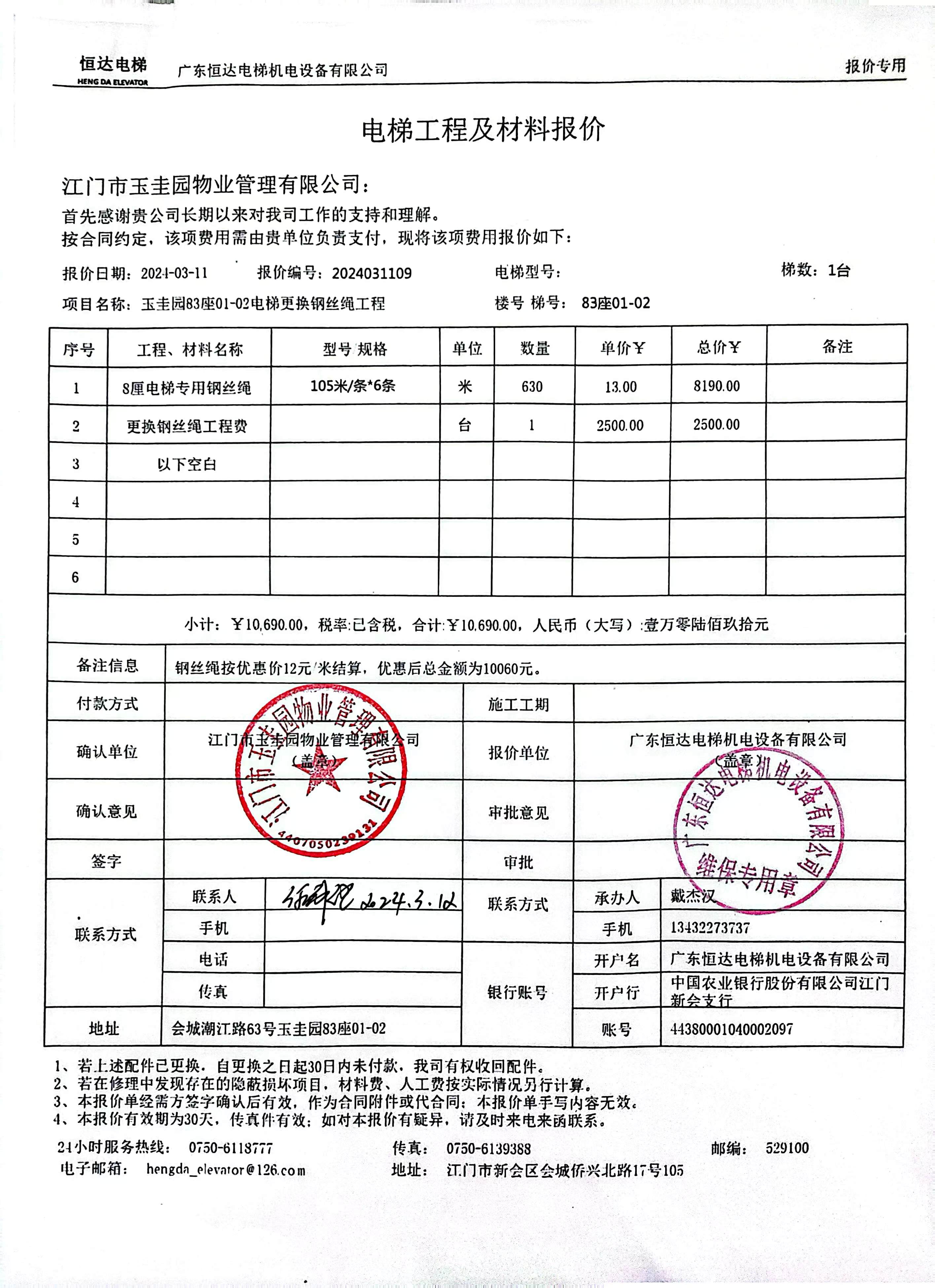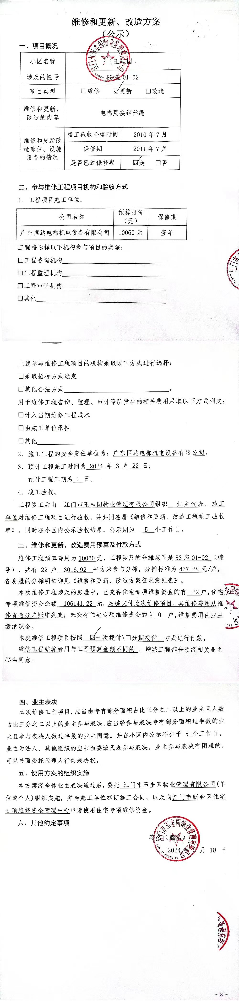 <td VALIGN="top" VALUES="" STYLE="border-width:0" BINDTYPE="0" ROWSPAN="19" COLSPAN="7" DATASOURCE="投票结果" ><font style="font-size:14pt;"><p style="white-space: normal; font-family: 宋体; line-height: 1.75em;">玉圭园玉圭园83座全体业主:</p><p style="white-space: normal; font-family: 宋体; line-height: 1.75em; text-indent: 2em;">本小区关于玉圭园83座01-02电梯更换钢丝绳工程使用维修资金的投票的投票已表决结束,询异时间从2024年03月27日开始,投票询异公示期间,业主可通过微信查询自己的表决情况或可凭身份证件申请查询自己的表决情况;如公示的业主表决情况与查询的本人表决意见不一致的,可以以书面形式向投票组织机构申诉,投票组织机构予以纠正并重新公示表决结果。异议提出人对投票组织机构的处理仍有异议的,可以向街道办事处(镇人民政府)反映处理,涉及住宅专项维修资金的,可向属地住宅专项维修资金管理中心反映处理。</p><p style="white-space: normal;"><br/></p><p style="white-space: normal; font-family: 宋体; line-height: 1.75em;"><strong>附件:</strong></p><p style="white-space: normal; font-family: 宋体; line-height: 1.75em;"><strong>一、投票范围</strong></p><p style="white-space: normal; font-family: 宋体; line-height: 1.75em; text-indent: 2em;">玉圭园玉圭园83座</p><p style="white-space: normal; font-family: 宋体; line-height: 1.75em; text-indent: 2em;">总人数(专有部分人数之和):22</p><p style="white-space: normal; font-family: 宋体; line-height: 1.75em; text-indent: 2em;"><span style="font-family: 宋体, SimSun;"><span style="font-family: 宋体; text-indent: 32px;"><span style="font-family: 宋体; text-indent: 32px;">总户数:22</span></span></span></p><p style="white-space: normal; font-family: 宋体; line-height: 1.75em; text-indent: 2em;">建筑物总面积(专有部分面积之和):3016.92㎡</p><p style="white-space: normal; font-family: 宋体; line-height: 1.75em;"><strong>二、询异公示起止时间</strong></p><p dir="ltr" style="white-space: normal; font-family: 宋体; line-height: 1.75em; text-indent: 2em;"><span style="text-indent: 36px;">2024年03月27日至2024年04月02日</span></p><p style="white-space: normal; font-family: 宋体; line-height: 1.75em;"><strong>三、投票详细描述</strong></p><p style="white-space: normal; font-family: 宋体; line-height: 1.75em; text-indent: 2em;"><p><span style="font-family: "Helvetica Neue", Helvetica, Arial, sans-serif; font-size: 14px; background-color: rgb(255, 255, 255);">玉圭园小区83座01-02的电梯钢丝绳损坏,经检查,是由于电梯钢丝绳使用时间较长,出现损坏不能使用。现需申请使用维修资金对83座01-02电梯更换钢丝绳,工程维修预算金额为10060元,项目最终费用以施工合同签订金额为准。维修费用的分摊标准为 按分户分摊,每户:457.28元,详见公示附件。物业公司联系电话:0750-6551181</span></p></p><p style="white-space: normal; font-family: 宋体; line-height: 1.75em;"><strong>四、计票规则</strong></p><p style="white-space: normal; font-family: 宋体; line-height: 1.75em; text-indent: 2em;">表决事项:玉圭园83座01-02电梯更换钢丝绳工程使用维修资金的投票<br /><p style='text-align: left; font-family: 宋体; font-size: 16px; line-height: 1.75em; text-indent: 2em;'>计票规则:弃权票不并入其它项 未表决票不并入其它项</p></p><p style="white-space: normal; font-family: 宋体; line-height: 1.75em;"><strong>五、通过规则</strong></p><p style="white-space: normal; font-family: 宋体; line-height: 1.75em;"><strong><strong style="white-space: normal;"><span style="font-family: 宋体, SimSun;"> 根据《中华人民共和国民法典》第二百七十八条规定:业主共同决定事项,应当由专有部分面积占比三分之二以上的业主且人数占比三分之二以上的业主参与表决。</span></strong></strong></p><p style="white-space: normal; font-family: 宋体; line-height: 1.75em; text-indent: 2em;">表决事项:玉圭园83座01-02电梯更换钢丝绳工程使用维修资金的投票<br /><p style='text-align: left; font-family: 宋体; font-size: 16px; line-height: 1.75em; text-indent: 2em;'>通过规则:双2/3以上参与表决,参与表决双过半同意</p></p><p style="white-space: normal; font-family: 宋体; line-height: 1.75em;"><strong>六、投票结果</strong></p><p style="white-space: normal; font-family: 宋体; line-height: 1.75em; text-indent: 2em;"><div id='resultTable'><table style='table-layout: fixed; font-size:12px; margin-top:10px' width='100%' border='0' cellspacing='0' cellpadding='0'><tr><td height='28' colspan='10' align='center' style='border: 1px solid #666'><strong style='font-size: 14px;'> 玉圭园83座01-02电梯更换钢丝绳工程使用维修资金的投票</strong></td> </tr><tr id='trfirst'><td height='28' colspan='4' style='border-left: 1px solid #666; border-bottom: 1px solid #666'><strong> 申报单位:</strong> 江门市玉圭园物业管理有限公司</td><td colspan='3' style='border-left: 1px solid #666; border-bottom: 1px solid #666'><strong> 联系方式:</strong> 0750-6178809 </td><td colspan='3' style='border-left: 1px solid #666; border-bottom: 1px solid #666; border-right: 1px solid #666'><strong> 申报日期:</strong> 2024年3月20日 </td></tr><tr> <td height='28' colspan='5' style='border-left: 1px solid #666; border-bottom: 1px solid #666'><strong> 总人数(专有部分人数之和):</strong>22人 </td><td colspan='5' style='border-left: 1px solid #666; border-bottom: 1px solid #666; border-right: 1px solid #666'><strong> 建筑物总面积(专有部分面积之和):</strong>3016.92㎡ </td> </tr><tr><td height='28' colspan='10' bgcolor='#F3F3F3' style='border-left: 1px solid #666;border-bottom: 1px solid #666;border-right: 1px solid #666'><strong> 参与人数及面积统