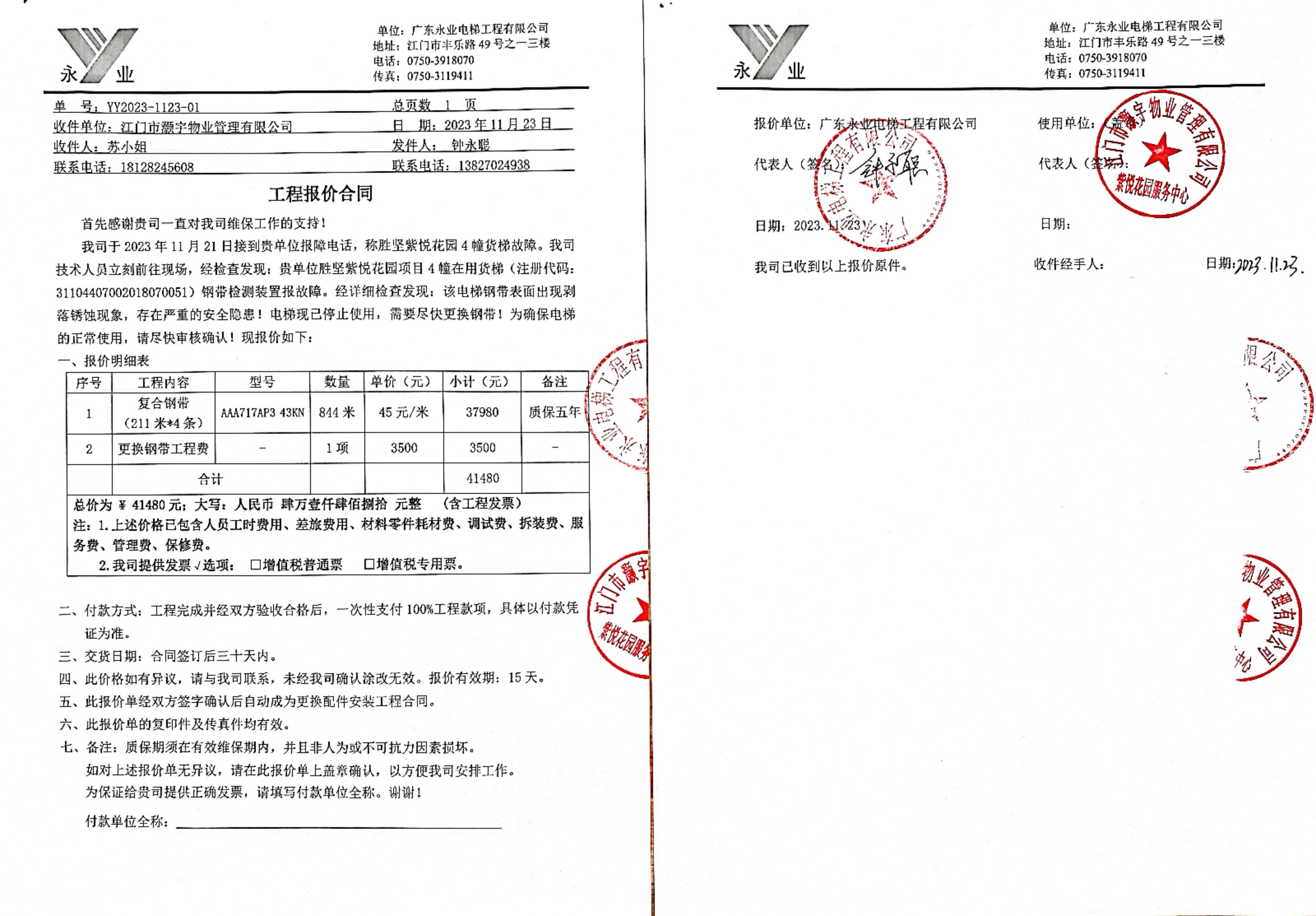 <td VALIGN="top" VALUES="" STYLE="border-width:0" BINDTYPE="0" ROWSPAN="19" COLSPAN="7" DATASOURCE="投票结果" ><font style="font-size:14pt;"><p style="white-space: normal; font-family: 宋体; line-height: 1.75em;">蓬江区胜坚紫悦花园蓬江区胜坚紫悦花园4幢全体业主:</p><p style="white-space: normal; font-family: 宋体; line-height: 1.75em; text-indent: 2em;">本小区关于蓬江区胜坚紫悦花园4幢货梯更换复合钢带使用维修资金的投票的投票已表决结束,询异时间从2023年12月01日开始,投票询异公示期间,业主可通过微信查询自己的表决情况或可凭身份证件申请查询自己的表决情况;如公示的业主表决情况与查询的本人表决意见不一致的,可以以书面形式向投票组织机构申诉,投票组织机构予以纠正并重新公示表决结果。异议提出人对投票组织机构的处理仍有异议的,可以向街道办事处(镇人民政府)反映处理,涉及住宅专项维修资金的,可向属地住宅专项维修资金管理中心反映处理。</p><p style="white-space: normal;"><br/></p><p style="white-space: normal; font-family: 宋体; line-height: 1.75em;"><strong>附件:</strong></p><p style="white-space: normal; font-family: 宋体; line-height: 1.75em;"><strong>一、投票范围</strong></p><p style="white-space: normal; font-family: 宋体; line-height: 1.75em; text-indent: 2em;">蓬江区胜坚紫悦花园蓬江区胜坚紫悦花园4幢</p><p style="white-space: normal; font-family: 宋体; line-height: 1.75em; text-indent: 2em;">总人数(专有部分人数之和):111</p><p style="white-space: normal; font-family: 宋体; line-height: 1.75em; text-indent: 2em;"><span style="font-family: 宋体, SimSun;">总户数:112</span></p><p style="white-space: normal; font-family: 宋体; line-height: 1.75em; text-indent: 2em;">建筑物总面积(专有部分面积之和):14188.70㎡</p><p style="white-space: normal; font-family: 宋体; line-height: 1.75em;"><strong>二、询异公示起止时间</strong></p><p dir="ltr" style="white-space: normal; font-family: 宋体; line-height: 1.75em; text-indent: 2em;"><span style="text-indent: 36px;">2023年12月01日至2023年12月07日</span></p><p style="white-space: normal; font-family: 宋体; line-height: 1.75em;"><strong>三、投票详细描述</strong></p><p style="white-space: normal; font-family: 宋体; line-height: 1.75em; text-indent: 2em;"><p><span style="font-family: 宋体, SimSun; font-size: 16px; background-color: rgb(255, 255, 255);">本小区4幢货梯复合钢带检测装置报故障,钢带表面出现剥落锈蚀现象,现无法正常使用。由于4幢货梯已过保修期。现需申请使用维修资金对4幢货梯复合钢带进行更换,更换金额为:41480.00元,项目最终费用以报价合同签订金额为准。4幢货梯更换复合钢带的费用分摊标准为按建筑面积分摊,每平方约:2.923元,详见公示附件。如业主手机不能正常通过微信投票,请联系物业公司进行线下纸质投票,物业电话:0750-3339221。</span></p></p><p style="white-space: normal; font-family: 宋体; line-height: 1.75em;"><strong>四、计票规则</strong></p><p style="white-space: normal; font-family: 宋体; line-height: 1.75em; text-indent: 2em;">表决事项:使用建筑物及其附属设施的维修资金<br /><p style='text-align: left; font-family: 宋体; font-size: 16px; line-height: 1.75em; text-indent: 2em;'>计票规则:弃权票不并入其它项 未表决票不并入其它项</p></p><p style="white-space: normal; font-family: 宋体; line-height: 1.75em;"><strong>五、通过规则</strong></p><p style="white-space: normal; font-family: 宋体; line-height: 1.75em;"><strong><strong style="white-space: normal;"><span style="font-family: 宋体, SimSun;">&nbsp; 根据《中华人民共和国民法典》第二百七十八条规定:业主共同决定事项,应当由专有部分面积占比三分之二以上的业主且人数占比三分之二以上的业主参与表决。</span></strong></strong></p><p style="white-space: normal; font-family: 宋体; line-height: 1.75em; text-indent: 2em;">表决事项:使用建筑物及其附属设施的维修资金<br /><p style='text-align: left; font-family: 宋体; font-size: 16px; line-height: 1.75em; text-indent: 2em;'>通过规则:参与表决专有部分面积过半数的业主且参与表决人数过半数的业主同意</p></p><p style="white-space: normal; font-family: 宋体; line-height: 1.75em;"><strong>六、投票结果</strong></p><p style="white-space: normal; font-family: 宋体; line-height: 1.75em; text-indent: 2em;"><div id='resultTable'><table style='table-layout: fixed; font-size:12px; margin-top:10px' width='100%' border='0' cellspacing='0' cellpadding='0'><tr><td height='28' colspan='10' align='center' style='border: 1px solid #666'><strong style='font-size: 14px;'> 使用建筑物及其附属设施的维修资金</strong></td> </tr><tr id='trfirst'><td height='28' colspan='4' style='border-left: 1px solid #666; border-bottom: 1px solid #666'><strong> 申报单位:</strong> 江门市灏宇物业管理有限公司</td><td colspan='3' style='border-left: 1px solid #666; border-bottom: 1px solid #666'><strong> 联系方式:</strong> </td><td colspan='3' style='border-left: 1px solid #666; border-bottom: 1px solid #666; border-right: 1px solid #666'><strong> 申报日期:</strong> 2023年11月23日 </td></tr><tr> <td height='28' colspan='5' style='border-left: 1px solid #666; border-bottom: 1px solid #666'><strong> 总人数(专有部分人数之和):</strong>111人 </td><td colspan='5' style='border-left: 1px solid #666; border-bottom: 1px solid #666; border-right: 1px solid #666'><strong> 建筑物总面积(专有部分面积之和):</strong>14188.70㎡ </td> </tr><tr><td height='28' colspan='10' bgcolor='#F3F3F3' style='border-left: 1px solid #666;border-bottom: 1px solid #666;border-right: 1px solid #666'><strong> 参与人
