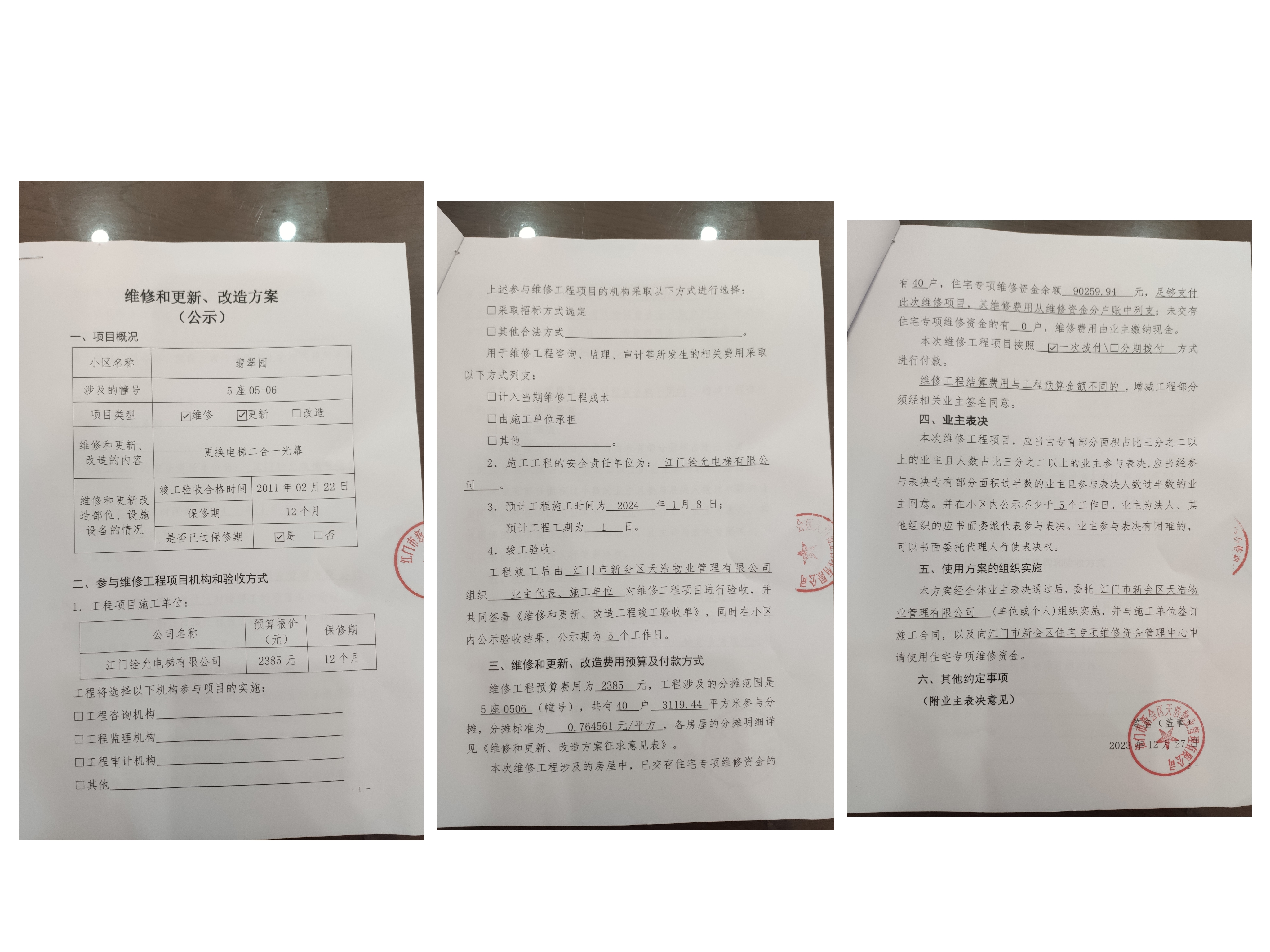 <td valign="top" values="" style="border-width:0" bindtype="0" rowspan="17" colspan="7" datasource="投票结果"><font style=" font-family:方正小标宋简体;font-size:14pt;"><p style="line-height: 1.75em;"><span style="font-family: 宋体, SimSun;">各位尊敬的业主:</span><br></p><p style="text-indent: 2em; line-height: 1.75em;"><span style="font-family: 宋体, SimSun;">根据法律法规的规定,本小区业主利用“江门市物业事项表决管理系统”已对本小区公共事务决策事项进行了表决,在经过7日的询异公示期后,未收到业主有效的异议。现将投票结果公告,并就产生的法律效力说明如下:</span></p><p style="line-height: 1.75em; text-indent: 0em;"><strong style="text-indent: 2em;"><span style="font-family: 宋体, SimSun;">一、投票范围</span></strong></p><p style="text-indent: 2em; line-height: 1.75em;"><span style="font-family: 宋体, SimSun;">翡翠园翡翠园5座</span></p><p style="text-indent: 2em; line-height: 1.75em;"><span style="font-family: 宋体, SimSun;">总人数(专有部分人数之和):21</span></p><p style="text-indent: 2em; line-height: 1.75em;"><span style="font-family: 宋体, SimSun;"><span style="font-family: 宋体, SimSun; text-indent: 32px;"><span style="font-family: 宋体; text-indent: 32px;"><span style="font-family: 宋体; text-indent: 32px;">总户数:40</span></span></span></span></p><p style="text-indent: 2em; line-height: 1.75em;"><span style="font-family: 宋体, SimSun;">建筑物总面积(专有部分面积之和):3119.44㎡</span></p><p style="line-height: 1.75em;"><strong><span style="font-family: 宋体, SimSun;">二、投票结果公告时间</span></strong></p><p style="text-indent: 2em; line-height: 1.75em;"><span style="font-family: 宋体, SimSun;">从2024年01月13日开始</span></p><p style="line-height: 1.75em;"><strong><span style="font-family: 宋体, SimSun;">三、计票规则</span></strong></p><p style="text-indent: 2em; line-height: 1.75em;"><span style="font-family: 宋体, SimSun;">表决事项:使用建筑物及其附属设施的维修资金<br></span></p><p style="font-family: 宋体, SimSun;line-height: 1.75em; text-indent: 2em;">计票规则:弃权票不并入其它项 未表决票不并入其它项</p><p></p><p style="line-height: 1.75em;"><strong><span style="font-family: 宋体, SimSun;">四、通过规则</span></strong></p><p style="line-height: 1.75em;"><strong><span style="font-family: 宋体, SimSun;"> 根据《中华人民共和国民法典》第二百七十八条规定:业主共同决定事项,应当由专有部分面积占比三分之二以上的业主且人数占比三分之二以上的业主参与表决。</span></strong></p><p style="text-indent: 2em; line-height: 1.75em;"><span style="font-family: 宋体, SimSun;"><span style="font-family: 宋体, SimSun; text-indent: 32px;">表决事项:使用建筑物及其附属设施的维修资金<br></span></span></p><p style="font-family: 宋体, SimSun;line-height: 1.75em; text-indent: 2em;">通过规则:参与表决专有部分面积过半数的业主且参与表决人数过半数的业主同意</p><p></p><p style="line-height: 1.75em;"><strong><span style="font-family: 宋体, SimSun;">五、投票结果</span></strong></p><p style="line-height: 1.75em; text-indent: 2em;"><span style="font-family: 宋体, SimSun; text-indent: 2em;"></span></p><div id="resultTable"><table style="table-layout: fixed; font-size:12px; margin-top:10px" width="100%" border="0" cellspacing="0" cellpadding="0"><tbody><tr><td height="28" colspan="10" align="center" style="border: 1px solid #666"><strong style="font-size: 14px;"> 使用建筑物及其附属设施的维修资金</strong></td> </tr><tr id="trfirst"><td height="28" colspan="4" style="border-left: 1px solid #666; border-bottom: 1px solid #666"><strong> 申报单位:</strong> 江门市新会区天浩物业管理有限公司</td><td colspan="3" style="border-left: 1px solid #666; border-bottom: 1px solid #666"><strong> 联系方式:</strong> </td><td colspan="3" style="border-left: 1px solid #666; border-bottom: 1px solid #666; border-right: 1px solid #666"><strong> 申报日期:</strong> 2023年12月29日 </td></tr><tr> <td height="28" colspan="5" style="border-left: 1px solid #666; border-bottom: 1px solid #666"><strong> 总人数(专有部分人数之和):</strong>21人 </td><td colspan="5" style="border-left: 1px solid #666; border-bottom: 1px solid #666; border-right: 1px solid #666"><strong> 建筑物总面积(专有部分面积之和):</strong>3119.44㎡ </td> </tr><tr><td height="28" colspan="10" bgcolor="#F3F3F3" style="border-left: 1px solid #666;border-bottom: 1px solid #666;border-right: 1px solid #666"><strong> 参与人数及面积统计</strong></td></tr><tr><td height="28" colspan="5" style="border-left: 1px solid #666; border-bottom: 1px solid #666"><strong> 参与表决专有部分人数之和:</strong>16人</td><td colspan="5" style="border-left: 1px solid #666; border-bottom: 1px solid #666; border-right: 1px solid #666"><strong> 参与表决占有表决权总人数比例:</strong>76.19%</td></tr><tr><td height="28" colspan="5" style="border-left: 1px solid #666; border-bottom: 1px solid #666"><strong> 参与表决专有部分面积之和:</strong>2383.49㎡</td><td colspan="5" style="border-left: 1px solid #666; border-bottom: 1px solid #666; border-right: 1px solid #666"><strong> 参与表决占有表决权总面积比例:</strong>76.41%</td></tr><tr><td height="28" colspan="10" bgcolor="#F3F3F3" style="border-left: 1px solid #666; border-bottom: 1px solid #666;border-right: 1px solid #666"> <strong> 未参与人数及面积统计</strong></td> </tr><tr><td height="28" colspan="5" style="border-left: 1px solid #666; border-bottom: 1px solid #666"><strong> 未参与表决专有部分人数之和:</strong>5人 </td><td colspan="5" style="border-left: 1px solid #666; border-bottom: 1px solid #666; border-right: 1px solid #666"><strong> 