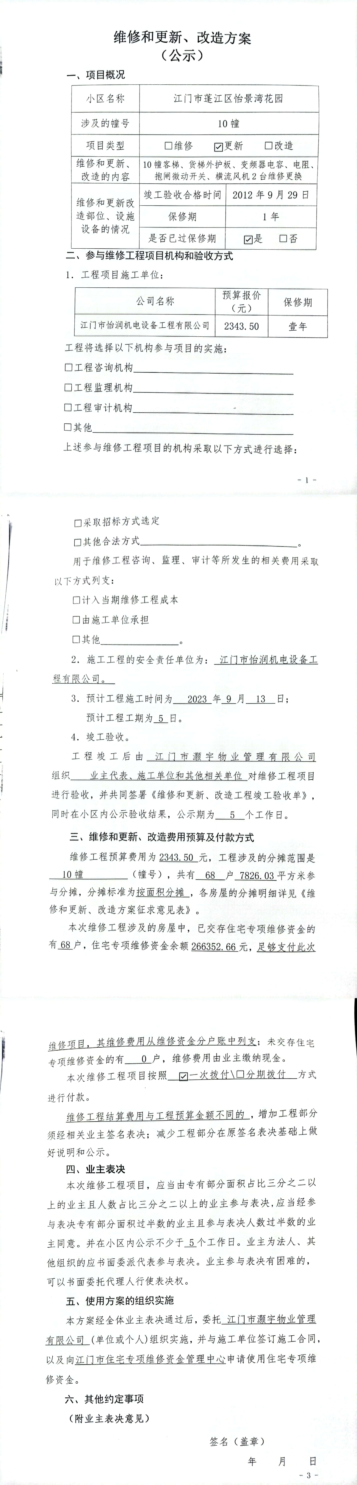 <td valign="top" values="" style="border-width:0" bindtype="0" rowspan="17" colspan="7" datasource="投票结果"><font style=" font-family:方正小标宋简体;font-size:14pt;"><p style="line-height: 1.75em;"><span style="font-family: 宋体, SimSun;">各位尊敬的业主:</span><br></p><p style="text-indent: 2em; line-height: 1.75em;"><span style="font-family: 宋体, SimSun;">根据法律法规的规定,本小区业主利用“江门市物业事项表决管理系统”已对本小区公共事务决策事项进行了表决,在经过7日的询异公示期后,未收到业主有效的异议。现将投票结果公告,并就产生的法律效力说明如下:</span></p><p style="line-height: 1.75em; text-indent: 0em;"><strong style="text-indent: 2em;"><span style="font-family: 宋体, SimSun;">一、投票范围</span></strong></p><p style="text-indent: 2em; line-height: 1.75em;"><span style="font-family: 宋体, SimSun;">蓬江区怡景湾蓬江区怡景湾花园10幢</span></p><p style="text-indent: 2em; line-height: 1.75em;"><span style="font-family: 宋体, SimSun;">总人数(专有部分人数之和):67</span></p><p style="text-indent: 2em; line-height: 1.75em;"><span style="font-family: 宋体, SimSun;"><span style="font-family: 宋体, SimSun; text-indent: 32px;"><span style="font-family: 宋体; text-indent: 32px;">总户数:68</span></span></span></p><p style="text-indent: 2em; line-height: 1.75em;"><span style="font-family: 宋体, SimSun;">建筑物总面积(专有部分面积之和):7826.03㎡</span></p><p style="line-height: 1.75em;"><strong><span style="font-family: 宋体, SimSun;">二、投票结果公告时间</span></strong></p><p style="text-indent: 2em; line-height: 1.75em;"><span style="font-family: 宋体, SimSun;">从2023年10月08日开始</span></p><p style="line-height: 1.75em;"><strong><span style="font-family: 宋体, SimSun;">三、计票规则</span></strong></p><p style="text-indent: 2em; line-height: 1.75em;"><span style="font-family: 宋体, SimSun;">表决事项:使用建筑物及其附属设施的维修资金<br></span></p><p style="font-family: 宋体, SimSun;line-height: 1.75em; text-indent: 2em;">计票规则:弃权票不并入其它项 未表决票不并入其它项</p><p></p><p style="line-height: 1.75em;"><strong><span style="font-family: 宋体, SimSun;">四、通过规则</span></strong></p><p style="text-indent: 2em; line-height: 1.75em;"><span style="font-family: 宋体, SimSun;"><span style="font-family: 宋体, SimSun; text-indent: 32px;">表决事项:使用建筑物及其附属设施的维修资金<br></span></span></p><p style="font-family: 宋体, SimSun;line-height: 1.75em; text-indent: 2em;">通过规则:参与表决专有部分面积过半数的业主且参与表决人数过半数的业主同意</p><p></p><p style="line-height: 1.75em;"><strong><span style="font-family: 宋体, SimSun;">五、投票结果</span></strong></p><p style="line-height: 1.75em; text-indent: 2em;"><span style="font-family: 宋体, SimSun; text-indent: 2em;"></span></p><div id="resultTable"><table style="table-layout: fixed; font-size:12px; margin-top:10px" width="100%" border="0" cellspacing="0" cellpadding="0"><tbody><tr><td height="28" colspan="10" align="center" style="border: 1px solid #666"><strong style="font-size: 14px;"> 使用建筑物及其附属设施的维修资金</strong></td> </tr><tr id="trfirst"><td height="28" colspan="4" style="border-left: 1px solid #666; border-bottom: 1px solid #666"><strong> 申报单位:</strong> 江门市灏宇物业管理有限公司</td><td colspan="3" style="border-left: 1px solid #666; border-bottom: 1px solid #666"><strong> 联系方式:</strong> </td><td colspan="3" style="border-left: 1px solid #666; border-bottom: 1px solid #666; border-right: 1px solid #666"><strong> 申报日期:</strong> 2023年9月12日 </td></tr><tr> <td height="28" colspan="5" style="border-left: 1px solid #666; border-bottom: 1px solid #666"><strong> 总人数(专有部分人数之和):</strong>67人 </td><td colspan="5" style="border-left: 1px solid #666; border-bottom: 1px solid #666; border-right: 1px solid #666"><strong> 建筑物总面积(专有部分面积之和):</strong>7826.03㎡ </td> </tr><tr><td height="28" colspan="10" bgcolor="#F3F3F3" style="border-left: 1px solid #666;border-bottom: 1px solid #666;border-right: 1px solid #666"><strong> 参与人数及面积统计</strong></td></tr><tr><td height="28" colspan="5" style="border-left: 1px solid #666; border-bottom: 1px solid #666"><strong> 参与表决专有部分人数之和:</strong>22人</td><td colspan="5" style="border-left: 1px solid #666; border-bottom: 1px solid #666; border-right: 1px solid #666"><strong> 参与表决占有表决权总人数比例:</strong>32.84%</td></tr><tr><td height="28" colspan="5" style="border-left: 1px solid #666; border-bottom: 1px solid #666"><strong> 参与表决专有部分面积之和:</strong>2659.39㎡</td><td colspan="5" style="border-left: 1px solid #666; border-bottom: 1px solid #666; border-right: 1px solid #666"><strong> 参与表决占有表决权总面积比例:</strong>33.98%</td></tr><tr><td height="28" colspan="10" bgcolor="#F3F3F3" style="border-left: 1px solid #666; border-bottom: 1px solid #666;border-right: 1px solid #666"> <strong> 未参与人数及面积统计</strong></td> </tr><tr><td height="28" colspan="5" style="border-left: 1px solid #666; border-bottom: 1px solid #666"><strong> 未参与表决专有部分人数之和:</strong>45人 </td><td colspan="5" style="border-left: 1px solid #666; border-bottom: 1px solid #666; border-right: 1px solid #666"><strong> 未参与表决占有表决权总人数比例:</strong>67.16%</td></tr><tr><td height="28" colspan="5" style="border-left: 1px solid #666; border-bottom: 1px solid #666"><strong> 未参与表决专有部分面积之和:</strong>5166.64㎡</td><td colspan="5" style="border-left: 1px solid #666; border-bottom: 1px solid #666; border-right: 1px solid #666"><stron