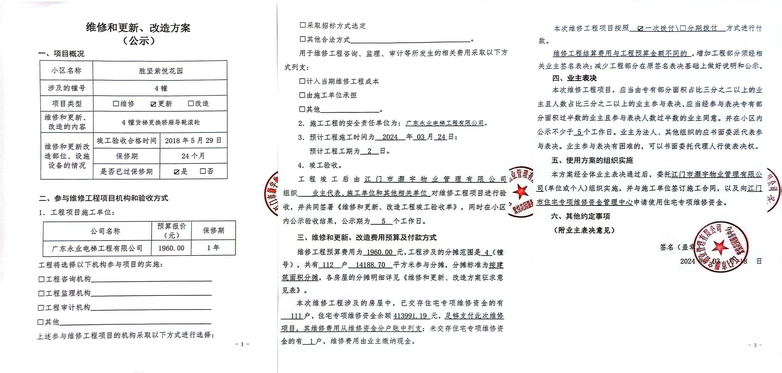 <td VALIGN="top" VALUES="" STYLE="border-width:0" BINDTYPE="0" ROWSPAN="17" COLSPAN="7" DATASOURCE="投票结果" ><font style=" font-family:方正小标宋简体;font-size:14pt;"><p style="line-height: 1.75em;"><span style="font-family: 宋体, SimSun;">各位尊敬的业主:</span><br/></p><p style="text-indent: 2em; line-height: 1.75em;"><span style="font-family: 宋体, SimSun;">根据法律法规的规定,本小区业主利用“江门市物业事项表决管理系统”已对本小区公共事务决策事项进行了表决,在经过7日的询异公示期后,未收到业主有效的异议。现将投票结果公告,并就产生的法律效力说明如下:</span></p><p style="line-height: 1.75em; text-indent: 0em;"><strong style="text-indent: 2em;"><span style="font-family: 宋体, SimSun;">一、投票范围</span></strong></p><p style="text-indent: 2em; line-height: 1.75em;"><span style="font-family: 宋体, SimSun;">蓬江区胜坚紫悦花园蓬江区胜坚紫悦花园4幢</span></p><p style="text-indent: 2em; line-height: 1.75em;"><span style="font-family: 宋体, SimSun;">总人数(专有部分人数之和):112</span></p><p style="text-indent: 2em; line-height: 1.75em;"><span style="font-family: 宋体, SimSun;"><span style="font-family: 宋体, SimSun; text-indent: 32px;"><span style="font-family: 宋体; text-indent: 32px;"><span style="font-family: 宋体; text-indent: 32px;">总户数:112</span></span></span></span></p><p style="text-indent: 2em; line-height: 1.75em;"><span style="font-family: 宋体, SimSun;">建筑物总面积(专有部分面积之和):14188.70㎡</span></p><p style="line-height: 1.75em;"><strong><span style="font-family: 宋体, SimSun;">二、投票结果公告时间</span></strong></p><p style="text-indent: 2em; line-height: 1.75em;"><span style="font-family: 宋体, SimSun;">从2024年03月31日开始</span></p><p style="line-height: 1.75em;"><strong><span style="font-family: 宋体, SimSun;">三、计票规则</span></strong></p><p style="text-indent: 2em; line-height: 1.75em;"><span style="font-family: 宋体, SimSun;">表决事项:使用建筑物及其附属设施的维修资金<br /><p style='font-family: 宋体, SimSun;line-height: 1.75em; text-indent: 2em;'>计票规则:弃权票不并入其它项&nbsp;&nbsp;&nbsp;&nbsp;未表决票不并入其它项</p></span></p><p style="line-height: 1.75em;"><strong><span style="font-family: 宋体, SimSun;">四、通过规则</span></strong></p><p style="line-height: 1.75em;"><strong><span style="font-family: 宋体, SimSun;">&nbsp; 根据《中华人民共和国民法典》第二百七十八条规定:业主共同决定事项,应当由专有部分面积占比三分之二以上的业主且人数占比三分之二以上的业主参与表决。</span></strong></p><p style="text-indent: 2em; line-height: 1.75em;"><span style="font-family: 宋体, SimSun;"><span style="font-family: 宋体, SimSun; text-indent: 32px;">表决事项:使用建筑物及其附属设施的维修资金<br /><p style='font-family: 宋体, SimSun;line-height: 1.75em; text-indent: 2em;'>通过规则:双2/3以上参与表决,参与表决双过半同意</p></span></span></p><p style="line-height: 1.75em;"><strong><span style="font-family: 宋体, SimSun;">五、投票结果</span></strong></p><p style="line-height: 1.75em; text-indent: 2em;"><span style="font-family: 宋体, SimSun; text-indent: 2em;"><div id='resultTable'><table style='table-layout: fixed; font-size:12px; margin-top:10px' width='100%' border='0' cellspacing='0' cellpadding='0'><tr><td height='28' colspan='10' align='center' style='border: 1px solid #666'><strong style='font-size: 14px;'> 使用建筑物及其附属设施的维修资金</strong></td> </tr><tr id='trfirst'><td height='28' colspan='4' style='border-left: 1px solid #666; border-bottom: 1px solid #666'><strong>&nbsp;申报单位:</strong> 江门市灏宇物业管理有限公司</td><td colspan='3' style='border-left: 1px solid #666; border-bottom: 1px solid #666'><strong>&nbsp;联系方式:</strong> </td><td colspan='3' style='border-left: 1px solid #666; border-bottom: 1px solid #666; border-right: 1px solid #666'><strong>&nbsp;申报日期:</strong> 2024年3月18日 </td></tr><tr> <td height='28' colspan='5' style='border-left: 1px solid #666; border-bottom: 1px solid #666'><strong>&nbsp;列支总人数(专有部分人数之和):</strong>112人 </td><td colspan='5' style='border-left: 1px solid #666; border-bottom: 1px solid #666; border-right: 1px solid #666'><strong>&nbsp;列支建筑物总面积(专有部分面积之和):</strong>14188.70㎡ </td> </tr><tr><td height='28' colspan='10' bgcolor='#F3F3F3' style='border-left: 1px solid #666;border-bottom: 1px solid #666;border-right: 1px solid #666'><strong>&nbsp;参与表决人数及面积统计</strong></td></tr><tr><td height='28' colspan='5' style='border-left: 1px solid #666; border-bottom: 1px solid #666'><strong>&nbsp;参与表决人数:</strong>78人</td><td colspan='5' style='border-left: 1px solid #666; border-bottom: 1px solid #666; border-right: 1px solid #666'><strong>&nbsp;参与表决人数占总人数比例:</strong>69.64%</td></tr><tr><td height='28' colspan='5' style='border-left: 1px solid #666; border-bottom: 1px solid #666'><strong>&nbsp;参与表决面积:</strong>9992.42㎡</td><td colspan='5' style='border-left: 1px solid #666; border-bottom: 1px solid #666; border-right: 1px solid #666'><strong>&nbsp;参与表决面积占总面积比例:</strong>70.43%</td></tr><tr><td height='28' colspan='10' bgcolor='#F3F3F3' style='border-left: 1px solid #666; border-bottom: 1px solid #666;border-right: 1px solid #666'> <strong>&nbsp;参与表决同意人数及面积统计</strong></td> </tr><tr><td height='28' colspan='5' style='border-left: 1px solid #666; border-bottom: 1px solid #666'><strong>&nbsp;参与表决同意人数:</strong>75人 </td><td colspan='5' style='border-left: 1px solid #666; border-bottom: 1px solid #666; border-right: 1px soli