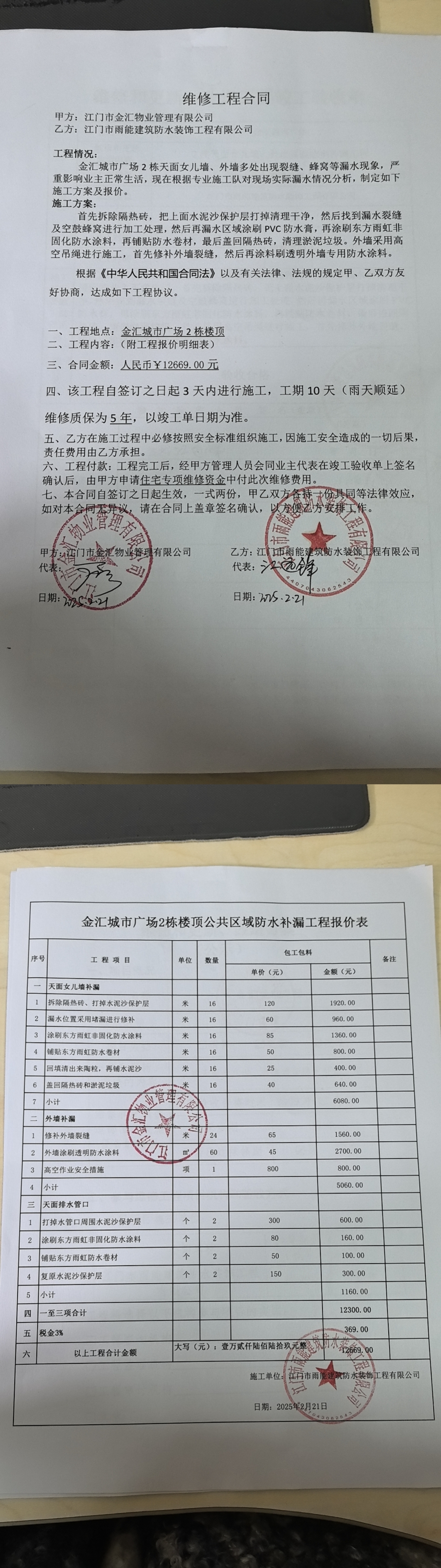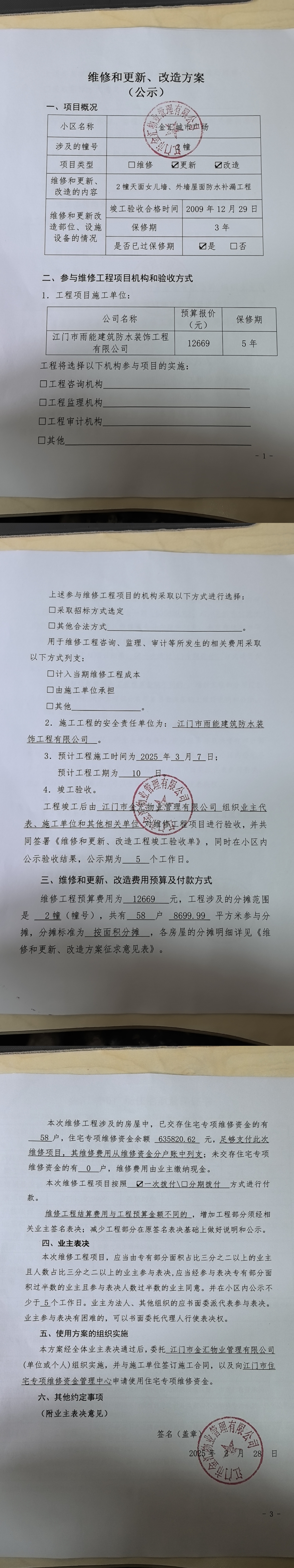 <td VALIGN="top" VALUES="" STYLE="border-width:0" BINDTYPE="0" ROWSPAN="17" COLSPAN="7" DATASOURCE="投票结果" ><font style=" font-family:方正小标宋简体;font-size:14pt;"><p style="line-height: 1.75em;"><span style="font-family: 宋体, SimSun;">各位尊敬的业主:</span><br/></p><p style="text-indent: 2em; line-height: 1.75em;"><span style="font-family: 宋体, SimSun;">根据法律法规的规定,本小区业主利用“江门市物业事项表决管理系统”已对本小区公共事务决策事项(<span style="font-family: 宋体; text-indent: 32px;">金汇城市广场关于2幢天面女儿墙补漏工程申请维修资金的投票</span>)进行了表决,在经过7日的询异公示期后,未收到业主有效的异议。现将投票结果公告,并就产生的法律效力说明如下:</span></p><p style="line-height: 1.75em; text-indent: 0em;"><strong style="text-indent: 2em;"><span style="font-family: 宋体, SimSun;">一、投票范围</span></strong></p><p style="text-indent: 2em; line-height: 1.75em;"><span style="font-family: 宋体, SimSun;">金汇城市广场金汇城市广场2栋</span></p><p style="text-indent: 2em; line-height: 1.75em;"><span style="font-family: 宋体, SimSun;">总人数(专有部分人数之和):56</span></p><p style="text-indent: 2em; line-height: 1.75em;"><span style="font-family: 宋体, SimSun;"><span style="font-family: 宋体, SimSun; text-indent: 32px;"><span style="font-family: 宋体; text-indent: 32px;"><span style="font-family: 宋体; text-indent: 32px;">总户数:58</span></span></span></span></p><p style="text-indent: 2em; line-height: 1.75em;"><span style="font-family: 宋体, SimSun;">建筑物总面积(专有部分面积之和):8699.99㎡</span></p><p style="line-height: 1.75em;"><strong><span style="font-family: 宋体, SimSun;">二、投票结果公告时间</span></strong></p><p style="text-indent: 2em; line-height: 1.75em;"><span style="font-family: 宋体, SimSun;"><span style="font-family: 宋体, SimSun; text-indent: 32px;">从2025年10月14日开始</span></span></p><p style="line-height: 1.75em;"><strong><span style="font-family: 宋体, SimSun;">三、计票规则</span></strong></p><p style="text-indent: 2em; line-height: 1.75em;"><span style="font-family: 宋体, SimSun;">表决事项:使用建筑物及其附属设施的维修资金<br /><p style='font-family: 宋体, SimSun;line-height: 1.75em; text-indent: 2em;'>计票规则:弃权票不并入其它项&nbsp;&nbsp;&nbsp;&nbsp;未表决票不并入其它项</p></span></p><p style="line-height: 1.75em;"><strong><span style="font-family: 宋体, SimSun;">四、通过规则</span></strong></p><p style="line-height: 1.75em;"><strong><span style="font-family: 宋体, SimSun;">&nbsp; 根据《中华人民共和国民法典》第二百七十八条规定:业主共同决定事项,应当由专有部分面积占比三分之二以上的业主且人数占比三分之二以上的业主参与表决。</span></strong></p><p style="text-indent: 2em; line-height: 1.75em;"><span style="font-family: 宋体, SimSun;"><span style="font-family: 宋体, SimSun; text-indent: 32px;">表决事项:使用建筑物及其附属设施的维修资金<br /><p style='font-family: 宋体, SimSun;line-height: 1.75em; text-indent: 2em;'>通过规则:双2/3以上参与表决,参与表决双过半同意</p></span></span></p><p style="line-height: 1.75em;"><strong><span style="font-family: 宋体, SimSun;">五、投票结果</span></strong></p><p style="line-height: 1.75em; text-indent: 2em;"><span style="font-family: 宋体, SimSun; text-indent: 2em;"><div id='resultTable'><table style='table-layout: fixed; font-size:12px; margin-top:10px' width='100%' border='0' cellspacing='0' cellpadding='0'><tr><td height='28' colspan='10' align='center' style='border: 1px solid #666'><strong style='font-size: 14px;'> 使用建筑物及其附属设施的维修资金</strong></td> </tr><tr id='trfirst'><td height='28' colspan='4' style='border-left: 1px solid #666; border-bottom: 1px solid #666'><strong>&nbsp;申报单位:</strong> 江门市金汇物业管理有限公司</td><td colspan='3' style='border-left: 1px solid #666; border-bottom: 1px solid #666'><strong>&nbsp;联系方式:</strong> 3929003 </td><td colspan='3' style='border-left: 1px solid #666; border-bottom: 1px solid #666; border-right: 1px solid #666'><strong>&nbsp;申报日期:</strong> 2025年3月8日 </td></tr><tr> <td height='28' colspan='5' style='border-left: 1px solid #666; border-bottom: 1px solid #666'><strong>&nbsp;列支总人数(专有部分人数之和):</strong>56人 </td><td colspan='5' style='border-left: 1px solid #666; border-bottom: 1px solid #666; border-right: 1px solid #666'><strong>&nbsp;列支建筑物总面积(专有部分面积之和):</strong>8699.99㎡ </td> </tr><tr><td height='28' colspan='10' bgcolor='#F3F3F3' style='border-left: 1px solid #666;border-bottom: 1px solid #666;border-right: 1px solid #666'><strong>&nbsp;参与表决人数及面积统计</strong></td></tr><tr><td height='28' colspan='5' style='border-left: 1px solid #666; border-bottom: 1px solid #666'><strong>&nbsp;参与表决人数:</strong>19人</td><td colspan='5' style='border-left: 1px solid #666; border-bottom: 1px solid #666; border-right: 1px solid #666'><strong>&nbsp;参与表决人数占总人数比例:</strong>33.93%</td></tr><tr><td height='28' colspan='5' style='border-left: 1px solid #666; border-bottom: 1px solid #666'><strong>&nbsp;参与表决面积:</strong>2654.47㎡</td><td colspan='5' style='border-left: 1px solid #666; border-bottom: 1px solid #666; border-right: 1px solid #666'><strong>&nbsp;参与表决面积占总面积比例:</strong>30.51%</td></tr><tr><td height='28' colspan='10' bgcolor='#F3F3F3' style='border-left: 1px solid #666; border-bottom: 1px solid #666;border-right: 1px solid #666'> <strong>&nbsp;参与表决同意人数及面积统计</strong></td> </tr><tr><td height='28' colspan='5' style='border-left: 1px solid #66