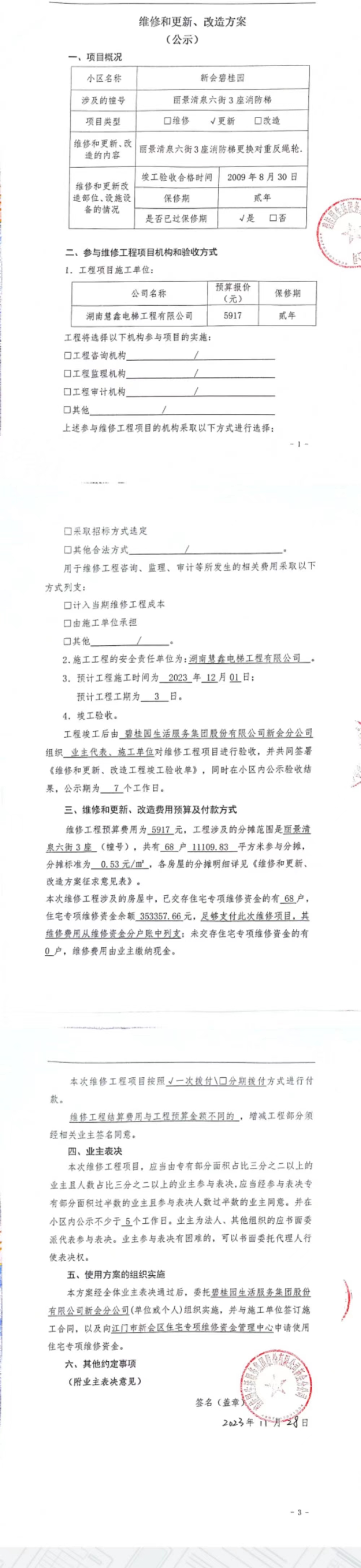 <td VALIGN="top" VALUES="" STYLE="border-width:0" BINDTYPE="0" ROWSPAN="17" COLSPAN="7" DATASOURCE="投票结果" ><font style=" font-family:方正小标宋简体;font-size:14pt;"><p style="line-height: 1.75em;"><span style="font-family: 宋体, SimSun;">各位尊敬的业主:</span><br/></p><p style="text-indent: 2em; line-height: 1.75em;"><span style="font-family: 宋体, SimSun;">根据法律法规的规定,本小区业主利用“江门市物业事项表决管理系统”已对本小区公共事务决策事项进行了表决,在经过7日的询异公示期后,未收到业主有效的异议。现将投票结果公告,并就产生的法律效力说明如下:</span></p><p style="line-height: 1.75em; text-indent: 0em;"><strong style="text-indent: 2em;"><span style="font-family: 宋体, SimSun;">一、投票范围</span></strong></p><p style="text-indent: 2em; line-height: 1.75em;"><span style="font-family: 宋体, SimSun;">新会碧桂园丽景清泉六街3座</span></p><p style="text-indent: 2em; line-height: 1.75em;"><span style="font-family: 宋体, SimSun;">总人数(专有部分人数之和):68</span></p><p style="text-indent: 2em; line-height: 1.75em;"><span style="font-family: 宋体, SimSun;"><span style="font-family: 宋体, SimSun; text-indent: 32px;"><span style="font-family: 宋体; text-indent: 32px;"><span style="font-family: 宋体; text-indent: 32px;">总户数:{TotalHouseCount}</span></span></span></span></p><p style="text-indent: 2em; line-height: 1.75em;"><span style="font-family: 宋体, SimSun;">建筑物总面积(专有部分面积之和):11109.83㎡</span></p><p style="line-height: 1.75em;"><strong><span style="font-family: 宋体, SimSun;">二、投票结果公告时间</span></strong></p><p style="text-indent: 2em; line-height: 1.75em;"><span style="font-family: 宋体, SimSun;">从2023年12月15日开始</span></p><p style="line-height: 1.75em;"><strong><span style="font-family: 宋体, SimSun;">三、计票规则</span></strong></p><p style="text-indent: 2em; line-height: 1.75em;"><span style="font-family: 宋体, SimSun;">表决事项:使用建筑物及其附属设施的维修资金<br /><p style='font-family: 宋体, SimSun;line-height: 1.75em; text-indent: 2em;'>计票规则:弃权票不并入其它项 未表决票不并入其它项</p></span></p><p style="line-height: 1.75em;"><strong><span style="font-family: 宋体, SimSun;">四、通过规则</span></strong></p><p style="line-height: 1.75em;"><strong><span style="font-family: 宋体, SimSun;"> 根据《中华人民共和国民法典》第二百七十八条规定:业主共同决定事项,应当由专有部分面积占比三分之二以上的业主且人数占比三分之二以上的业主参与表决。</span></strong></p><p style="text-indent: 2em; line-height: 1.75em;"><span style="font-family: 宋体, SimSun;"><span style="font-family: 宋体, SimSun; text-indent: 32px;">表决事项:使用建筑物及其附属设施的维修资金<br /><p style='font-family: 宋体, SimSun;line-height: 1.75em; text-indent: 2em;'>通过规则:参与表决专有部分面积过半数的业主且参与表决人数过半数的业主同意</p></span></span></p><p style="line-height: 1.75em;"><strong><span style="font-family: 宋体, SimSun;">五、投票结果</span></strong></p><p style="line-height: 1.75em; text-indent: 2em;"><span style="font-family: 宋体, SimSun; text-indent: 2em;"><div id='resultTable'><table style='table-layout: fixed; font-size:12px; margin-top:10px' width='100%' border='0' cellspacing='0' cellpadding='0'><tr><td height='28' colspan='10' align='center' style='border: 1px solid #666'><strong style='font-size: 14px;'> 使用建筑物及其附属设施的维修资金</strong></td> </tr><tr id='trfirst'><td height='28' colspan='4' style='border-left: 1px solid #666; border-bottom: 1px solid #666'><strong> 申报单位:</strong> 碧桂园生活服务集团股份有限公司新会分公司</td><td colspan='3' style='border-left: 1px solid #666; border-bottom: 1px solid #666'><strong> 联系方式:</strong> </td><td colspan='3' style='border-left: 1px solid #666; border-bottom: 1px solid #666; border-right: 1px solid #666'><strong> 申报日期:</strong> 2023年11月30日 </td></tr><tr> <td height='28' colspan='5' style='border-left: 1px solid #666; border-bottom: 1px solid #666'><strong> 总人数(专有部分人数之和):</strong>68人 </td><td colspan='5' style='border-left: 1px solid #666; border-bottom: 1px solid #666; border-right: 1px solid #666'><strong> 建筑物总面积(专有部分面积之和):</strong>11109.83㎡ </td> </tr><tr><td height='28' colspan='10' style='border: 1px solid #666'><strong> 该事项表决是否通过:通过(选项为:A:同意)</strong></td></tr><tr><td height='28' colspan='10' bgcolor='#F3F3F3' style='border-left: 1px solid #666;border-bottom: 1px solid #666;border-right: 1px solid #666'><strong> 参与人数及面积统计</strong></td></tr><tr><td height='28' colspan='5' style='border-left: 1px solid #666; border-bottom: 1px solid #666'><strong> 参与表决专有部分人数之和:</strong>47人</td><td colspan='5' style='border-left: 1px solid #666; border-bottom: 1px solid #666; border-right: 1px solid #666'><strong> 参与表决占有表决权总人数比例:</strong>69.12%</td></tr><tr><td height='28' colspan='5' style='border-left: 1px solid #666; border-bottom: 1px solid #666'><strong> 参与表决专有部分面积之和:</strong>7652.72㎡</td><td colspan='5' style='border-left: 1px solid #666; border-bottom: 1px solid #666; border-right: 1px solid #666'><strong> 参与表决占有表决权总面积比例:</strong>68.88%</td></tr><tr><td height='28' colspan='10' bgcolor='#F3F3F3' style='border-left: 1px solid #666; border-bottom: 1px solid #666;border-right: 1px solid #666'> <strong> 未参与人数及面积统计</strong></td> </tr><tr><td height='28' colspan='5' style='border-left: 1px solid #666; border-bottom: 1px solid #666'><strong> 未参与表决专
