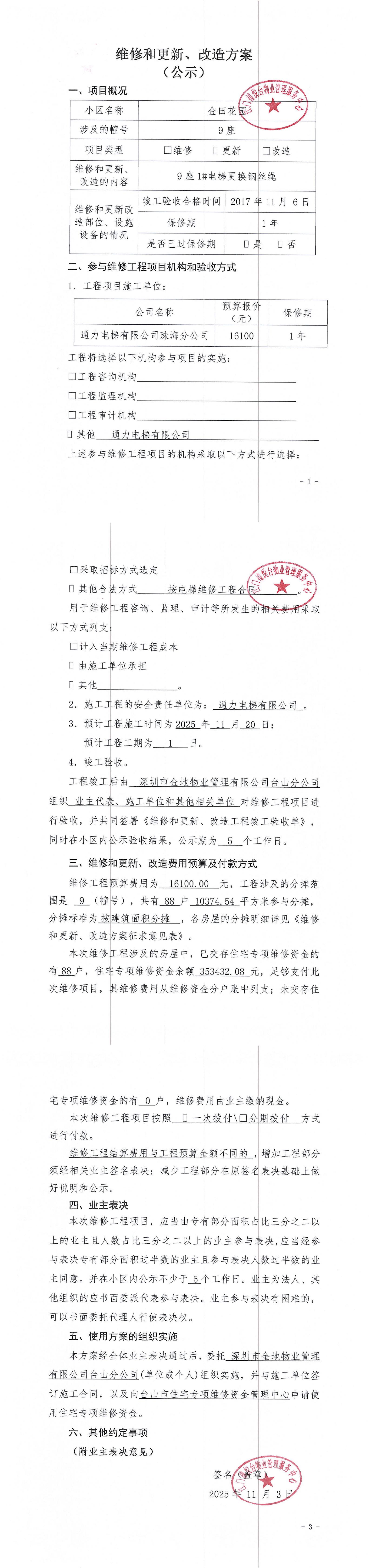 <td VALIGN="top" VALUES="" STYLE="border-width:0" BINDTYPE="0" ROWSPAN="19" COLSPAN="7" DATASOURCE="投票结果" ><font style="font-size:14pt;"><p style="white-space: normal; font-family: 宋体; line-height: 1.75em;">金田花园9座全体业主:</p><p style="white-space: normal; font-family: 宋体; line-height: 1.75em; text-indent: 2em;">本小区关于金田花园9座1#电梯更换钢丝绳使用维修资金投票的投票已表决结束,询异时间从2026年03月12日开始,投票询异公示期间,业主可通过微信查询自己的表决情况或可凭身份证件申请查询自己的表决情况;如公示的业主表决情况与查询的本人表决意见不一致的,可以以书面形式向投票组织机构申诉,投票组织机构予以纠正并重新公示表决结果。异议提出人对投票组织机构的处理仍有异议的,可以向街道办事处(镇人民政府)反映处理,涉及住宅专项维修资金的,可向属地住宅专项维修资金管理中心反映处理。</p><p style="white-space: normal;"><br/></p><p style="white-space: normal; font-family: 宋体; line-height: 1.75em;"><strong>附件:</strong></p><p style="white-space: normal; font-family: 宋体; line-height: 1.75em;"><strong>一、投票范围</strong></p><p style="white-space: normal; font-family: 宋体; line-height: 1.75em; text-indent: 2em;">金田花园9座</p><p style="white-space: normal; font-family: 宋体; line-height: 1.75em; text-indent: 2em;">总人数(专有部分人数之和):88</p><p style="white-space: normal; font-family: 宋体; line-height: 1.75em; text-indent: 2em;"><span style="font-family: 宋体, SimSun;"><span style="font-family: 宋体; text-indent: 32px;"><span style="font-family: 宋体; text-indent: 32px;">总户数:88</span></span></span></p><p style="white-space: normal; font-family: 宋体; line-height: 1.75em; text-indent: 2em;">建筑物总面积(专有部分面积之和):10374.54㎡</p><p style="white-space: normal; font-family: 宋体; line-height: 1.75em;"><strong>二、询异公示起止时间</strong></p><p dir="ltr" style="white-space: normal; font-family: 宋体; line-height: 1.75em; text-indent: 2em;"><span style="text-indent: 36px;">2026年03月12日至2026年03月22日</span></p><p style="white-space: normal; font-family: 宋体; line-height: 1.75em;"><strong>三、投票详细描述</strong></p><p style="white-space: normal; font-family: 宋体; line-height: 1.75em; text-indent: 2em;"><p><span style="font-size: 14px; text-wrap-mode: wrap; background-color: rgb(255, 255, 255); font-family: 宋体, SimSun;">金田花园9座1#电梯</span><span style="font-size: 14px; text-wrap-mode: wrap; font-family: 宋体, SimSun; background-color: rgb(255, 255, 255);">10月29日电梯年审检测时发现</span><span style="font-size: 14px; text-wrap-mode: wrap; background-color: rgb(255, 255, 255); font-family: 宋体, SimSun;">钢丝绳磨损严重,根据台山质监局检查出具的《电梯检验意见通知书》整改要求,更换9座1#电梯钢丝绳,保证电梯安全使用。<br/> <span style="text-wrap-style: initial;">9座1#电梯</span>工<span style="text-wrap-style: initial;">程维修施工合同</span>金额为16100元<span style="background: rgb(255, 255, 0);"></span>。因已过保修期,维修费用由相关业主</span><span style="font-size: 14px; text-wrap-mode: wrap; font-family: 宋体, SimSun; background-color: rgb(255, 255, 255);">按分户分摊,每户约182.95元,详见公示附件。如业主手机不能正常通过微信投票,请联系物业公司进行线下纸质投票,物业电话:0750-5532945。</span></p></p><p style="white-space: normal; font-family: 宋体; line-height: 1.75em;"><strong>四、计票规则</strong></p><p style="white-space: normal; font-family: 宋体; line-height: 1.75em; text-indent: 2em;">表决事项:使用建筑物及其附属设施的维修资金<br /><p style='text-align: left; font-family: 宋体; font-size: 16px; line-height: 1.75em; text-indent: 2em;'>计票规则:弃权票不并入其它项 未表决票不并入其它项</p></p><p style="white-space: normal; font-family: 宋体; line-height: 1.75em;"><strong>五、通过规则</strong></p><p style="white-space: normal; font-family: 宋体; line-height: 1.75em;"><strong><strong style="white-space: normal;"><span style="font-family: 宋体, SimSun;"> 根据《中华人民共和国民法典》第二百七十八条规定:业主共同决定事项,应当由专有部分面积占比三分之二以上的业主且人数占比三分之二以上的业主参与表决。</span></strong></strong></p><p style="white-space: normal; font-family: 宋体; line-height: 1.75em; text-indent: 2em;">表决事项:使用建筑物及其附属设施的维修资金<br /><p style='text-align: left; font-family: 宋体; font-size: 16px; line-height: 1.75em; text-indent: 2em;'>通过规则:双2/3以上参与表决,参与表决双过半同意</p></p><p style="white-space: normal; font-family: 宋体; line-height: 1.75em;"><strong>六、投票结果</strong></p><p style="white-space: normal; font-family: 宋体; line-height: 1.75em; text-indent: 2em;"><div id='resultTable'><table style='table-layout: fixed; font-size:12px; margin-top:10px' width='100%' border='0' cellspacing='0' cellpadding='0'><tr><td height='28' colspan='10' align='center' style='border: 1px solid #666'><strong style='font-size: 14px;'> 使用建筑物及其附属设施的维修资金</strong></td> </tr><tr id='trfirst'><td height='28' colspan='4' style='border-left: 1px solid #666; border-bottom: 1px solid #666'><strong> 申报单位:</strong> 深圳市金地物业管理有限公司台山分公司</td><td colspan='3' style='border-left: 1px solid #666; border-bottom: 1px solid #666'><strong> 联系方式:</strong> </td><td colspan='3' style='border-left: 1px solid #666; border-bottom: 1px solid #666; border-right: 1px solid #666'><strong> 申报日期:</strong> 2025年11月13日 </td></tr><tr> <td height='28' colspa