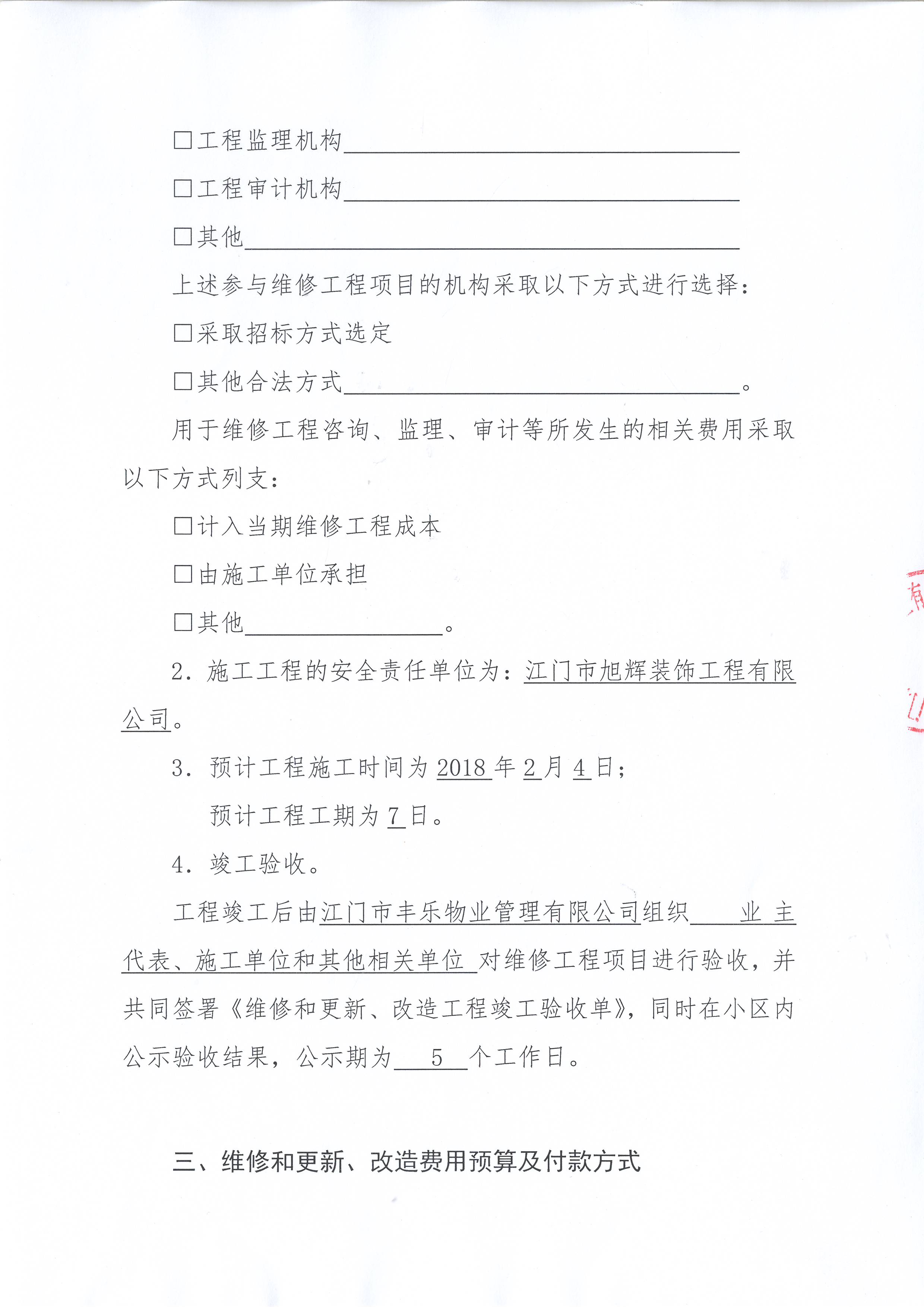 投票结果通知公告时间:从2018年02月19日开始<br/></p><p style="text-align: left; line-height: 1.75em; font-family: 宋体; font-size: 16px;"><strong>三、投票详细描述</strong> </p><p style="text-align: left; line-height: 1.75em; font-family: 宋体; font-size: 16px;"><span style="line-height: 28px; font-family: 宋体;"> </span><p><span style="font-family: "Helvetica Neue", Helvetica, Arial, sans-serif; font-size: 14px; background-color: rgb(255, 255, 255);">本小区叠云轩26幢1楼公共区域墙面瓷砖脱落、地面空鼓龟裂需维修,经检查,已过保修期。</span><br style="font-family: "Helvetica Neue", Helvetica, Arial, sans-serif; font-size: 14px; white-space: normal; background-color: rgb(255, 255, 255);"/><span style="font-family: "Helvetica Neue", Helvetica, Arial, sans-serif; font-size: 14px; background-color: rgb(255, 255, 255);">现需申请使用维修资金对叠云轩26幢1楼公共区域墙面脱落瓷砖、空鼓龟裂的地面进行维修,工程维修预算金额为1900元,项目最终费用以施工合同签订金额为准。维修费用的分摊标准为每户22.35元,详见附件。</span></p></p><p style="text-align: left; line-height: 1.75em; font-family: 宋体; font-size: 16px;"><strong>四、投票结果</strong> </p><p style="text-align: left; line-height: 1.75em; font-family: 宋体; font-size: 16px;"><table style='table-layout: fixed; font-size:12px; margin-top:10px' width='100%' border='0' cellspacing='0' cellpadding='0'><tr><td height='28' colspan='10' align='center' style='border: 1px solid #666'><strong style='font-size: 14px;'> 公共区域墙面瓷砖脱落、地面空鼓龟裂需维修</strong></td> </tr><tr><td height='28' colspan='4' style='border-left: 1px solid #666; border-bottom: 1px solid #666'><strong> 申报单位:</strong> 江门市丰乐物业管理有限公司</td><td colspan='3' style='border-left: 1px solid #666; border-bottom: 1px solid #666'><strong> 联系方式:</strong> 13512344321 </td><td colspan='3' style='border-left: 1px solid #666; border-bottom: 1px solid #666; border-right: 1px solid #666'><strong> 申报日期:</strong> 2018年1月24日 </td></tr><tr> <td height='28' colspan='5' style='border-left: 1px solid #666; border-bottom: 1px solid #666'><strong> 总人数(专有部分人数之和):</strong>85人 </td><td colspan='5' style='border-left: 1px solid #666; border-bottom: 1px solid #666; border-right: 1px solid #666'><strong> 建筑物总面积(专有部分面积之和):</strong>10460.53㎡ </td> </tr><tr><td height='28' colspan='10' bgcolor='#F3F3F3' style='border-left: 1px solid #666;border-bottom: 1px solid #666;border-right: 1px solid #666'><strong> 参与人数及面积统计</strong></td></tr><tr><td height='28' colspan='5' style='border-left: 1px solid #666; border-bottom: 1px solid #666'><strong> 参与表决专有部分人数之和:</strong>31人</td><td colspan='5' style='border-left: 1px solid #666; border-bottom: 1px solid #666; border-right: 1px solid #666'><strong> 参与表决占有表决权总人数比例:</strong>36.47%</td></tr><tr><td height='28' colspan='5' style='border-left: 1px solid #666; border-bottom: 1px solid #666'><strong> 参与表决专有部分面积之和:</strong>3830.45㎡</td><td colspan='5' style='border-left: 1px solid #666; border-bottom: 1px solid #666; border-right: 1px solid #666'><strong> 参与表决占有表决权总面积比例:</strong>36.62%</td></tr><tr><td height='28' colspan='10' bgcolor='#F3F3F3' style='border-left: 1px solid #666; border-bottom: 1px solid #666;border-right: 1px solid #666'> <strong> 未参与人数及面积统计</strong></td> </tr><tr><td height='28' colspan='5' style='border-left: 1px solid #666; border-bottom: 1px solid #666'><strong> 未参与表决专有部分人数之和:</strong>54人 </td><td colspan='5' style='border-left: 1px solid #666; border-bottom: 1px solid #666; border-right: 1px solid #666'><strong> 未参与表决占有表决权总人数比例:</strong>63.53%</td></tr><tr><td height='28' colspan='5' style='border-left: 1px solid #666; border-bottom: 1px solid #666'><strong> 未参与表决专有部分面积之和:</strong>6630.08㎡</td><td colspan='5' style='border-left: 1px solid #666; border-bottom: 1px solid #666; border-right: 1px solid #666'><strong> 未参与表决占有表决权总面积比例:</strong>63.38% </td> </tr><tr><td width='6%' rowspan='2' align='center' bgcolor='#F3F3F3' style='border-left: 1px solid #666; border-bottom: 1px solid #666'><strong>序号</strong></td><td width='11%' rowspan='2' align='center' bgcolor='#F3F3F3' style='border-left: 1px solid #666; border-bottom: 1px solid #666'><strong>候选项</strong></td><td height='28' colspan='2' align='center' bgcolor='#F3F3F3' style='border-left: 1px solid #666; border-bottom: 1px solid #666'><strong>表决人数情况</strong> </td><td colspan='2' align='center' bgcolor='#F3F3F3' style='border-left: 1px solid #666; border-bottom: 1px solid #666'><strong>表决面积情况</strong></td><td colspan='4' align='center' bgcolor='#F3F3F3' style='border-left: 1px solid #666; border-bottom: 1px solid #666; border-right: 1px solid #666'><strong>表决方式</strong></td></tr><tr><td width='11%' height='28' align='center' bgcolor='#F3F3F3' style='border-left: 1px solid #666;border-bottom: 1px solid #666'><strong>参与表决<br />专有部分<br />人数之和</strong> </td><td width='11%' align='center' bgcolor='#F3F3F3' style='border-left: 1px solid #666; border-bottom: 1px solid #666'><strong>占有<br /> 表决权<br /> 总人数比例<br /> </strong></td><td width='11%' align='center' bgcolor='#F3F3F3' style='border-left: 1px solid #666; border-bottom: 1px solid #666'><strong>参与表决<br /> 专有部分<br /> 面积之和<br /> </strong></td><td width='13%' align='center' bgcolor='#F3F3F3' style='border-left: 1px solid #666; border-bottom: 1px solid #666'><strong>占有<br />表决权<br />总面积比例</strong></td><td width='9%