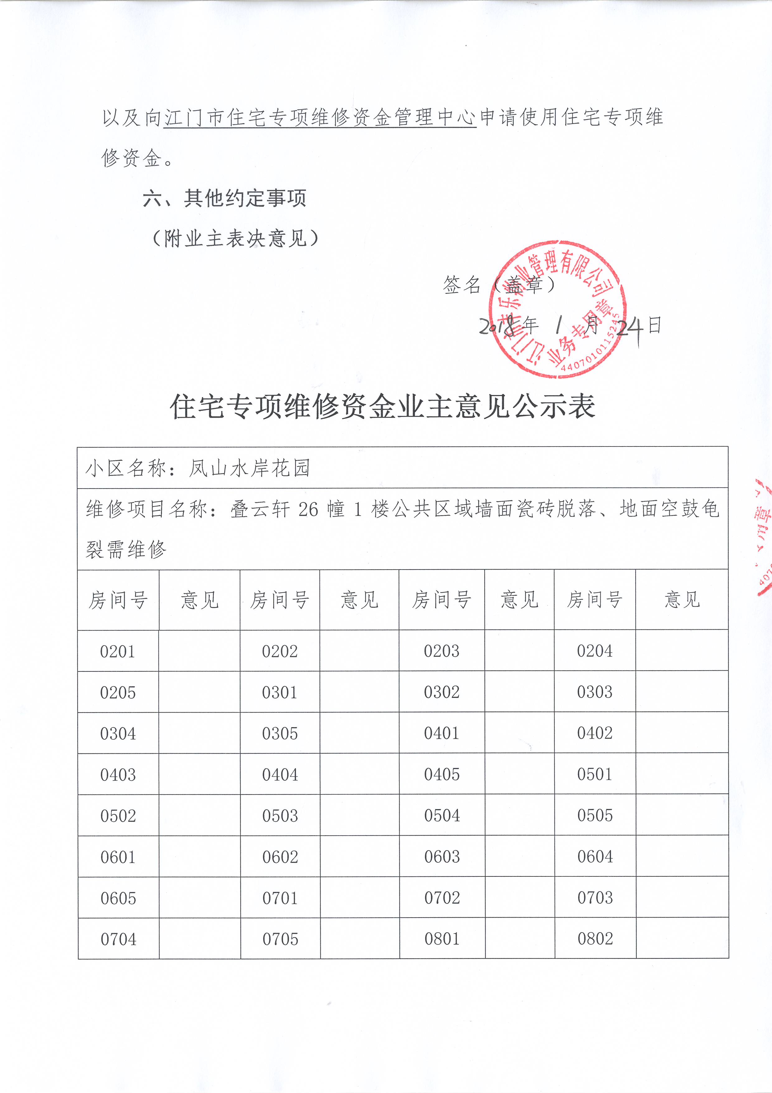 <span style="font-family: 宋体;"> 本小区关于凤山水岸花园叠云轩26幢1楼公共区域墙面瓷砖脱落、地面空鼓龟裂需维修的投票<span style="font-family: 宋体; font-size: 16px;">已表决结束</span>,</span><span style="font-family: 宋体;">询异时间从2018年02月12日开始,投票询异公示期间,业主可进行以下操作:</span></p><p style="text-align: left; line-height: 1.75em; font-family: 宋体; font-size: 16px;"><span style="font-family: 宋体;"></span></p><p style="text-align: left;"><span style="font-family: 宋体;"> </span><span style="font-family: 宋体;"> </span>一、查询表决情况</p><p style="text-align: left;"><span style="font-family: 宋体;"> </span><span style="font-family: 宋体;"> </span>业主可通过微信服务平台、或江门市物业管理公众服务平台(网址:wygl.jmzjj.gov.cn/)登录查询自己的表决情况。如需到管理部门查询的,投票事项属于“决定维修资金使用、管理、续筹方案”的,业主可凭身份证件到所属维修资金管理中心查询;非涉及维修资金的投票事项,业主可凭身份证件到所属区住建部门、或街道办事处(镇人民政府)、居(村)民委员会申请查询自己的表决情况。</p><p style="text-align: left;"><span style="font-family: 宋体;"> </span><span style="font-family: 宋体;"> </span>二、申诉变更投票表决意见</p><p style="text-align: left;"><span style="font-family: 宋体;"> </span><span style="font-family: 宋体;"> </span>如业主意见与查询到的表决意见不一致的,投票事项属于“决定维修资金使用、管理、续筹方案”的,业主可以书面形式向所属维修资金管理中心申诉;非涉及维修资金的投票事项,业主可以书面形式向所属区住建部门、或街道办事处(镇人民政府)、居(村)民委员会申诉。经核查业主反映情况属实的,予以纠正并重新公示表决结果。</p><p style="text-align: left; line-height: 1.75em; font-family: 宋体; font-size: 16px;"><span style="font-family: sans-serif;"> </span></p><p style="text-align: left; line-height: 1.75em; font-family: 宋体; font-size: 16px;"><strong><span style="font-family: 宋体;">附件:</span></strong></p><p style="text-align: left; line-height: 1.75em; font-family: 宋体; font-size: 16px;"><strong>一、投票范围</strong></p><p style="text-align: left; line-height: 1.75em; font-family: 宋体; font-size: 16px;"> 凤山水岸花园叠云轩26幢<br/>