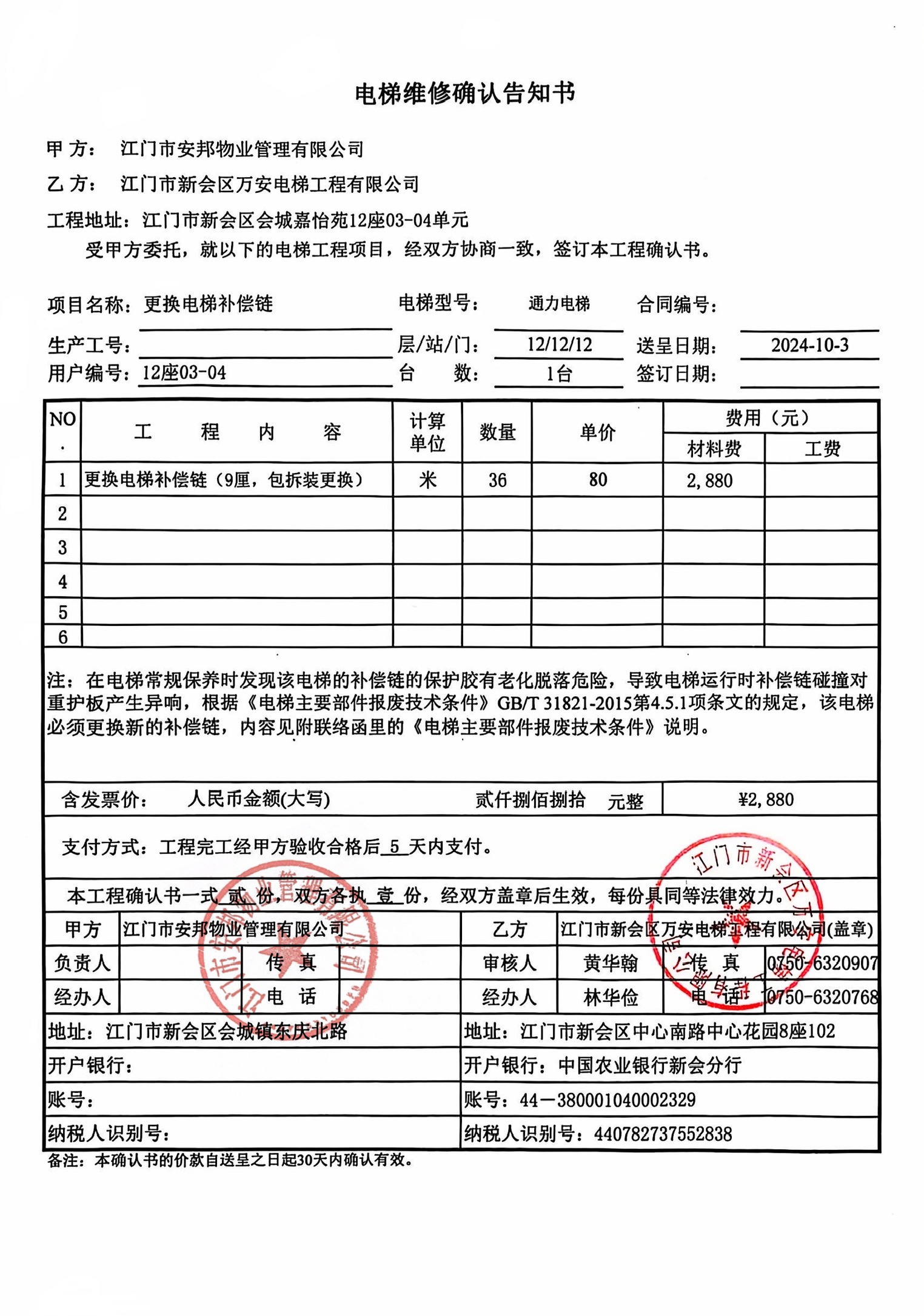 <td VALIGN="top" VALUES="" STYLE="border-width:0" BINDTYPE="0" ROWSPAN="19" COLSPAN="7" DATASOURCE="投票结果" ><font style="font-size:14pt;"><p style="white-space: normal; font-family: 宋体; line-height: 1.75em;">会城嘉怡苑汇总嘉怡苑12座全体业主:</p><p style="white-space: normal; font-family: 宋体; line-height: 1.75em; text-indent: 2em;">本小区关于会城嘉怡苑汇总12座03-04单元更换电梯补偿链使用维修资金的投票的投票已表决结束,询异时间从2024年10月15日开始,投票询异公示期间,业主可通过微信查询自己的表决情况或可凭身份证件申请查询自己的表决情况;如公示的业主表决情况与查询的本人表决意见不一致的,可以以书面形式向投票组织机构申诉,投票组织机构予以纠正并重新公示表决结果。异议提出人对投票组织机构的处理仍有异议的,可以向街道办事处(镇人民政府)反映处理,涉及住宅专项维修资金的,可向属地住宅专项维修资金管理中心反映处理。</p><p style="white-space: normal;"><br/></p><p style="white-space: normal; font-family: 宋体; line-height: 1.75em;"><strong>附件:</strong></p><p style="white-space: normal; font-family: 宋体; line-height: 1.75em;"><strong>一、投票范围</strong></p><p style="white-space: normal; font-family: 宋体; line-height: 1.75em; text-indent: 2em;">会城嘉怡苑汇总嘉怡苑12座</p><p style="white-space: normal; font-family: 宋体; line-height: 1.75em; text-indent: 2em;">总人数(专有部分人数之和):20</p><p style="white-space: normal; font-family: 宋体; line-height: 1.75em; text-indent: 2em;"><span style="font-family: 宋体, SimSun;"><span style="font-family: 宋体; text-indent: 32px;"><span style="font-family: 宋体; text-indent: 32px;">总户数:20</span></span></span></p><p style="white-space: normal; font-family: 宋体; line-height: 1.75em; text-indent: 2em;">建筑物总面积(专有部分面积之和):2239.58㎡</p><p style="white-space: normal; font-family: 宋体; line-height: 1.75em;"><strong>二、询异公示起止时间</strong></p><p dir="ltr" style="white-space: normal; font-family: 宋体; line-height: 1.75em; text-indent: 2em;"><span style="text-indent: 36px;">2024年10月15日至2024年10月21日</span></p><p style="white-space: normal; font-family: 宋体; line-height: 1.75em;"><strong>三、投票详细描述</strong></p><p style="white-space: normal; font-family: 宋体; line-height: 1.75em; text-indent: 2em;"><p>本小区12座03-04单元的电梯出现故障,经检查,是由于电梯补偿链的问题,已过保修期。现需申请使用维修资金更换12座03-04单元电梯补偿链,工程维修预算金额为2880.00元,项目最终费用以施工合同签订金额为准。维修费用的分摊标准为按分户分摊144.00元/户,详见公示附件。如业主手机不能正常通过微信投票,请联系物业公司进行线下纸质投票,物业电话:13923073998。 </p></p><p style="white-space: normal; font-family: 宋体; line-height: 1.75em;"><strong>四、计票规则</strong></p><p style="white-space: normal; font-family: 宋体; line-height: 1.75em; text-indent: 2em;">表决事项:使用建筑物及其附属设施的维修资金<br /><p style='text-align: left; font-family: 宋体; font-size: 16px; line-height: 1.75em; text-indent: 2em;'>计票规则:弃权票不并入其它项 未表决票不并入其它项</p></p><p style="white-space: normal; font-family: 宋体; line-height: 1.75em;"><strong>五、通过规则</strong></p><p style="white-space: normal; font-family: 宋体; line-height: 1.75em;"><strong><strong style="white-space: normal;"><span style="font-family: 宋体, SimSun;"> 根据《中华人民共和国民法典》第二百七十八条规定:业主共同决定事项,应当由专有部分面积占比三分之二以上的业主且人数占比三分之二以上的业主参与表决。</span></strong></strong></p><p style="white-space: normal; font-family: 宋体; line-height: 1.75em; text-indent: 2em;">表决事项:使用建筑物及其附属设施的维修资金<br /><p style='text-align: left; font-family: 宋体; font-size: 16px; line-height: 1.75em; text-indent: 2em;'>通过规则:双2/3以上参与表决,参与表决双过半同意</p></p><p style="white-space: normal; font-family: 宋体; line-height: 1.75em;"><strong>六、投票结果</strong></p><p style="white-space: normal; font-family: 宋体; line-height: 1.75em; text-indent: 2em;"><div id='resultTable'><table style='table-layout: fixed; font-size:12px; margin-top:10px' width='100%' border='0' cellspacing='0' cellpadding='0'><tr><td height='28' colspan='10' align='center' style='border: 1px solid #666'><strong style='font-size: 14px;'> 使用建筑物及其附属设施的维修资金</strong></td> </tr><tr id='trfirst'><td height='28' colspan='4' style='border-left: 1px solid #666; border-bottom: 1px solid #666'><strong> 申报单位:</strong> 江门市安邦物业管理有限公司</td><td colspan='3' style='border-left: 1px solid #666; border-bottom: 1px solid #666'><strong> 联系方式:</strong> 13923073998 </td><td colspan='3' style='border-left: 1px solid #666; border-bottom: 1px solid #666; border-right: 1px solid #666'><strong> 申报日期:</strong> 2024年10月9日 </td></tr><tr> <td height='28' colspan='5' style='border-left: 1px solid #666; border-bottom: 1px solid #666'><strong> 总人数(专有部分人数之和):</strong>20人 </td><td colspan='5' style='border-left: 1px solid #666; border-bottom: 1px solid #666; border-right: 1px solid #666'><strong> 建筑物总面积(专有部分面积之和):</strong>2239.58㎡ </td> </tr><tr><td height='28' colspan='10' bgcolor='#F3F3F3' style='border-left: 1px solid #666;border-bottom: 1px solid #666;border-right: 1px solid #666'><strong> 参与人数及面积统计</strong></td></tr><tr><td height='28' colspan='5' style='border-left: 1px solid #666; border-bottom: 1px solid #66