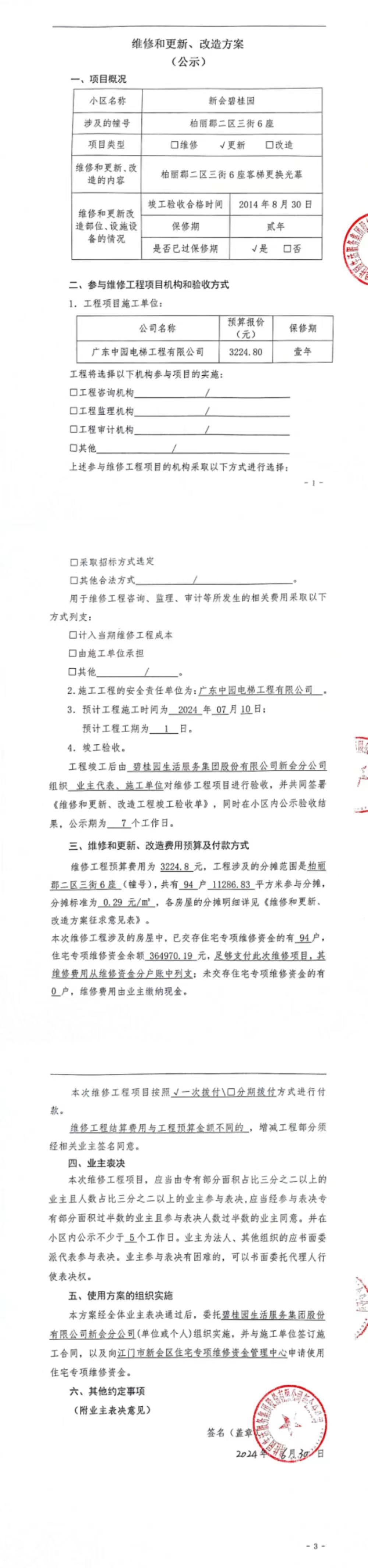 <td VALIGN="top" VALUES="" STYLE="border-width:0" BINDTYPE="0" ROWSPAN="17" COLSPAN="7" DATASOURCE="投票结果" ><font style=" font-family:方正小标宋简体;font-size:14pt;"><p style="line-height: 1.75em;"><span style="font-family: 宋体, SimSun;">各位尊敬的业主:</span><br/></p><p style="text-indent: 2em; line-height: 1.75em;"><span style="font-family: 宋体, SimSun;">根据法律法规的规定,本小区业主利用“江门市物业事项表决管理系统”已对本小区公共事务决策事项进行了表决,在经过7日的询异公示期后,未收到业主有效的异议。现将投票结果公告,并就产生的法律效力说明如下:</span></p><p style="line-height: 1.75em; text-indent: 0em;"><strong style="text-indent: 2em;"><span style="font-family: 宋体, SimSun;">一、投票范围</span></strong></p><p style="text-indent: 2em; line-height: 1.75em;"><span style="font-family: 宋体, SimSun;">新会碧桂园柏丽郡二区三街6座</span></p><p style="text-indent: 2em; line-height: 1.75em;"><span style="font-family: 宋体, SimSun;">总人数(专有部分人数之和):92</span></p><p style="text-indent: 2em; line-height: 1.75em;"><span style="font-family: 宋体, SimSun;"><span style="font-family: 宋体, SimSun; text-indent: 32px;"><span style="font-family: 宋体; text-indent: 32px;"><span style="font-family: 宋体; text-indent: 32px;">总户数:94</span></span></span></span></p><p style="text-indent: 2em; line-height: 1.75em;"><span style="font-family: 宋体, SimSun;">建筑物总面积(专有部分面积之和):11286.83㎡</span></p><p style="line-height: 1.75em;"><strong><span style="font-family: 宋体, SimSun;">二、投票结果公告时间</span></strong></p><p style="text-indent: 2em; line-height: 1.75em;"><span style="font-family: 宋体, SimSun;"><span style="font-family: 宋体, SimSun; text-indent: 32px;">从2024年08月08日开始</span></span></p><p style="line-height: 1.75em;"><strong><span style="font-family: 宋体, SimSun;">三、计票规则</span></strong></p><p style="text-indent: 2em; line-height: 1.75em;"><span style="font-family: 宋体, SimSun;">表决事项:使用建筑物及其附属设施的维修资金<br /><p style='font-family: 宋体, SimSun;line-height: 1.75em; text-indent: 2em;'>计票规则:弃权票不并入其它项&nbsp;&nbsp;&nbsp;&nbsp;未表决票不并入其它项</p></span></p><p style="line-height: 1.75em;"><strong><span style="font-family: 宋体, SimSun;">四、通过规则</span></strong></p><p style="line-height: 1.75em;"><strong><span style="font-family: 宋体, SimSun;">&nbsp; 根据《中华人民共和国民法典》第二百七十八条规定:业主共同决定事项,应当由专有部分面积占比三分之二以上的业主且人数占比三分之二以上的业主参与表决。</span></strong></p><p style="text-indent: 2em; line-height: 1.75em;"><span style="font-family: 宋体, SimSun;"><span style="font-family: 宋体, SimSun; text-indent: 32px;">表决事项:使用建筑物及其附属设施的维修资金<br /><p style='font-family: 宋体, SimSun;line-height: 1.75em; text-indent: 2em;'>通过规则:双2/3以上参与表决,参与表决双过半同意</p></span></span></p><p style="line-height: 1.75em;"><strong><span style="font-family: 宋体, SimSun;">五、投票结果</span></strong></p><p style="line-height: 1.75em; text-indent: 2em;"><span style="font-family: 宋体, SimSun; text-indent: 2em;"><div id='resultTable'><table style='table-layout: fixed; font-size:12px; margin-top:10px' width='100%' border='0' cellspacing='0' cellpadding='0'><tr><td height='28' colspan='10' align='center' style='border: 1px solid #666'><strong style='font-size: 14px;'> 使用建筑物及其附属设施的维修资金</strong></td> </tr><tr id='trfirst'><td height='28' colspan='4' style='border-left: 1px solid #666; border-bottom: 1px solid #666'><strong>&nbsp;申报单位:</strong> 碧桂园生活服务集团股份有限公司新会分公司</td><td colspan='3' style='border-left: 1px solid #666; border-bottom: 1px solid #666'><strong>&nbsp;联系方式:</strong> </td><td colspan='3' style='border-left: 1px solid #666; border-bottom: 1px solid #666; border-right: 1px solid #666'><strong>&nbsp;申报日期:</strong> 2024年7月1日 </td></tr><tr> <td height='28' colspan='5' style='border-left: 1px solid #666; border-bottom: 1px solid #666'><strong>&nbsp;总人数(专有部分人数之和):</strong>92人 </td><td colspan='5' style='border-left: 1px solid #666; border-bottom: 1px solid #666; border-right: 1px solid #666'><strong>&nbsp;建筑物总面积(专有部分面积之和):</strong>11286.83㎡ </td> </tr><tr><td height='28' colspan='10' bgcolor='#F3F3F3' style='border-left: 1px solid #666;border-bottom: 1px solid #666;border-right: 1px solid #666'><strong>&nbsp;参与表决人数及面积统计</strong></td></tr><tr><td height='28' colspan='5' style='border-left: 1px solid #666; border-bottom: 1px solid #666'><strong>&nbsp;参与表决人数:</strong>1人</td><td colspan='5' style='border-left: 1px solid #666; border-bottom: 1px solid #666; border-right: 1px solid #666'><strong>&nbsp;参与表决人数占总人数比例:</strong>1.09%</td></tr><tr><td height='28' colspan='5' style='border-left: 1px solid #666; border-bottom: 1px solid #666'><strong>&nbsp;参与表决面积:</strong>104.90㎡</td><td colspan='5' style='border-left: 1px solid #666; border-bottom: 1px solid #666; border-right: 1px solid #666'><strong>&nbsp;参与表决面积占总面积比例:</strong>0.93%</td></tr><tr><td height='28' colspan='10' bgcolor='#F3F3F3' style='border-left: 1px solid #666; border-bottom: 1px solid #666;border-right: 1px solid #666'> <strong>&nbsp;参与表决同意人数及面积统计</strong></td> </tr><tr><td height='28' colspan='5' style='border-left: 1px solid #666; border-bottom: 1px solid #666'><strong>&nbsp;参与表决同意人数:</strong>0人 </td><td colspan='5' style='border-left: 1px solid #666; bo