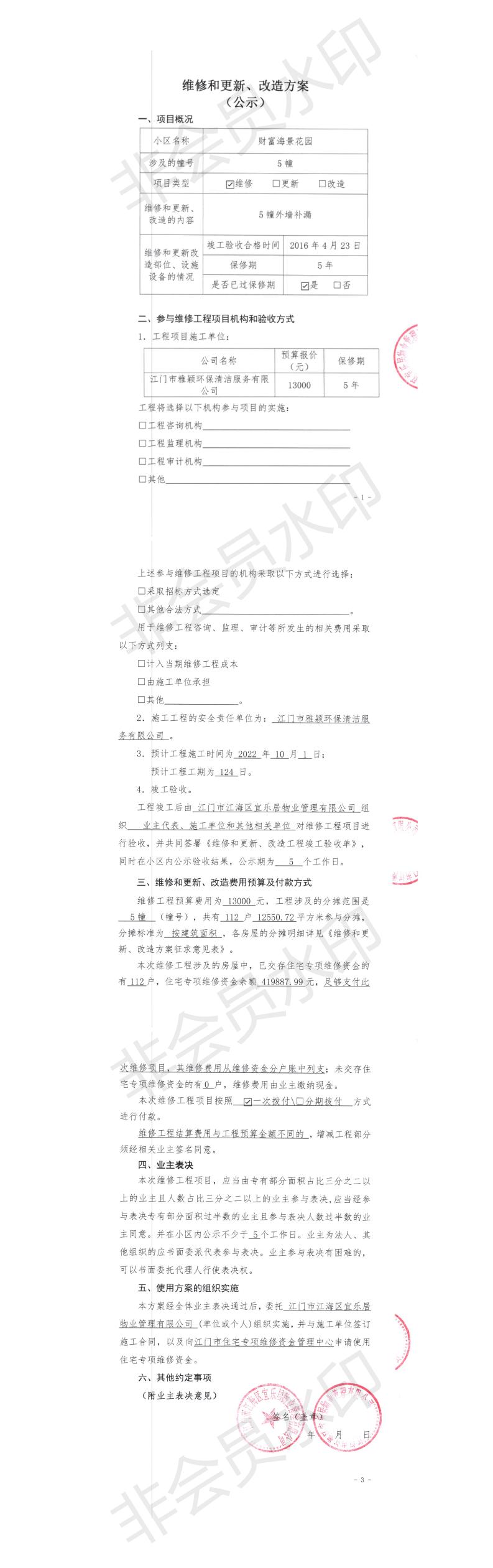 <td VALIGN="top" VALUES="" STYLE="border-width:0" BINDTYPE="0" ROWSPAN="17" COLSPAN="7" DATASOURCE="投票结果" ><font style=" font-family:方正小标宋简体;font-size:14pt;"><p style="line-height: 1.75em;"><span style="font-family: 宋体, SimSun;">各位尊敬的业主:</span><br/></p><p style="text-indent: 2em; line-height: 1.75em;"><span style="font-family: 宋体, SimSun;">根据法律法规的规定,本小区业主利用“物业公共事务决策系统”已对本小区公共事务决策事项进行了表决,在经过7日的询异公示期后,未收到业主有效的异议。现将投票结果公告,并就产生的法律效力说明如下:</span></p><p style="line-height: 1.75em; text-indent: 0em;"><strong style="text-indent: 2em;"><span style="font-family: 宋体, SimSun;">一、投票范围</span></strong></p><p style="text-indent: 2em; line-height: 1.75em;"><span style="font-family: 宋体, SimSun;">江海区外海财富海景花园江海区外海财富海景花园5幢</span></p><p style="text-indent: 2em; line-height: 1.75em;"><span style="font-family: 宋体, SimSun;">总人数(专有部分人数之和):110</span></p><p style="text-indent: 2em; line-height: 1.75em;"><span style="font-family: 宋体, SimSun;"><span style="font-family: 宋体, SimSun; text-indent: 32px;">总户数:{TotalHouseCount}</span></span></p><p style="text-indent: 2em; line-height: 1.75em;"><span style="font-family: 宋体, SimSun;">建筑物总面积(专有部分面积之和):12550.72㎡</span></p><p style="line-height: 1.75em;"><strong><span style="font-family: 宋体, SimSun;">二、投票起止时间</span></strong></p><p style="text-indent: 2em; line-height: 1.75em;"><span style="font-family: 宋体, SimSun;">投票表决时间:从2022年09月19日到2022年10月09日止</span></p><p style="text-indent: 2em; line-height: 1.75em;"><span style="font-family: 宋体, SimSun;">投票询异公示时间:从2022年10月10日开始</span></p><p style="text-indent: 2em; line-height: 1.75em;"><span style="font-family: 宋体, SimSun;">投票结果通知公告时间:从2022年10月17日开始</span></p><p style="line-height: 1.75em;"><strong><span style="font-family: 宋体, SimSun;">三、计票规则</span></strong></p><p style="text-indent: 2em; line-height: 1.75em;"><span style="font-family: 宋体, SimSun;">表决事项:使用建筑物及其附属设施的维修资金<br /><p style='font-family: 宋体, SimSun;line-height: 1.75em; text-indent: 2em;'>计票规则:弃权票不并入其它项&nbsp;&nbsp;&nbsp;&nbsp;未表决票不并入其它项</p></span></p><p style="line-height: 1.75em;"><strong><span style="font-family: 宋体, SimSun;">四、通过规则</span></strong></p><p style="text-indent: 2em; line-height: 1.75em;"><span style="font-family: 宋体, SimSun;"><span style="font-family: 宋体, SimSun; text-indent: 32px;">表决事项:使用建筑物及其附属设施的维修资金<br /><p style='font-family: 宋体, SimSun;line-height: 1.75em; text-indent: 2em;'>通过规则:参与表决专有部分面积过半数的业主且参与表决人数过半数的业主同意</p></span></span></p><p style="line-height: 1.75em;"><strong><span style="font-family: 宋体, SimSun;">五、投票结果</span></strong></p><p style="line-height: 1.75em; text-indent: 2em;"><span style="font-family: 宋体, SimSun; text-indent: 2em;"><div id='resultTable'><table style='table-layout: fixed; font-size:12px; margin-top:10px' width='100%' border='0' cellspacing='0' cellpadding='0'><tr><td height='28' colspan='10' align='center' style='border: 1px solid #666'><strong style='font-size: 14px;'> 使用建筑物及其附属设施的维修资金</strong></td> </tr><tr id='trfirst'><td height='28' colspan='4' style='border-left: 1px solid #666; border-bottom: 1px solid #666'><strong>&nbsp;申报单位:</strong> 江门市江海区宜乐居物业管理有限公司</td><td colspan='3' style='border-left: 1px solid #666; border-bottom: 1px solid #666'><strong>&nbsp;联系方式:</strong> </td><td colspan='3' style='border-left: 1px solid #666; border-bottom: 1px solid #666; border-right: 1px solid #666'><strong>&nbsp;申报日期:</strong> 2022年9月15日 </td></tr><tr> <td height='28' colspan='5' style='border-left: 1px solid #666; border-bottom: 1px solid #666'><strong>&nbsp;总人数(专有部分人数之和):</strong>110人 </td><td colspan='5' style='border-left: 1px solid #666; border-bottom: 1px solid #666; border-right: 1px solid #666'><strong>&nbsp;建筑物总面积(专有部分面积之和):</strong>12550.72㎡ </td> </tr><tr><td height='28' colspan='10' style='border: 1px solid #666'><strong>&nbsp;该事项表决是否通过:未通过</strong></td></tr><tr><td height='28' colspan='10' bgcolor='#F3F3F3' style='border-left: 1px solid #666;border-bottom: 1px solid #666;border-right: 1px solid #666'><strong>&nbsp;参与人数及面积统计</strong></td></tr><tr><td height='28' colspan='5' style='border-left: 1px solid #666; border-bottom: 1px solid #666'><strong>&nbsp;参与表决专有部分人数之和:</strong>21人</td><td colspan='5' style='border-left: 1px solid #666; border-bottom: 1px solid #666; border-right: 1px solid #666'><strong>&nbsp;参与表决占有表决权总人数比例:</strong>19.09%</td></tr><tr><td height='28' colspan='5' style='border-left: 1px solid #666; border-bottom: 1px solid #666'><strong>&nbsp;参与表决专有部分面积之和:</strong>2511.54㎡</td><td colspan='5' style='border-left: 1px solid #666; border-bottom: 1px solid #666; border-right: 1px solid #666'><strong>&nbsp;参与表决占有表决权总面积比例:</strong>20.01%</td></tr><tr><td height='28' colspan='10' bgcolor='#F3F3F3' style='border-left: 1px solid #666; border-bottom: 1px solid #666;border-right: 1px solid #666'> <strong>&nbsp;未参与人数及面积统计</strong></td> </tr><tr><td height='28' colspan='5' style='border-left: 1px solid #666; border-bottom: 1px solid #666'><strong>&nbsp;未参与表决专有