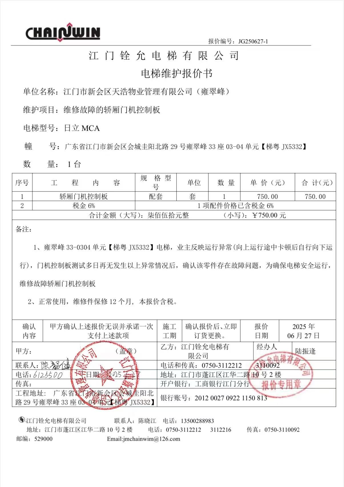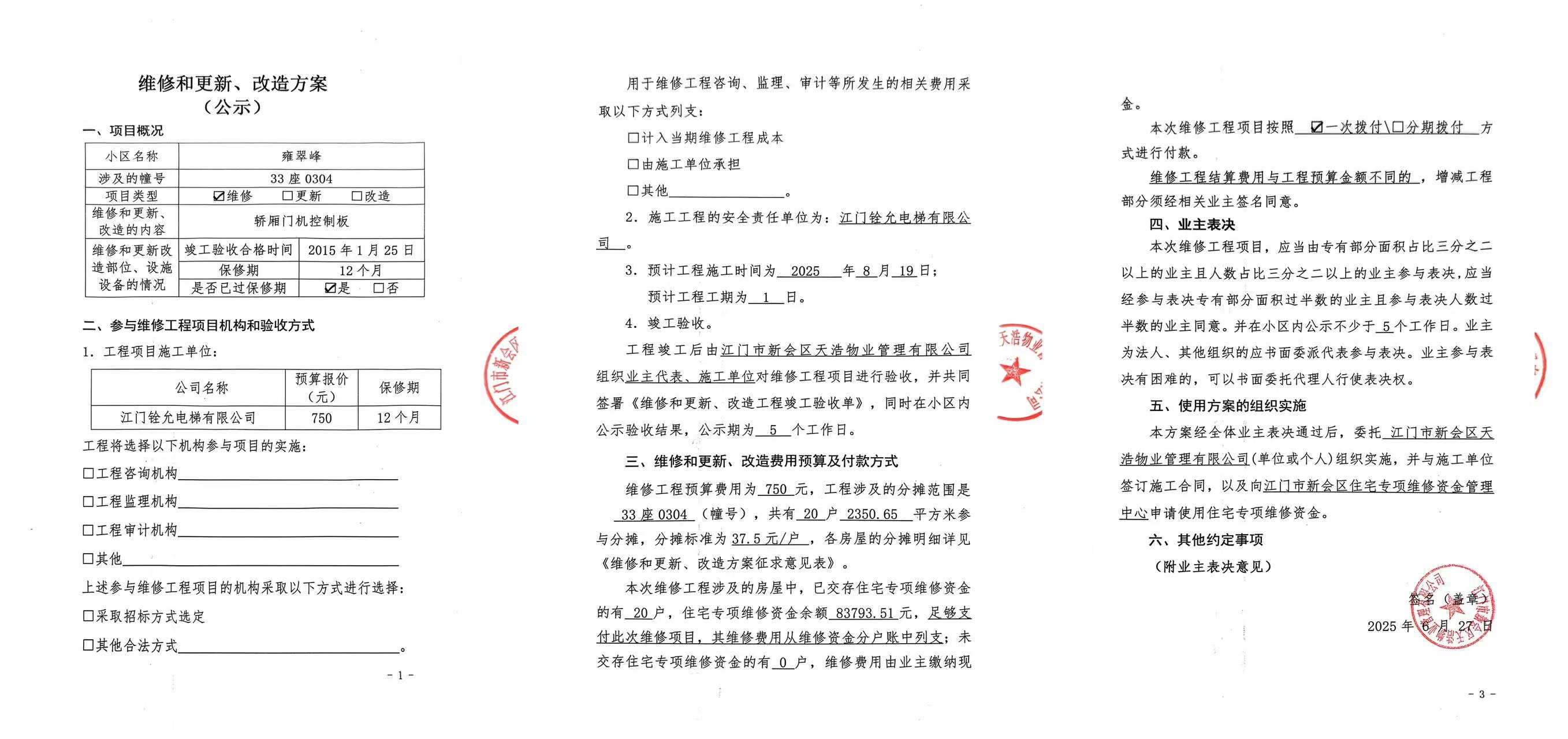 <td VALIGN="top" VALUES="" STYLE="border-width:0" BINDTYPE="0" ROWSPAN="19" COLSPAN="7" DATASOURCE="投票结果" ><font style="font-size:14pt;"><p style="white-space: normal; font-family: 宋体; line-height: 1.75em;">雍翠峰雍翠峰33座全体业主:</p><p style="white-space: normal; font-family: 宋体; line-height: 1.75em; text-indent: 2em;">本小区关于雍翠峰33座0304单元电梯【梯粤JX5332】维修轿厢门机控制板的使用维修资金的投票的投票已表决结束,询异时间从2025年07月03日开始,投票询异公示期间,业主可通过微信查询自己的表决情况或可凭身份证件申请查询自己的表决情况;如公示的业主表决情况与查询的本人表决意见不一致的,可以以书面形式向投票组织机构申诉,投票组织机构予以纠正并重新公示表决结果。异议提出人对投票组织机构的处理仍有异议的,可以向街道办事处(镇人民政府)反映处理,涉及住宅专项维修资金的,可向属地住宅专项维修资金管理中心反映处理。</p><p style="white-space: normal;"><br/></p><p style="white-space: normal; font-family: 宋体; line-height: 1.75em;"><strong>附件:</strong></p><p style="white-space: normal; font-family: 宋体; line-height: 1.75em;"><strong>一、投票范围</strong></p><p style="white-space: normal; font-family: 宋体; line-height: 1.75em; text-indent: 2em;">雍翠峰雍翠峰33座</p><p style="white-space: normal; font-family: 宋体; line-height: 1.75em; text-indent: 2em;">总人数(专有部分人数之和):20</p><p style="white-space: normal; font-family: 宋体; line-height: 1.75em; text-indent: 2em;"><span style="font-family: 宋体, SimSun;"><span style="font-family: 宋体; text-indent: 32px;"><span style="font-family: 宋体; text-indent: 32px;">总户数:20</span></span></span></p><p style="white-space: normal; font-family: 宋体; line-height: 1.75em; text-indent: 2em;">建筑物总面积(专有部分面积之和):2350.65㎡</p><p style="white-space: normal; font-family: 宋体; line-height: 1.75em;"><strong>二、询异公示起止时间</strong></p><p dir="ltr" style="white-space: normal; font-family: 宋体; line-height: 1.75em; text-indent: 2em;"><span style="text-indent: 36px;">2025年07月03日至2025年07月13日</span></p><p style="white-space: normal; font-family: 宋体; line-height: 1.75em;"><strong>三、投票详细描述</strong></p><p style="white-space: normal; font-family: 宋体; line-height: 1.75em; text-indent: 2em;"><p> 雍翠峰33座0304单元电梯【梯粤JX5332】运行异常,向上运行时会突然停顿,然后自行向下运行,经检查确认为电梯轿厢门机控制板故障,日常使用自然磨损损坏,已过保修期。</p><p> 现需申请使用维修资金对33座0304单元<span style="text-wrap: wrap;">电梯</span>【梯粤JX5332】进行维修,工程维修预算金额为750元,项目最终费用以施工合同签订金额为准。维修费用的分摊标准为按分户分摊,每户分摊37.5元,详见公示附件。如业主不能正常通过微信投票,请联系物业公司进行线下纸质投票,物业电话:0750-6125500</p></p><p style="white-space: normal; font-family: 宋体; line-height: 1.75em;"><strong>四、计票规则</strong></p><p style="white-space: normal; font-family: 宋体; line-height: 1.75em; text-indent: 2em;">表决事项:使用建筑物及其附属设施的维修资金<br /><p style='text-align: left; font-family: 宋体; font-size: 16px; line-height: 1.75em; text-indent: 2em;'>计票规则:弃权票不并入其它项 未表决票不并入其它项</p></p><p style="white-space: normal; font-family: 宋体; line-height: 1.75em;"><strong>五、通过规则</strong></p><p style="white-space: normal; font-family: 宋体; line-height: 1.75em;"><strong><strong style="white-space: normal;"><span style="font-family: 宋体, SimSun;"> 根据《中华人民共和国民法典》第二百七十八条规定:业主共同决定事项,应当由专有部分面积占比三分之二以上的业主且人数占比三分之二以上的业主参与表决。</span></strong></strong></p><p style="white-space: normal; font-family: 宋体; line-height: 1.75em; text-indent: 2em;">表决事项:使用建筑物及其附属设施的维修资金<br /><p style='text-align: left; font-family: 宋体; font-size: 16px; line-height: 1.75em; text-indent: 2em;'>通过规则:双2/3以上参与表决,参与表决双过半同意</p></p><p style="white-space: normal; font-family: 宋体; line-height: 1.75em;"><strong>六、投票结果</strong></p><p style="white-space: normal; font-family: 宋体; line-height: 1.75em; text-indent: 2em;"><div id='resultTable'><table style='table-layout: fixed; font-size:12px; margin-top:10px' width='100%' border='0' cellspacing='0' cellpadding='0'><tr><td height='28' colspan='10' align='center' style='border: 1px solid #666'><strong style='font-size: 14px;'> 使用建筑物及其附属设施的维修资金</strong></td> </tr><tr id='trfirst'><td height='28' colspan='4' style='border-left: 1px solid #666; border-bottom: 1px solid #666'><strong> 申报单位:</strong> 江门市新会区天浩物业管理有限公司</td><td colspan='3' style='border-left: 1px solid #666; border-bottom: 1px solid #666'><strong> 联系方式:</strong> </td><td colspan='3' style='border-left: 1px solid #666; border-bottom: 1px solid #666; border-right: 1px solid #666'><strong> 申报日期:</strong> 2025年6月27日 </td></tr><tr> <td height='28' colspan='5' style='border-left: 1px solid #666; border-bottom: 1px solid #666'><strong> 总人数(专有部分人数之和):</strong>20人 </td><td colspan='5' style='border-left: 1px solid #666; border-bottom: 1px solid #666; border-right: 1px solid #666'><strong> 建筑物总面积(专有部分面积之和):</strong>2350.65㎡ </td> </tr><tr><td height='28' colspan='10' bgcolor='#F3F3F3' style='border-left: 1px solid #666;border-bottom: 1px solid #666;border-right: 1px sol