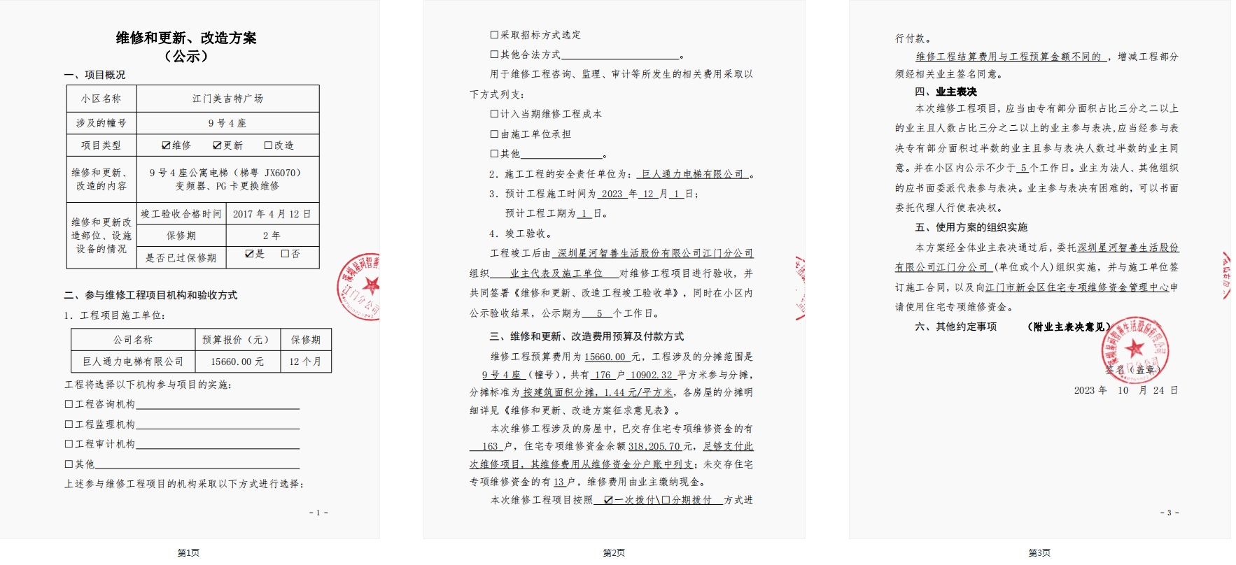 <td VALIGN="top" VALUES="" STYLE="border-width:0" BINDTYPE="0" ROWSPAN="19" COLSPAN="7" DATASOURCE="投票结果" ><font style="font-size:14pt;"><p style="white-space: normal; font-family: 宋体; line-height: 1.75em;">江门美吉特广场会城启超大道9号4座全体业主:</p><p style="white-space: normal; font-family: 宋体; line-height: 1.75em; text-indent: 2em;">本小区关于江门美吉特广场9号4座电梯(梯粤 JX6070)变频器、PG卡更换维修使用维修资金的投票的投票已表决结束,询异时间从2024年01月09日开始,投票询异公示期间,业主可通过微信查询自己的表决情况或可凭身份证件申请查询自己的表决情况;如公示的业主表决情况与查询的本人表决意见不一致的,可以以书面形式向投票组织机构申诉,投票组织机构予以纠正并重新公示表决结果。异议提出人对投票组织机构的处理仍有异议的,可以向街道办事处(镇人民政府)反映处理,涉及住宅专项维修资金的,可向属地住宅专项维修资金管理中心反映处理。</p><p style="white-space: normal;"><br/></p><p style="white-space: normal; font-family: 宋体; line-height: 1.75em;"><strong>附件:</strong></p><p style="white-space: normal; font-family: 宋体; line-height: 1.75em;"><strong>一、投票范围</strong></p><p style="white-space: normal; font-family: 宋体; line-height: 1.75em; text-indent: 2em;">江门美吉特广场会城启超大道9号4座</p><p style="white-space: normal; font-family: 宋体; line-height: 1.75em; text-indent: 2em;">总人数(专有部分人数之和):154</p><p style="white-space: normal; font-family: 宋体; line-height: 1.75em; text-indent: 2em;"><span style="font-family: 宋体, SimSun;"><span style="font-family: 宋体; text-indent: 32px;"><span style="font-family: 宋体; text-indent: 32px;">总户数:176</span></span></span></p><p style="white-space: normal; font-family: 宋体; line-height: 1.75em; text-indent: 2em;">建筑物总面积(专有部分面积之和):10902.32㎡</p><p style="white-space: normal; font-family: 宋体; line-height: 1.75em;"><strong>二、询异公示起止时间</strong></p><p dir="ltr" style="white-space: normal; font-family: 宋体; line-height: 1.75em; text-indent: 2em;"><span style="text-indent: 36px;">2024年01月09日至2024年01月15日</span></p><p style="white-space: normal; font-family: 宋体; line-height: 1.75em;"><strong>三、投票详细描述</strong></p><p style="white-space: normal; font-family: 宋体; line-height: 1.75em; text-indent: 2em;"><p>本小区9号4座电梯(梯粤 JX6070)9月26日故障停梯,经检查,是由于电梯变频器烧坏,已过保修期。现需申请使用维修资金对9号4座电梯(梯粤 JX6070)变频器、PG卡进行更换维修,工程维修预算金额为 15660.00 元,项目最终费用以施工合同签订金额为准。维修费用的分摊标准为按建筑面积分摊,该楼栋一共有176户,总的建筑面积为10902.32平方米,每平方米约分摊1.44元。详见公示附件。物业公司联系电话:18026771124(碧玉竹)</p></p><p style="white-space: normal; font-family: 宋体; line-height: 1.75em;"><strong>四、计票规则</strong></p><p style="white-space: normal; font-family: 宋体; line-height: 1.75em; text-indent: 2em;">表决事项:使用建筑物及其附属设施的维修资金<br /><p style='text-align: left; font-family: 宋体; font-size: 16px; line-height: 1.75em; text-indent: 2em;'>计票规则:弃权票不并入其它项 未表决票不并入其它项</p></p><p style="white-space: normal; font-family: 宋体; line-height: 1.75em;"><strong>五、通过规则</strong></p><p style="white-space: normal; font-family: 宋体; line-height: 1.75em;"><strong><strong style="white-space: normal;"><span style="font-family: 宋体, SimSun;">&nbsp; 根据《中华人民共和国民法典》第二百七十八条规定:业主共同决定事项,应当由专有部分面积占比三分之二以上的业主且人数占比三分之二以上的业主参与表决。</span></strong></strong></p><p style="white-space: normal; font-family: 宋体; line-height: 1.75em; text-indent: 2em;">表决事项:使用建筑物及其附属设施的维修资金<br /><p style='text-align: left; font-family: 宋体; font-size: 16px; line-height: 1.75em; text-indent: 2em;'>通过规则:参与表决专有部分面积过半数的业主且参与表决人数过半数的业主同意</p></p><p style="white-space: normal; font-family: 宋体; line-height: 1.75em;"><strong>六、投票结果</strong></p><p style="white-space: normal; font-family: 宋体; line-height: 1.75em; text-indent: 2em;"><div id='resultTable'><table style='table-layout: fixed; font-size:12px; margin-top:10px' width='100%' border='0' cellspacing='0' cellpadding='0'><tr><td height='28' colspan='10' align='center' style='border: 1px solid #666'><strong style='font-size: 14px;'> 使用建筑物及其附属设施的维修资金</strong></td> </tr><tr id='trfirst'><td height='28' colspan='4' style='border-left: 1px solid #666; border-bottom: 1px solid #666'><strong> 申报单位:</strong> 深圳星河智善生活股份有限公司江门分公司</td><td colspan='3' style='border-left: 1px solid #666; border-bottom: 1px solid #666'><strong> 联系方式:</strong> (0750) 3871336 3829717 </td><td colspan='3' style='border-left: 1px solid #666; border-bottom: 1px solid #666; border-right: 1px solid #666'><strong> 申报日期:</strong> 2023年10月24日 </td></tr><tr> <td height='28' colspan='5' style='border-left: 1px solid #666; border-bottom: 1px solid #666'><strong> 总人数(专有部分人数之和):</strong>154人 </td><td colspan='5' style='border-left: 1px solid #666; border-bottom: 1px solid #666; border-right: 1px solid #666'><strong> 建筑物总面积(专有部分面积之和):</strong>10902.32㎡ </td> </tr><tr><td height='28' colspan='10' bgcolor='#F3F3F3' style='border-left: 1px solid #666;border-bottom: 1px solid #