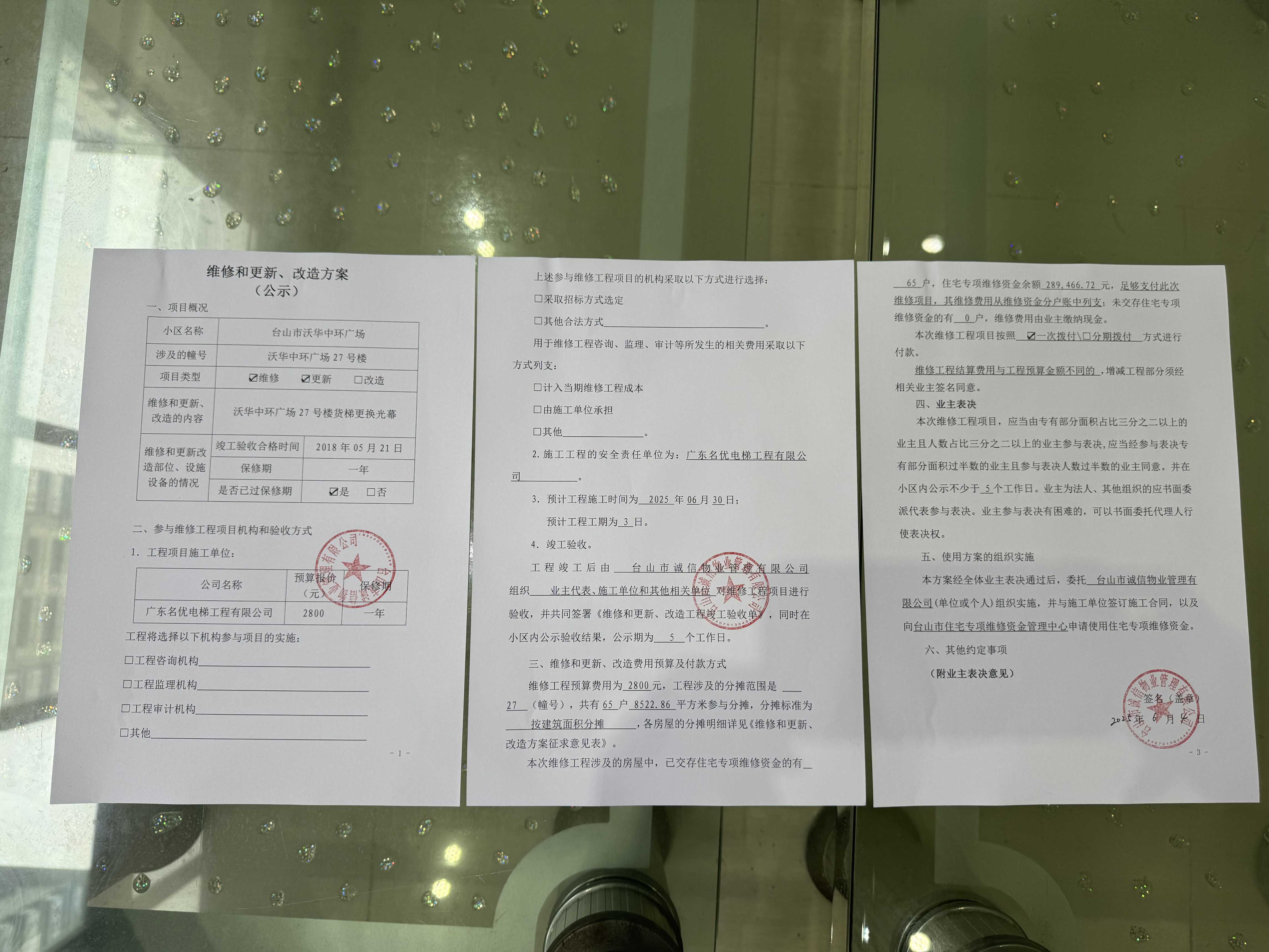 <td VALIGN="top" VALUES="" STYLE="border-width:0" BINDTYPE="0" ROWSPAN="19" COLSPAN="7" DATASOURCE="投票结果" ><font style="font-size:14pt;"><p style="white-space: normal; font-family: 宋体; line-height: 1.75em;">台山沃华中环广场沃华·中环广场27号楼全体业主:</p><p style="white-space: normal; font-family: 宋体; line-height: 1.75em; text-indent: 2em;">本小区关于沃华中环广场27号楼货梯更换光幕使用维修资金的投票的投票已表决结束,询异时间从2025年07月03日开始,投票询异公示期间,业主可通过微信查询自己的表决情况或可凭身份证件申请查询自己的表决情况;如公示的业主表决情况与查询的本人表决意见不一致的,可以以书面形式向投票组织机构申诉,投票组织机构予以纠正并重新公示表决结果。异议提出人对投票组织机构的处理仍有异议的,可以向街道办事处(镇人民政府)反映处理,涉及住宅专项维修资金的,可向属地住宅专项维修资金管理中心反映处理。</p><p style="white-space: normal;"><br/></p><p style="white-space: normal; font-family: 宋体; line-height: 1.75em;"><strong>附件:</strong></p><p style="white-space: normal; font-family: 宋体; line-height: 1.75em;"><strong>一、投票范围</strong></p><p style="white-space: normal; font-family: 宋体; line-height: 1.75em; text-indent: 2em;">台山沃华中环广场沃华·中环广场27号楼</p><p style="white-space: normal; font-family: 宋体; line-height: 1.75em; text-indent: 2em;">总人数(专有部分人数之和):65</p><p style="white-space: normal; font-family: 宋体; line-height: 1.75em; text-indent: 2em;"><span style="font-family: 宋体, SimSun;"><span style="font-family: 宋体; text-indent: 32px;"><span style="font-family: 宋体; text-indent: 32px;">总户数:65</span></span></span></p><p style="white-space: normal; font-family: 宋体; line-height: 1.75em; text-indent: 2em;">建筑物总面积(专有部分面积之和):8522.86㎡</p><p style="white-space: normal; font-family: 宋体; line-height: 1.75em;"><strong>二、询异公示起止时间</strong></p><p dir="ltr" style="white-space: normal; font-family: 宋体; line-height: 1.75em; text-indent: 2em;"><span style="text-indent: 36px;">2025年07月03日至2025年07月13日</span></p><p style="white-space: normal; font-family: 宋体; line-height: 1.75em;"><strong>三、投票详细描述</strong></p><p style="white-space: normal; font-family: 宋体; line-height: 1.75em; text-indent: 2em;"><p> 小区27号楼货梯故障,关门没到一半自动开门,经排查,娇顶板和光幕线没有损坏,光幕损坏,导致在关门过程中光幕失效重复开关门,需要更换。 </p><p> 现对27号楼货梯进行更换维修,工程维修预算金额为2800元,项目最终费用以施工合同签订金额为准。因已过保修期,维修费用由相关业主按建筑面积分摊,每平方约0.33元,详见公示附件。如业主手机不能正常通过微信投票,请联系物业公司进行线下纸质投票,物业电话:0750-5555839、5555819。</p></p><p style="white-space: normal; font-family: 宋体; line-height: 1.75em;"><strong>四、计票规则</strong></p><p style="white-space: normal; font-family: 宋体; line-height: 1.75em; text-indent: 2em;">表决事项:使用建筑物及其附属设施的维修资金<br /><p style='text-align: left; font-family: 宋体; font-size: 16px; line-height: 1.75em; text-indent: 2em;'>计票规则:弃权票不并入其它项 未表决票不并入其它项</p></p><p style="white-space: normal; font-family: 宋体; line-height: 1.75em;"><strong>五、通过规则</strong></p><p style="white-space: normal; font-family: 宋体; line-height: 1.75em;"><strong><strong style="white-space: normal;"><span style="font-family: 宋体, SimSun;"> 根据《中华人民共和国民法典》第二百七十八条规定:业主共同决定事项,应当由专有部分面积占比三分之二以上的业主且人数占比三分之二以上的业主参与表决。</span></strong></strong></p><p style="white-space: normal; font-family: 宋体; line-height: 1.75em; text-indent: 2em;">表决事项:使用建筑物及其附属设施的维修资金<br /><p style='text-align: left; font-family: 宋体; font-size: 16px; line-height: 1.75em; text-indent: 2em;'>通过规则:双2/3以上参与表决,参与表决双过半同意</p></p><p style="white-space: normal; font-family: 宋体; line-height: 1.75em;"><strong>六、投票结果</strong></p><p style="white-space: normal; font-family: 宋体; line-height: 1.75em; text-indent: 2em;"><div id='resultTable'><table style='table-layout: fixed; font-size:12px; margin-top:10px' width='100%' border='0' cellspacing='0' cellpadding='0'><tr><td height='28' colspan='10' align='center' style='border: 1px solid #666'><strong style='font-size: 14px;'> 使用建筑物及其附属设施的维修资金</strong></td> </tr><tr id='trfirst'><td height='28' colspan='4' style='border-left: 1px solid #666; border-bottom: 1px solid #666'><strong> 申报单位:</strong> 台山市诚信物业管理有限公司</td><td colspan='3' style='border-left: 1px solid #666; border-bottom: 1px solid #666'><strong> 联系方式:</strong> 5555819 </td><td colspan='3' style='border-left: 1px solid #666; border-bottom: 1px solid #666; border-right: 1px solid #666'><strong> 申报日期:</strong> 2025年6月5日 </td></tr><tr> <td height='28' colspan='5' style='border-left: 1px solid #666; border-bottom: 1px solid #666'><strong> 总人数(专有部分人数之和):</strong>65人 </td><td colspan='5' style='border-left: 1px solid #666; border-bottom: 1px solid #666; border-right: 1px solid #666'><strong> 建筑物总面积(专有部分面积之和):</strong>8522.86㎡ </td> </tr><tr><td height='28' colspan='10' bgcolor='#F3F3F3' style='border-left: 1px solid #666;border-bottom: 1px solid #666;border-right: 1px solid #666'><strong> 参与人数及面积统计</strong><
