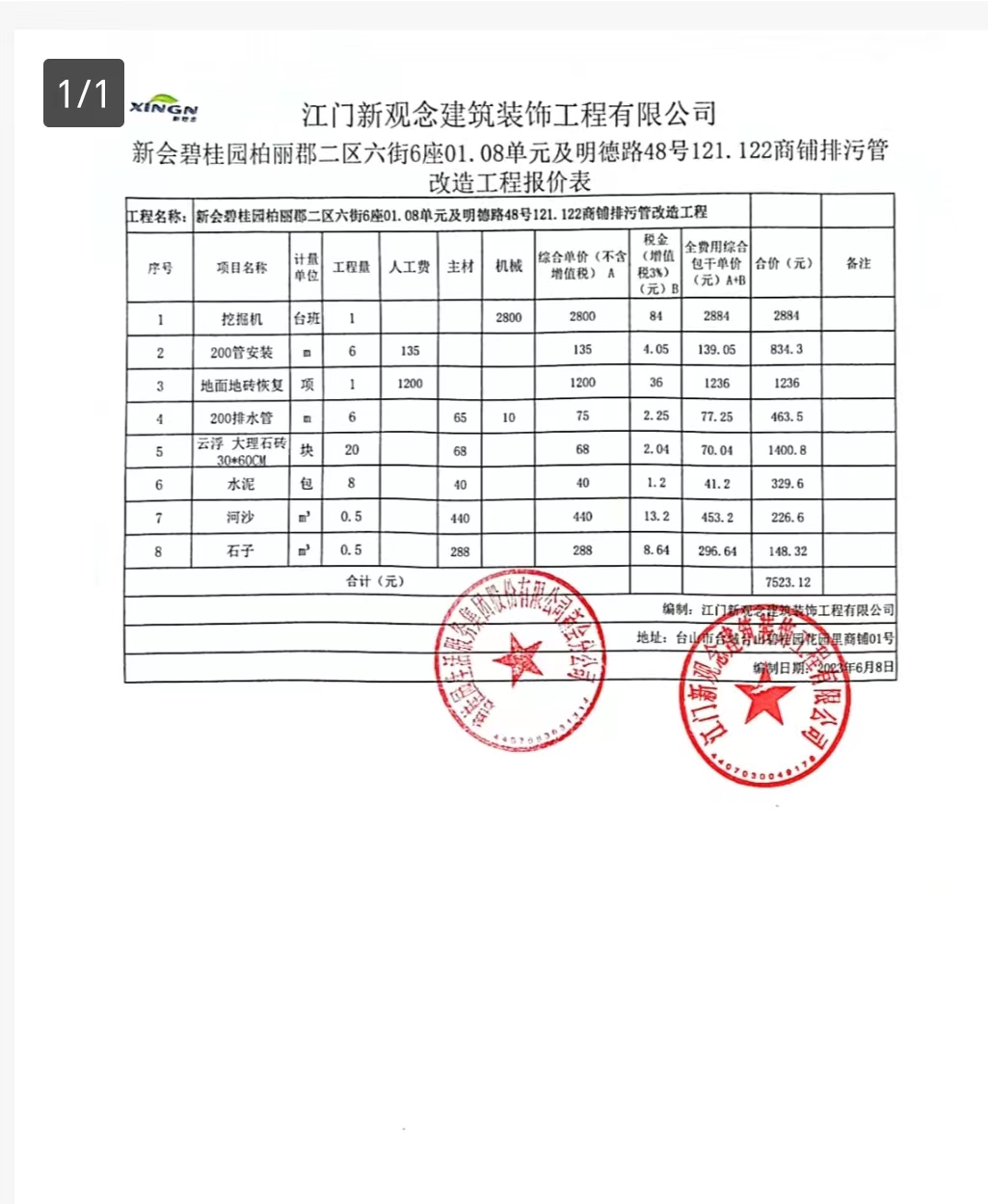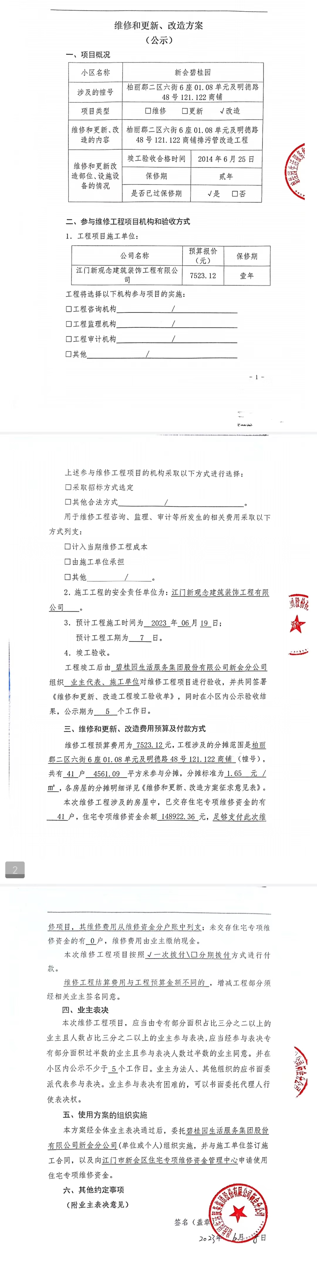 <td VALIGN="top" VALUES="" STYLE="border-width:0" BINDTYPE="0" ROWSPAN="19" COLSPAN="7" DATASOURCE="投票结果" ><font style="font-size:14pt;"><p style="white-space: normal; font-family: 宋体; line-height: 1.75em;">新会碧桂园柏丽郡二区六街6座、明德路48号全体业主:</p><p style="white-space: normal; font-family: 宋体; line-height: 1.75em; text-indent: 2em;">本小区关于新会碧桂园柏丽郡二区六街6座01.08单元及明德路48号121.122商铺排污管改造使用维修资金的投票的投票已表决结束,询异时间从2023年06月17日开始,投票询异公示期间,业主可通过微信查询自己的表决情况或可凭身份证件申请查询自己的表决情况;如公示的业主表决情况与查询的本人表决意见不一致的,可以以书面形式向投票组织机构申诉,投票组织机构予以纠正并重新公示表决结果。异议提出人对投票组织机构的处理仍有异议的,可以向街道办事处(镇人民政府)反映处理,涉及住宅专项维修资金的,可向属地住宅专项维修资金管理中心反映处理。</p><p style="white-space: normal;"><br/></p><p style="white-space: normal; font-family: 宋体; line-height: 1.75em;"><strong>附件:</strong></p><p style="white-space: normal; font-family: 宋体; line-height: 1.75em;"><strong>一、投票范围</strong></p><p style="white-space: normal; font-family: 宋体; line-height: 1.75em; text-indent: 2em;">新会碧桂园柏丽郡二区六街6座、明德路48号</p><p style="white-space: normal; font-family: 宋体; line-height: 1.75em; text-indent: 2em;">总人数(专有部分人数之和):40</p><p style="white-space: normal; font-family: 宋体; line-height: 1.75em; text-indent: 2em;"><span style="font-family: 宋体, SimSun;">总户数:41</span></p><p style="white-space: normal; font-family: 宋体; line-height: 1.75em; text-indent: 2em;">建筑物总面积(专有部分面积之和):4561.09㎡</p><p style="white-space: normal; font-family: 宋体; line-height: 1.75em;"><strong>二、询异公示起止时间</strong></p><p dir="ltr" style="white-space: normal; font-family: 宋体; line-height: 1.75em; text-indent: 2em;"><span style="text-indent: 36px;">2023年06月17日至2023年06月23日</span></p><p style="white-space: normal; font-family: 宋体; line-height: 1.75em;"><strong>三、投票详细描述</strong></p><p style="white-space: normal; font-family: 宋体; line-height: 1.75em; text-indent: 2em;"><p><span style="font-family: "Helvetica Neue", Helvetica, Arial, sans-serif; font-size: 14px; background-color: rgb(255, 255, 255);">新会碧桂园柏丽郡二区六街6座01.08单元及明德路48号121.122商铺排污管反涌,经检查是埋在明德路48号121.122铺位前地面的排污管塌陷需要加急维修,这条排污管是柏丽郡六街6座01.08单元及明德路48号121.122商铺共用的,为确保业户生活不受影响,必须对商铺前地面排污管进行换管处理,已过保修期。现申请使用维修资金对新会碧桂园柏丽郡二区<span style="font-family: "Helvetica Neue", Helvetica, Arial, sans-serif; font-size: 14px; background-color: rgb(255, 255, 255);">六街6座01.08单元及明德路48号121.122商铺排污管进行部份换管处理</span>,工程维修预算约7523.12元,项目最终费用以施工合同签订为准,维修费用的分摊标准按建筑面积分摊,每平方约1.65元,详见公示,如果有业主手机不能正常通过微信投票的,请联系物业公司进行线下纸质投票,物业电话18088896996温管家.</span></p></p><p style="white-space: normal; font-family: 宋体; line-height: 1.75em;"><strong>四、计票规则</strong></p><p style="white-space: normal; font-family: 宋体; line-height: 1.75em; text-indent: 2em;">表决事项:使用建筑物及其附属设施的维修资金<br /><p style='text-align: left; font-family: 宋体; font-size: 16px; line-height: 1.75em; text-indent: 2em;'>计票规则:弃权票不并入其它项 未表决票不并入其它项</p></p><p style="white-space: normal; font-family: 宋体; line-height: 1.75em;"><strong>五、通过规则</strong></p><p style="white-space: normal; font-family: 宋体; line-height: 1.75em; text-indent: 2em;">表决事项:使用建筑物及其附属设施的维修资金<br /><p style='text-align: left; font-family: 宋体; font-size: 16px; line-height: 1.75em; text-indent: 2em;'>通过规则:参与表决专有部分面积过半数的业主且参与表决人数过半数的业主同意</p></p><p style="white-space: normal; font-family: 宋体; line-height: 1.75em;"><strong>六、投票结果</strong></p><p style="white-space: normal; font-family: 宋体; line-height: 1.75em; text-indent: 2em;"><div id='resultTable'><table style='table-layout: fixed; font-size:12px; margin-top:10px' width='100%' border='0' cellspacing='0' cellpadding='0'><tr><td height='28' colspan='10' align='center' style='border: 1px solid #666'><strong style='font-size: 14px;'> 使用建筑物及其附属设施的维修资金</strong></td> </tr><tr id='trfirst'><td height='28' colspan='4' style='border-left: 1px solid #666; border-bottom: 1px solid #666'><strong> 申报单位:</strong> 碧桂园生活服务集团股份有限公司新会分公司</td><td colspan='3' style='border-left: 1px solid #666; border-bottom: 1px solid #666'><strong> 联系方式:</strong> </td><td colspan='3' style='border-left: 1px solid #666; border-bottom: 1px solid #666; border-right: 1px solid #666'><strong> 申报日期:</strong> 2023年6月13日 </td></tr><tr> <td height='28' colspan='5' style='border-left: 1px solid #666; border-bottom: 1px solid #666'><strong> 总人数(专有部分人数之和):</strong>40人 </td><td colspan='5' style='border-left: 1px solid #666; border-bottom: 1px solid #666; border-right: 1px solid #666'><strong> 建筑物总面积(专有部分面积之和):</strong>4561.09㎡ </td> </tr><tr><td height='28' colspan='10' bgcolor='#F3F3F3' style='border-le