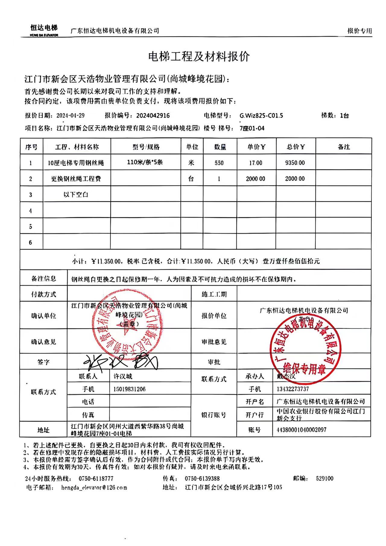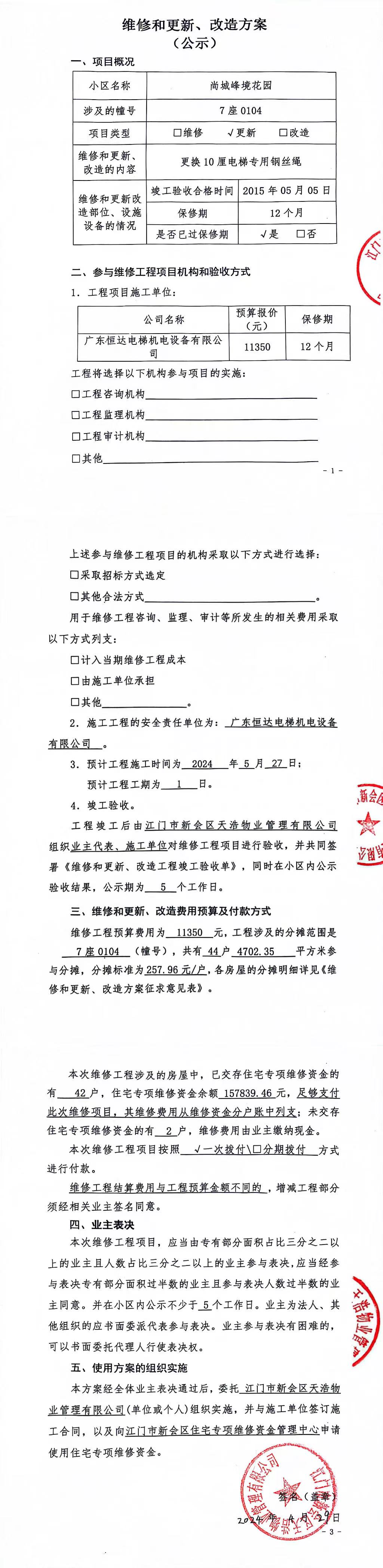 <td VALIGN="top" VALUES="" STYLE="border-width:0" BINDTYPE="0" ROWSPAN="19" COLSPAN="7" DATASOURCE="投票结果" ><font style="font-size:14pt;"><p style="white-space: normal; font-family: 宋体; line-height: 1.75em;">尚城峰境花园尚城峰境花园7座全体业主:</p><p style="white-space: normal; font-family: 宋体; line-height: 1.75em; text-indent: 2em;">本小区关于尚城峰境花园7座01-04【梯粤JX4410】电梯更换电梯专用钢丝绳使用维修资金的投票的投票已表决结束,询异时间从2024年05月07日开始,投票询异公示期间,业主可通过微信查询自己的表决情况或可凭身份证件申请查询自己的表决情况;如公示的业主表决情况与查询的本人表决意见不一致的,可以以书面形式向投票组织机构申诉,投票组织机构予以纠正并重新公示表决结果。异议提出人对投票组织机构的处理仍有异议的,可以向街道办事处(镇人民政府)反映处理,涉及住宅专项维修资金的,可向属地住宅专项维修资金管理中心反映处理。</p><p style="white-space: normal;"><br/></p><p style="white-space: normal; font-family: 宋体; line-height: 1.75em;"><strong>附件:</strong></p><p style="white-space: normal; font-family: 宋体; line-height: 1.75em;"><strong>一、投票范围</strong></p><p style="white-space: normal; font-family: 宋体; line-height: 1.75em; text-indent: 2em;">尚城峰境花园尚城峰境花园7座</p><p style="white-space: normal; font-family: 宋体; line-height: 1.75em; text-indent: 2em;">总人数(专有部分人数之和):44</p><p style="white-space: normal; font-family: 宋体; line-height: 1.75em; text-indent: 2em;"><span style="font-family: 宋体, SimSun;"><span style="font-family: 宋体; text-indent: 32px;"><span style="font-family: 宋体; text-indent: 32px;">总户数:44</span></span></span></p><p style="white-space: normal; font-family: 宋体; line-height: 1.75em; text-indent: 2em;">建筑物总面积(专有部分面积之和):4702.35㎡</p><p style="white-space: normal; font-family: 宋体; line-height: 1.75em;"><strong>二、询异公示起止时间</strong></p><p dir="ltr" style="white-space: normal; font-family: 宋体; line-height: 1.75em; text-indent: 2em;"><span style="text-indent: 36px;">2024年05月07日至2024年05月13日</span></p><p style="white-space: normal; font-family: 宋体; line-height: 1.75em;"><strong>三、投票详细描述</strong></p><p style="white-space: normal; font-family: 宋体; line-height: 1.75em; text-indent: 2em;"><p> 小区7座01-04【梯粤JX4410】电梯发生故障,经检查确认,10厘电梯专用曳引钢丝绳磨损散股,零件为日常使用时间较长,自然磨损损坏导致。 现对7座01-04电梯【梯粤JX4410】进行维修,工程维修预算金额为11350元,项目最终费用以施工合同签订金额为准。因已过保修期,维修费用由相关业主按分户分摊,每户257.96元,详见公示附件。如业主手机不能正常通过微信投票,请联系物业公司进行线下纸质投票,物业电话:0750-6682300。</p></p><p style="white-space: normal; font-family: 宋体; line-height: 1.75em;"><strong>四、计票规则</strong></p><p style="white-space: normal; font-family: 宋体; line-height: 1.75em; text-indent: 2em;">表决事项:使用建筑物及其附属设施的维修资金<br /><p style='text-align: left; font-family: 宋体; font-size: 16px; line-height: 1.75em; text-indent: 2em;'>计票规则:弃权票不并入其它项 未表决票不并入其它项</p></p><p style="white-space: normal; font-family: 宋体; line-height: 1.75em;"><strong>五、通过规则</strong></p><p style="white-space: normal; font-family: 宋体; line-height: 1.75em;"><strong><strong style="white-space: normal;"><span style="font-family: 宋体, SimSun;"> 根据《中华人民共和国民法典》第二百七十八条规定:业主共同决定事项,应当由专有部分面积占比三分之二以上的业主且人数占比三分之二以上的业主参与表决。</span></strong></strong></p><p style="white-space: normal; font-family: 宋体; line-height: 1.75em; text-indent: 2em;">表决事项:使用建筑物及其附属设施的维修资金<br /><p style='text-align: left; font-family: 宋体; font-size: 16px; line-height: 1.75em; text-indent: 2em;'>通过规则:双2/3以上参与表决,参与表决双过半同意</p></p><p style="white-space: normal; font-family: 宋体; line-height: 1.75em;"><strong>六、投票结果</strong></p><p style="white-space: normal; font-family: 宋体; line-height: 1.75em; text-indent: 2em;"><div id='resultTable'><table style='table-layout: fixed; font-size:12px; margin-top:10px' width='100%' border='0' cellspacing='0' cellpadding='0'><tr><td height='28' colspan='10' align='center' style='border: 1px solid #666'><strong style='font-size: 14px;'> 使用建筑物及其附属设施的维修资金</strong></td> </tr><tr id='trfirst'><td height='28' colspan='4' style='border-left: 1px solid #666; border-bottom: 1px solid #666'><strong> 申报单位:</strong> 江门市新会区天浩物业管理有限公司</td><td colspan='3' style='border-left: 1px solid #666; border-bottom: 1px solid #666'><strong> 联系方式:</strong> </td><td colspan='3' style='border-left: 1px solid #666; border-bottom: 1px solid #666; border-right: 1px solid #666'><strong> 申报日期:</strong> 2024年4月29日 </td></tr><tr> <td height='28' colspan='5' style='border-left: 1px solid #666; border-bottom: 1px solid #666'><strong> 总人数(专有部分人数之和):</strong>44人 </td><td colspan='5' style='border-left: 1px solid #666; border-bottom: 1px solid #666; border-right: 1px solid #666'><strong> 建筑物总面积(专有部分面积之和):</strong>4702.35㎡ </td> </tr><tr><td height='28' colspan='10' bgcolor='#F3F3F3' style='border-left: 1px solid #666;border-bottom: 1px solid #666;border-right: 1px solid #666'><strong> 参与人数及面积统计</strong></td></tr><