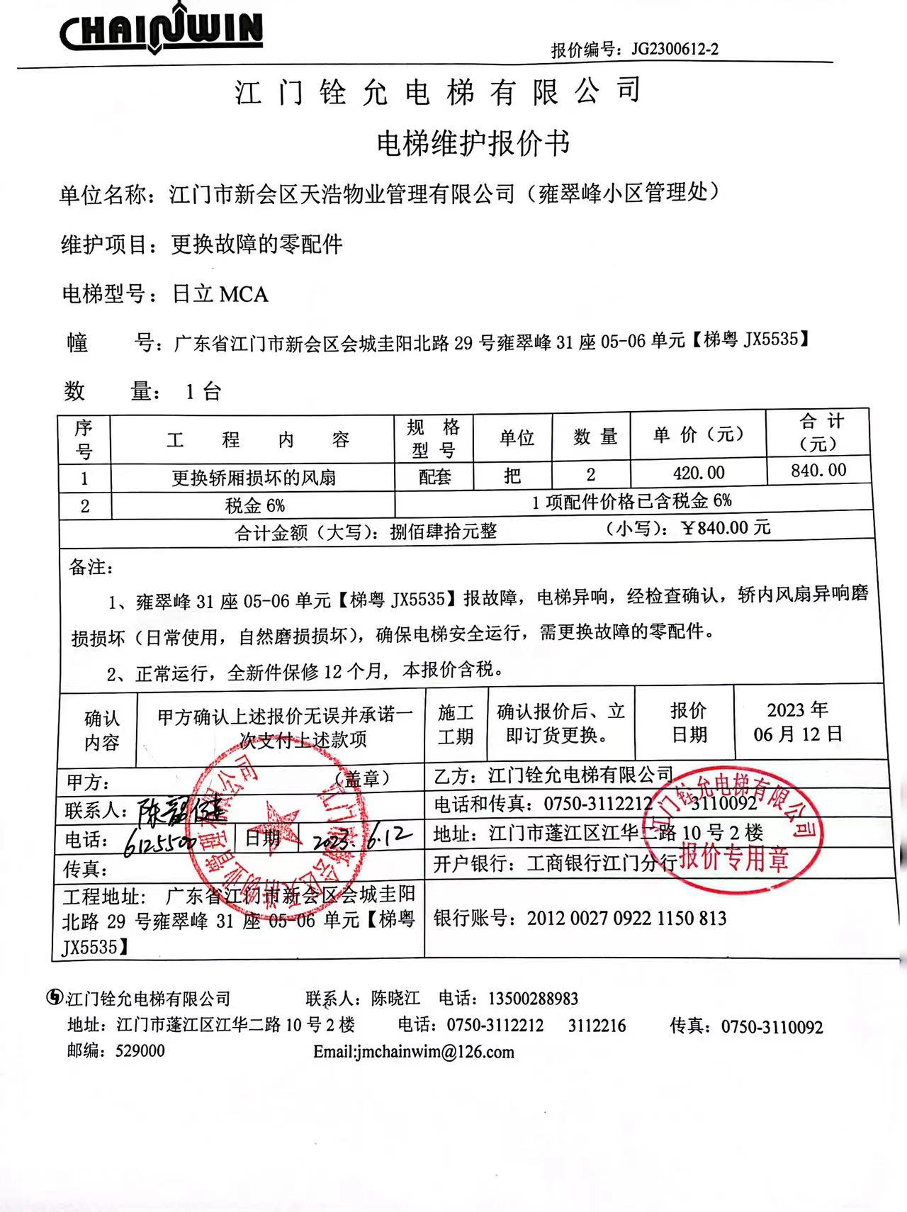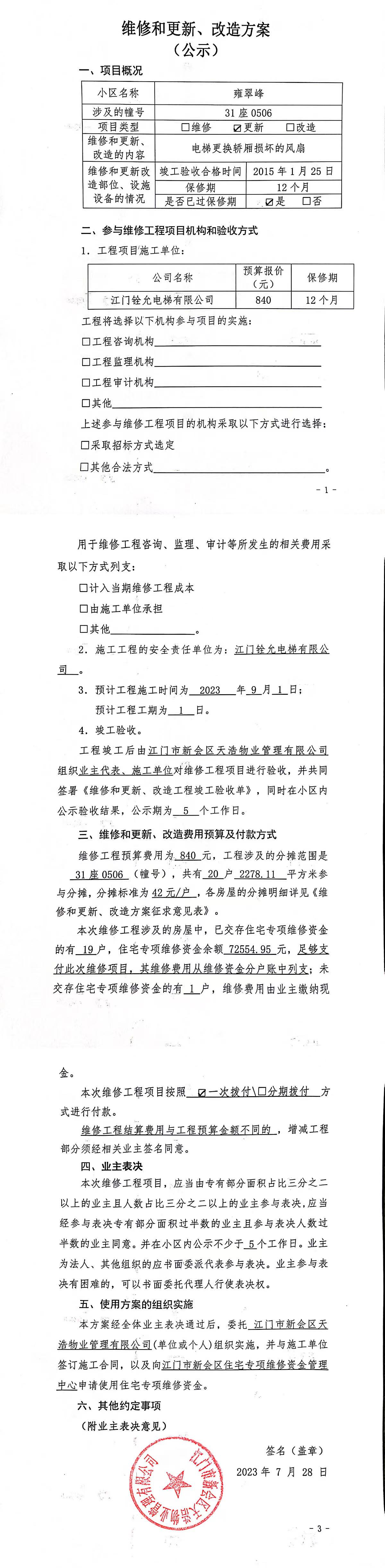 <td valign="top" values="" style="border-width:0" bindtype="0" rowspan="19" colspan="7" datasource="投票结果"><font style="font-size:14pt;"><p style="white-space: normal; font-family: 宋体; line-height: 1.75em;">雍翠峰雍翠峰31座全体业主:</p><p style="white-space: normal; font-family: 宋体; line-height: 1.75em; text-indent: 2em;">本小区关于雍翠峰31座0506电梯更换轿厢损坏的风扇使用维修资金的投票的投票已表决结束,询异时间从2023年08月29日开始,投票询异公示期间,业主可通过微信查询自己的表决情况或可凭身份证件申请查询自己的表决情况;如公示的业主表决情况与查询的本人表决意见不一致的,可以以书面形式向投票组织机构申诉,投票组织机构予以纠正并重新公示表决结果。异议提出人对投票组织机构的处理仍有异议的,可以向街道办事处(镇人民政府)反映处理,涉及住宅专项维修资金的,可向属地住宅专项维修资金管理中心反映处理。</p><p style="white-space: normal;"><br></p><p style="white-space: normal; font-family: 宋体; line-height: 1.75em;"><strong>附件:</strong></p><p style="white-space: normal; font-family: 宋体; line-height: 1.75em;"><strong>一、投票范围</strong></p><p style="white-space: normal; font-family: 宋体; line-height: 1.75em; text-indent: 2em;">雍翠峰雍翠峰31座</p><p style="white-space: normal; font-family: 宋体; line-height: 1.75em; text-indent: 2em;">总人数(专有部分人数之和):20</p><p style="white-space: normal; font-family: 宋体; line-height: 1.75em; text-indent: 2em;"><span style="font-family: 宋体, SimSun;">总户数:20</span></p><p style="white-space: normal; font-family: 宋体; line-height: 1.75em; text-indent: 2em;">建筑物总面积(专有部分面积之和):2278.11㎡</p><p style="white-space: normal; font-family: 宋体; line-height: 1.75em;"><strong>二、询异公示起止时间</strong></p><p dir="ltr" style="white-space: normal; font-family: 宋体; line-height: 1.75em; text-indent: 2em;"><span style="text-indent: 36px;">2023年08月29日至2023年09月04日</span></p><p style="white-space: normal; font-family: 宋体; line-height: 1.75em;"><strong>三、投票详细描述</strong></p><p style="white-space: normal; font-family: 宋体; line-height: 1.75em; text-indent: 2em;"></p><p>雍翠峰31座0506的电梯异响,经检查确认为风扇异响磨损损坏(日常使用,自然磨损损坏)已过保修期。现需申请使用维修资金对31座0506电梯进行维修,工程维修预算金额为840元,项目最终费用以施工合同签订金额为准。维修费用的分摊标准为按分户分摊,每户分摊42元,详见公示附件。如业主手机不能正常通过维修投票,请联系物业公司进行线下纸质投票,物业电话:0750-6125500</p><p></p><p style="white-space: normal; font-family: 宋体; line-height: 1.75em;"><strong>四、计票规则</strong></p><p style="white-space: normal; font-family: 宋体; line-height: 1.75em; text-indent: 2em;">表决事项:使用建筑物及其附属设施的维修资金<br></p><p style="text-align: left; font-family: 宋体; font-size: 16px; line-height: 1.75em; text-indent: 2em;">计票规则:弃权票不并入其它项 未表决票不并入其它项</p><p></p><p style="white-space: normal; font-family: 宋体; line-height: 1.75em;"><strong>五、通过规则</strong></p><p style="white-space: normal; font-family: 宋体; line-height: 1.75em; text-indent: 2em;">表决事项:使用建筑物及其附属设施的维修资金<br></p><p style="text-align: left; font-family: 宋体; font-size: 16px; line-height: 1.75em; text-indent: 2em;">通过规则:参与表决专有部分面积过半数的业主且参与表决人数过半数的业主同意</p><p></p><p style="white-space: normal; font-family: 宋体; line-height: 1.75em;"><strong>六、投票结果</strong></p><p style="white-space: normal; font-family: 宋体; line-height: 1.75em; text-indent: 2em;"></p><div id="resultTable"><table style="table-layout: fixed; font-size:12px; margin-top:10px" width="100%" border="0" cellspacing="0" cellpadding="0"><tbody><tr><td height="28" colspan="10" align="center" style="border: 1px solid #666"><strong style="font-size: 14px;"> 使用建筑物及其附属设施的维修资金</strong></td> </tr><tr id="trfirst"><td height="28" colspan="4" style="border-left: 1px solid #666; border-bottom: 1px solid #666"><strong> 申报单位:</strong> 江门市新会区天浩物业管理有限公司</td><td colspan="3" style="border-left: 1px solid #666; border-bottom: 1px solid #666"><strong> 联系方式:</strong> </td><td colspan="3" style="border-left: 1px solid #666; border-bottom: 1px solid #666; border-right: 1px solid #666"><strong> 申报日期:</strong> 2023年7月28日 </td></tr><tr> <td height="28" colspan="5" style="border-left: 1px solid #666; border-bottom: 1px solid #666"><strong> 总人数(专有部分人数之和):</strong>20人 </td><td colspan="5" style="border-left: 1px solid #666; border-bottom: 1px solid #666; border-right: 1px solid #666"><strong> 建筑物总面积(专有部分面积之和):</strong>2278.11㎡ </td> </tr><tr><td height="28" colspan="10" bgcolor="#F3F3F3" style="border-left: 1px solid #666;border-bottom: 1px solid #666;border-right: 1px solid #666"><strong> 参与人数及面积统计</strong></td></tr><tr><td height="28" colspan="5" style="border-left: 1px solid #666; border-bottom: 1px solid #666"><strong> 参与表决专有部分人数之和:</strong>4人</td><td colspan="5" style="border-left: 1px solid #666; border-bottom: 1px solid #666; border-right: 1px solid #666"><strong> 参与表决占有表决权总人数比例:</strong>20.00%</td></tr><tr><td height="28" colspan="5" style="border-left: 1px solid #666; border-bottom: 1px solid #666"><strong> 参与表决专有部分面积之和:</strong>430.55㎡</td><td colspan="5" style="border-left: 1px solid #666; border-