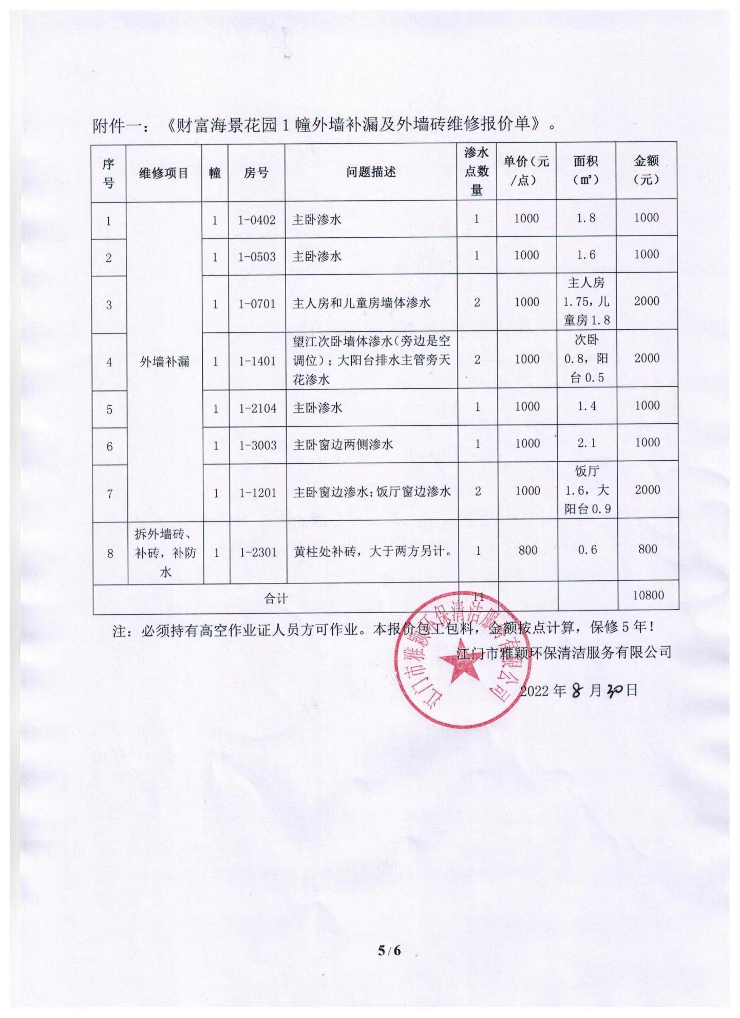 <td VALIGN="top" VALUES="" STYLE="border-width:0" BINDTYPE="0" ROWSPAN="19" COLSPAN="7" DATASOURCE="投票结果" ><font style="font-size:14pt;"><p style="text-align: left; font-family: 宋体; font-size: 16px; line-height: 1.75em;"><span style="font-family: 宋体;">江海区外海财富海景花园江海区外海财富海景花园1幢全体业主:</span></p><p style="text-align: left; font-family: 宋体; font-size: 16px; line-height: 1.75em; text-indent: 2em;">本小区关于江门财富海景花园1幢外墙补漏及外墙砖维修使用维修资金的投票的投票已表决结束,询异时间从2022年10月10日开始,投票询异公示期间,业主可通过微信查询自己的表决情况或可凭身份证件赴发起机构申请查询自己的表决情况;如公示的业主表决情况与在服务平台查询的本人表决意见不一致的,可以以书面形式向发起机构核查。经核查业主反映情况属实的,发起机构应当予以纠正并重新公示表决结果。</p><p><br/></p><p style="text-align: left; font-family: 宋体; font-size: 16px; line-height: 1.75em;"><strong><span style="font-family: 宋体">附件:</span></strong></p><p style="text-align: left; font-family: 宋体; font-size: 16px; line-height: 1.75em;"><strong>一、投票范围</strong></p><p style="text-align: left; font-family: 宋体; font-size: 16px; line-height: 1.75em; text-indent: 2em;">江海区外海财富海景花园江海区外海财富海景花园1幢</p><p style="text-align: left; font-family: 宋体; font-size: 16px; line-height: 1.75em; text-indent: 2em;">总人数(专有部分人数之和):116</p><p style="text-align: left; font-family: 宋体; font-size: 16px; line-height: 1.75em; text-indent: 2em;"><span style="font-family: 宋体, SimSun; text-indent: 32px;">总户数:{TotalHouseCount}</span></p><p style="text-align: left; font-family: 宋体; font-size: 16px; line-height: 1.75em; text-indent: 2em;">建筑物总面积(专有部分面积之和):12930.52㎡</p><p style="text-align: left; font-family: 宋体; font-size: 16px; line-height: 1.75em;"><strong>二、投票起止时间</strong></p><p dir="ltr" style="text-align: left; font-family: 宋体; font-size: 16px; line-height: 1.75em; text-indent: 2em;">投票表决时间:从2022年09月19日到2022年10月09日止</p><p dir="ltr" style="text-align: left; font-family: 宋体; font-size: 16px; line-height: 1.75em; text-indent: 2em;">投票询异公示时间:从2022年10月10日开始</p><p dir="ltr" style="text-align: left; font-family: 宋体; font-size: 16px; line-height: 1.75em; text-indent: 2em;">投票结果通知公告时间:从2022年10月17日开始<br/></p><p style="text-align: left; font-family: 宋体; font-size: 16px; line-height: 1.75em;"><strong>三、投票详细描述</strong></p><p style="text-align: left; font-family: 宋体; font-size: 16px; line-height: 1.75em; text-indent: 2em;"><p style="white-space: normal; text-indent: 2em; line-height: 1.75em;"><span style="font-family: 宋体, SimSun; text-decoration: none;">本小区1幢多户屋内墙体渗水,经检查,是由于外墙渗水,已过保修期。且1幢部分外墙砖出现松动,存在安全隐患。</span></p><p style="white-space: normal; text-indent: 2em; line-height: 1.75em;"><span style="font-family: 宋体, SimSun; text-decoration: none;">现需申请使用维修资金对1幢部分外墙补漏及外墙砖维修,工程维修预算金额为10800元,项目最终费用以施工合同签订金额为准。维修费用的分摊标准为按建筑面积分摊,每平方约0.84元,详见公示附件。如业主手机不能正常通过微信投票,请联系物业服务中心进行线下纸质投票,物业服务中心电话:0750-3813899。</span></p></p><p style="text-align: left; font-family: 宋体; font-size: 16px; line-height: 1.75em;"><strong>四、计票规则</strong></p><p style="text-align: left; font-family: 宋体; font-size: 16px; line-height: 1.75em; text-indent: 2em;">表决事项:使用建筑物及其附属设施的维修资金<br /><p style='text-align: left; font-family: 宋体; font-size: 16px; line-height: 1.75em; text-indent: 2em;'>计票规则:弃权票不并入其它项&nbsp;&nbsp;&nbsp;&nbsp;未表决票不并入其它项</p></p><p style="text-align: left; font-family: 宋体; font-size: 16px; line-height: 1.75em;"><strong>五、通过规则</strong></p><p style="text-align: left; font-family: 宋体; font-size: 16px; line-height: 1.75em; text-indent: 2em;"><span style="font-family: 宋体; text-indent: 32px;">表决事项:使用建筑物及其附属设施的维修资金<br /><p style='text-align: left; font-family: 宋体; font-size: 16px; line-height: 1.75em; text-indent: 2em;'>通过规则:参与表决专有部分面积过半数的业主且参与表决人数过半数的业主同意</p></span></p><p style="text-align: left; font-family: 宋体; font-size: 16px; line-height: 1.75em;"><strong>六、投票结果</strong></p><p style="text-align: left; font-family: 宋体; font-size: 16px; line-height: 1.75em; text-indent: 2em;"><div id='resultTable'><table style='table-layout: fixed; font-size:12px; margin-top:10px' width='100%' border='0' cellspacing='0' cellpadding='0'><tr><td height='28' colspan='10' align='center' style='border: 1px solid #666'><strong style='font-size: 14px;'> 使用建筑物及其附属设施的维修资金</strong></td> </tr><tr id='trfirst'><td height='28' colspan='4' style='border-left: 1px solid #666; border-bottom: 1px solid #666'><strong>&nbsp;申报单位:</strong> 江门市江海区宜乐居物业管理有限公司</td><td colspan='3' style='border-left: 1px solid #666; border-bottom: 1px solid #666'><strong>&nbsp;联系方式:</strong> </td><td colspan='3' style='border-left: 1px solid #666; border-bottom: 1px solid #666; border-right: 1px solid #666'><strong>&nbsp;申报日期:</strong> 2022年9月14日 </td></tr><tr> <td height='28' colspan='5' style='border-left: 1px solid #666; border-bottom: 1px soli