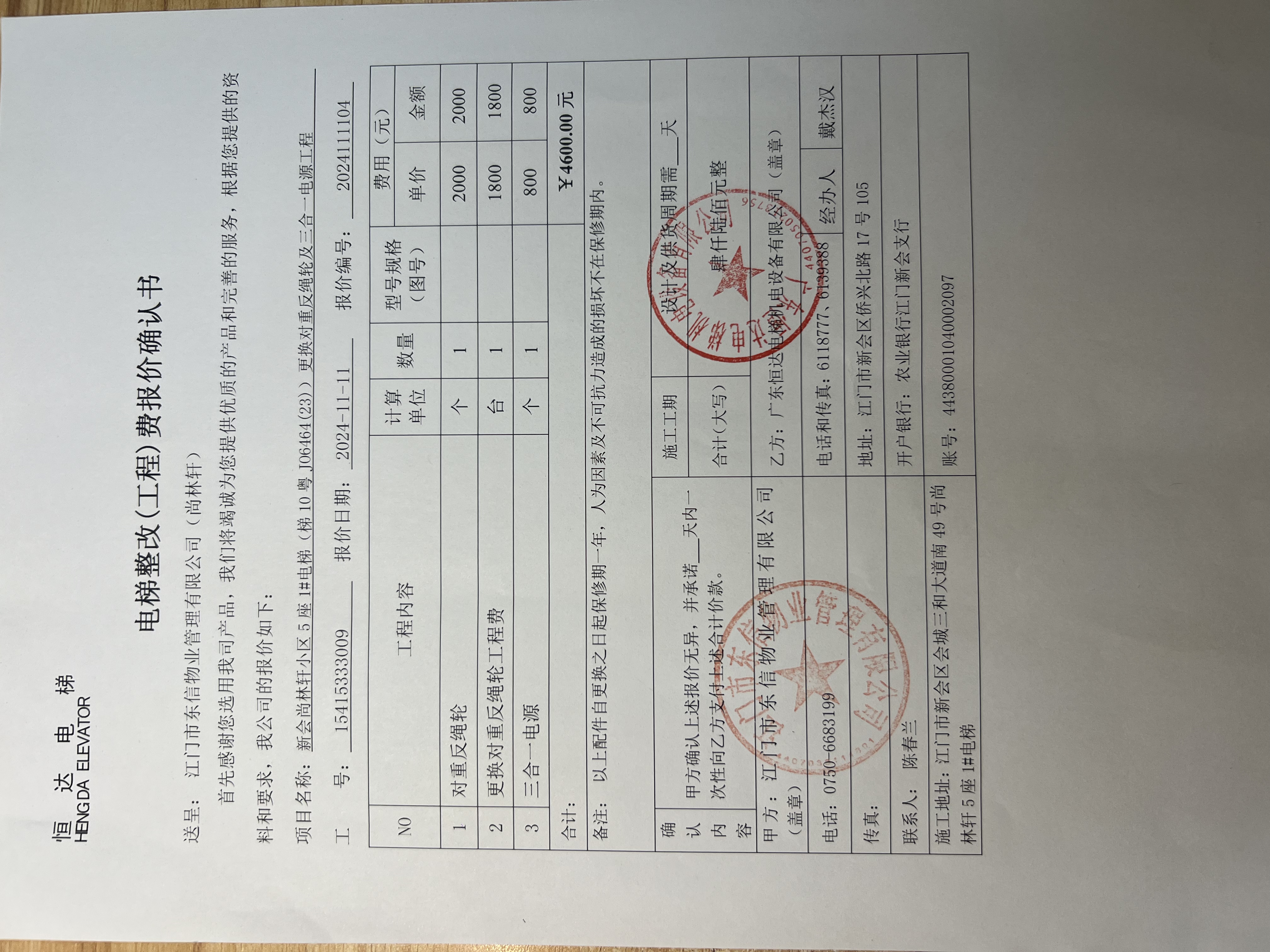 <td VALIGN="top" VALUES="" STYLE="border-width:0" BINDTYPE="0" ROWSPAN="19" COLSPAN="7" DATASOURCE="投票结果" ><font style="font-size:14pt;"><p style="white-space: normal; font-family: 宋体; line-height: 1.75em;">尚林轩小区尚林轩5座全体业主:</p><p style="white-space: normal; font-family: 宋体; line-height: 1.75em; text-indent: 2em;">本小区关于尚林轩小区5座1#电梯更换对重反绳轮及三合一电源使用维修资金的投票的投票已表决结束,询异时间从2025年01月06日开始,投票询异公示期间,业主可通过微信查询自己的表决情况或可凭身份证件申请查询自己的表决情况;如公示的业主表决情况与查询的本人表决意见不一致的,可以以书面形式向投票组织机构申诉,投票组织机构予以纠正并重新公示表决结果。异议提出人对投票组织机构的处理仍有异议的,可以向街道办事处(镇人民政府)反映处理,涉及住宅专项维修资金的,可向属地住宅专项维修资金管理中心反映处理。</p><p style="white-space: normal;"><br/></p><p style="white-space: normal; font-family: 宋体; line-height: 1.75em;"><strong>附件:</strong></p><p style="white-space: normal; font-family: 宋体; line-height: 1.75em;"><strong>一、投票范围</strong></p><p style="white-space: normal; font-family: 宋体; line-height: 1.75em; text-indent: 2em;">尚林轩小区尚林轩5座</p><p style="white-space: normal; font-family: 宋体; line-height: 1.75em; text-indent: 2em;">总人数(专有部分人数之和):60</p><p style="white-space: normal; font-family: 宋体; line-height: 1.75em; text-indent: 2em;"><span style="font-family: 宋体, SimSun;"><span style="font-family: 宋体; text-indent: 32px;"><span style="font-family: 宋体; text-indent: 32px;">总户数:61</span></span></span></p><p style="white-space: normal; font-family: 宋体; line-height: 1.75em; text-indent: 2em;">建筑物总面积(专有部分面积之和):5828.66㎡</p><p style="white-space: normal; font-family: 宋体; line-height: 1.75em;"><strong>二、询异公示起止时间</strong></p><p dir="ltr" style="white-space: normal; font-family: 宋体; line-height: 1.75em; text-indent: 2em;"><span style="text-indent: 36px;">2025年01月06日至2025年01月16日</span></p><p style="white-space: normal; font-family: 宋体; line-height: 1.75em;"><strong>三、投票详细描述</strong></p><p style="white-space: normal; font-family: 宋体; line-height: 1.75em; text-indent: 2em;"><p style="text-wrap: wrap; font-family: "Helvetica Neue", Helvetica, Arial, sans-serif; font-size: 14px; background-color: rgb(255, 255, 255);"> 小区5座1#电梯经过多年使用,轿顶反绳轮轴承坏,运行有异响,电梯停电后,轿厢应急照明和应急电话不工作。</p><p style="text-wrap: wrap; font-family: "Helvetica Neue", Helvetica, Arial, sans-serif; font-size: 14px; background-color: rgb(255, 255, 255);"> 现对5座1#电梯进行维修,工程维修预算金额为4600元,项目最终费用以施工合同签订金额为准。因已过保修期,维修费用由相关业主按建筑面积分摊,每平方约0.78920元,详见公示附件。如业主手机不能正常通过微信投票,请联系物业公司进行线下纸质投票,物业电话:0750-6683199。</p><p><br/></p></p><p style="white-space: normal; font-family: 宋体; line-height: 1.75em;"><strong>四、计票规则</strong></p><p style="white-space: normal; font-family: 宋体; line-height: 1.75em; text-indent: 2em;">表决事项:使用建筑物及其附属设施的维修资金<br /><p style='text-align: left; font-family: 宋体; font-size: 16px; line-height: 1.75em; text-indent: 2em;'>计票规则:弃权票不并入其它项 未表决票不并入其它项</p></p><p style="white-space: normal; font-family: 宋体; line-height: 1.75em;"><strong>五、通过规则</strong></p><p style="white-space: normal; font-family: 宋体; line-height: 1.75em;"><strong><strong style="white-space: normal;"><span style="font-family: 宋体, SimSun;"> 根据《中华人民共和国民法典》第二百七十八条规定:业主共同决定事项,应当由专有部分面积占比三分之二以上的业主且人数占比三分之二以上的业主参与表决。</span></strong></strong></p><p style="white-space: normal; font-family: 宋体; line-height: 1.75em; text-indent: 2em;">表决事项:使用建筑物及其附属设施的维修资金<br /><p style='text-align: left; font-family: 宋体; font-size: 16px; line-height: 1.75em; text-indent: 2em;'>通过规则:双2/3以上参与表决,参与表决双过半同意</p></p><p style="white-space: normal; font-family: 宋体; line-height: 1.75em;"><strong>六、投票结果</strong></p><p style="white-space: normal; font-family: 宋体; line-height: 1.75em; text-indent: 2em;"><div id='resultTable'><table style='table-layout: fixed; font-size:12px; margin-top:10px' width='100%' border='0' cellspacing='0' cellpadding='0'><tr><td height='28' colspan='10' align='center' style='border: 1px solid #666'><strong style='font-size: 14px;'> 使用建筑物及其附属设施的维修资金</strong></td> </tr><tr id='trfirst'><td height='28' colspan='4' style='border-left: 1px solid #666; border-bottom: 1px solid #666'><strong> 申报单位:</strong> 江门市东信物业管理有限公司</td><td colspan='3' style='border-left: 1px solid #666; border-bottom: 1px solid #666'><strong> 联系方式:</strong> 0750-6683199 </td><td colspan='3' style='border-left: 1px solid #666; border-bottom: 1px solid #666; border-right: 1px solid #666'><strong> 申报日期:</strong> 2024年12月5日 </td></tr><tr> <td height='28' colspan='5' style='border-left: 1px solid #666; border-bottom: 1px solid #666'><strong> 总人数(专有部分人数之和):</strong>60人 </td><td colspan='5' style='border-left: 1px solid #666; border-bottom: 1px solid #666; border-right: 1px solid #666'><strong> 建筑物总面积(专有部分面积之和):</strong