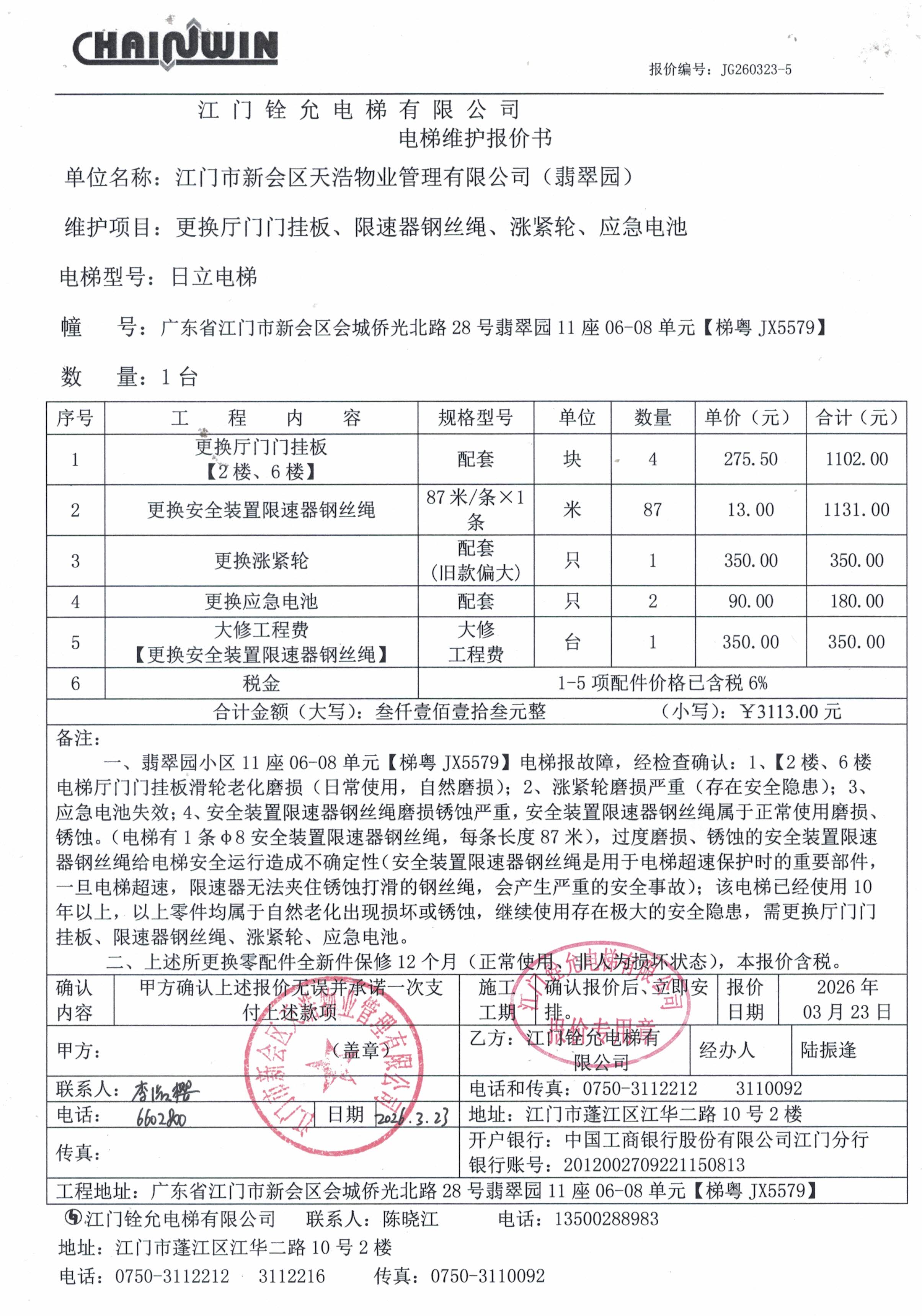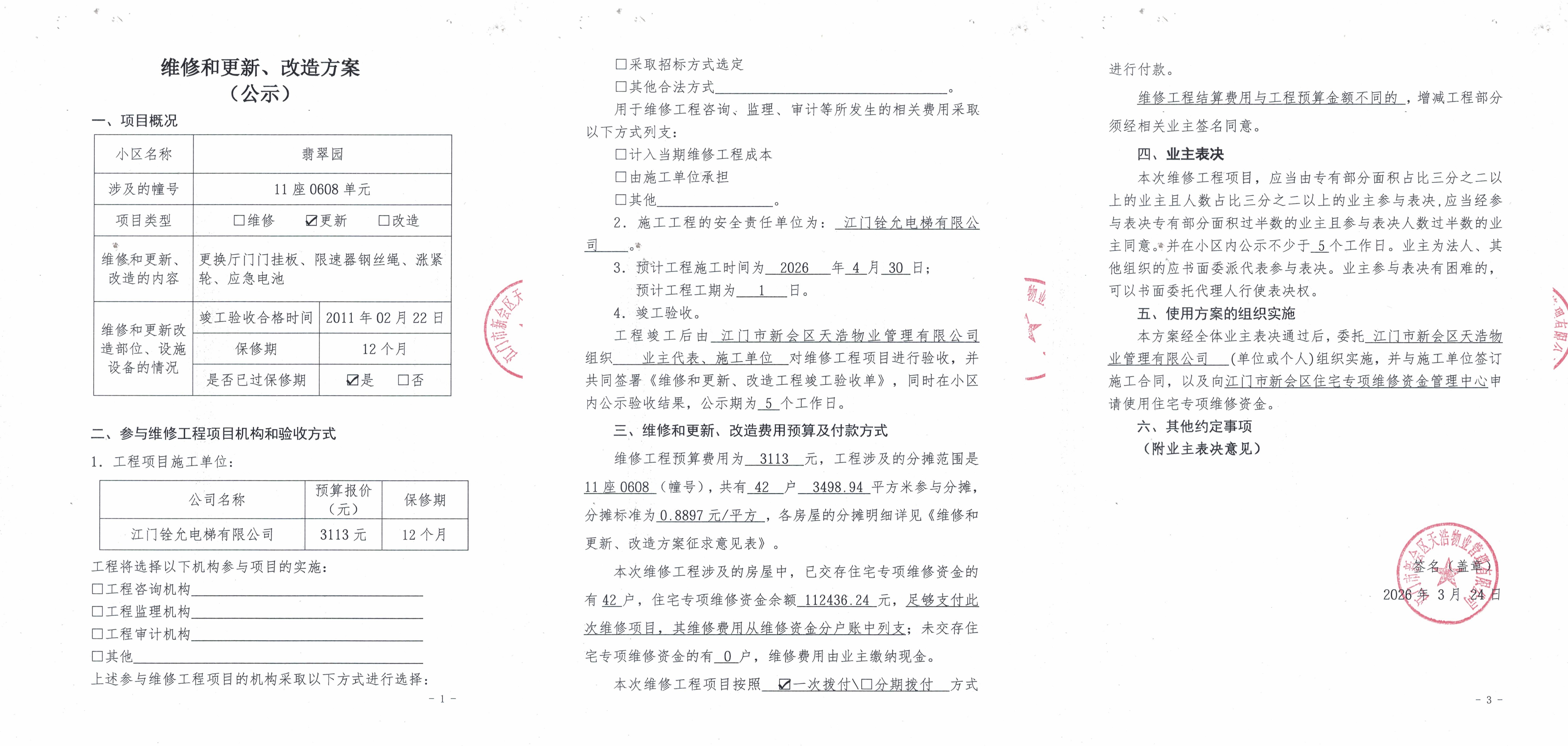 <td VALIGN="top" VALUES="" STYLE="border-width:0" BINDTYPE="0" ROWSPAN="18" COLSPAN="7" DATASOURCE="投票内容" ><font style="font-size:12pt;"><p style="text-align: left; font-family: 宋体; font-size: 16px; line-height: 1.75em;"><strong style="text-align: left; line-height: 1.75em;">一、投票范围</strong><br/></p><p style="white-space: normal; font-family: 宋体; font-size: 16px; line-height: 1.75em; text-indent: 2em;">翡翠园翡翠园11座</p><p style="white-space: normal; font-family: 宋体; font-size: 16px; line-height: 1.75em; text-indent: 2em;">总人数(专有部分人数之和):24</p><p style="white-space: normal; font-family: 宋体; font-size: 16px; line-height: 1.75em; text-indent: 2em;"><span style="font-family: 宋体; text-indent: 32px;">总户数:42</span></p><p style="white-space: normal; font-family: 宋体; font-size: 16px; line-height: 1.75em; text-indent: 2em;">建筑物总面积(专有部分面积之和):3498.94㎡</p><p style="white-space: normal; font-family: 宋体;font-size: 16px; line-height: 1.75em;"><strong>二、投票起止时间</strong></p><p style="white-space: normal; font-family: 宋体; line-height: 1.75em; text-indent: 2em;">投票表决时间:从2026年03月25日到2026年05月22日止</p><p style="white-space: normal; font-family: 宋体; line-height: 1.75em; text-indent: 2em;">投票补录时间:从2026年05月23日到2026年05月28日止</p><p style="white-space: normal; font-family: 宋体;font-size: 16px; line-height: 1.75em;"><strong>三、投票详细描述</strong></p><p style="white-space: normal; font-family: 宋体; font-size: 16px; line-height: 1.75em; text-indent: 2em;"><p>&nbsp; &nbsp; &nbsp; &nbsp;翡翠园11座0608单元电梯【梯粤JX5579】厅门门挂板滑轮老化磨损,涨紧轮磨损严重,应急电池失效,安全装置限速器钢丝绳磨损锈蚀,配件日常使用自然磨损。</p><p>&nbsp; &nbsp; &nbsp; &nbsp;现需申请使用维修资金对11座0608单元电梯【梯粤JX5579】进行维修,工程维修预算金额为3113元,项目最终费用以施工合同签订金额为准。因已过保修期,维修费用由相关业主按建筑面积分摊,每平方约0.8897元,详见公示附件。如业主手机不能正常通过微信投票,请联系物业公司进行线下纸质投票,物业电话:0750-6602800。</p><p><br/></p></p><p style="white-space: normal; font-family: 宋体;font-size: 16px; line-height: 1.75em;"><strong>四、计票规则</strong></p><p style="white-space: normal; font-family: 宋体; font-size: 16px; line-height: 1.75em; text-indent: 2em;"><span style="font-family: 宋体; text-indent: 32px;">表决事项:使用建筑物及其附属设施的维修资金<br /><p style='text-align: left; font-family: 宋体; font-size: 16px; line-height: 1.75em; text-indent: 2em;'>计票规则:弃权票不并入其它项&nbsp;&nbsp;&nbsp;&nbsp;未表决票不并入其它项</p></span></p><p style="white-space: normal; font-family: 宋体;font-size: 16px; line-height: 1.75em;"><strong>五、通过规则</strong></p><p style="white-space: normal; font-family: 宋体;font-size: 16px; line-height: 1.75em;"><strong>&nbsp; 根据《中华人民共和国民法典》第二百七十八条规定:业主共同决定事项,应当由专有部分面积占比三分之二以上的业主且人数占比三分之二以上的业主参与表决。</strong></p><p style="white-space: normal; font-family: 宋体; font-size: 16px; line-height: 1.75em; text-indent: 2em;"><span style="font-family: 宋体; text-indent: 32px;">表决事项:使用建筑物及其附属设施的维修资金<br /><p style='text-align: left; font-family: 宋体; font-size: 16px; line-height: 1.75em; text-indent: 2em;'>通过规则:双2/3以上参与表决,参与表决双过半同意</p></span><span style="font-family: 宋体; text-indent: 32px;"></span></p><p style="text-align: left; font-family: 宋体; font-size: 16px; line-height: 1.75em;"><strong>六、投票方式</strong></p><p style="text-align: left; font-family: 宋体; font-size: 16px; line-height: 1.75em; text-indent: 2em;"><span style="font-size: 16px; font-family: 宋体">在投票事项通知公告日起,请业主扫描二维码或者关注微信公众号(<strong>江门住建</strong>)查看详细情况并进行投票。</span></p><p style="text-align: center; font-family: 宋体; font-size: 16px; line-height: 1.75em; text-indent: 2em;"><span style="font-size: 16px; font-family: 宋体"><strong style="font-family: 宋体; text-align: center; white-space: normal; line-height: 1.75em;"><img src="http://jmzjj.jiangmen.cn:8071/Areas/Custom/Content/images/jmzjybs.jpg"/></strong></span></p><p style="text-align: right; font-family: 宋体; font-size: 16px; line-height: 1.75em; text-indent: 2em;"><span style="text-align: right;">申报单位(盖章):江门市新会区天浩物业管理有限公司</span></p><p style="text-align: right; font-family: 宋体; font-size: 16px; line-height: 1.75em;">2026年03月25日</p></font></td>