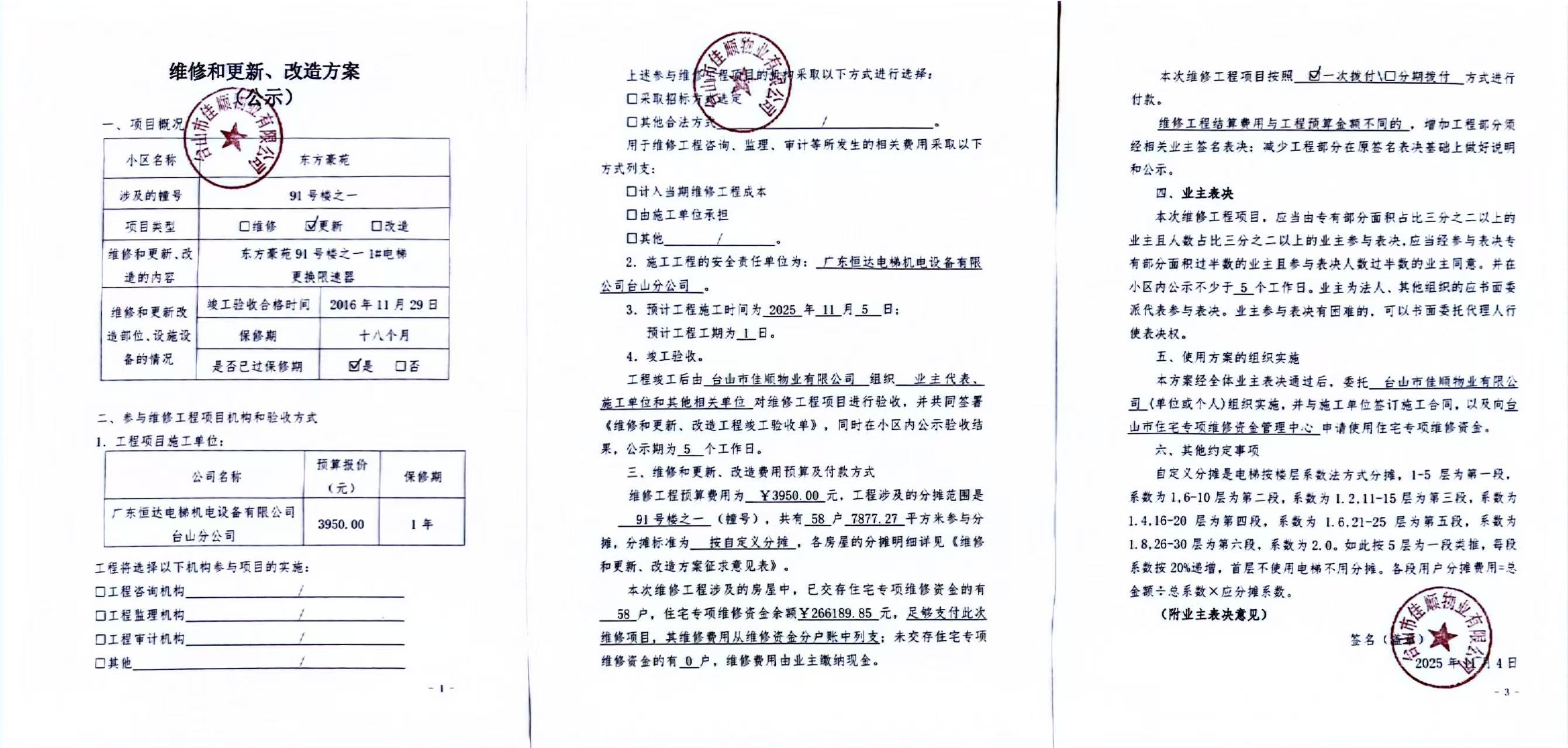 <td VALIGN="top" VALUES="" STYLE="border-width:0" BINDTYPE="0" ROWSPAN="19" COLSPAN="7" DATASOURCE="投票结果" ><font style="font-size:14pt;"><p style="white-space: normal; font-family: 宋体; line-height: 1.75em;">东方豪苑91号全体业主:</p><p style="white-space: normal; font-family: 宋体; line-height: 1.75em; text-indent: 2em;">本小区关于东方豪苑91号楼之一1#电梯更换限速器的使用维修资金投票的投票已表决结束,询异时间从2025年12月08日开始,投票询异公示期间,业主可通过微信查询自己的表决情况或可凭身份证件申请查询自己的表决情况;如公示的业主表决情况与查询的本人表决意见不一致的,可以以书面形式向投票组织机构申诉,投票组织机构予以纠正并重新公示表决结果。异议提出人对投票组织机构的处理仍有异议的,可以向街道办事处(镇人民政府)反映处理,涉及住宅专项维修资金的,可向属地住宅专项维修资金管理中心反映处理。</p><p style="white-space: normal;"><br/></p><p style="white-space: normal; font-family: 宋体; line-height: 1.75em;"><strong>附件:</strong></p><p style="white-space: normal; font-family: 宋体; line-height: 1.75em;"><strong>一、投票范围</strong></p><p style="white-space: normal; font-family: 宋体; line-height: 1.75em; text-indent: 2em;">东方豪苑91号</p><p style="white-space: normal; font-family: 宋体; line-height: 1.75em; text-indent: 2em;">总人数(专有部分人数之和):58</p><p style="white-space: normal; font-family: 宋体; line-height: 1.75em; text-indent: 2em;"><span style="font-family: 宋体, SimSun;"><span style="font-family: 宋体; text-indent: 32px;"><span style="font-family: 宋体; text-indent: 32px;">总户数:58</span></span></span></p><p style="white-space: normal; font-family: 宋体; line-height: 1.75em; text-indent: 2em;">建筑物总面积(专有部分面积之和):7877.27㎡</p><p style="white-space: normal; font-family: 宋体; line-height: 1.75em;"><strong>二、询异公示起止时间</strong></p><p dir="ltr" style="white-space: normal; font-family: 宋体; line-height: 1.75em; text-indent: 2em;"><span style="text-indent: 36px;">2025年12月08日至2025年12月18日</span></p><p style="white-space: normal; font-family: 宋体; line-height: 1.75em;"><strong>三、投票详细描述</strong></p><p style="white-space: normal; font-family: 宋体; line-height: 1.75em; text-indent: 2em;"><p>小区91号楼之一1#电梯故障无法使用,经检查,是因电梯限速器轴承损坏,运行中摆动大导致电气开关动作保护故障停梯。现对91号楼之一1#电梯限速器进行更换,工程更换预算为3950元。因已过保修期,更换费用由相关业主按自定义分摊,详见公示附件。如业主手机不能正常通过微信投票,请联系物业公司进行线下纸质投票,物业电话:0750-5579397。</p><p><br/></p></p><p style="white-space: normal; font-family: 宋体; line-height: 1.75em;"><strong>四、计票规则</strong></p><p style="white-space: normal; font-family: 宋体; line-height: 1.75em; text-indent: 2em;">表决事项:使用建筑物及其附属设施的维修资金<br /><p style='text-align: left; font-family: 宋体; font-size: 16px; line-height: 1.75em; text-indent: 2em;'>计票规则:弃权票不并入其它项 未表决票不并入其它项</p></p><p style="white-space: normal; font-family: 宋体; line-height: 1.75em;"><strong>五、通过规则</strong></p><p style="white-space: normal; font-family: 宋体; line-height: 1.75em;"><strong><strong style="white-space: normal;"><span style="font-family: 宋体, SimSun;"> 根据《中华人民共和国民法典》第二百七十八条规定:业主共同决定事项,应当由专有部分面积占比三分之二以上的业主且人数占比三分之二以上的业主参与表决。</span></strong></strong></p><p style="white-space: normal; font-family: 宋体; line-height: 1.75em; text-indent: 2em;">表决事项:使用建筑物及其附属设施的维修资金<br /><p style='text-align: left; font-family: 宋体; font-size: 16px; line-height: 1.75em; text-indent: 2em;'>通过规则:双2/3以上参与表决,参与表决双过半同意</p></p><p style="white-space: normal; font-family: 宋体; line-height: 1.75em;"><strong>六、投票结果</strong></p><p style="white-space: normal; font-family: 宋体; line-height: 1.75em; text-indent: 2em;"><div id='resultTable'><table style='table-layout: fixed; font-size:12px; margin-top:10px' width='100%' border='0' cellspacing='0' cellpadding='0'><tr><td height='28' colspan='10' align='center' style='border: 1px solid #666'><strong style='font-size: 14px;'> 使用建筑物及其附属设施的维修资金</strong></td> </tr><tr id='trfirst'><td height='28' colspan='4' style='border-left: 1px solid #666; border-bottom: 1px solid #666'><strong> 申报单位:</strong> 台山市佳顺物业有限公司</td><td colspan='3' style='border-left: 1px solid #666; border-bottom: 1px solid #666'><strong> 联系方式:</strong> </td><td colspan='3' style='border-left: 1px solid #666; border-bottom: 1px solid #666; border-right: 1px solid #666'><strong> 申报日期:</strong> 2025年11月6日 </td></tr><tr> <td height='28' colspan='5' style='border-left: 1px solid #666; border-bottom: 1px solid #666'><strong> 总人数(专有部分人数之和):</strong>58人 </td><td colspan='5' style='border-left: 1px solid #666; border-bottom: 1px solid #666; border-right: 1px solid #666'><strong> 建筑物总面积(专有部分面积之和):</strong>7877.27㎡ </td> </tr><tr><td height='28' colspan='10' bgcolor='#F3F3F3' style='border-left: 1px solid #666;border-bottom: 1px solid #666;border-right: 1px solid #666'><strong> 参与人数及面积统计</strong></td></tr><tr><td height='28' colspan='5' style='border-left: 1px solid #666; border-bottom: 1px solid #666'><strong> 参与表决专有部分人数之和:</strong>42人</td><td colspan