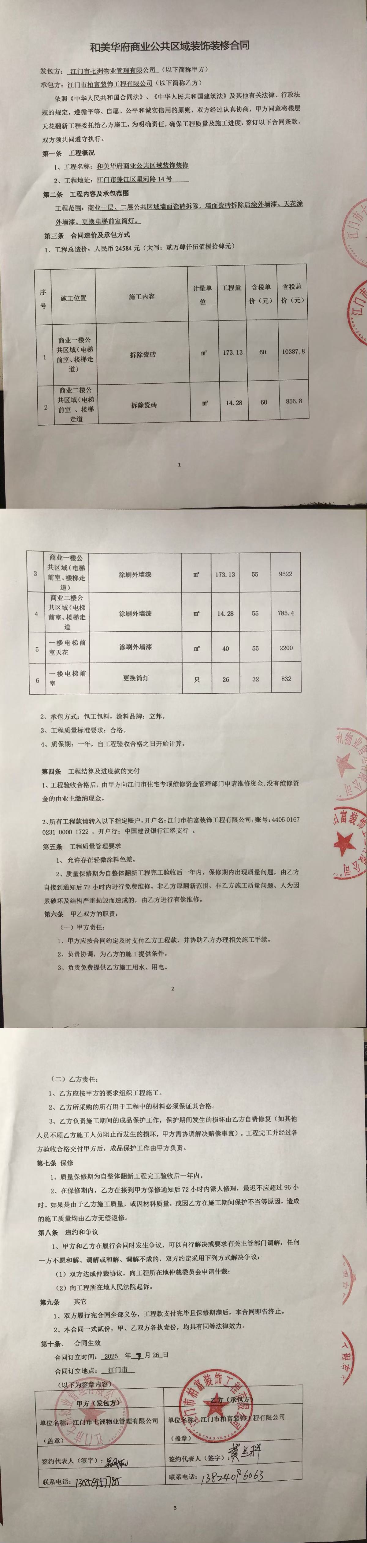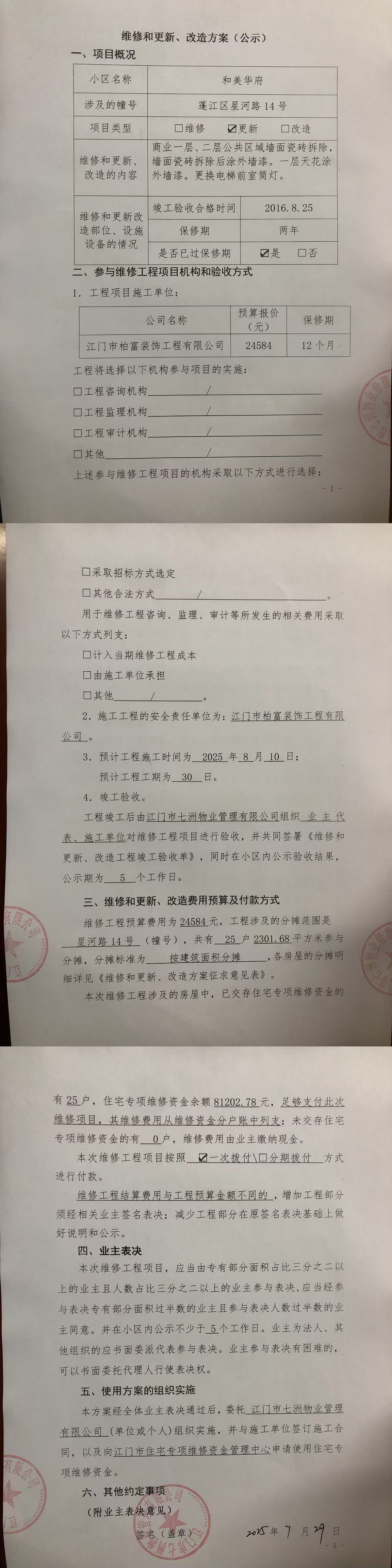 <td VALIGN="top" VALUES="" STYLE="border-width:0" BINDTYPE="0" ROWSPAN="19" COLSPAN="7" DATASOURCE="投票结果" ><font style="font-size:14pt;"><p style="white-space: normal; font-family: 宋体; line-height: 1.75em;">和美华府蓬江区星河路14号全体业主:</p><p style="white-space: normal; font-family: 宋体; line-height: 1.75em; text-indent: 2em;">本小区关于和美华府星河路14号商业公共区域拆瓷砖、涂外墙漆、换筒灯使用维修资金的投票的投票已表决结束,询异时间从2025年08月20日开始,投票询异公示期间,业主可通过微信查询自己的表决情况或可凭身份证件申请查询自己的表决情况;如公示的业主表决情况与查询的本人表决意见不一致的,可以以书面形式向投票组织机构申诉,投票组织机构予以纠正并重新公示表决结果。异议提出人对投票组织机构的处理仍有异议的,可以向街道办事处(镇人民政府)反映处理,涉及住宅专项维修资金的,可向属地住宅专项维修资金管理中心反映处理。</p><p style="white-space: normal;"><br/></p><p style="white-space: normal; font-family: 宋体; line-height: 1.75em;"><strong>附件:</strong></p><p style="white-space: normal; font-family: 宋体; line-height: 1.75em;"><strong>一、投票范围</strong></p><p style="white-space: normal; font-family: 宋体; line-height: 1.75em; text-indent: 2em;">和美华府蓬江区星河路14号</p><p style="white-space: normal; font-family: 宋体; line-height: 1.75em; text-indent: 2em;">总人数(专有部分人数之和):22</p><p style="white-space: normal; font-family: 宋体; line-height: 1.75em; text-indent: 2em;"><span style="font-family: 宋体, SimSun;"><span style="font-family: 宋体; text-indent: 32px;"><span style="font-family: 宋体; text-indent: 32px;">总户数:25</span></span></span></p><p style="white-space: normal; font-family: 宋体; line-height: 1.75em; text-indent: 2em;">建筑物总面积(专有部分面积之和):2301.68㎡</p><p style="white-space: normal; font-family: 宋体; line-height: 1.75em;"><strong>二、询异公示起止时间</strong></p><p dir="ltr" style="white-space: normal; font-family: 宋体; line-height: 1.75em; text-indent: 2em;"><span style="text-indent: 36px;">2025年08月20日至2025年08月30日</span></p><p style="white-space: normal; font-family: 宋体; line-height: 1.75em;"><strong>三、投票详细描述</strong></p><p style="white-space: normal; font-family: 宋体; line-height: 1.75em; text-indent: 2em;"><p>蓬江区星河路14号商业一、二层公共区域墙体瓷砖大面积空鼓。一层天花筒灯灯光不稳定,存在闪烁或忽明忽暗状态。现对<span style="text-wrap-mode: wrap;">星河路14号商业<span style="text-wrap-mode: wrap;">一、二层公共区域墙体、天花筒灯进行修复,工程维修预算金额为24584元,项目最终费用以施工合同签订金额为准。因已过保修期,维修费用由相关业主按建筑面积分摊,每平方约10.68元,详见公示附件。如业主手机不能正常通过微信投票,请联系物业公司进行线下纸质投票,物业电话:0750-3692920。</span></span></p></p><p style="white-space: normal; font-family: 宋体; line-height: 1.75em;"><strong>四、计票规则</strong></p><p style="white-space: normal; font-family: 宋体; line-height: 1.75em; text-indent: 2em;">表决事项:使用建筑物及其附属设施的维修资金<br /><p style='text-align: left; font-family: 宋体; font-size: 16px; line-height: 1.75em; text-indent: 2em;'>计票规则:弃权票不并入其它项 未表决票不并入其它项</p></p><p style="white-space: normal; font-family: 宋体; line-height: 1.75em;"><strong>五、通过规则</strong></p><p style="white-space: normal; font-family: 宋体; line-height: 1.75em;"><strong><strong style="white-space: normal;"><span style="font-family: 宋体, SimSun;"> 根据《中华人民共和国民法典》第二百七十八条规定:业主共同决定事项,应当由专有部分面积占比三分之二以上的业主且人数占比三分之二以上的业主参与表决。</span></strong></strong></p><p style="white-space: normal; font-family: 宋体; line-height: 1.75em; text-indent: 2em;">表决事项:使用建筑物及其附属设施的维修资金<br /><p style='text-align: left; font-family: 宋体; font-size: 16px; line-height: 1.75em; text-indent: 2em;'>通过规则:双2/3以上参与表决,参与表决双过半同意</p></p><p style="white-space: normal; font-family: 宋体; line-height: 1.75em;"><strong>六、投票结果</strong></p><p style="white-space: normal; font-family: 宋体; line-height: 1.75em; text-indent: 2em;"><div id='resultTable'><table style='table-layout: fixed; font-size:12px; margin-top:10px' width='100%' border='0' cellspacing='0' cellpadding='0'><tr><td height='28' colspan='10' align='center' style='border: 1px solid #666'><strong style='font-size: 14px;'> 使用建筑物及其附属设施的维修资金</strong></td> </tr><tr id='trfirst'><td height='28' colspan='4' style='border-left: 1px solid #666; border-bottom: 1px solid #666'><strong> 申报单位:</strong> 江门市七洲物业管理有限公司</td><td colspan='3' style='border-left: 1px solid #666; border-bottom: 1px solid #666'><strong> 联系方式:</strong> 0750-3338969 </td><td colspan='3' style='border-left: 1px solid #666; border-bottom: 1px solid #666; border-right: 1px solid #666'><strong> 申报日期:</strong> 2025年7月29日 </td></tr><tr> <td height='28' colspan='5' style='border-left: 1px solid #666; border-bottom: 1px solid #666'><strong> 总人数(专有部分人数之和):</strong>22人 </td><td colspan='5' style='border-left: 1px solid #666; border-bottom: 1px solid #666; border-right: 1px solid #666'><strong> 建筑物总面积(专有部分面积之和):</strong>2301.68㎡ </td> </tr><tr><td height='28' colspan='10' bgcolor='#F3F3F3' style='border-left: 1px solid #666;border-bottom:
