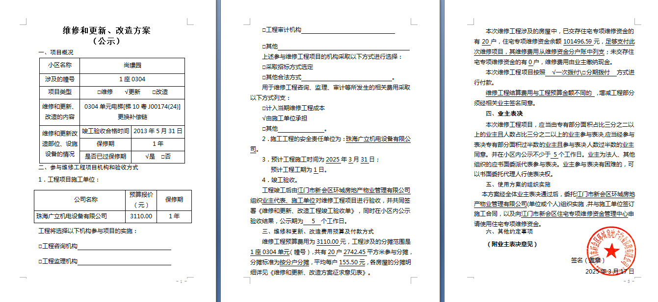 <td VALIGN="top" VALUES="" STYLE="border-width:0" BINDTYPE="0" ROWSPAN="17" COLSPAN="7" DATASOURCE="投票结果" ><font style=" font-family:方正小标宋简体;font-size:14pt;"><p style="line-height: 1.75em;"><span style="font-family: 宋体, SimSun;">各位尊敬的业主:</span><br/></p><p style="text-indent: 2em; line-height: 1.75em;"><span style="font-family: 宋体, SimSun;">根据法律法规的规定,本小区业主利用“江门市物业事项表决管理系统”已对本小区公共事务决策事项进行了表决,在经过7日的询异公示期后,未收到业主有效的异议。现将投票结果公告,并就产生的法律效力说明如下:</span></p><p style="line-height: 1.75em; text-indent: 0em;"><strong style="text-indent: 2em;"><span style="font-family: 宋体, SimSun;">一、投票范围</span></strong></p><p style="text-indent: 2em; line-height: 1.75em;"><span style="font-family: 宋体, SimSun;">尚璟园尚璟园1座</span></p><p style="text-indent: 2em; line-height: 1.75em;"><span style="font-family: 宋体, SimSun;">总人数(专有部分人数之和):20</span></p><p style="text-indent: 2em; line-height: 1.75em;"><span style="font-family: 宋体, SimSun;"><span style="font-family: 宋体, SimSun; text-indent: 32px;"><span style="font-family: 宋体; text-indent: 32px;"><span style="font-family: 宋体; text-indent: 32px;">总户数:20</span></span></span></span></p><p style="text-indent: 2em; line-height: 1.75em;"><span style="font-family: 宋体, SimSun;">建筑物总面积(专有部分面积之和):2742.45㎡</span></p><p style="line-height: 1.75em;"><strong><span style="font-family: 宋体, SimSun;">二、投票结果公告时间</span></strong></p><p style="text-indent: 2em; line-height: 1.75em;"><span style="font-family: 宋体, SimSun;"><span style="font-family: 宋体, SimSun; text-indent: 32px;">从2025年04月04日开始</span></span></p><p style="line-height: 1.75em;"><strong><span style="font-family: 宋体, SimSun;">三、计票规则</span></strong></p><p style="text-indent: 2em; line-height: 1.75em;"><span style="font-family: 宋体, SimSun;">表决事项:使用建筑物及其附属设施的维修资金<br /><p style='font-family: 宋体, SimSun;line-height: 1.75em; text-indent: 2em;'>计票规则:弃权票不并入其它项&nbsp;&nbsp;&nbsp;&nbsp;未表决票不并入其它项</p></span></p><p style="line-height: 1.75em;"><strong><span style="font-family: 宋体, SimSun;">四、通过规则</span></strong></p><p style="line-height: 1.75em;"><strong><span style="font-family: 宋体, SimSun;">&nbsp; 根据《中华人民共和国民法典》第二百七十八条规定:业主共同决定事项,应当由专有部分面积占比三分之二以上的业主且人数占比三分之二以上的业主参与表决。</span></strong></p><p style="text-indent: 2em; line-height: 1.75em;"><span style="font-family: 宋体, SimSun;"><span style="font-family: 宋体, SimSun; text-indent: 32px;">表决事项:使用建筑物及其附属设施的维修资金<br /><p style='font-family: 宋体, SimSun;line-height: 1.75em; text-indent: 2em;'>通过规则:双2/3以上参与表决,参与表决双过半同意</p></span></span></p><p style="line-height: 1.75em;"><strong><span style="font-family: 宋体, SimSun;">五、投票结果</span></strong></p><p style="line-height: 1.75em; text-indent: 2em;"><span style="font-family: 宋体, SimSun; text-indent: 2em;"><div id='resultTable'><table style='table-layout: fixed; font-size:12px; margin-top:10px' width='100%' border='0' cellspacing='0' cellpadding='0'><tr><td height='28' colspan='10' align='center' style='border: 1px solid #666'><strong style='font-size: 14px;'> 使用建筑物及其附属设施的维修资金</strong></td> </tr><tr id='trfirst'><td height='28' colspan='4' style='border-left: 1px solid #666; border-bottom: 1px solid #666'><strong>&nbsp;申报单位:</strong> 新会区环城房地产物业管理有限公司</td><td colspan='3' style='border-left: 1px solid #666; border-bottom: 1px solid #666'><strong>&nbsp;联系方式:</strong> </td><td colspan='3' style='border-left: 1px solid #666; border-bottom: 1px solid #666; border-right: 1px solid #666'><strong>&nbsp;申报日期:</strong> 2025年3月25日 </td></tr><tr> <td height='28' colspan='5' style='border-left: 1px solid #666; border-bottom: 1px solid #666'><strong>&nbsp;列支总人数(专有部分人数之和):</strong>20人 </td><td colspan='5' style='border-left: 1px solid #666; border-bottom: 1px solid #666; border-right: 1px solid #666'><strong>&nbsp;列支建筑物总面积(专有部分面积之和):</strong>2742.45㎡ </td> </tr><tr><td height='28' colspan='10' bgcolor='#F3F3F3' style='border-left: 1px solid #666;border-bottom: 1px solid #666;border-right: 1px solid #666'><strong>&nbsp;参与表决人数及面积统计</strong></td></tr><tr><td height='28' colspan='5' style='border-left: 1px solid #666; border-bottom: 1px solid #666'><strong>&nbsp;参与表决人数:</strong>14人</td><td colspan='5' style='border-left: 1px solid #666; border-bottom: 1px solid #666; border-right: 1px solid #666'><strong>&nbsp;参与表决人数占总人数比例:</strong>70.00%</td></tr><tr><td height='28' colspan='5' style='border-left: 1px solid #666; border-bottom: 1px solid #666'><strong>&nbsp;参与表决面积:</strong>1964.47㎡</td><td colspan='5' style='border-left: 1px solid #666; border-bottom: 1px solid #666; border-right: 1px solid #666'><strong>&nbsp;参与表决面积占总面积比例:</strong>71.63%</td></tr><tr><td height='28' colspan='10' bgcolor='#F3F3F3' style='border-left: 1px solid #666; border-bottom: 1px solid #666;border-right: 1px solid #666'> <strong>&nbsp;参与表决同意人数及面积统计</strong></td> </tr><tr><td height='28' colspan='5' style='border-left: 1px solid #666; border-bottom: 1px solid #666'><strong>&nbsp;参与表决同意人数:</strong>14人 </td><td colspan='5' style='border-left: 1px solid #666; border-bottom: 1