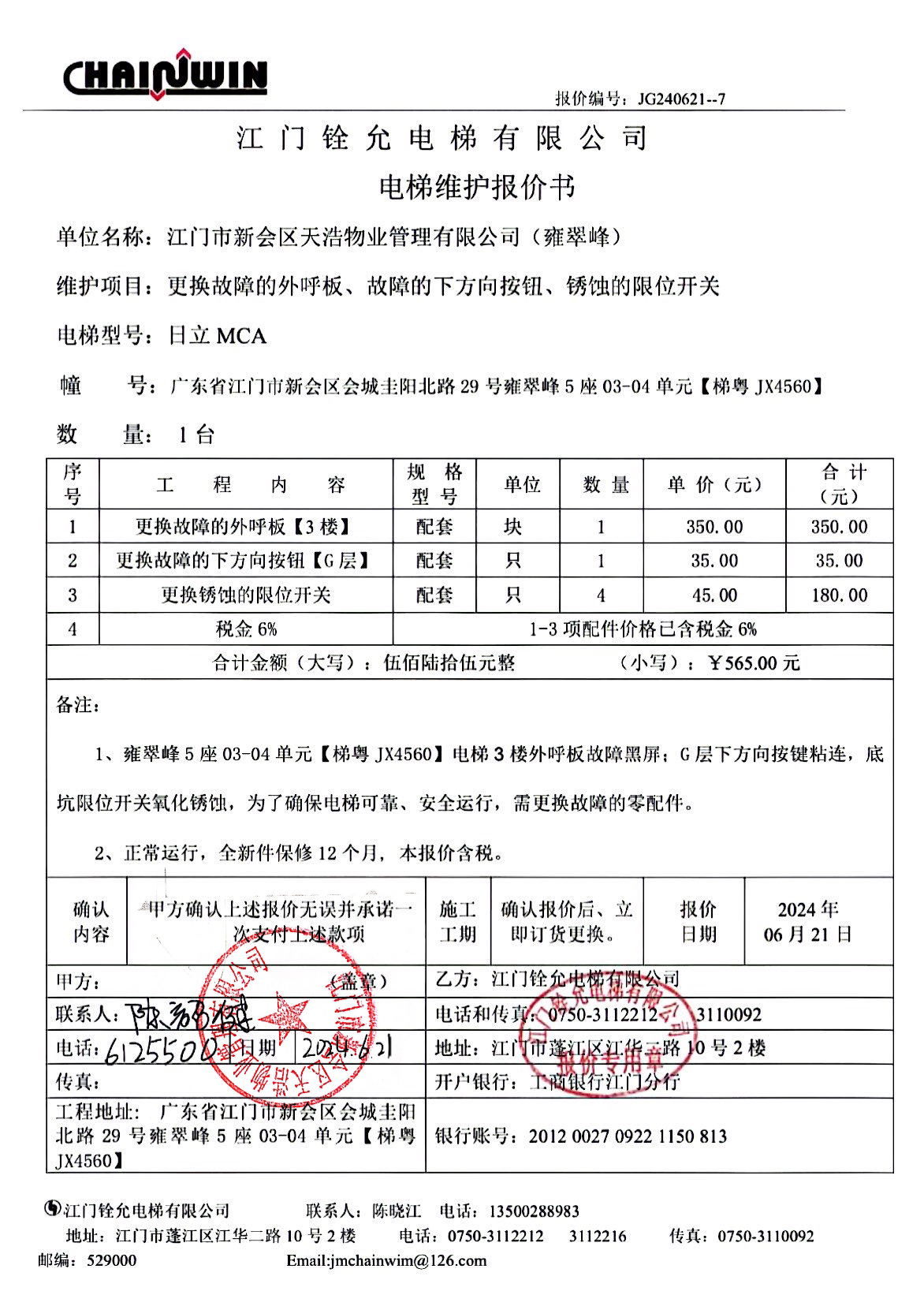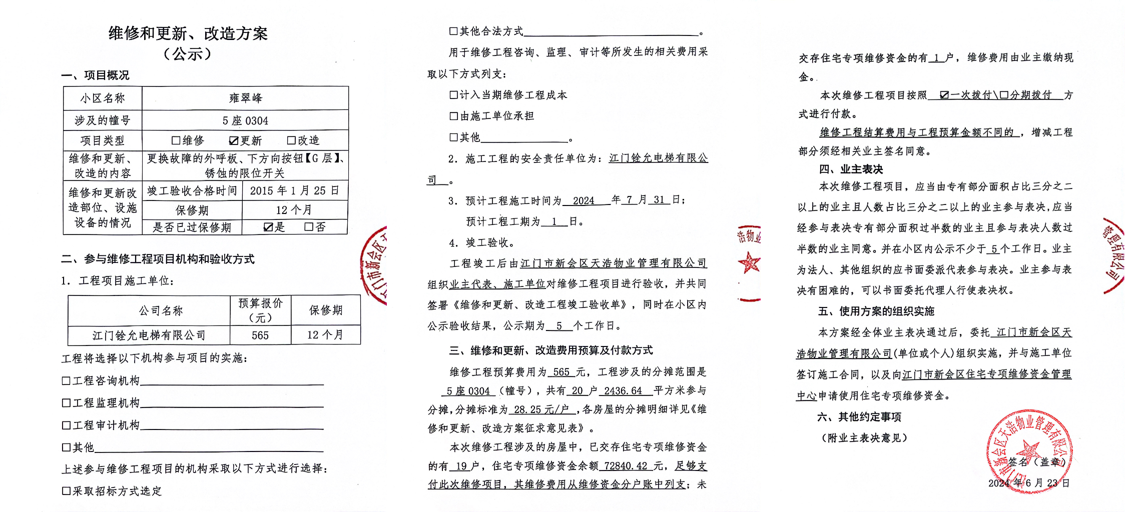 <td VALIGN="top" VALUES="" STYLE="border-width:0" BINDTYPE="0" ROWSPAN="19" COLSPAN="7" DATASOURCE="投票结果" ><font style="font-size:14pt;"><p style="white-space: normal; font-family: 宋体; line-height: 1.75em;">雍翠峰雍翠峰5座全体业主:</p><p style="white-space: normal; font-family: 宋体; line-height: 1.75em; text-indent: 2em;">本小区关于雍翠峰5座0304电梯【梯粤JX4560】更换故障的外呼板、下方向按钮【G层】和锈蚀的限位开关使用维修资金的投票的投票已表决结束,询异时间从2024年06月27日开始,投票询异公示期间,业主可通过微信查询自己的表决情况或可凭身份证件申请查询自己的表决情况;如公示的业主表决情况与查询的本人表决意见不一致的,可以以书面形式向投票组织机构申诉,投票组织机构予以纠正并重新公示表决结果。异议提出人对投票组织机构的处理仍有异议的,可以向街道办事处(镇人民政府)反映处理,涉及住宅专项维修资金的,可向属地住宅专项维修资金管理中心反映处理。</p><p style="white-space: normal;"><br/></p><p style="white-space: normal; font-family: 宋体; line-height: 1.75em;"><strong>附件:</strong></p><p style="white-space: normal; font-family: 宋体; line-height: 1.75em;"><strong>一、投票范围</strong></p><p style="white-space: normal; font-family: 宋体; line-height: 1.75em; text-indent: 2em;">雍翠峰雍翠峰5座</p><p style="white-space: normal; font-family: 宋体; line-height: 1.75em; text-indent: 2em;">总人数(专有部分人数之和):20</p><p style="white-space: normal; font-family: 宋体; line-height: 1.75em; text-indent: 2em;"><span style="font-family: 宋体, SimSun;"><span style="font-family: 宋体; text-indent: 32px;"><span style="font-family: 宋体; text-indent: 32px;">总户数:20</span></span></span></p><p style="white-space: normal; font-family: 宋体; line-height: 1.75em; text-indent: 2em;">建筑物总面积(专有部分面积之和):2436.64㎡</p><p style="white-space: normal; font-family: 宋体; line-height: 1.75em;"><strong>二、询异公示起止时间</strong></p><p dir="ltr" style="white-space: normal; font-family: 宋体; line-height: 1.75em; text-indent: 2em;"><span style="text-indent: 36px;">2024年06月27日至2024年07月03日</span></p><p style="white-space: normal; font-family: 宋体; line-height: 1.75em;"><strong>三、投票详细描述</strong></p><p style="white-space: normal; font-family: 宋体; line-height: 1.75em; text-indent: 2em;"><p> 雍翠峰5座0304电梯【梯粤JX4560】G层电梯按钮失灵以及在三楼同时出现异常情况,经检查确认为电梯3楼外呼板故障黑屏、G层下方向按键粘连、底坑限位开关氧化锈蚀(日常使用自然磨损损坏)已过保修期。现需申请使用维修资金对5座0304电梯【梯粤JX4560】进行维修,工程维修预算金额为565元,项目最终费用以施工合同签订金额为准。维修费用的分摊标准为按分户分摊,每户分摊28.25元,详见公示附件。如业主不能正常通过微信投票,请联系物业公司进行线下纸质投票,物业电话:0750-6125500</p></p><p style="white-space: normal; font-family: 宋体; line-height: 1.75em;"><strong>四、计票规则</strong></p><p style="white-space: normal; font-family: 宋体; line-height: 1.75em; text-indent: 2em;">表决事项:使用建筑物及其附属设施的维修资金<br /><p style='text-align: left; font-family: 宋体; font-size: 16px; line-height: 1.75em; text-indent: 2em;'>计票规则:弃权票不并入其它项 未表决票不并入其它项</p></p><p style="white-space: normal; font-family: 宋体; line-height: 1.75em;"><strong>五、通过规则</strong></p><p style="white-space: normal; font-family: 宋体; line-height: 1.75em;"><strong><strong style="white-space: normal;"><span style="font-family: 宋体, SimSun;"> 根据《中华人民共和国民法典》第二百七十八条规定:业主共同决定事项,应当由专有部分面积占比三分之二以上的业主且人数占比三分之二以上的业主参与表决。</span></strong></strong></p><p style="white-space: normal; font-family: 宋体; line-height: 1.75em; text-indent: 2em;">表决事项:使用建筑物及其附属设施的维修资金<br /><p style='text-align: left; font-family: 宋体; font-size: 16px; line-height: 1.75em; text-indent: 2em;'>通过规则:双2/3以上参与表决,参与表决双过半同意</p></p><p style="white-space: normal; font-family: 宋体; line-height: 1.75em;"><strong>六、投票结果</strong></p><p style="white-space: normal; font-family: 宋体; line-height: 1.75em; text-indent: 2em;"><div id='resultTable'><table style='table-layout: fixed; font-size:12px; margin-top:10px' width='100%' border='0' cellspacing='0' cellpadding='0'><tr><td height='28' colspan='10' align='center' style='border: 1px solid #666'><strong style='font-size: 14px;'> 使用建筑物及其附属设施的维修资金</strong></td> </tr><tr id='trfirst'><td height='28' colspan='4' style='border-left: 1px solid #666; border-bottom: 1px solid #666'><strong> 申报单位:</strong> 江门市新会区天浩物业管理有限公司</td><td colspan='3' style='border-left: 1px solid #666; border-bottom: 1px solid #666'><strong> 联系方式:</strong> </td><td colspan='3' style='border-left: 1px solid #666; border-bottom: 1px solid #666; border-right: 1px solid #666'><strong> 申报日期:</strong> 2024年6月23日 </td></tr><tr> <td height='28' colspan='5' style='border-left: 1px solid #666; border-bottom: 1px solid #666'><strong> 总人数(专有部分人数之和):</strong>20人 </td><td colspan='5' style='border-left: 1px solid #666; border-bottom: 1px solid #666; border-right: 1px solid #666'><strong> 建筑物总面积(专有部分面积之和):</strong>2436.64㎡ </td> </tr><tr><td height='28' colspan='10' bgcolor='#F3F3F3' style='border-left: 1px solid #666;border-bottom: 1px so